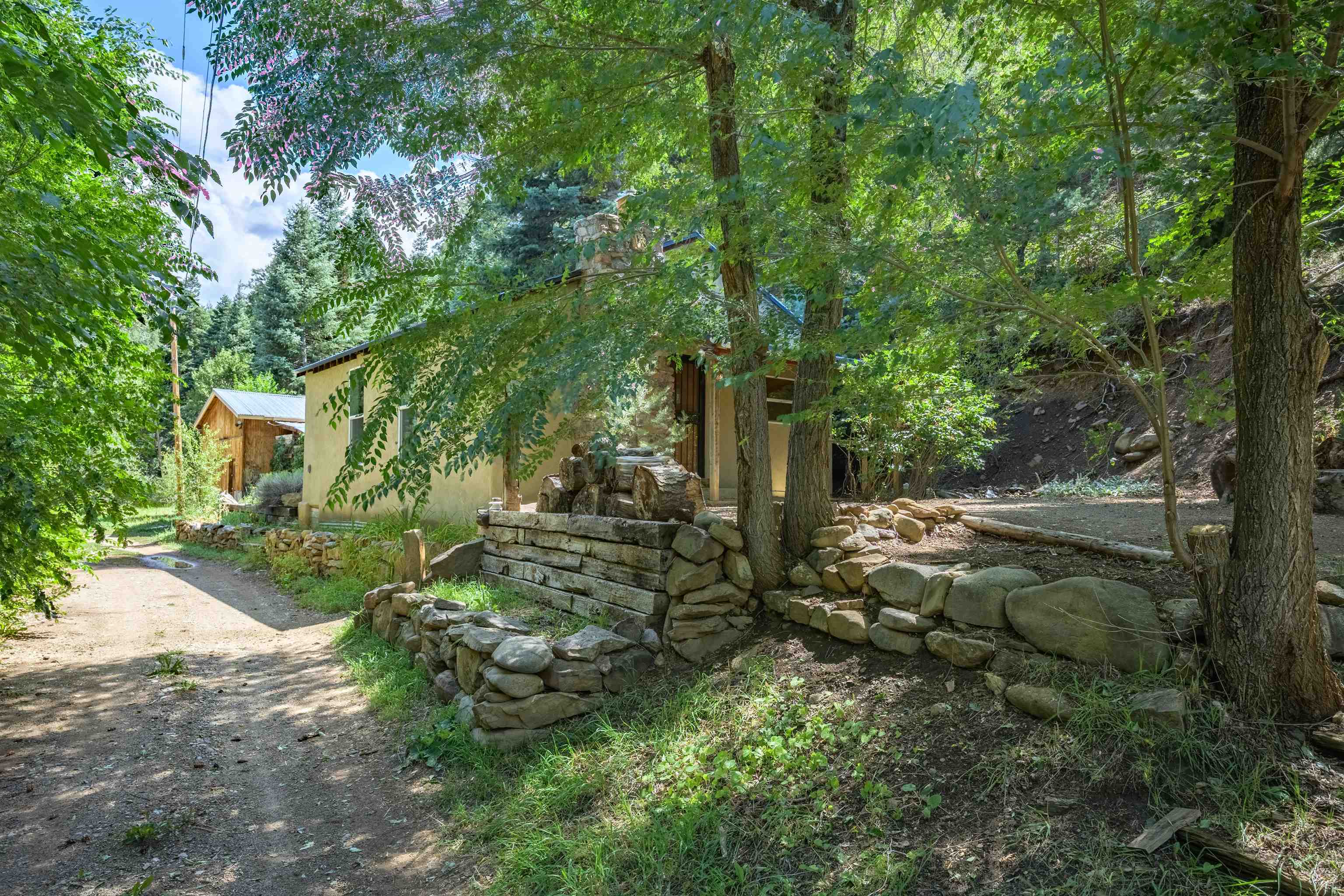 Just a ten minute drive from town, this classic Taos Canyon cabin bordering National Forest has all of the amenities. It could be a first home, a weekend getaway, a writer's retreat or a short term rental. The septic is sized for two bedrooms with a primary and then a second room as a den/office/guest room. The main room offers ample space for cooking, dining, living and lounging. The spaces still offer heat from a wall furnace and modern airtight woodstove but a brand new mini-split system offers efficient heating and cooling for the living spaces. Floor to ceiling thermopane windows bring in that warm Taos Canyon glowing light. The property also features a cinderblock and frame barn with swinging double doors and a large woodstove for heat. This would be the perfect space for a wood shop, art studio or overflow storage. Adjacent to the barn is a predator proof chicken coop to complete the homesteading vibe. Terraced raised beds around the property offer ample room for gardening and outdoor living. The property is bordered by Carson National Forest on the South side and the Rio Fernando on the other. A lovely flat wooded spot on the river would be perfect for a summer gazebo or BBQ area.