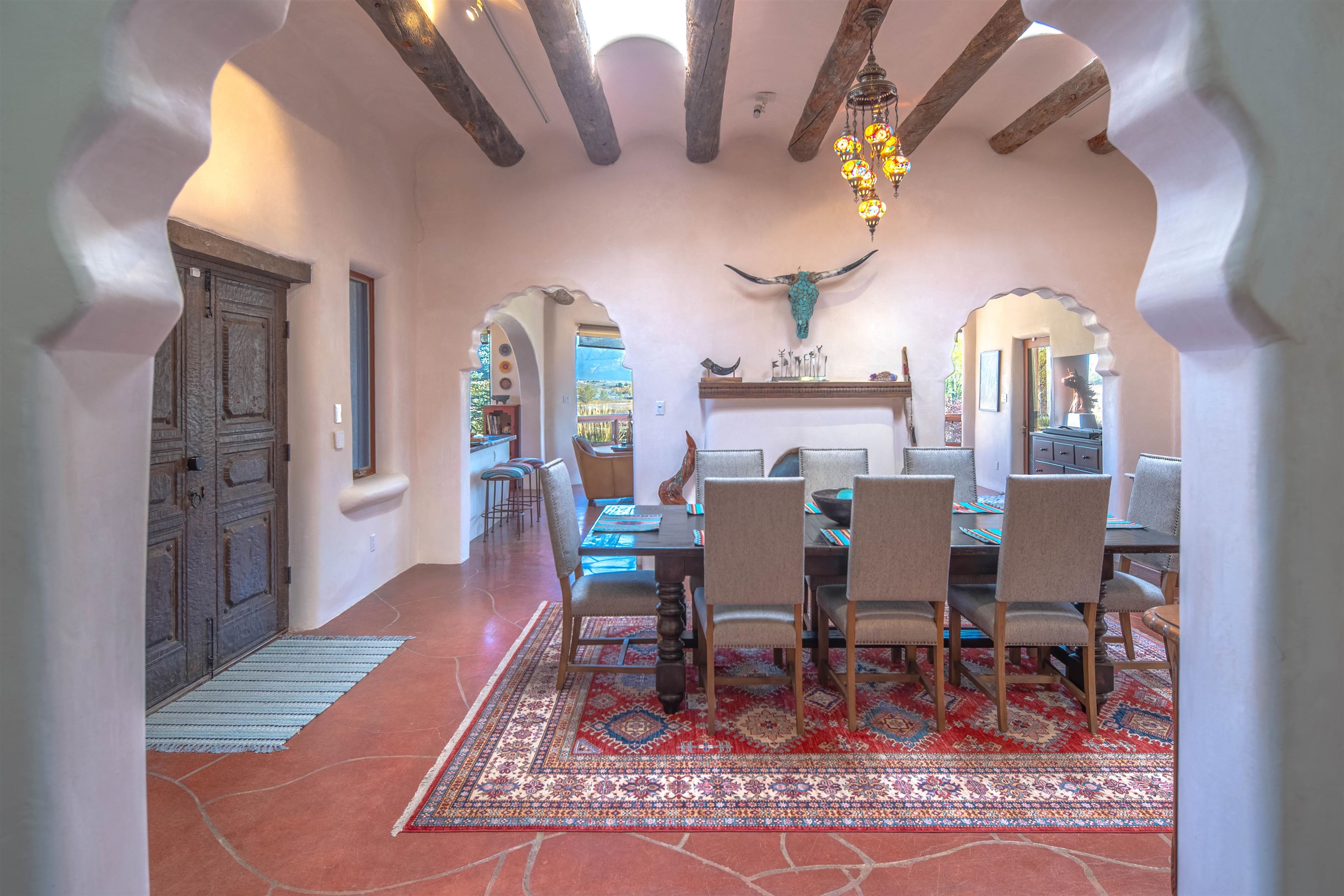 Welcome to Casa Vogue - timeless elegance and sophistication abound with this home designed by Nona Wesley, owner of Maya Designs Inc. of Taos, and built by Felipe Rodriguez, owner of 90 Degree Corners. This stunning three-bedroom, three-bathroom home with an additional office/study is being sold fully furnished with the absolute finest in elegance and comfort. You immediately enter through the hand carved double doors into an exquisite dining room with a stunning fireplace dividing the living room and dining room. There are very large picture windows with breathtaking views of Taos Mountain from the kitchen and living room areas, and admirable details in every room of the home. This home is perfect for entertaining with the open concept design, and with mountain views for starry nights, sunsets and ultimate privacy. This adobe constructed Pueblo-style home cannot be fabricated in today’s environment, and the artistic details throughout each of the rooms are unmatched. If that is not enough, there are also water rights from the acequia running along the property. Only ten minutes to the Town of Taos, one still feels like you are miles away from the hustle and bustle. This is a true treasure, and it is definitely one not to miss. Check out the exterior drone video, and the interior and exterior video tours on the listing and then schedule your private showing today. You definitely will not regret it.