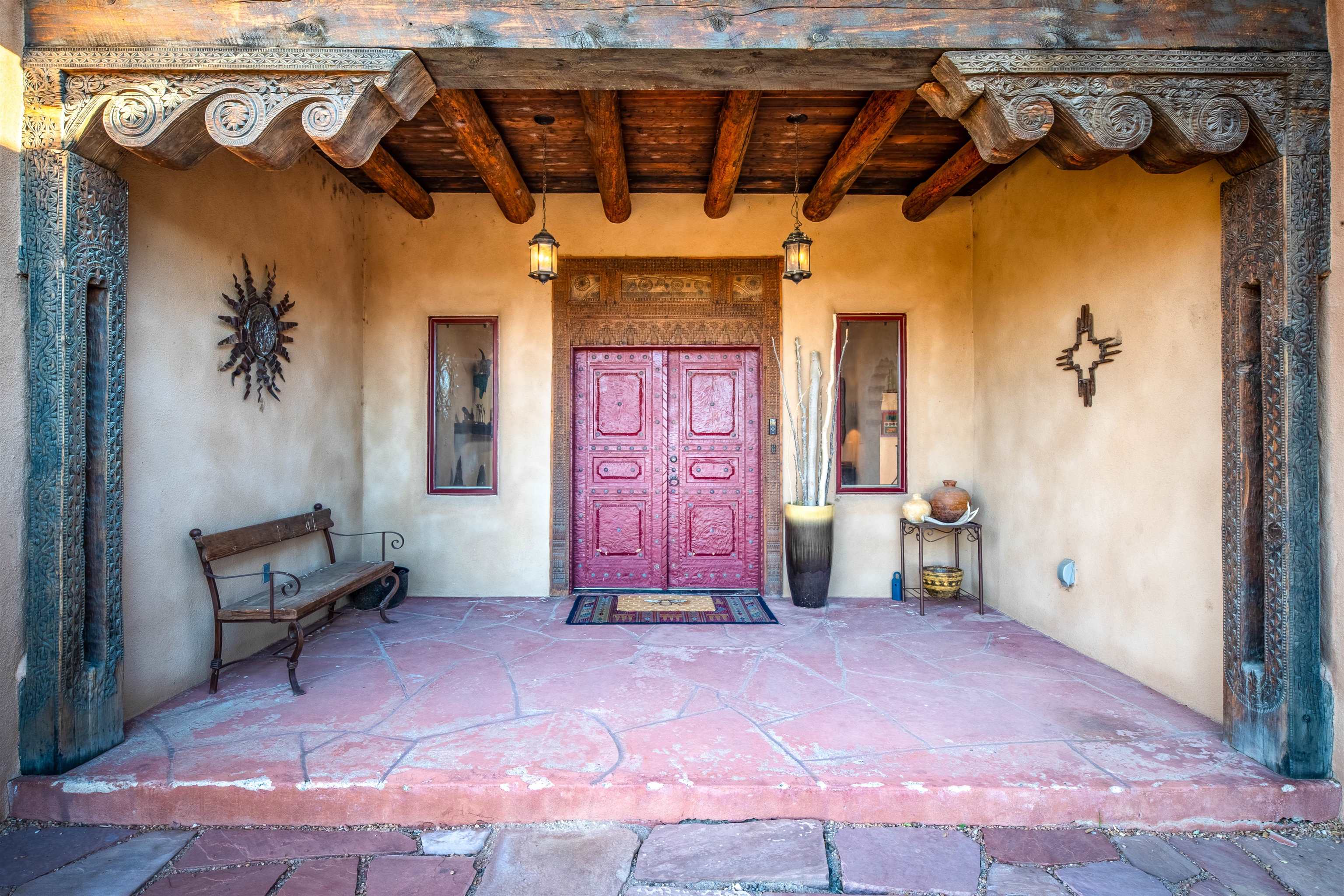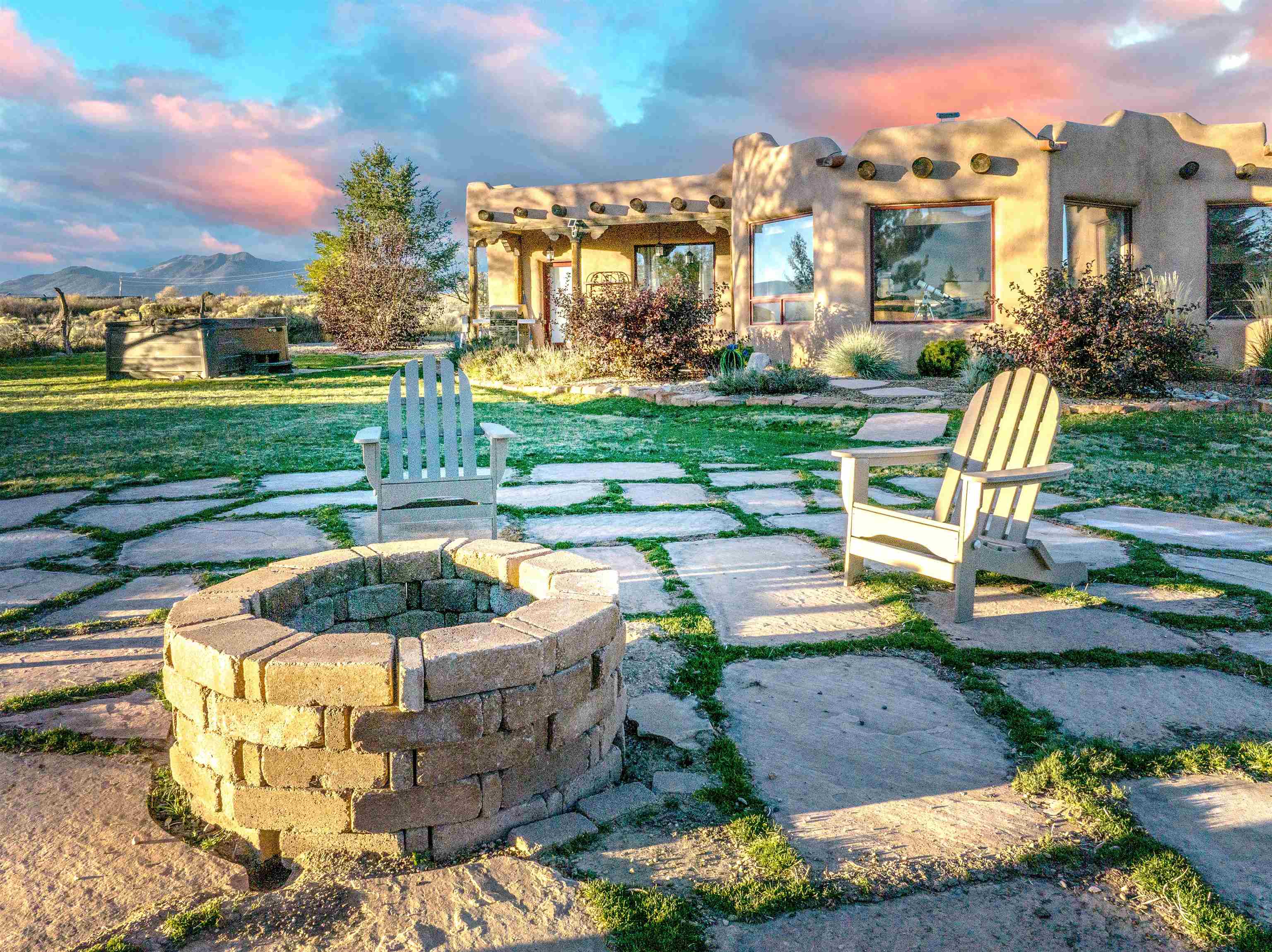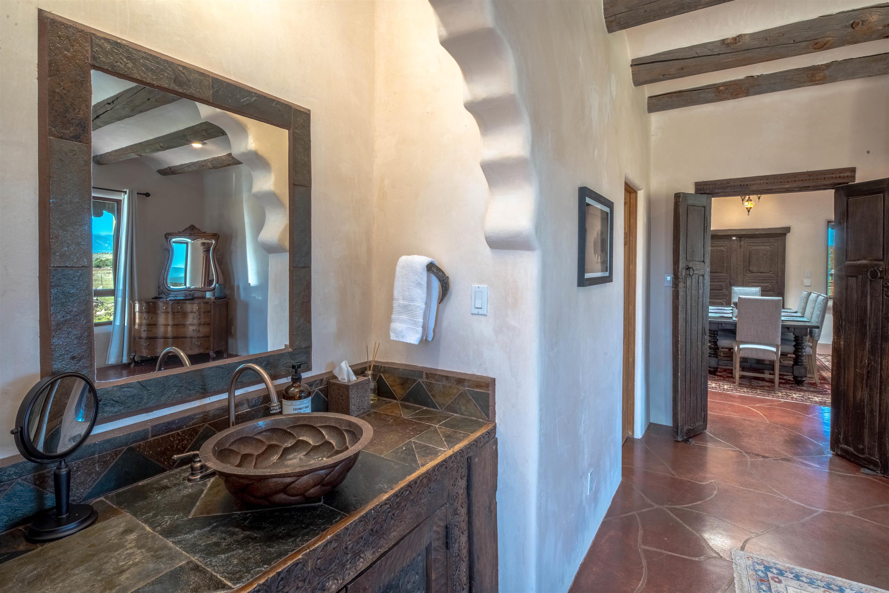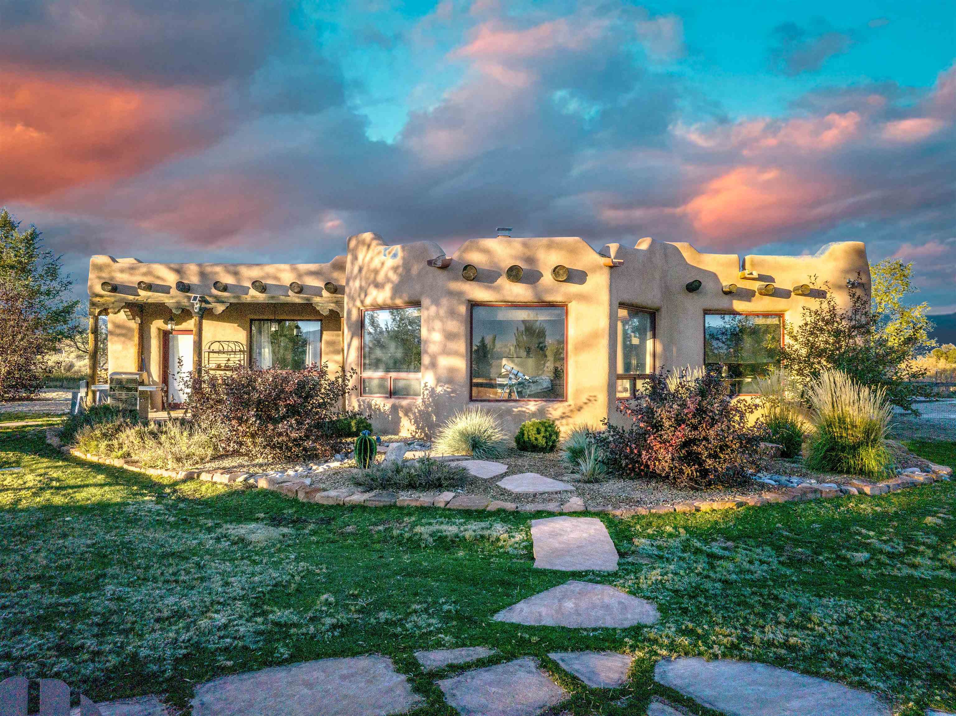 PRICE IMPROVEMENT! Welcome to Casa Vogue - timeless elegance and sophistication abound with this home designed by Nona Wesley, owner of Maya Designs Inc. of Taos, and built by Felipe Rodriguez, owner of 90 Degree Corners. This stunning three-bedroom, three-bathroom home with an additional office/study is being sold fully furnished with the absolute finest in elegance and comfort. You immediately enter through the hand carved double doors into an exquisite dining room with a stunning fireplace dividing the living room and dining room. There are very large picture windows with breathtaking views of Taos Mountain from the kitchen and living room areas, and admirable details in every room of the home. This home is perfect for entertaining with the open concept design, and with mountain views for starry nights, sunsets and ultimate privacy. This adobe constructed Pueblo-style home cannot be fabricated in today’s environment, and the artistic details throughout each of the rooms are unmatched. If that is not enough, there are also water rights from the acequia running along the property. Only ten minutes to the Town of Taos, one still feels like you are miles away from the hustle and bustle. This is a true treasure, and it is definitely one not to miss. Check out the exterior drone video, and the interior and exterior video tours on the listing and then schedule your private showing today. You definitely will not regret it.