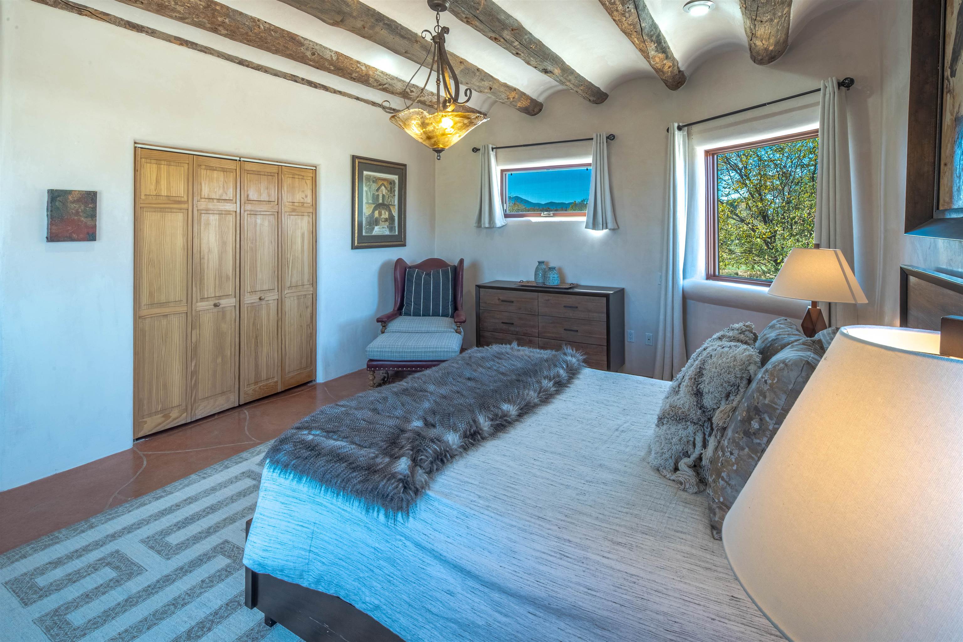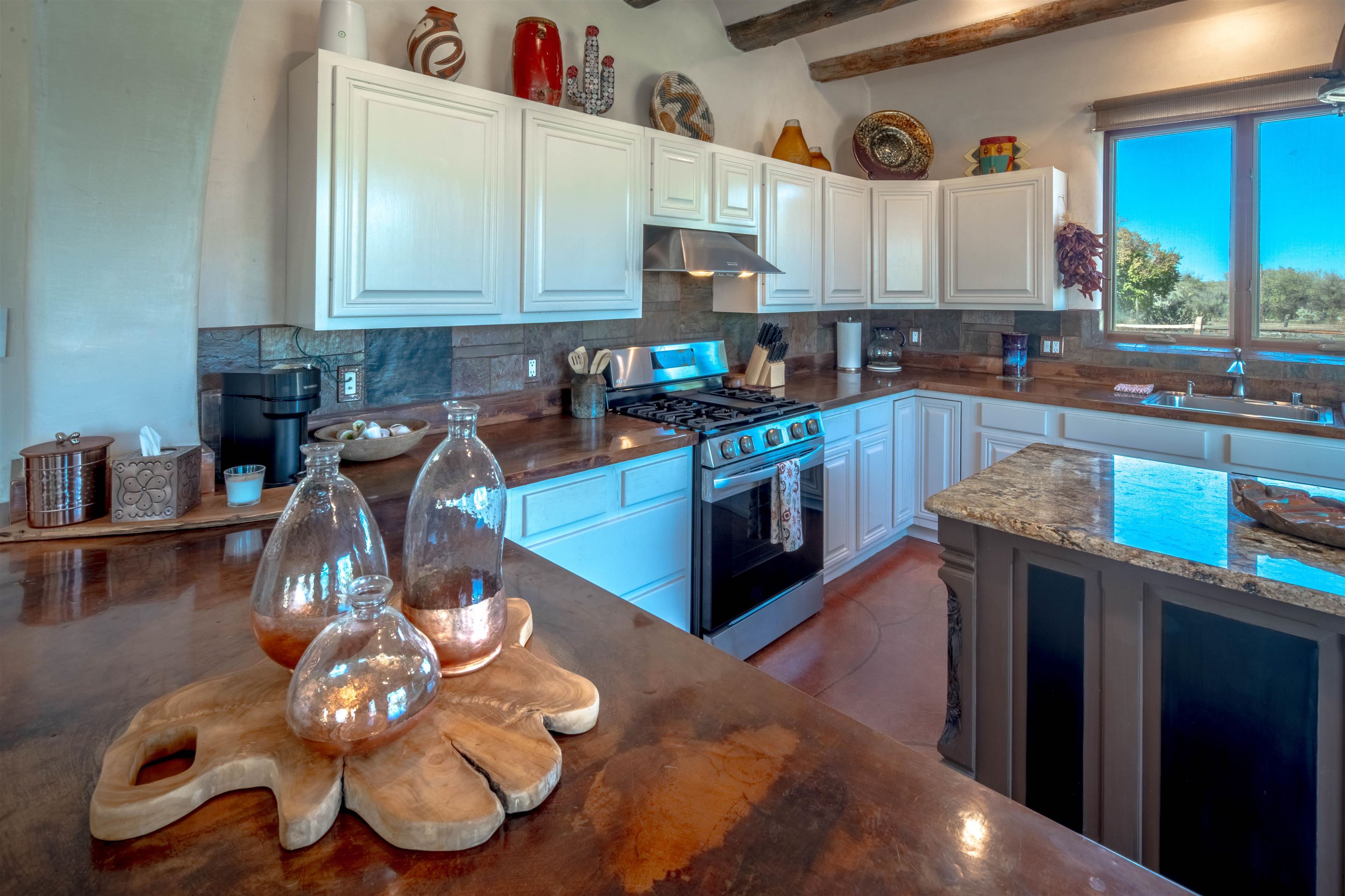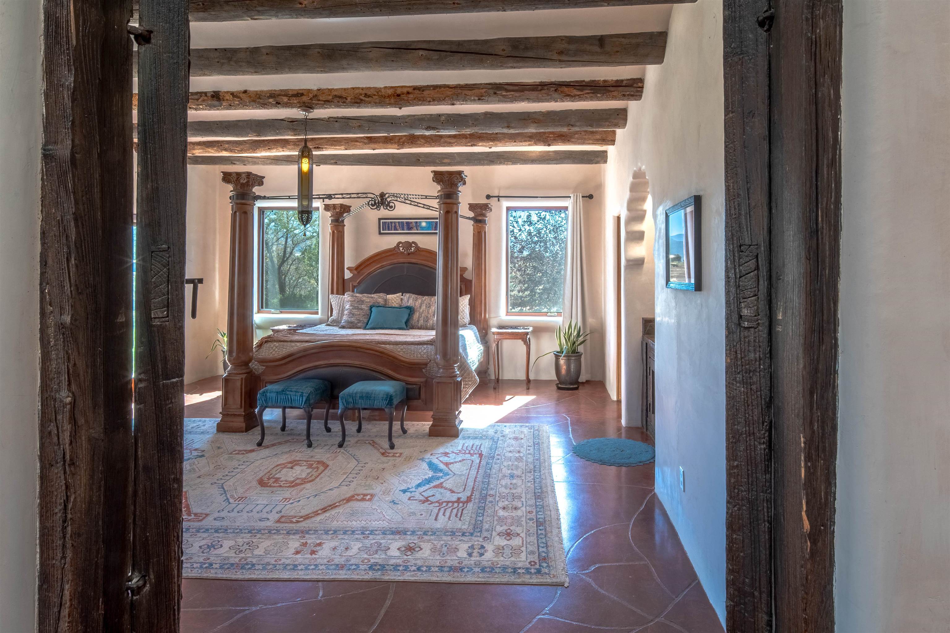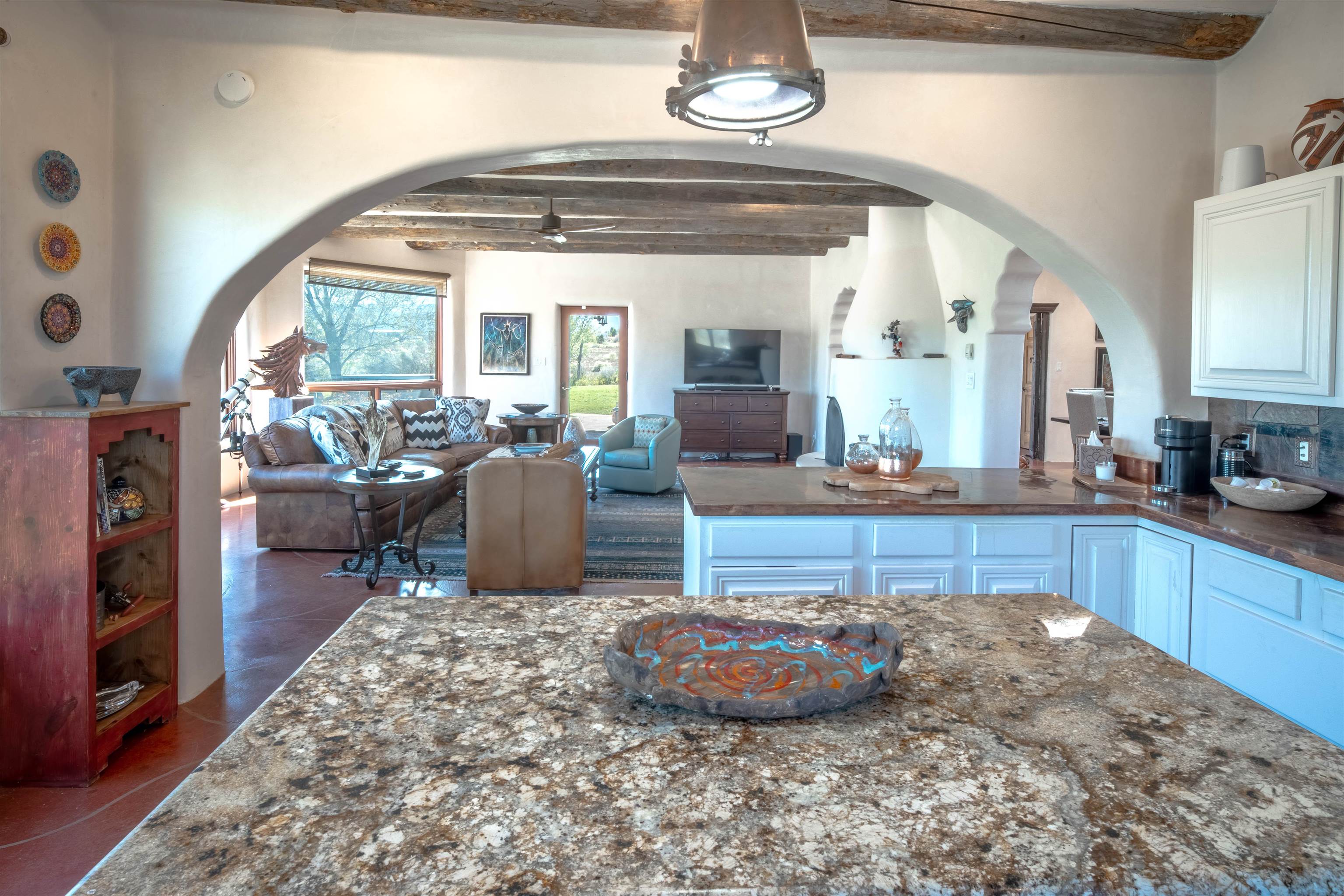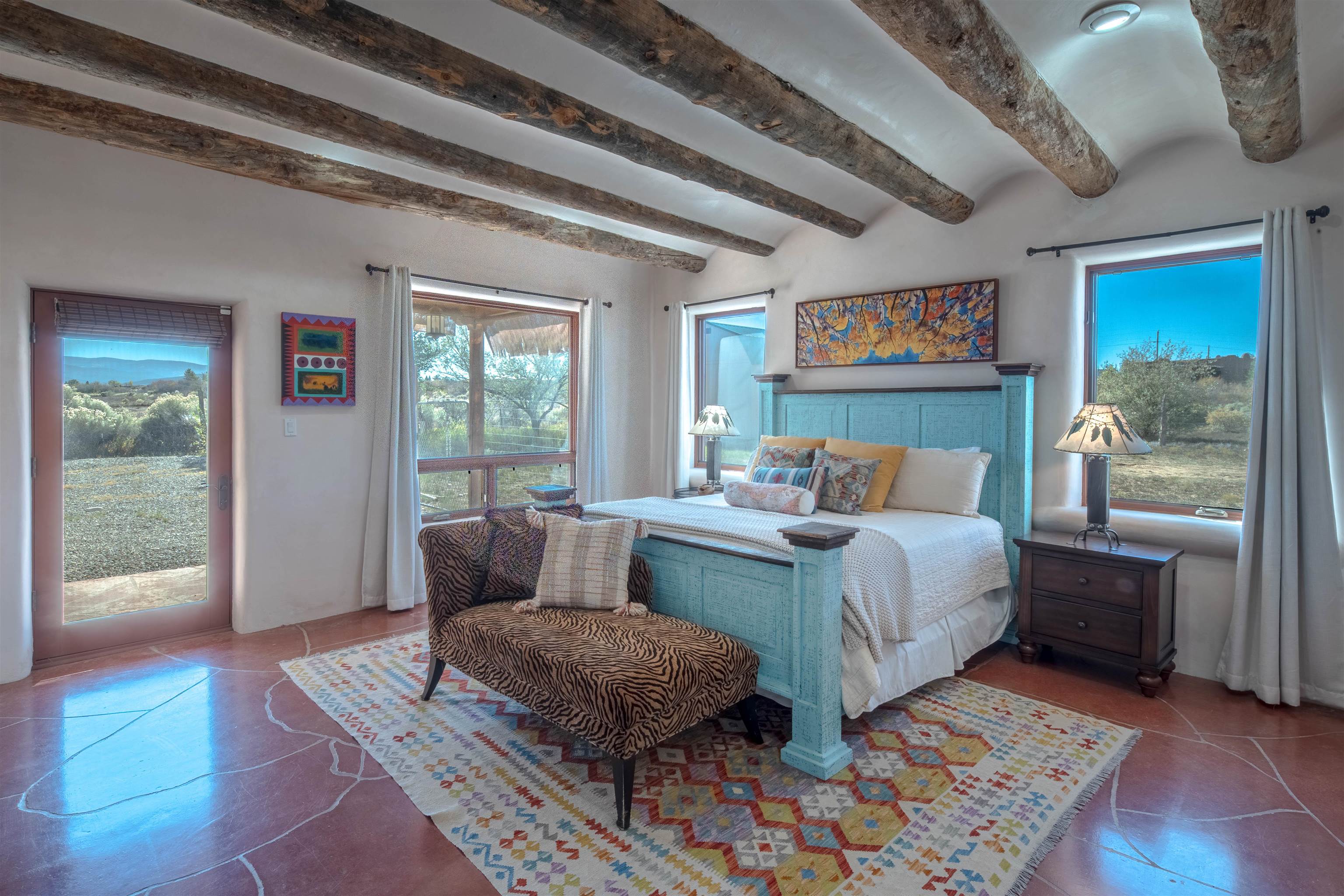 PRICE IMPROVEMENT! Welcome to Casa Vogue - timeless elegance and sophistication abound with this home designed by Nona Wesley, owner of Maya Designs Inc. of Taos, and built by Felipe Rodriguez, owner of 90 Degree Corners. This stunning three-bedroom, three-bathroom home with an additional office/study is being sold fully furnished with the absolute finest in elegance and comfort. You immediately enter through the hand carved double doors into an exquisite dining room with a stunning fireplace dividing the living room and dining room. There are very large picture windows with breathtaking views of Taos Mountain from the kitchen and living room areas, and admirable details in every room of the home. This home is perfect for entertaining with the open concept design, and with mountain views for starry nights, sunsets and ultimate privacy. This adobe constructed Pueblo-style home cannot be fabricated in today’s environment, and the artistic details throughout each of the rooms are unmatched. If that is not enough, there are also water rights from the acequia running along the property. Only ten minutes to the Town of Taos, one still feels like you are miles away from the hustle and bustle. This is a true treasure, and it is definitely one not to miss. Check out the exterior drone video, and the interior and exterior video tours on the listing and then schedule your private showing today. You definitely will not regret it.