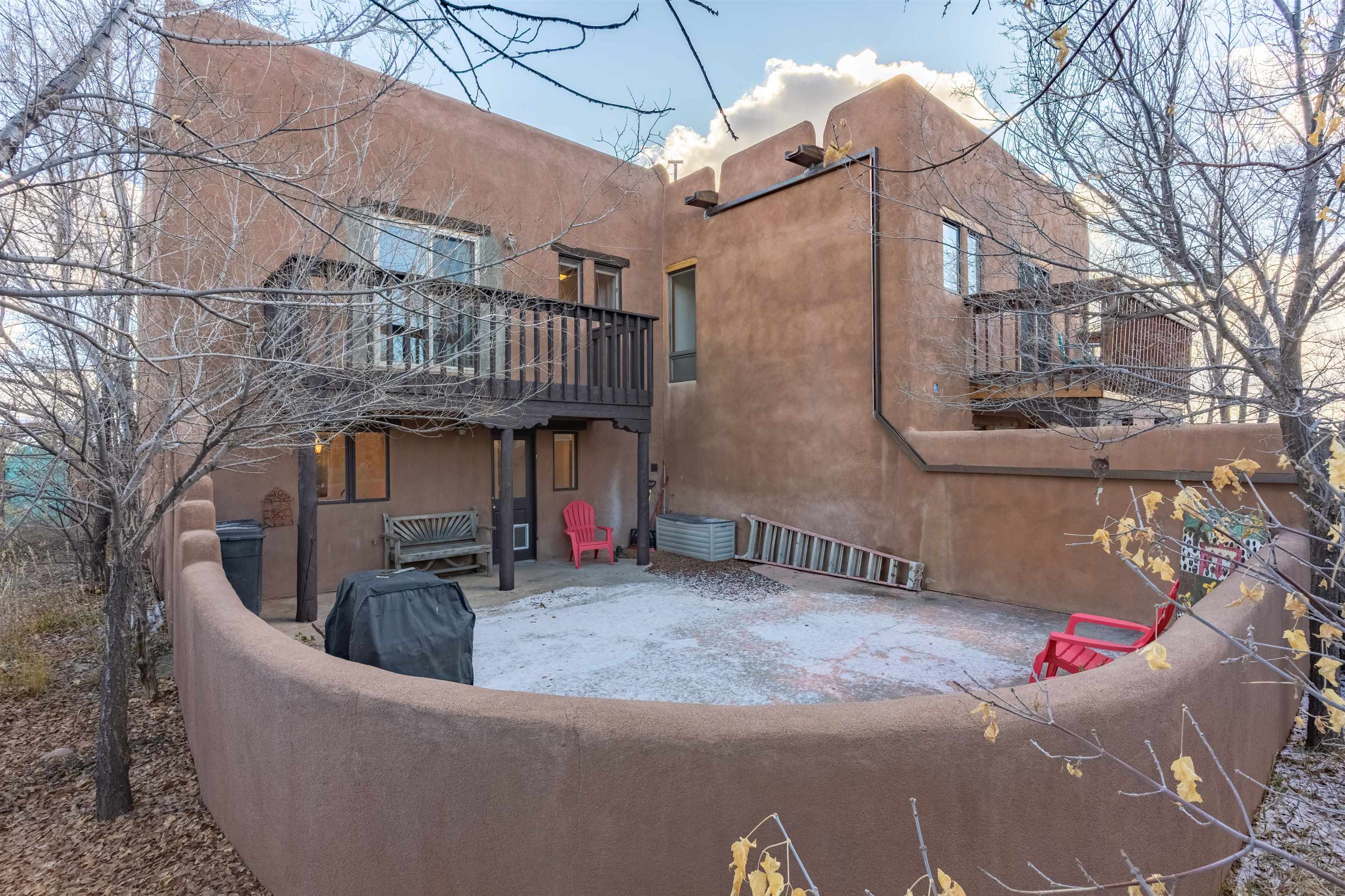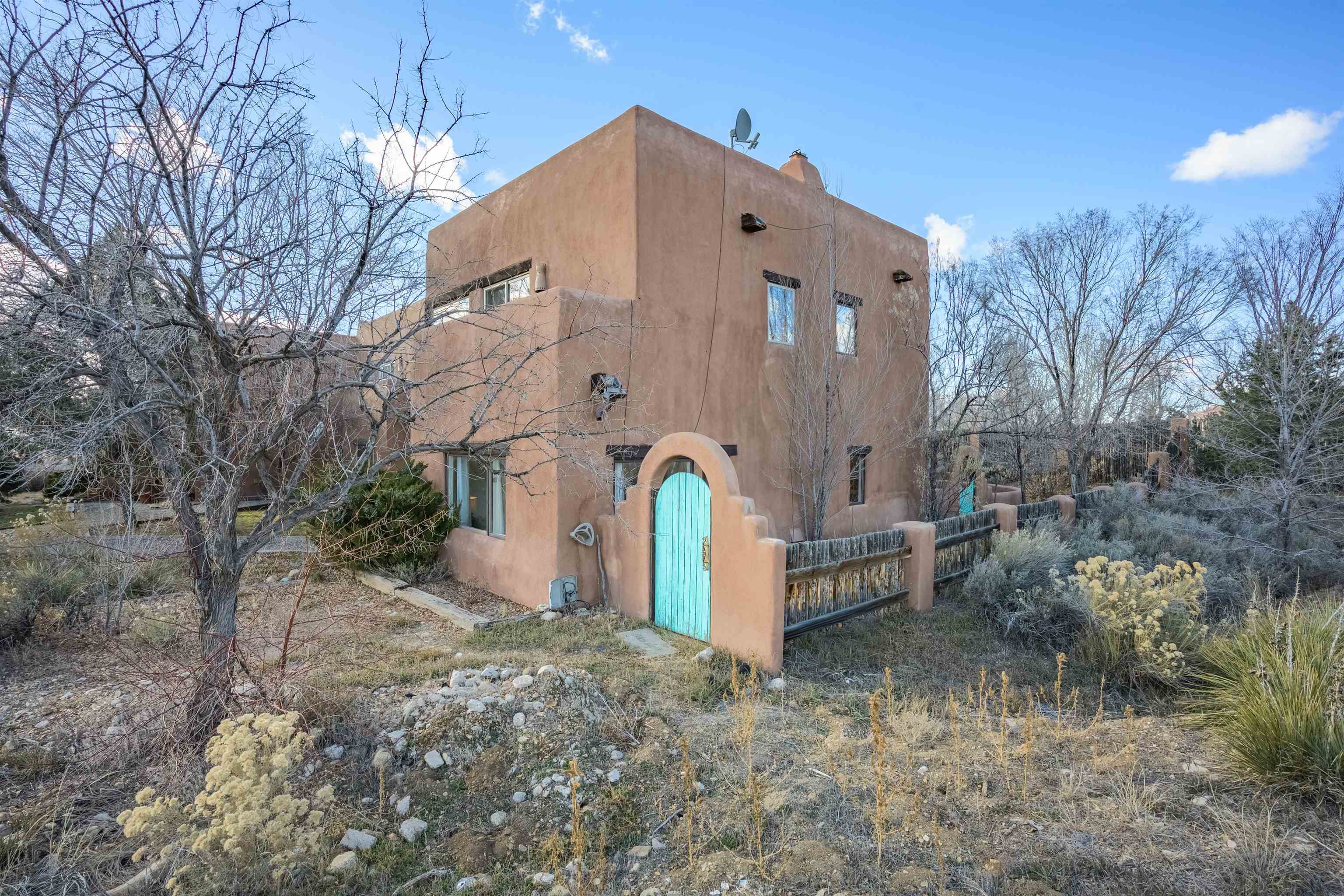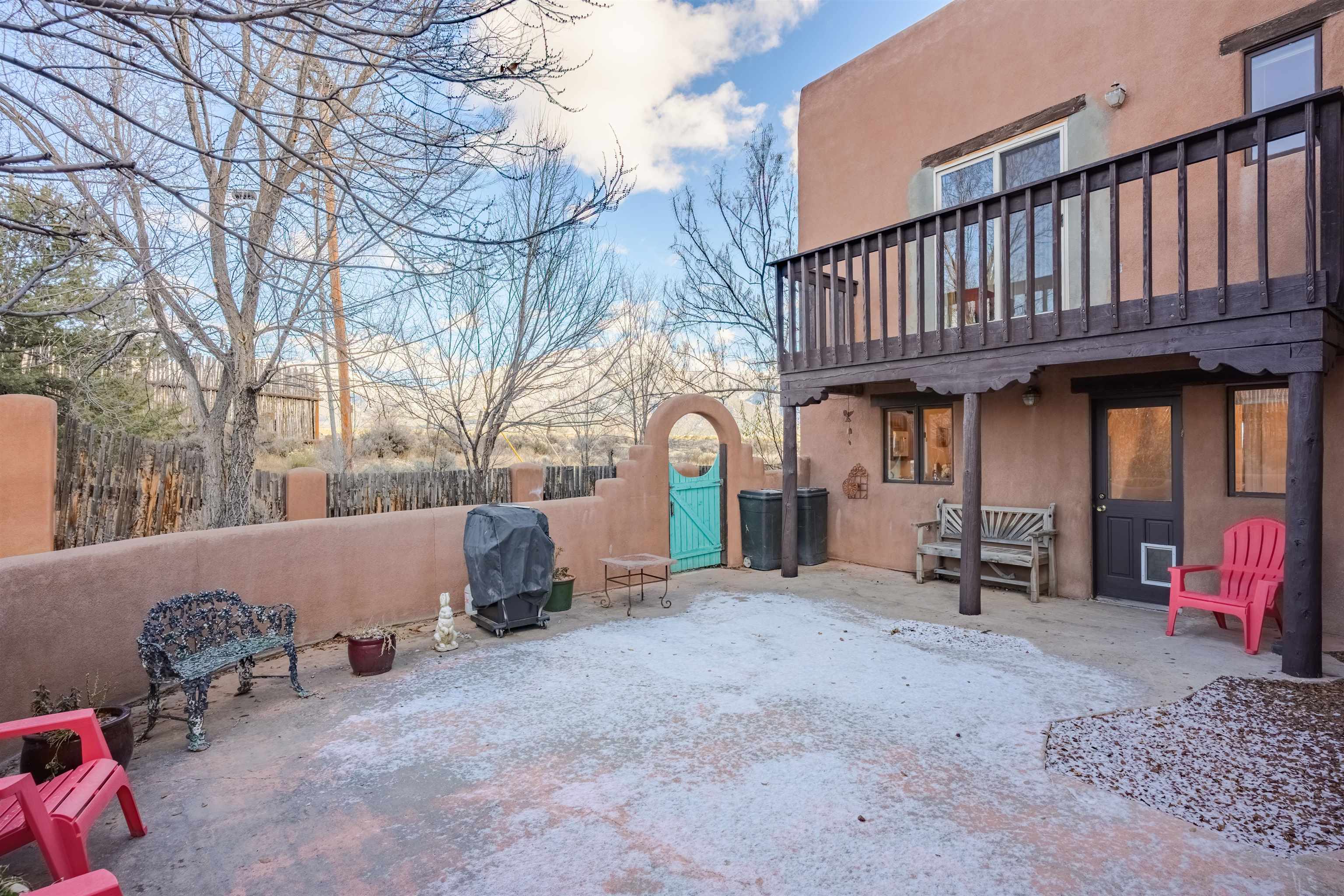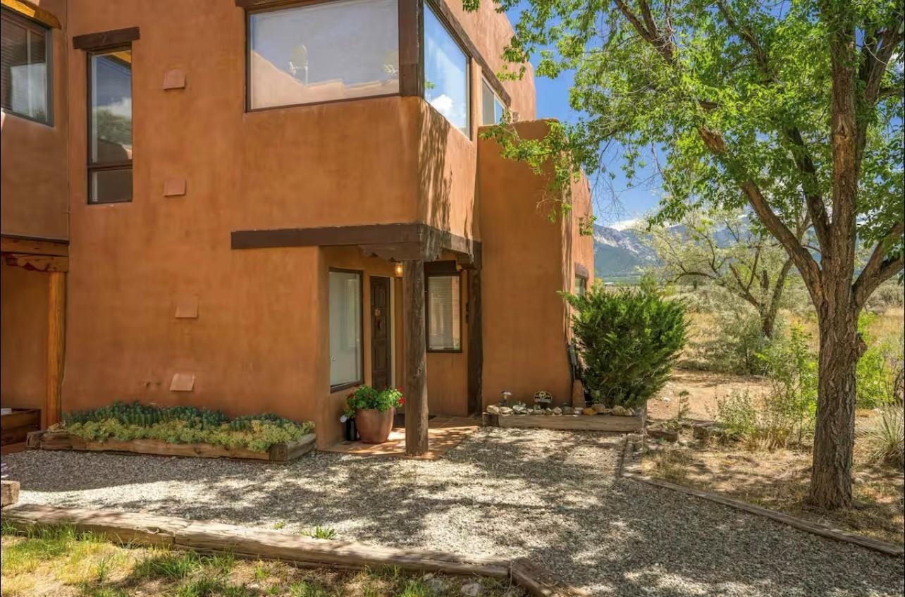 YOUR PLACE IN THE FUN. If your’e looking for a stylish get-a-way or home-sweet-home that’s near Taos Ski Valley and the great outdoors yet convenient to town, then take a look at this find! This 2BR/2BA approx. 1,4016 sq ft townhouse (no HOA fees) has so much to offer. The unbeatable location puts you under 30 min. to TSV and USFS and under 5 min. from the Tennis Ranch for tennis, pickleball, and swimming as well as 6 nearby restaurant/bars.. Picturesque Arroyo Seco is just up the road for shops, galleries, and even a well -stocked grocery. Being an end unit in this small 4 unit complex, there are lots of windows to provide lots of dramatic mountain views and lots of natural light. The living room has or an airy feel and the vigas, Mexican tile floors, bancos, and a nicho create a warm, Southwest ambience. The ample kitchen functions perfectly for a couple or a small crowd and boasts a built-in banco for in-kitchen seating. An artistic “keyhole” design separates the area and echoes traditional pueblo architecture. Out the kitchen door is an expansive, private walled patio to extend living area in the warmer months. Pets? A fenced dog run is possible. Completing the downstairs is a full bath with a washer/dryer convenient to all. Upstairs is the spacious primary bedroom with a sunny nook ideal for an office ( if you must), or relaxing with a good book or some good music. The 2nd bedroom offers more mountain views with a deck with space to chill, take in the views, or sip a cerveza. A large second bath with dual Talavera sinks completes the upper level. You’ll love the tranquility yet you have easy year-round access to the historic Town of Taos, colorful Arroyo Seco, TSV, USFS, Rio Grande Nat’l Monument, so hiking, biking, skiing, boarding, fishing, golf, and horseback riding are all available when you want to play. Isn’t it time to “Live a Little?” (Note: this is a townhouse, not a condo)