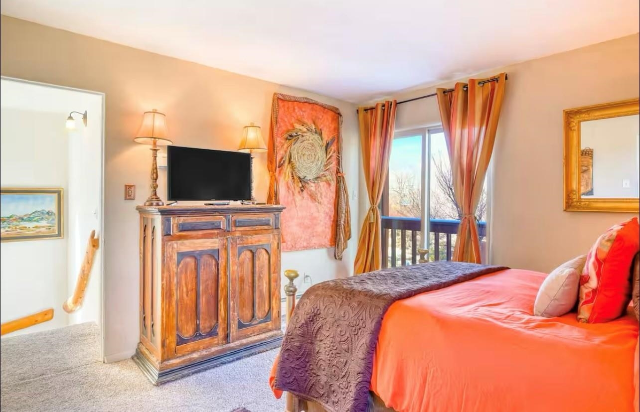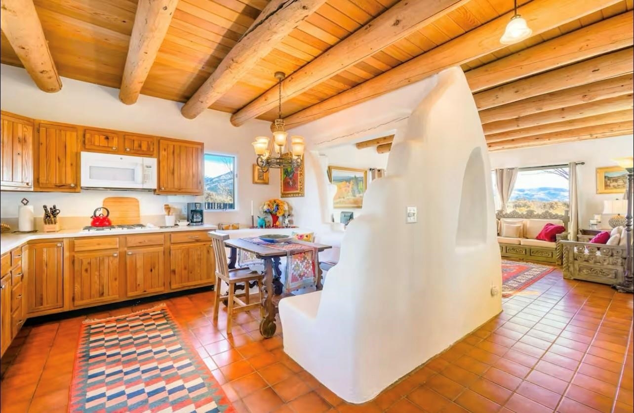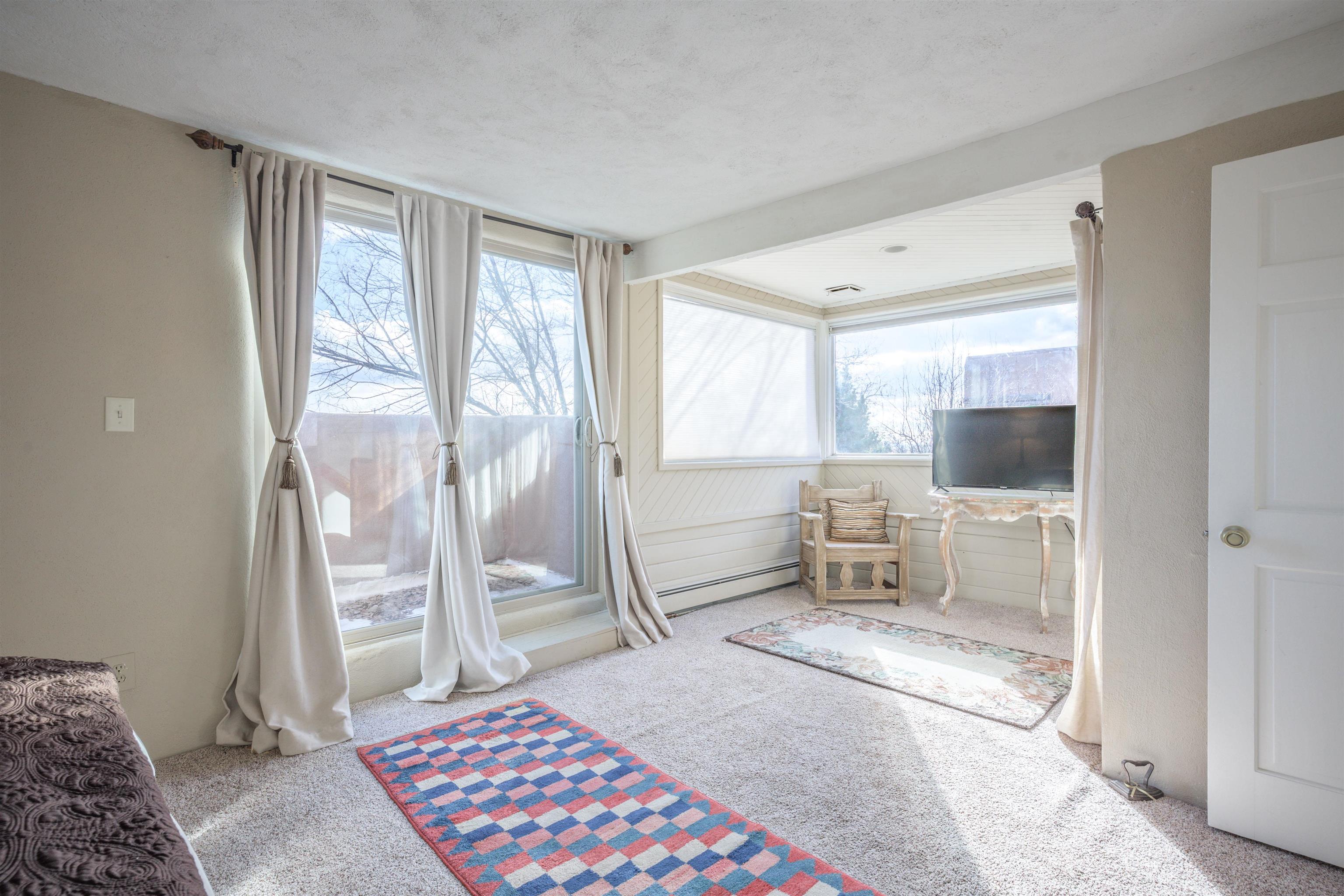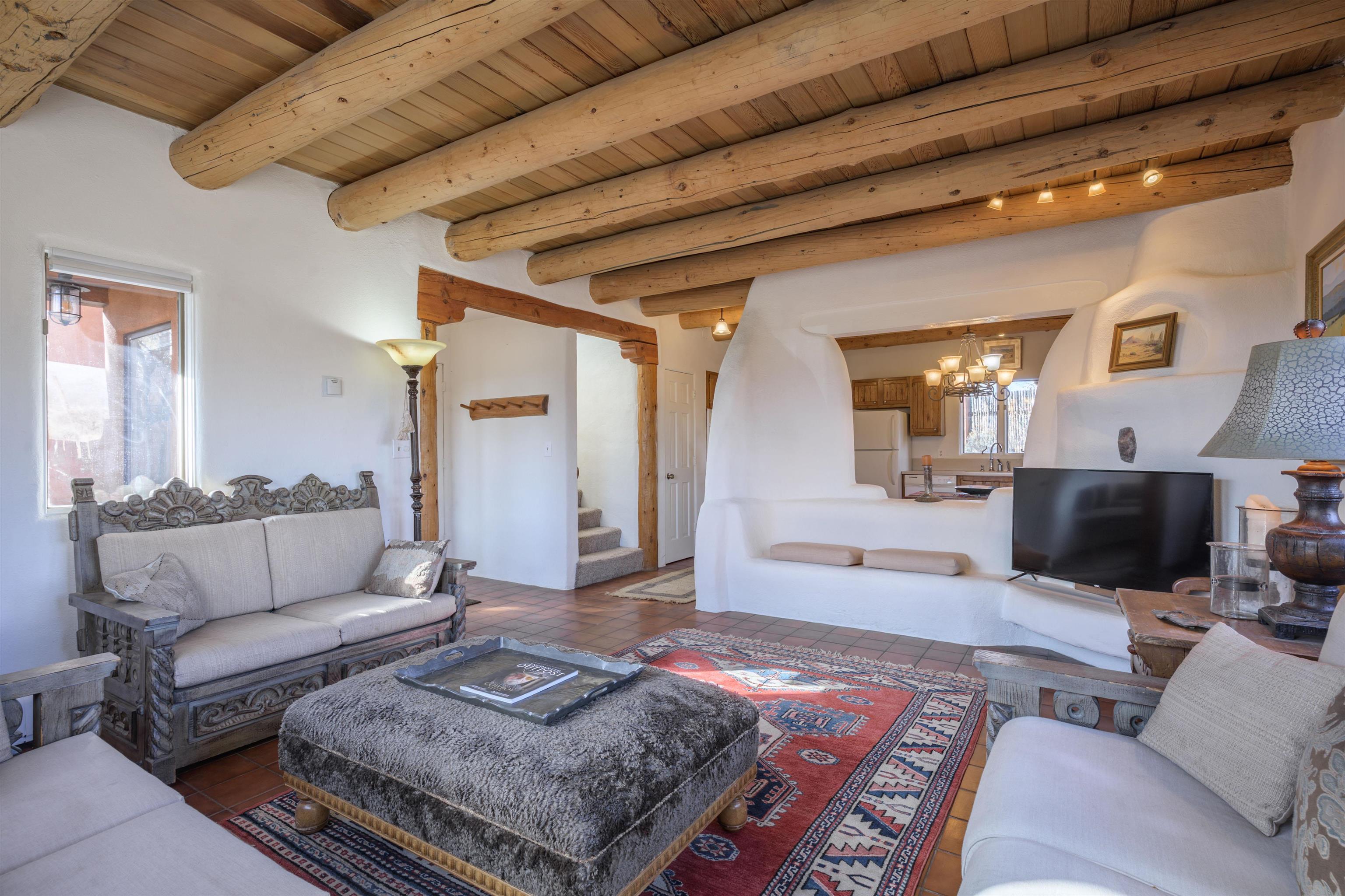 YOUR PLACE IN THE FUN. If your’e looking for a stylish get-a-way or home-sweet-home that’s near Taos Ski Valley and the great outdoors yet convenient to town, then take a look at this find! This 2BR/2BA approx. 1,4016 sq ft townhouse (no HOA fees) has so much to offer. The unbeatable location puts you under 30 min. to TSV and USFS and under 5 min. from the Tennis Ranch for tennis, pickleball, and swimming as well as 6 nearby restaurant/bars.. Picturesque Arroyo Seco is just up the road for shops, galleries, and even a well -stocked grocery. Being an end unit in this small 4 unit complex, there are lots of windows to provide lots of dramatic mountain views and lots of natural light. The living room has or an airy feel and the vigas, Mexican tile floors, bancos, and a nicho create a warm, Southwest ambience. The ample kitchen functions perfectly for a couple or a small crowd and boasts a built-in banco for in-kitchen seating. An artistic “keyhole” design separates the area and echoes traditional pueblo architecture. Out the kitchen door is an expansive, private walled patio to extend living area in the warmer months. Pets? A fenced dog run is possible. Completing the downstairs is a full bath with a washer/dryer convenient to all. Upstairs is the spacious primary bedroom with a sunny nook ideal for an office ( if you must), or relaxing with a good book or some good music. The 2nd bedroom offers more mountain views with a deck with space to chill, take in the views, or sip a cerveza. A large second bath with dual Talavera sinks completes the upper level. You’ll love the tranquility yet you have easy year-round access to the historic Town of Taos, colorful Arroyo Seco, TSV, USFS, Rio Grande Nat’l Monument, so hiking, biking, skiing, boarding, fishing, golf, and horseback riding are all available when you want to play. Isn’t it time to “Live a Little?” (Note: this is a townhouse, not a condo)