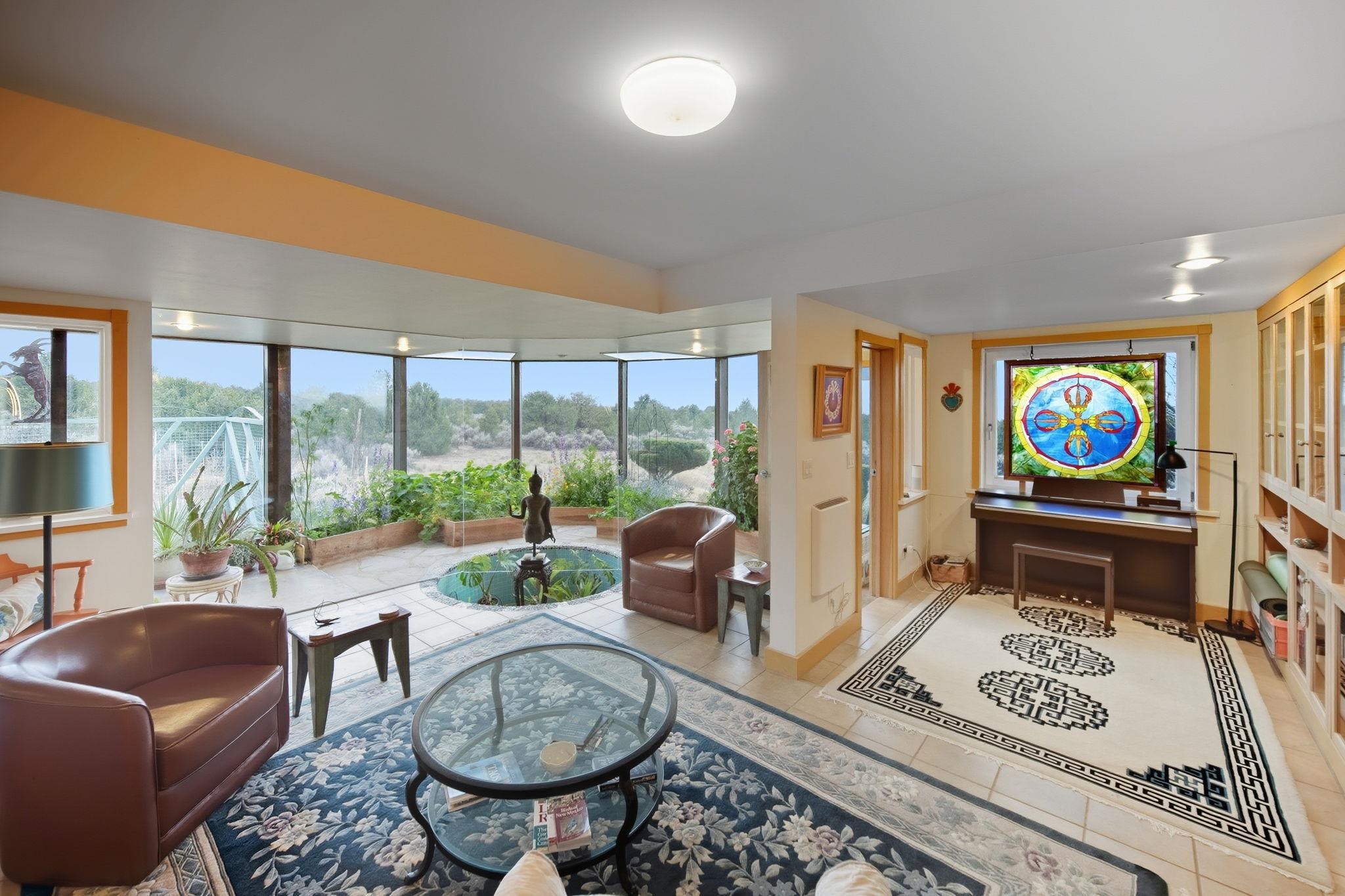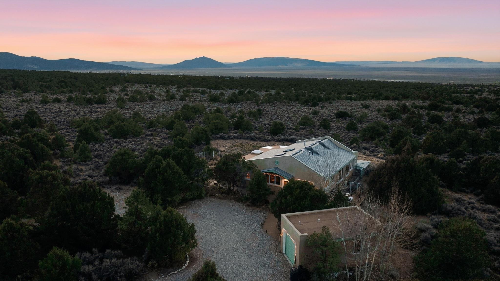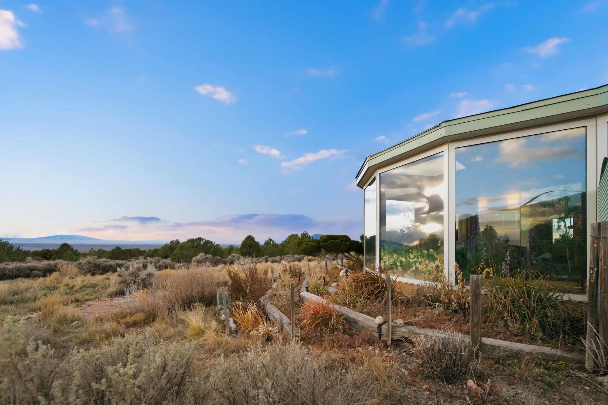 Light-Filled High Desert Sanctuary in El Rito/Latir ~ A true masterpiece of high desert architecture awaits at this stunning sanctuary, privately tucked at the end of a gated road on 5.78 acres in El Rito/Latir. Nestled in the foothills of the Sangre de Cristo Mountains, the vista encompasses the Northern Rio Grand National Heritage Area, Ute Mountain, San Antonio Mountain, Mt. Blanca in Colorado, and more ranges that offer the finest views Northern New Mexico has to offer. This architect-designed, custom 2-bedroom, 2-bath residence (2006) is defined by superior 2x6 construction and a focus on views and light. The sunroom and greenhouse provide exceptional passive solar gain while offering a space for winter food and summer flowers. Enjoy sunsets from the living room, and light from the twelve incredible skylights throughout the home that ensure every vaulted interior space is bathed in natural light. Impeccable craftsmanship and thoughtful care are evident inside, from the classy see-through living room fireplace and sophisticated recessed lighting to the fossil-filled travertine tile and artistic contemporary Southwestern finishes. The gourmet kitchen boasts handmade, German-inspired cabinetry, ample counter space, and top-tier energy-efficient stainless steel appliances, seamlessly integrating function and artistry. Thoughtful luxuries include extensive built-in bookcases, wool carpet, a Japanese soaking tub, and a dedicated, sun-drenched office. The practical features continue with an automatic-door one-car garage and a dual-fuel generator for reliable backup. Outside, a maintenance-free composite deck wraps half the home, ideal for sipping sunrise coffee or evening patio entertaining. The pristine, low-maintenance landscaping features local sculptures, perennials, an automatic sprinkler system, and an orchard protected by electric fencing. A handsome custom metal dog kennel accessible via the laundry room doggy door is perfect for your furry friends to play while you relax and absorb world-class sunsets and big, starry night skies near the Latir Peak Wilderness. This unique property is minutes from world-class skiing at Taos Ski Valley and Red River, the Rio Grande Wild Rivers Recreation Area, and the RCCLA Rio Costilla Park and Campground for superb hiking, fishing, and camping. The Kagyu Mila Guru Stupa is just around the corner for meditation and prayer, downtown Taos is a lovely drive South for shopping and gourmet dining, and Colorado nature or Denver amenities are an easy outlet North. This is your chance to own a piece of New Mexico magic at your very own high desert mountain sanctuary.