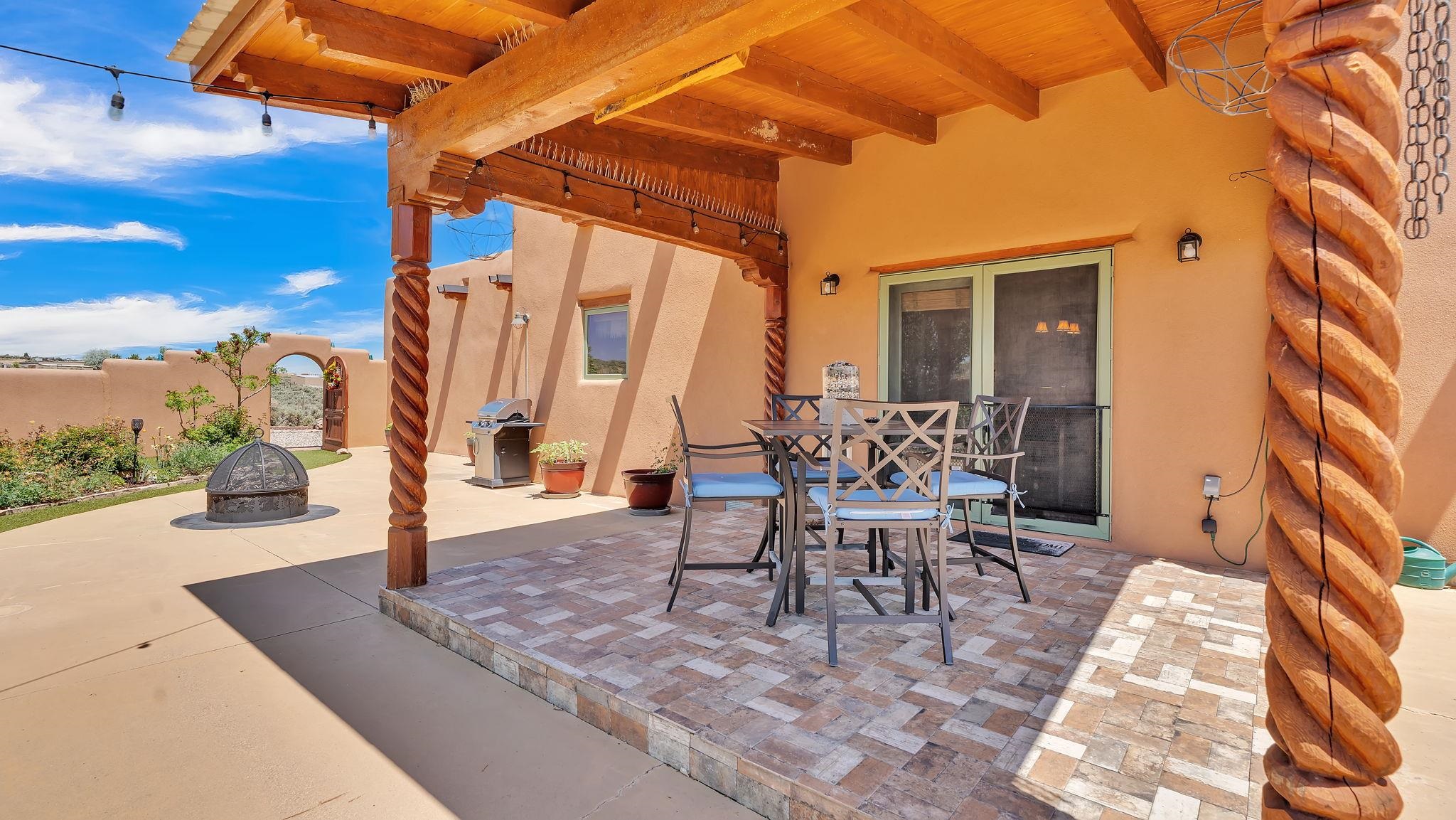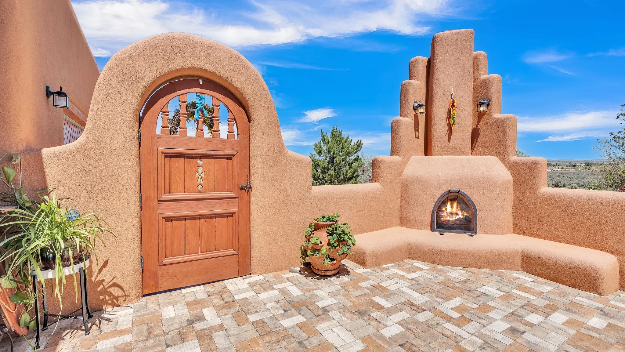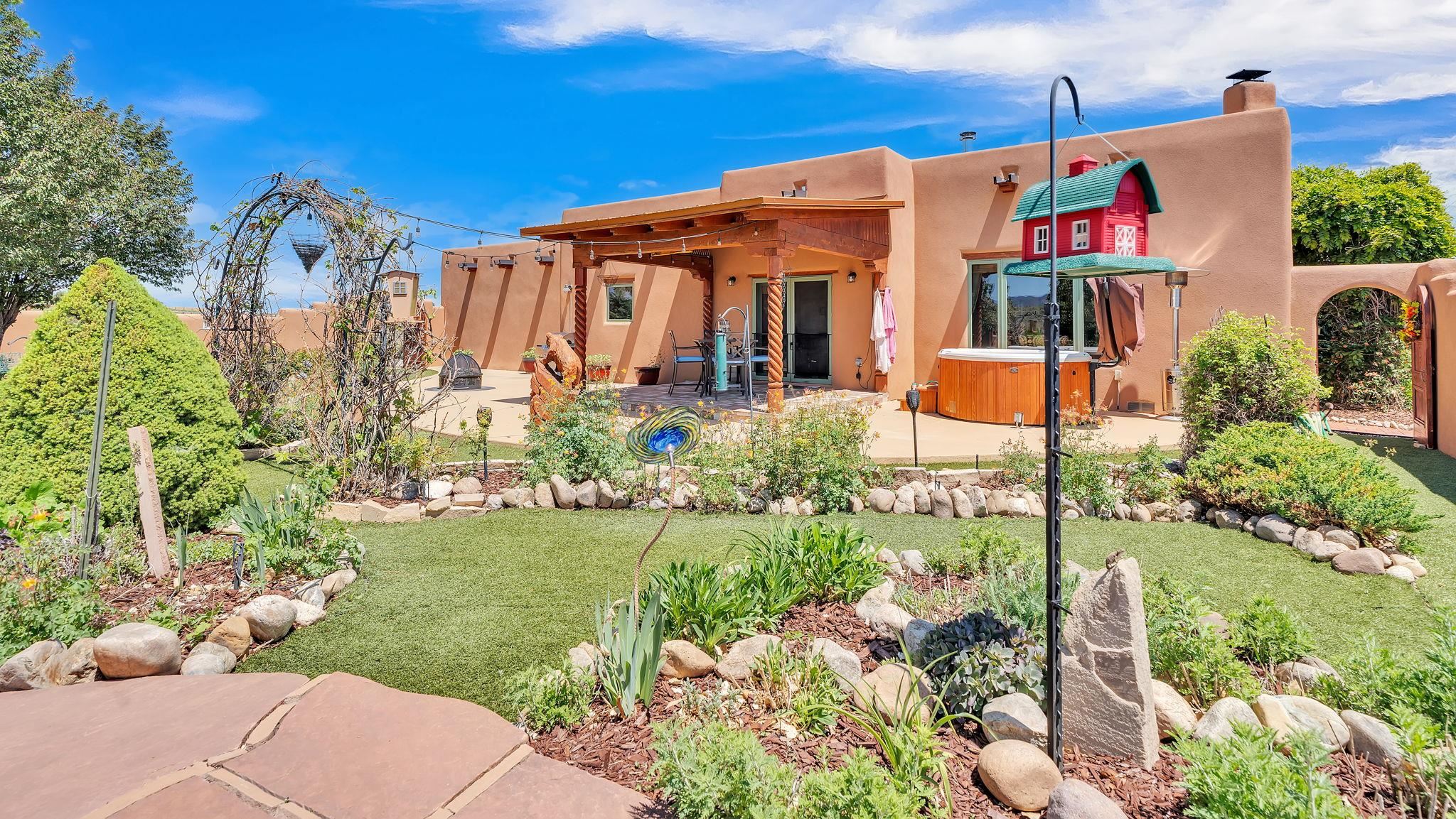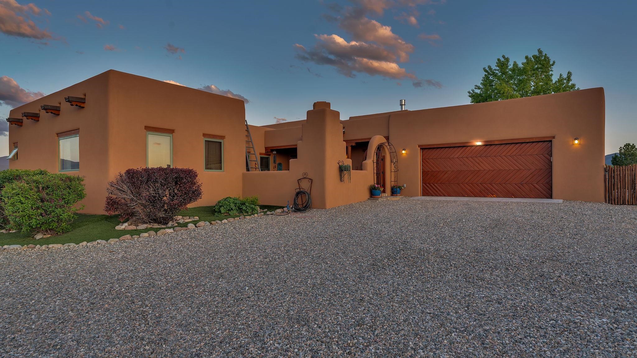 An Extraordinary High Desert Escape Bordering Taos Country Club ~ Turn onto a private and quiet Copper Moon Road, drive all the way to the very end, and feel the world melt away as you make your way into a hidden oaasis through the automatic gate. A charming front courtyard will embrace you and your guests with the crackling sounds of an outdoor traditional wood-burning fireplace and a serene fountain—the perfect prelude to the beauty within, and all around. Upon entering this masterfully crafted Southwestern style home where almost every window frames the majestic Sangre de Cristo Mountains, you immediately feel like you are exactly where you should be. This 1,988 square foot residence possesses a generous layout with three bedrooms, two and a half bathrooms, and an oversized two-car garage. The living room, dining room, and kitchen seamlessly merge to create an inviting open-space for connection and relaxation. The chef's kitchen is guaranteed to inspire culinary adventure on the daily with its stainless steel appliances, such as, a Miele Induction Stove, a double oven, and tons of thoughtful storage, including a turning pantry. Throughout the home, authentic Southwestern details captivate: vigas, tongue-and-groove ceilings, twisted beams, a second traditional fireplace, 17-inch tile throughout, and creative lighting fixtures—even within a striking lit display in the dining room. Soaring 12-foot ceilings in the common areas and 10-foot ceilings in the bedrooms amplify the sense of spaciousness. The freestanding Hearthstone wood burning fireplace in the living room is a major plus, and has the ability to keep the entire home warm by itself. Beyond the walls, this incredibly private home sits on 2 lush acres overlooking hole #3 at Taos Country Club. Immaculate landscaping thrives with drip irrigation, ensuring effortless beauty year-round, and especially so at this very Spring moment following abundant rainfall. Explore a labyrinth out back in the courtyard, kick back and relax on adirondack chairs during magical sunsets and sunrises, and cultivate your green thumb passions in the enclosed vegetable garden. The back courtyard is a true delight, boasting perennial flowers, a variety of deciduous and fruit trees, and a free-standing hot tub to relax in after a long day of working the yard, playing a round, or hitting the ski slopes. For all your projects and toys, a 20x30 foot electrified workshop and a 12x30 foot RV carport are ready to go at the corner of the property. This property is an easy outlet out of town to Santa Fe, an easy drive to town on the back-roads, and just down the road from hiking, fishing and mountain biking at the Slide Trailhead down CR-110. Properties with ALL of this are a rare find these days, and especially for this price. Come see for yourself!