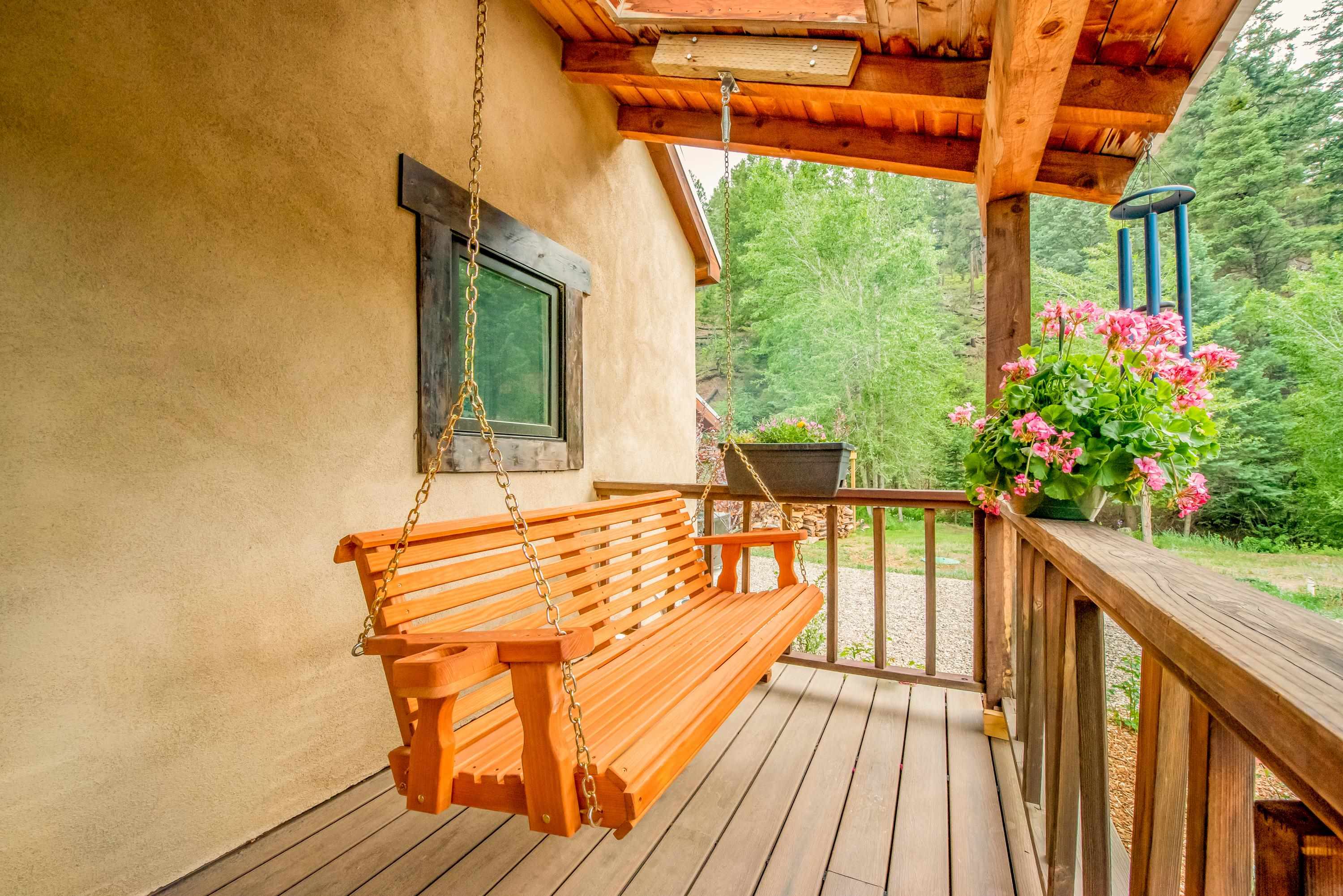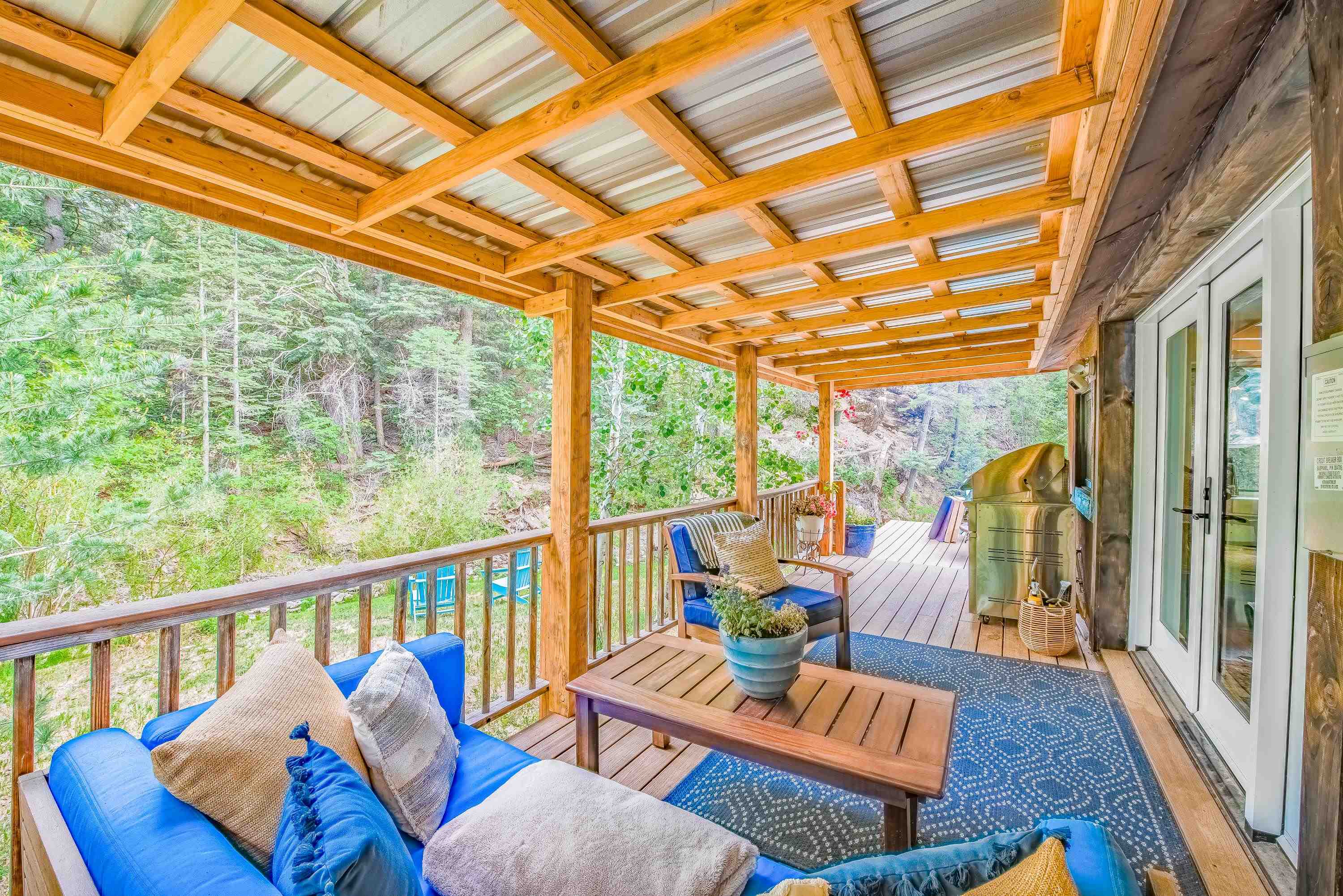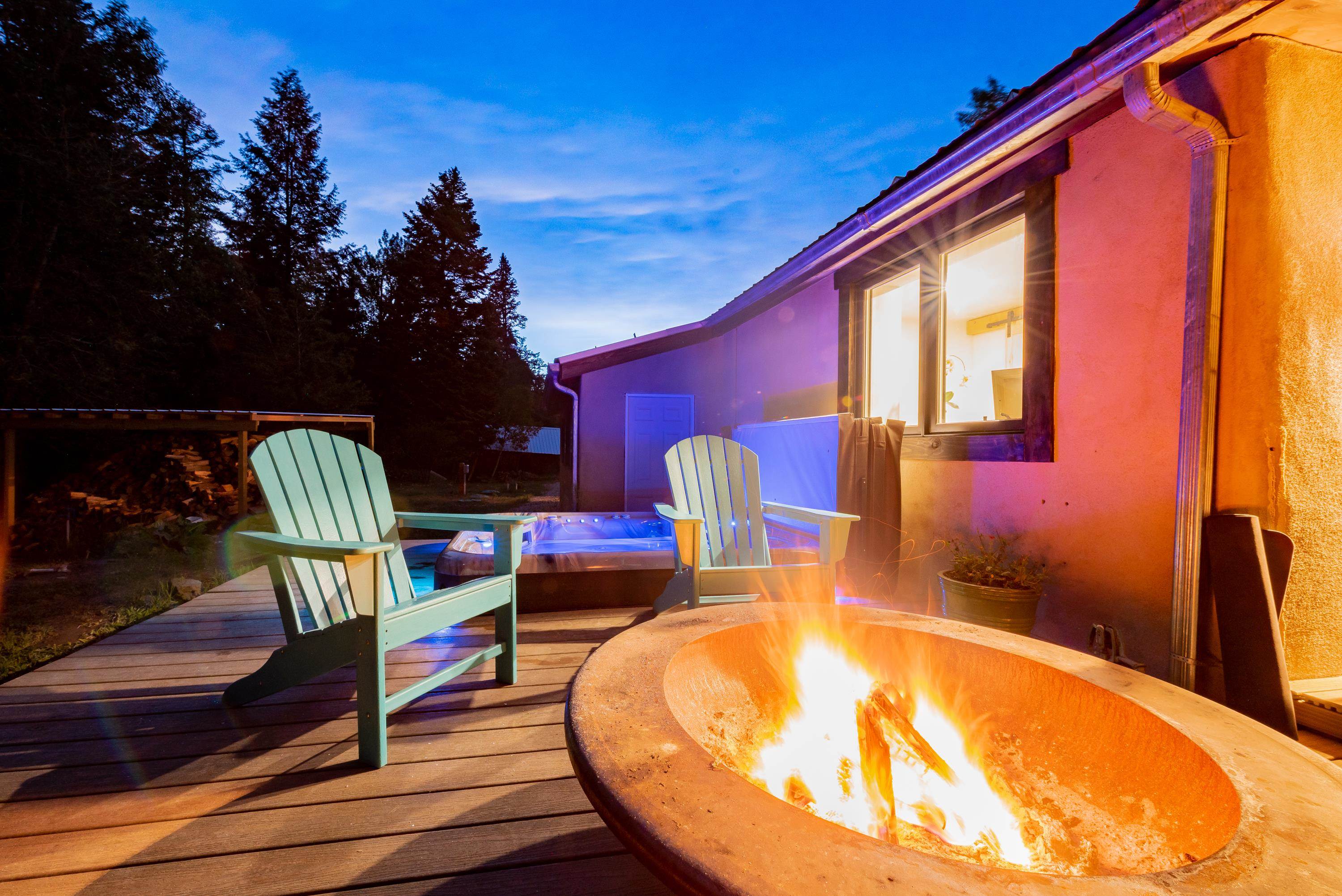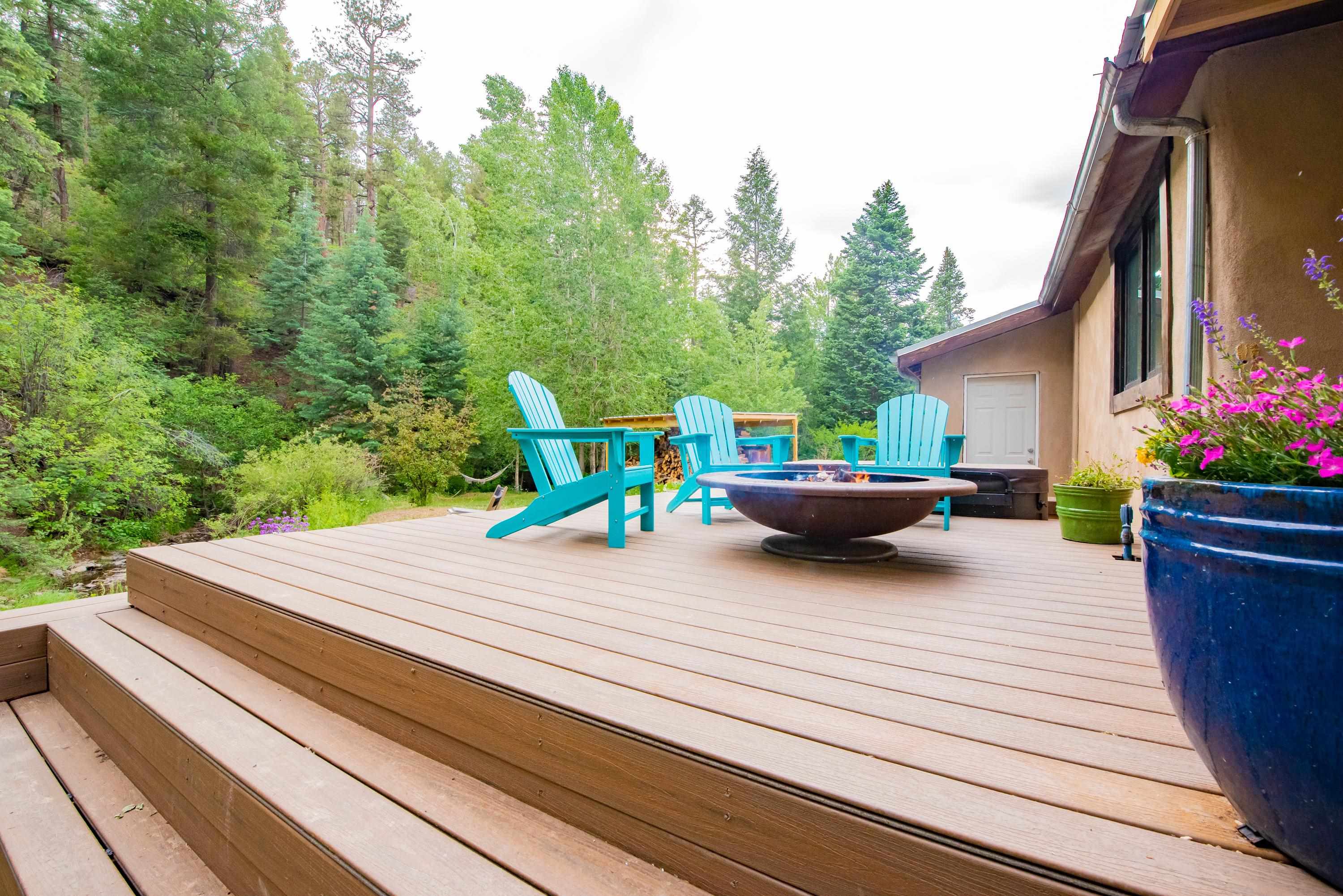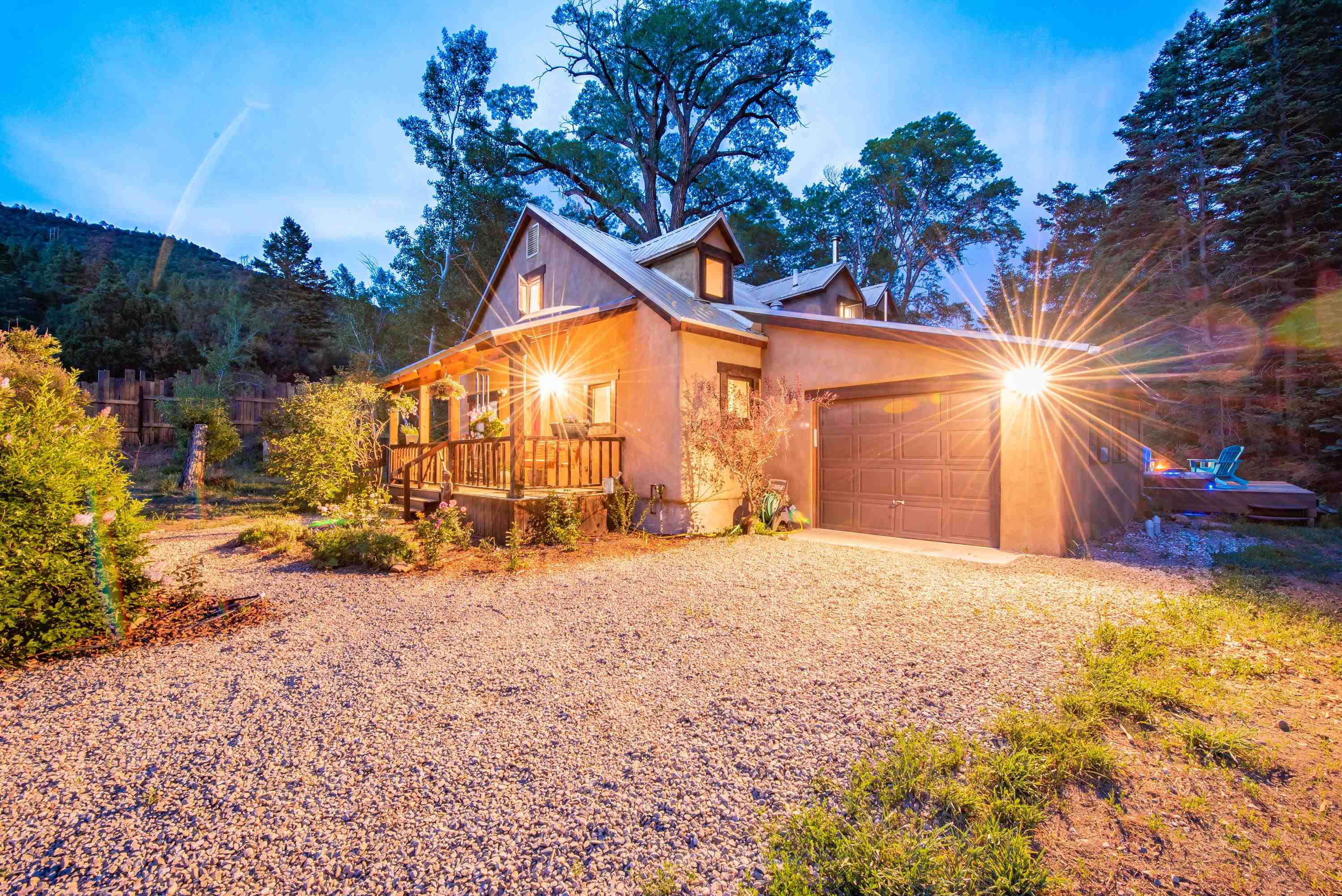 A Magical Cabin along the Rio Fernando! This charming cabin built in 1939 has been extensively remodeled with high-end amenities, creating the perfect balance of rustic charm and modern luxury. Located on almost 5 acres and bordering the Carson National Forest, the cabin has the river meandering right off the back deck. This property is like living in a fairy tale. Two bedrooms, two bathrooms, with an additional sleeping/office space right off the beautiful chef’s kitchen, and this has a sliding barn door to add some privacy. The gourmet kitchen has Miele appliances and tons of cabinet space, and the dining room has plenty of room for creating wonderful memories with family and friends. The large living room has a beautiful rock fireplace with insert for warming up on those cozy winter days. There is one bedroom with bathroom downstairs, and the spacious second floor primary en suite has its own wood burning stove. Grill out on the deck, relax in the hammock under the trees or on the outdoor sofa listening to the river’s calming sound. Soak in the built-in hot tub and stare at the stars or enjoy roasting marshmallows around the fire pit. Curl up to a good book while relaxing on the large, covered portal. Just 10 minutes to the Taos Plaza, you will be close enough to enjoy the action in town, but far enough to escape the hustle and bustle, and immerse yourself in nature and solemnity, and take advantage of the several hiking trails just minutes away. This is truly a dream for someone who loves nature, tranquility and the ability to retreat away from life’s drama. This property is also an extremely successful Airbnb rental. This home is being sold fully furnished, and there is a 3D Matterport interior video tour and exterior drone video available on this listing. The listing brokerage and/or seller do not warranty the square footage or acreage of the property. If it is of material interest to the buyer, then the buyer should have it measured.