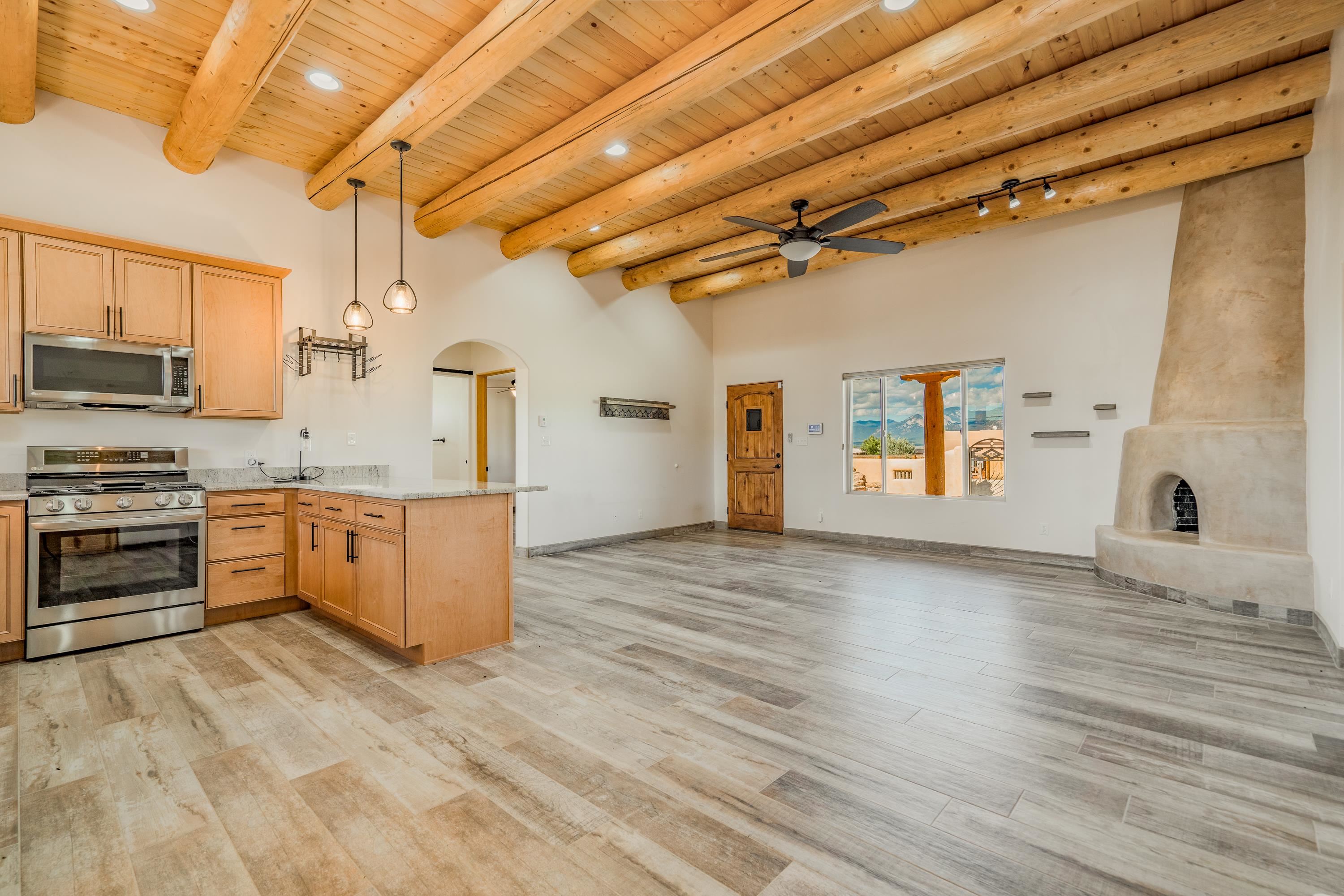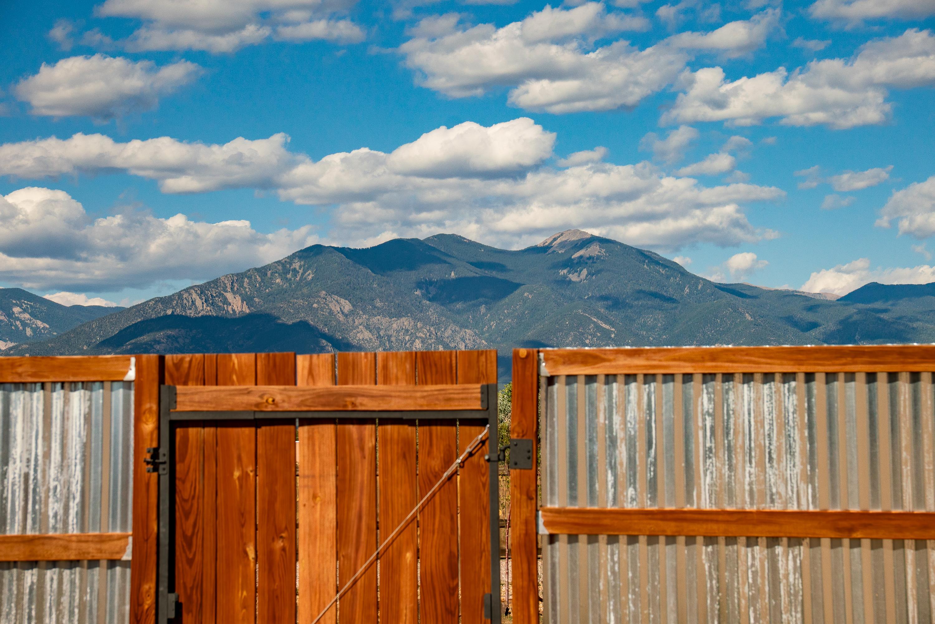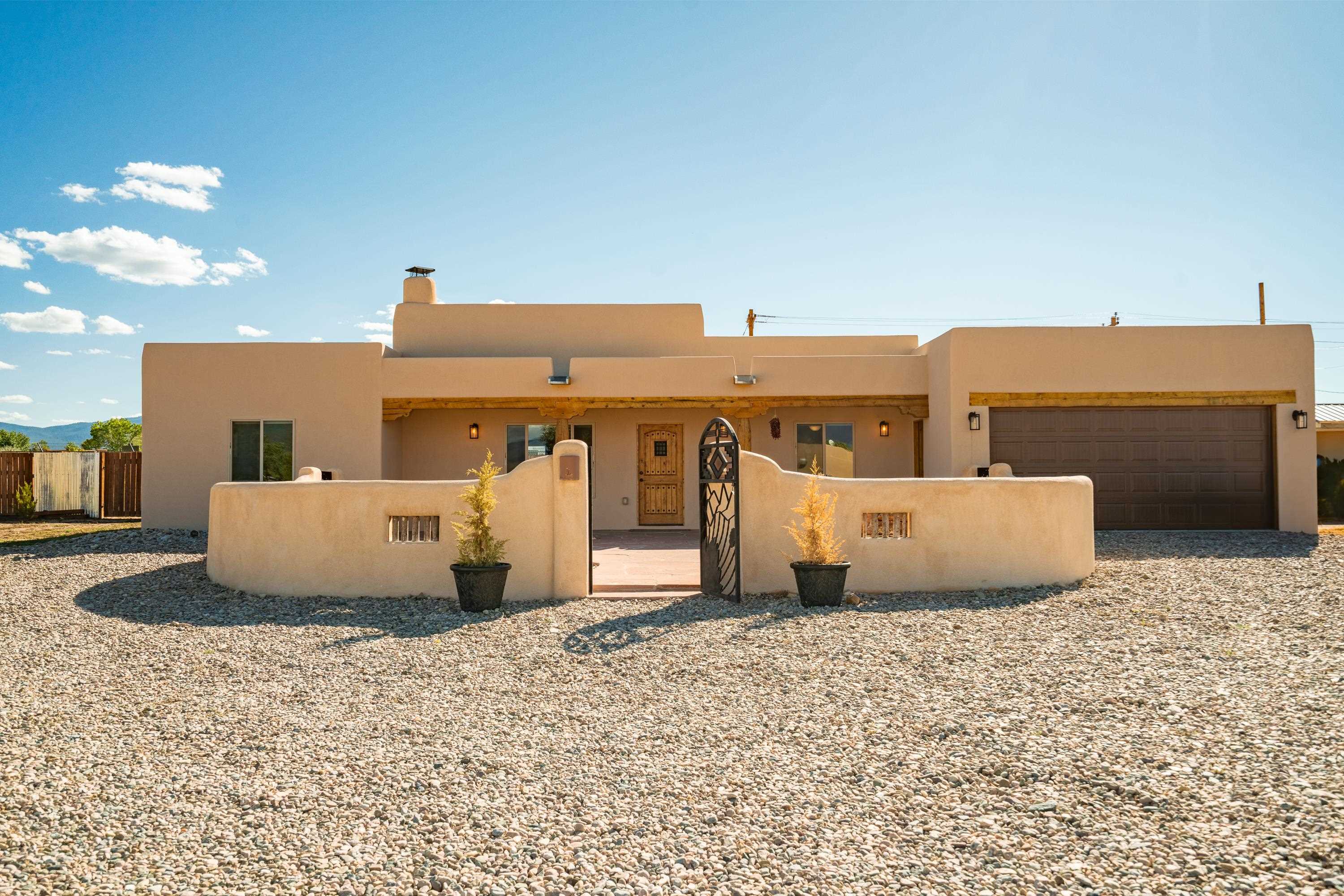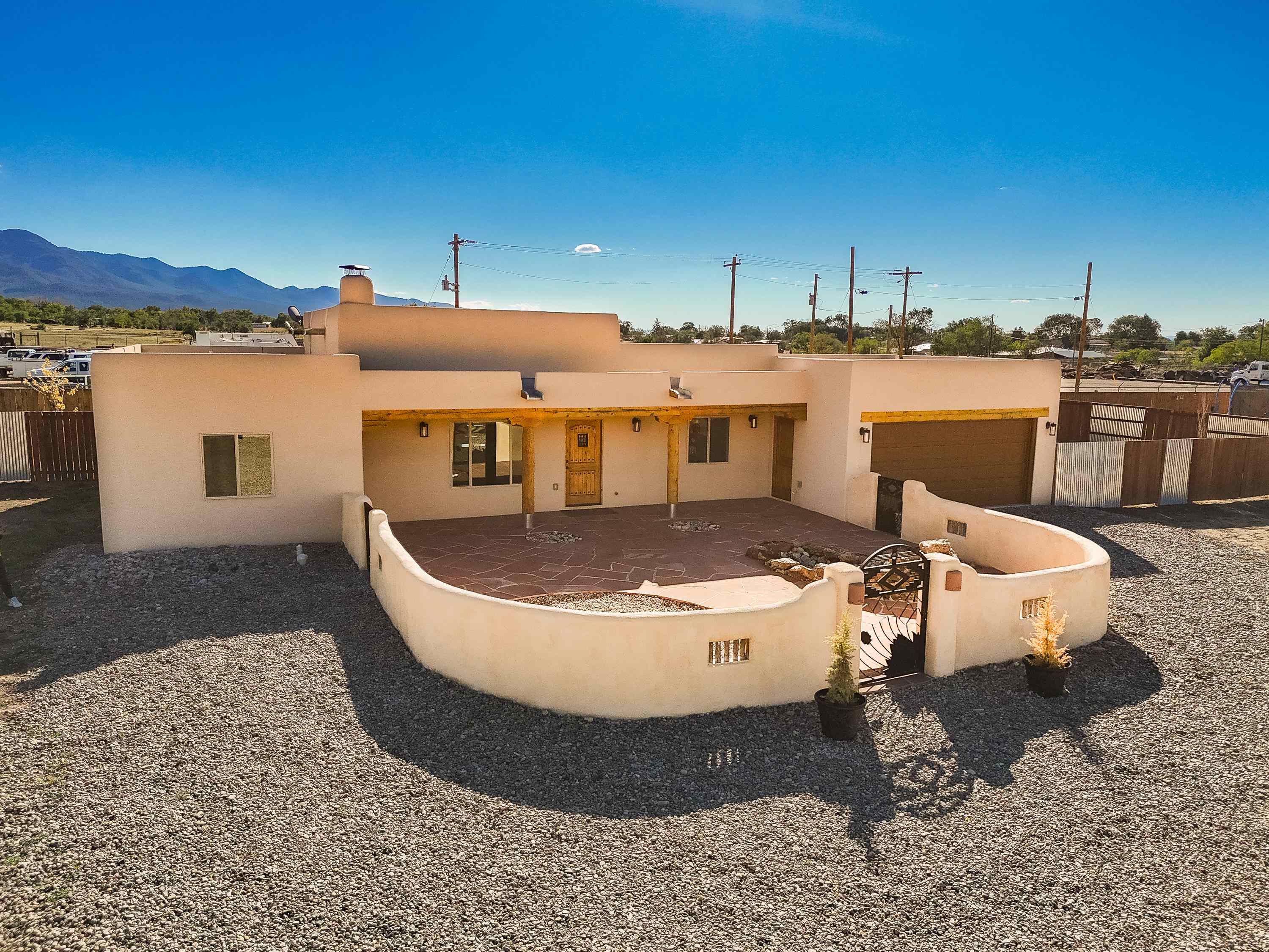 Wow! This home has a LOT of elements that make it an ideal place to live. Want to know more? Set off a dead-end road with a perfect floor plan, views, no deferred maintenance, with the most ideal bedroom and bathroom count — this home is rockin’! The road and parking area are fully graveled — no dirt or mud to worry about. The front courtyard is gated with custom metal gates set in an adobe wall and features a big flagstone patio, a large real rock water feature, and great Taos Mountain views you can also enjoy from the living room and master. Inside, you’ve got 1,382 sq ft, 3 bedrooms, and 2 full baths. The living room feels open with 12’ tongue-and-groove ceilings with large vigas, and a wood-burning kiva fireplace with a nice diamond plaster finish. The kitchen has granite counters, oversized cabinets, stainless steel appliances, and even a wine cooler. In the spaces where window coverings matter most, you’ll find top-of-the-line Hunter Douglas cellular blinds already in place! The master suite comes with a walk-in closet, dual vanity sinks, and large windows that let in tons of natural light. The house was built in 2021, so there’s no deferred maintenance. It’s heated by radiant floor heat with an on-demand boiler powered by natural gas for low heating bills. The attached 2-car garage is heated and completely finished. There’s also a whole-house water softener, ADT security system (just needs activation), and a dedicated laundry closet. Out back, you’ll find a fully fenced yard that’s perfect for pets, a portal with a matching flagstone patio, and a brand-new oversized shed for storage. Xeriscaping in the front keeps things easy, and the neighborhood itself is quiet and welcoming. Put your roots down in this neighborhood!