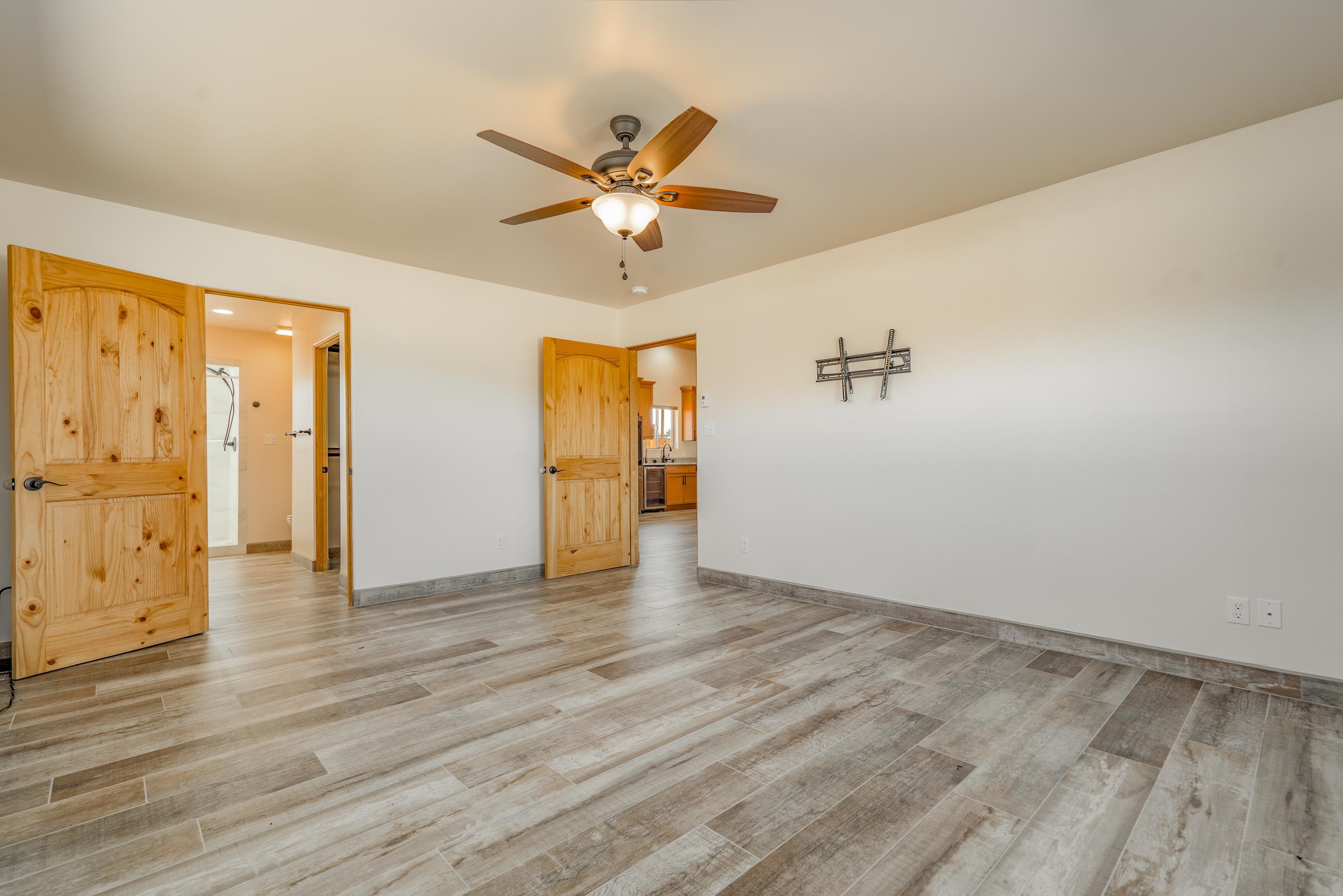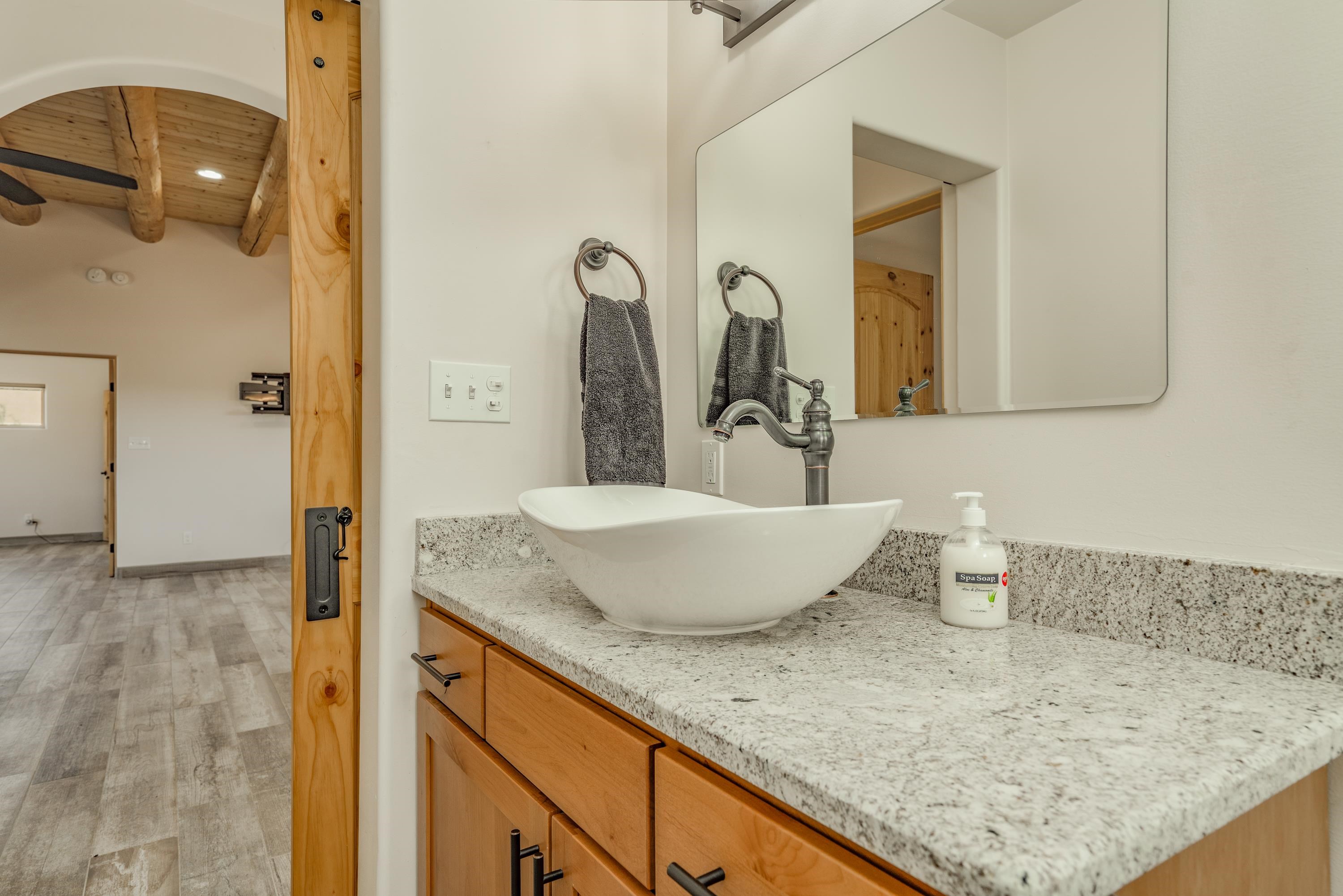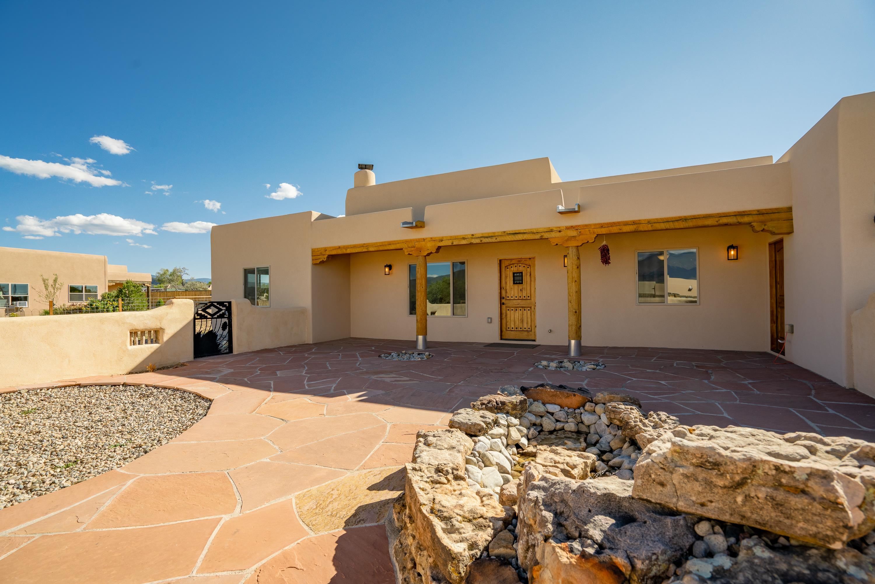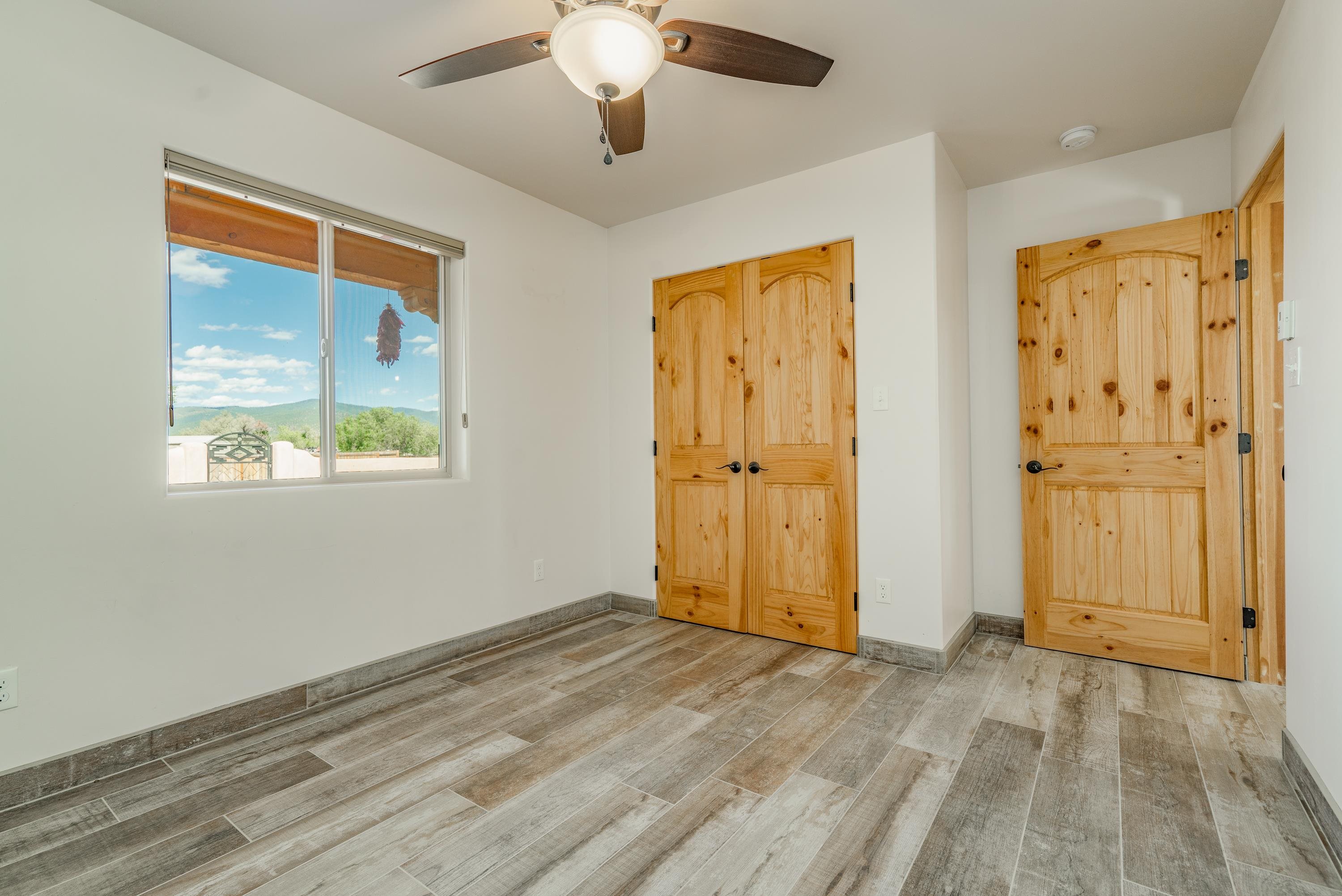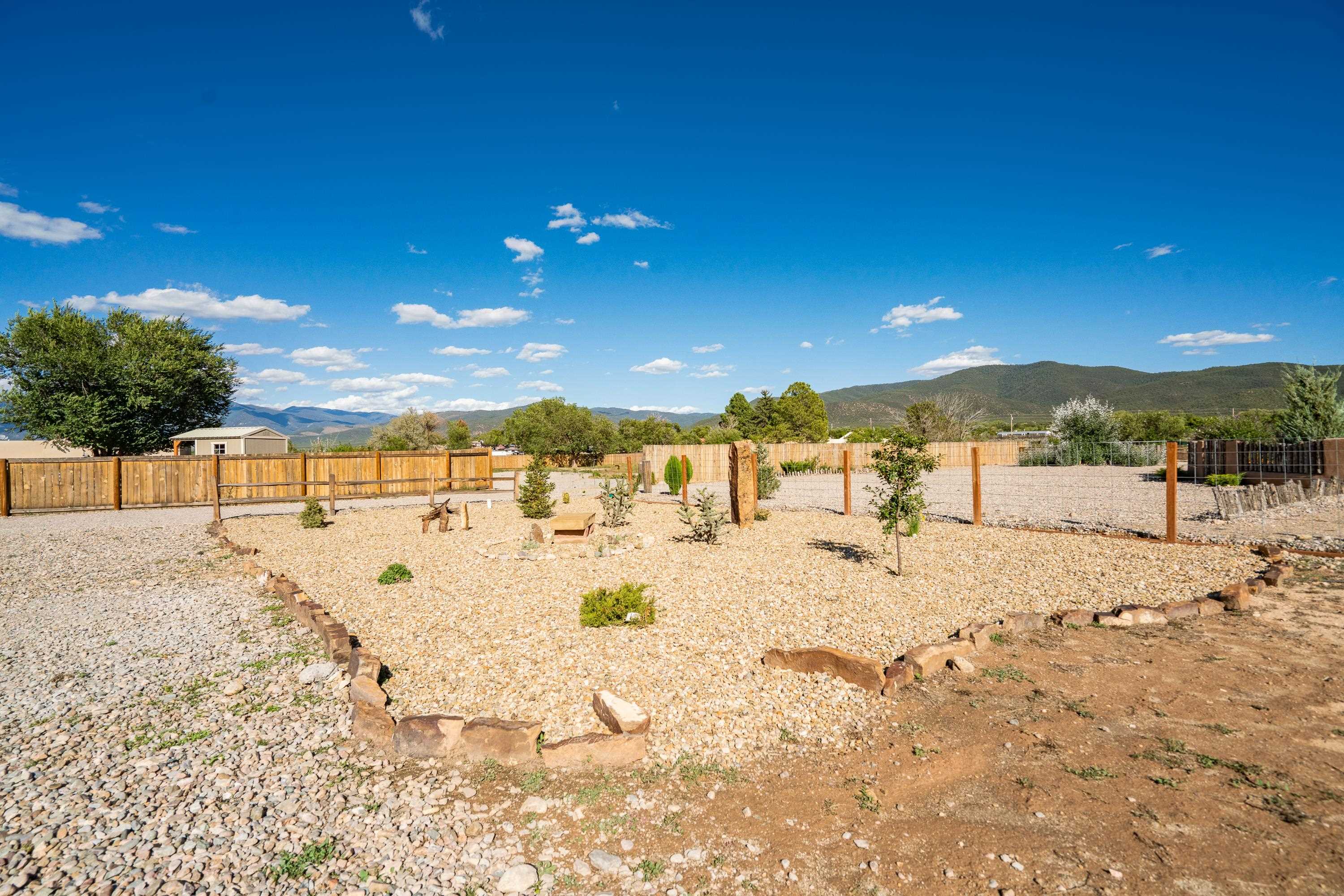 Wow! This home has a LOT of elements that make it an ideal place to live. Want to know more? Set off a dead-end road with a perfect floor plan, views, no deferred maintenance, with the most ideal bedroom and bathroom count — this home is rockin’! The road and parking area are fully graveled — no dirt or mud to worry about. The front courtyard is gated with custom metal gates set in an adobe wall and features a big flagstone patio, a large real rock water feature, and great Taos Mountain views you can also enjoy from the living room and master. Inside, you’ve got 1,382 sq ft, 3 bedrooms, and 2 full baths. The living room feels open with 12’ tongue-and-groove ceilings with large vigas, and a wood-burning kiva fireplace with a nice diamond plaster finish. The kitchen has granite counters, oversized cabinets, stainless steel appliances, and even a wine cooler. In the spaces where window coverings matter most, you’ll find top-of-the-line Hunter Douglas cellular blinds already in place! The master suite comes with a walk-in closet, dual vanity sinks, and large windows that let in tons of natural light. The house was built in 2021, so there’s no deferred maintenance. It’s heated by radiant floor heat with an on-demand boiler powered by natural gas for low heating bills. The attached 2-car garage is heated and completely finished. There’s also a whole-house water softener, ADT security system (just needs activation), and a dedicated laundry closet. Out back, you’ll find a fully fenced yard that’s perfect for pets, a portal with a matching flagstone patio, and a brand-new oversized shed for storage. Xeriscaping in the front keeps things easy, and the neighborhood itself is quiet and welcoming. Put your roots down in this neighborhood!