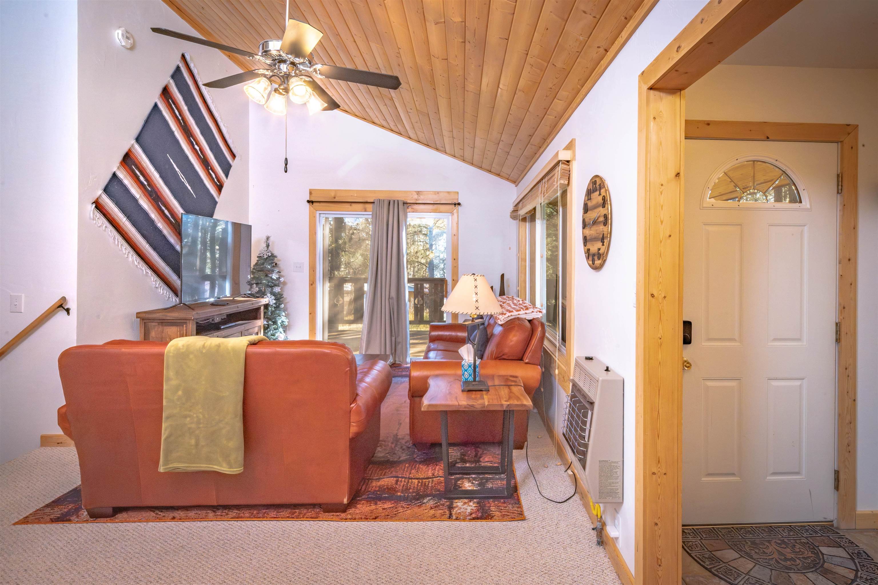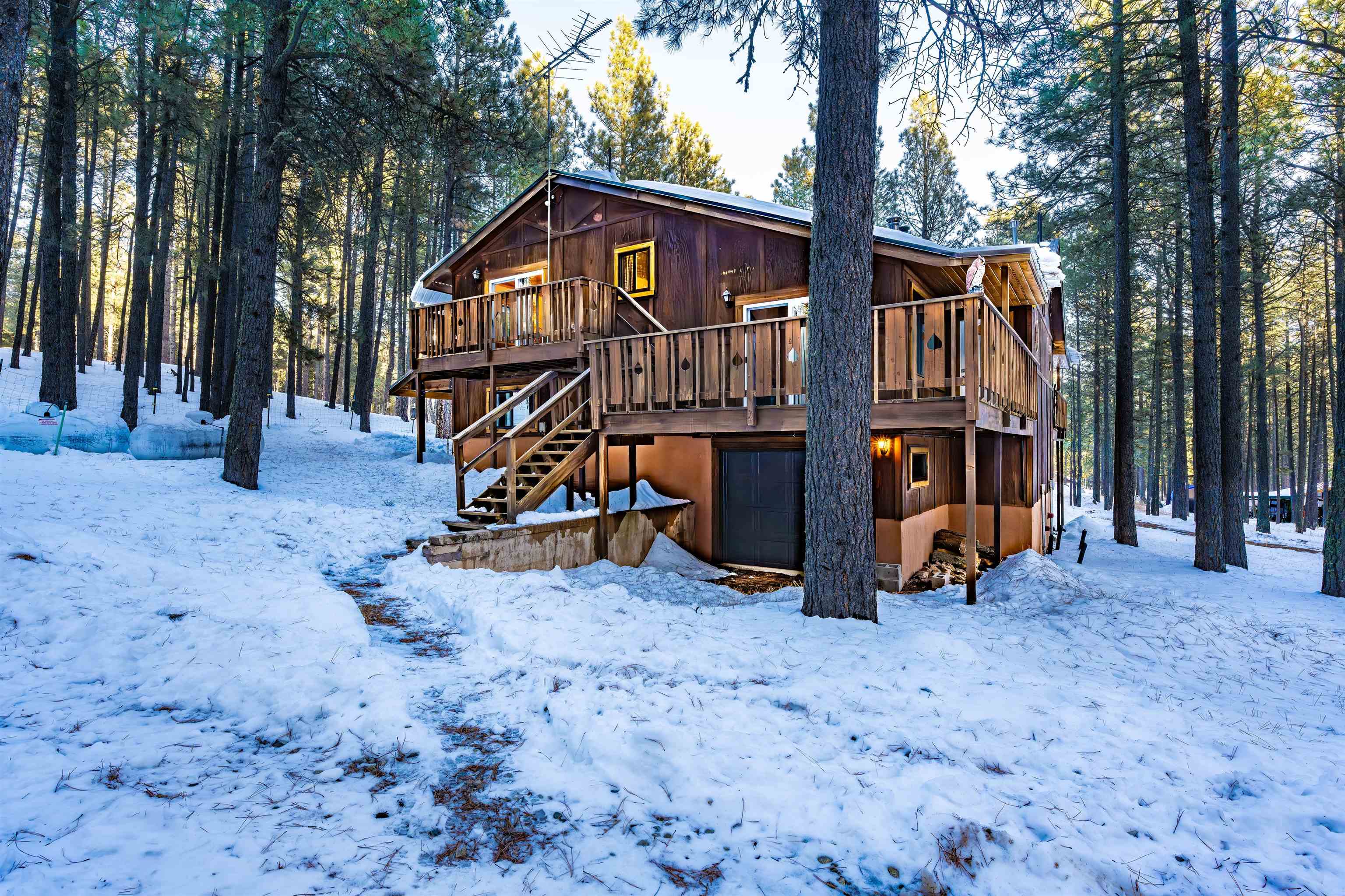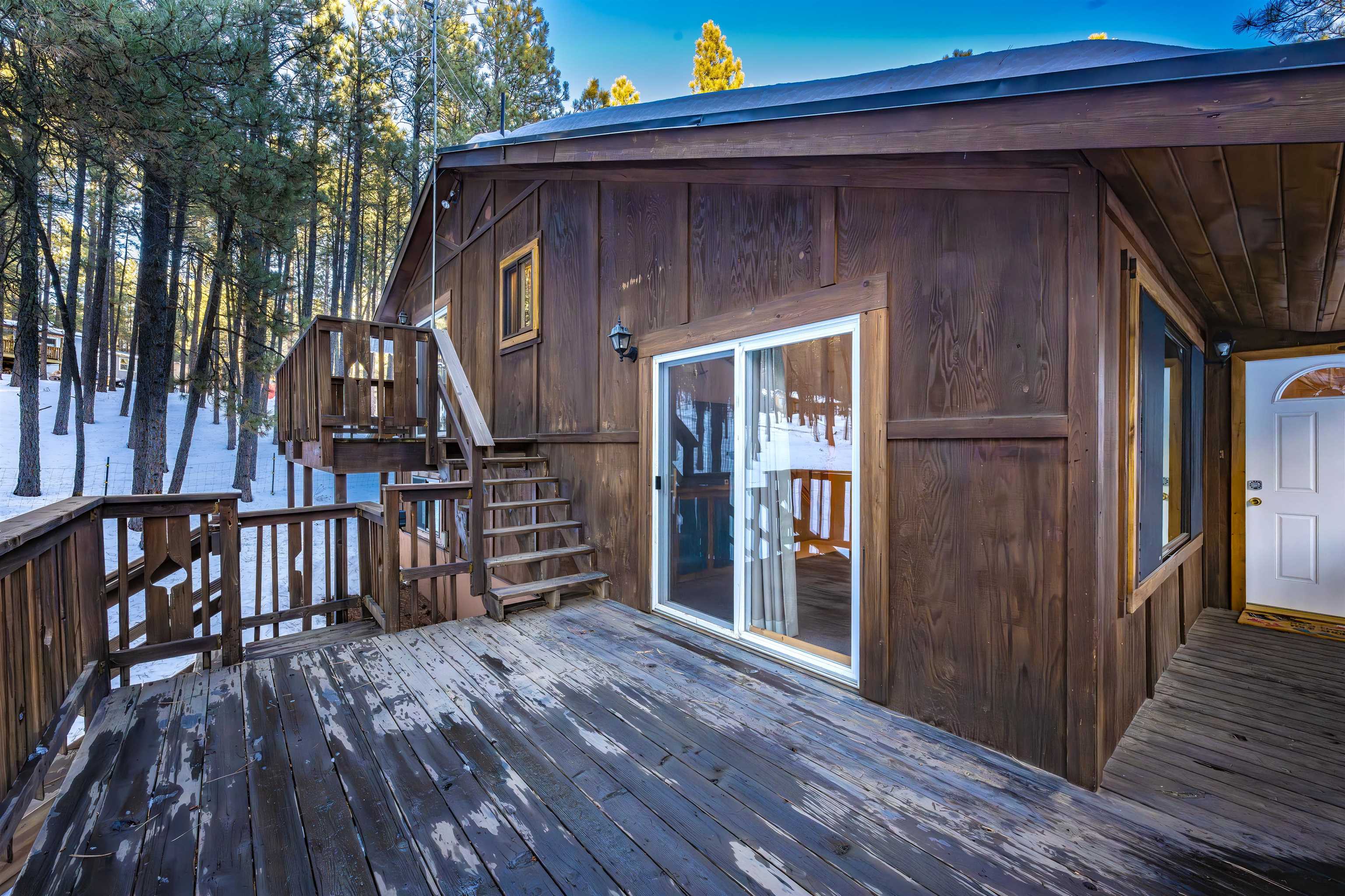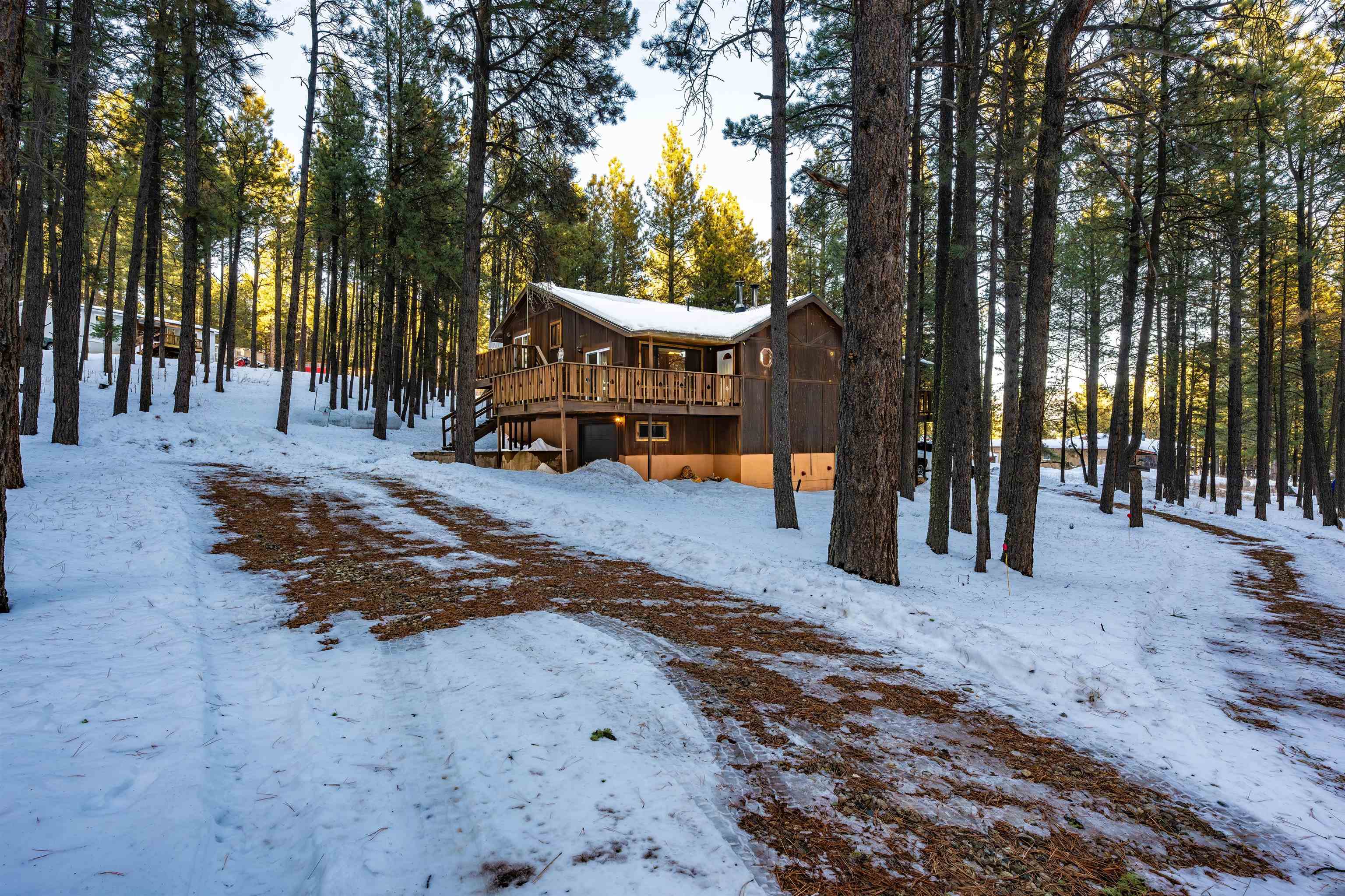 Looking for a mountain home that pays for itself? This well-kept duplex is already income-producing, with a month-to-month tenant on one side bringing in $2,000 a month! With an assumable VA loan at a 2.25% interest rate and seller financing as an option, this property makes for a great investment or mountain getaway that helps cover the bills. Together, the two mirrored units offer 2,930 sq ft of living space on a 1-acre wooded lot, just 10 minutes from Angel Fire Resort. Each side includes 3 bedrooms and 2 baths in a smart split-level layout that gives everyone a little privacy. The main entrance opens to a covered porch with tongue-and-groove ceilings and a welcoming foyer—perfect for kicking off your ski boots after a day on the slopes. The living room centers around a big wood-burning stove that keeps the whole place cozy on snowy days. Downstairs, you’ll find two bedrooms, a full bath, and garage access; upstairs you’ve got the kitchen and primary bedroom. Every level has its own propane wall heater for extra comfort. Recent updates include brand-new windows throughout and tongue-and-groove accents that give the home its warm mountain feel. Each unit has separate utility meters, so it’s easy to manage whether you live in one side or rent them both out. Outside the resort boundary—no membership fees here—saving you thousands every year. Fully furnished and turnkey, this quiet duplex is surrounded by tall pines and designed from the start to be both comfortable and income-generating.