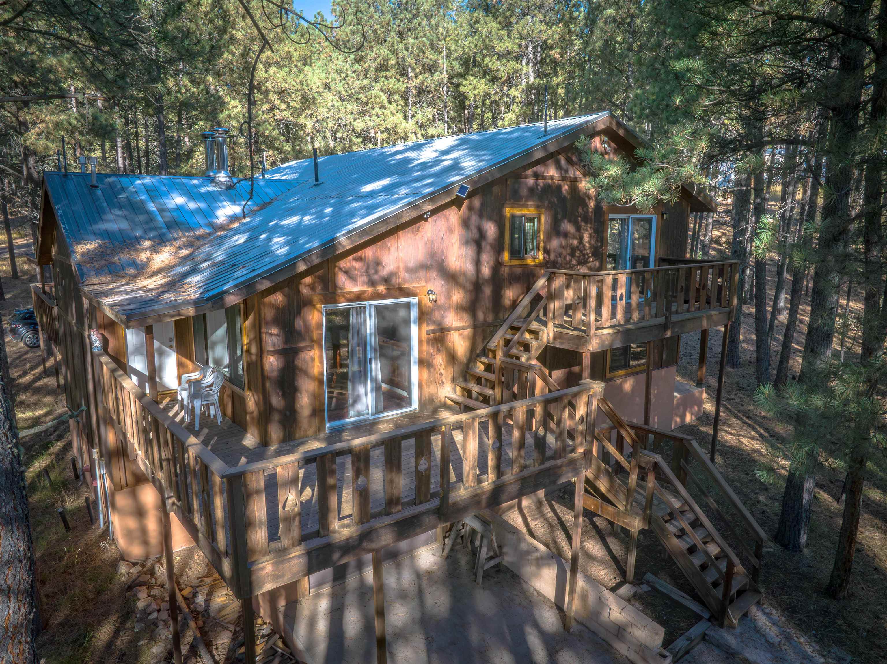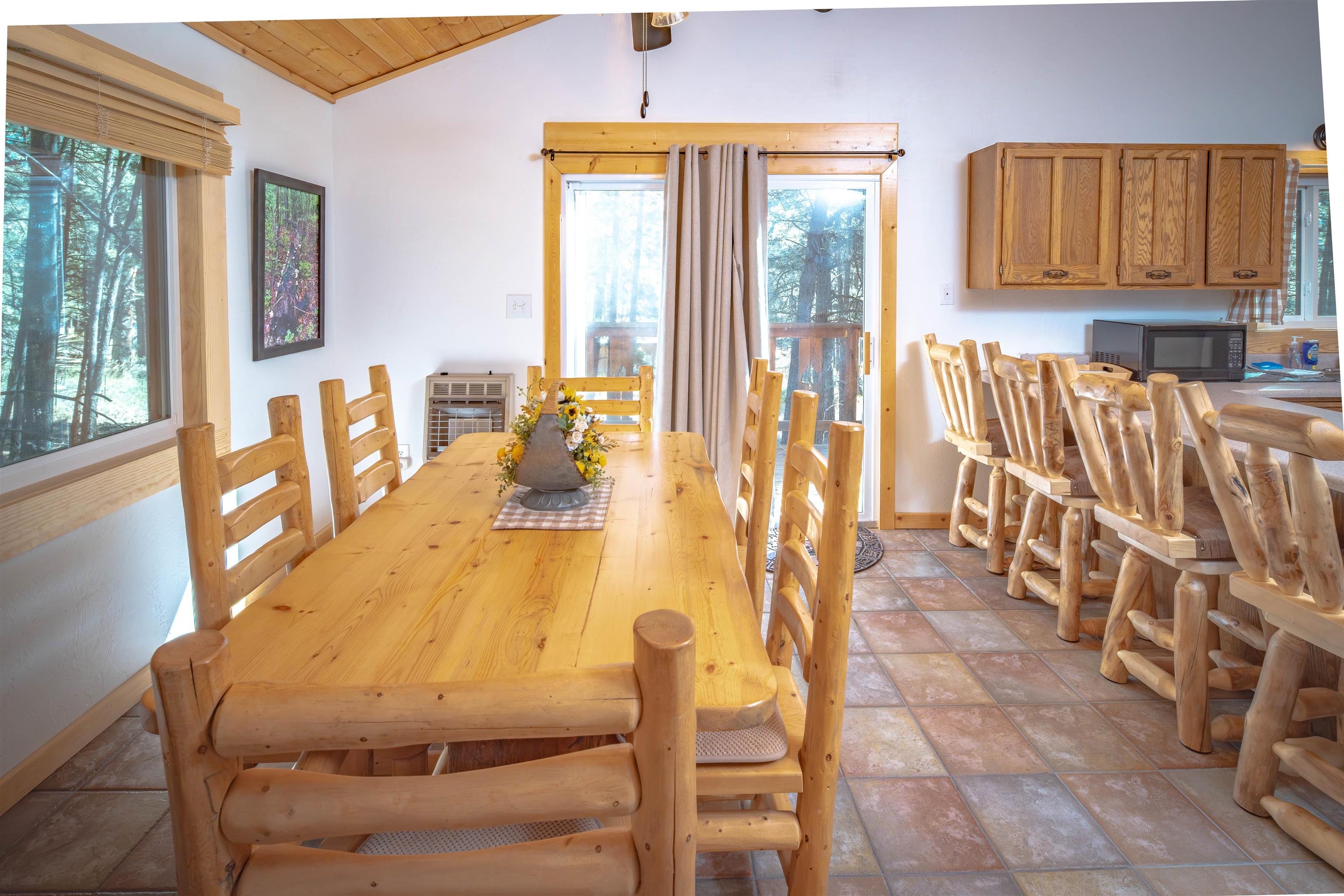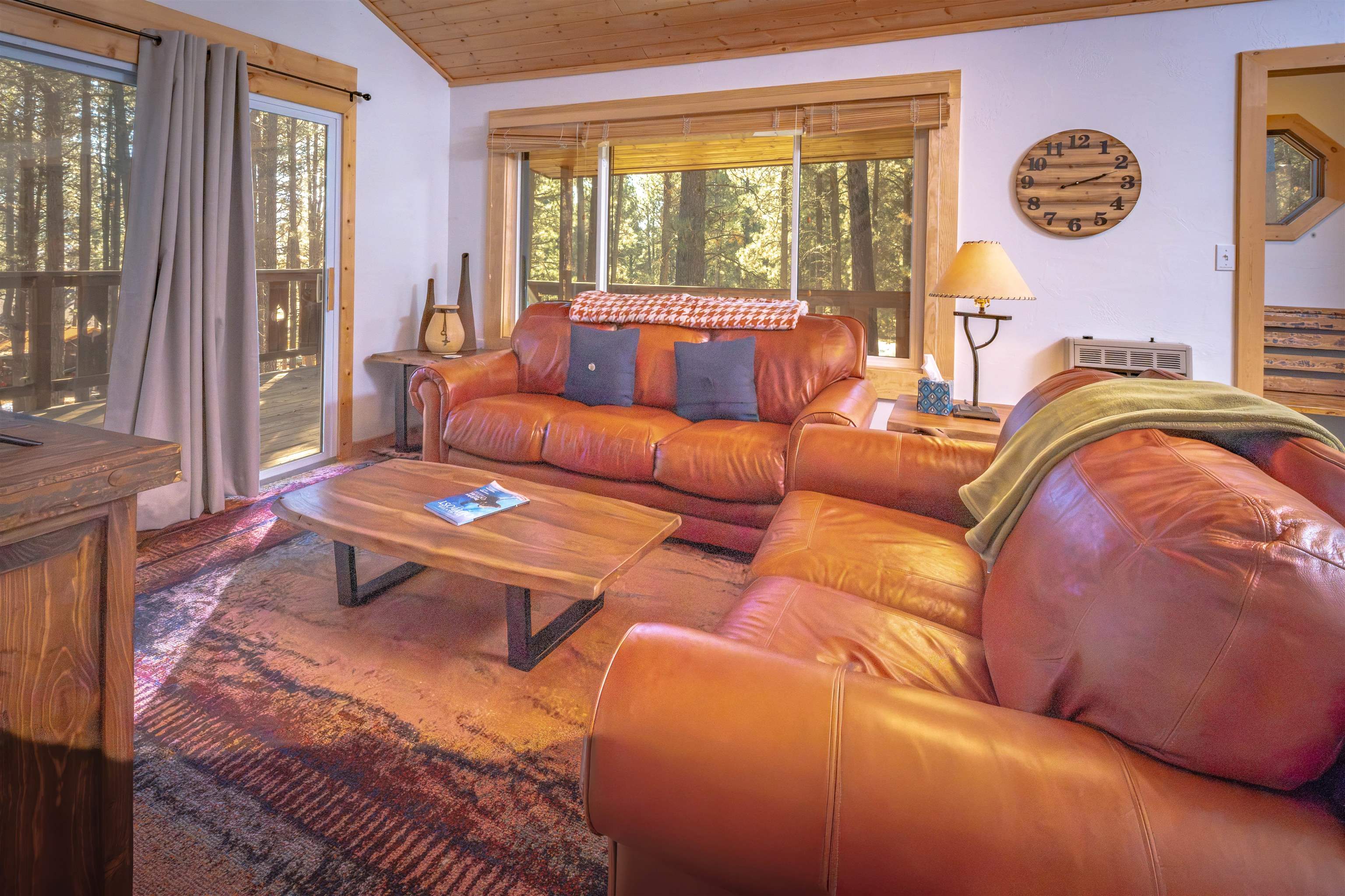 Looking for a mountain home that pays for itself? This well-kept duplex is already income-producing, with a month-to-month tenant on one side bringing in $2,000 a month! With an assumable VA loan at a 2.25% interest rate and seller financing as an option, this property makes for a great investment or mountain getaway that helps cover the bills. Together, the two mirrored units offer 2,930 sq ft of living space on a 1-acre wooded lot, just 10 minutes from Angel Fire Resort. Each side includes 3 bedrooms and 2 baths in a smart split-level layout that gives everyone a little privacy. The main entrance opens to a covered porch with tongue-and-groove ceilings and a welcoming foyer—perfect for kicking off your ski boots after a day on the slopes. The living room centers around a big wood-burning stove that keeps the whole place cozy on snowy days. Downstairs, you’ll find two bedrooms, a full bath, and garage access; upstairs you’ve got the kitchen and primary bedroom. Every level has its own propane wall heater for extra comfort. Recent updates include brand-new windows throughout and tongue-and-groove accents that give the home its warm mountain feel. Each unit has separate utility meters, so it’s easy to manage whether you live in one side or rent them both out. Outside the resort boundary—no membership fees here—saving you thousands every year. Fully furnished and turnkey, this quiet duplex is surrounded by tall pines and designed from the start to be both comfortable and income-generating.