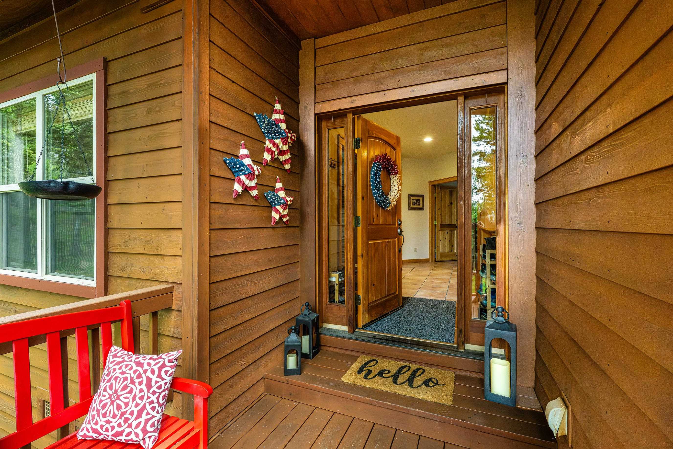 Sophisticated Southwest Retreat. Step into timeless elegance with this beautifully appointed home. Rich wood floors and stylish tile flow seamlessly throughout, creating a warm and inviting ambiance. Well-designed kitchen, featuring quality finishes and ample counter space, perfect for the culinary enthusiast. Enjoy casual meals in the sunny breakfast area or quick bites at the convenient breakfast bar. For special gatherings, the formal dining room provides the ideal setting for large family dinners.The spacious living room is a showstopper, anchored by a grand Southwest-style fireplace that offers both beauty and warmth. The luxurious master suite is a private haven, complete with access to the deck area, a generous walk-in closet, and a spa like jetted jacuzzi tub. A dedicated office space provides a quiet area for work or study, while a separate workout room supports your active lifestyle. Step outside into your personal oasis—an amazing backyard featuring lush green grass, a custom horseshoe pit, a comfortable seating area with a firepit, and an impressive outdoor living deck space equipped with a TV, ideal for entertaining and watching your favorite sports under the stars. Additional features include a spacious two-car garage, a large laundry room with a utility sink for added convenience, a front deck, and a 9 hole frisbee golf course. This home offers the perfect blend of sophisticated design and laid-back Southwest living.