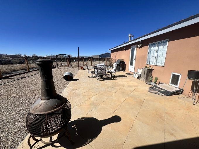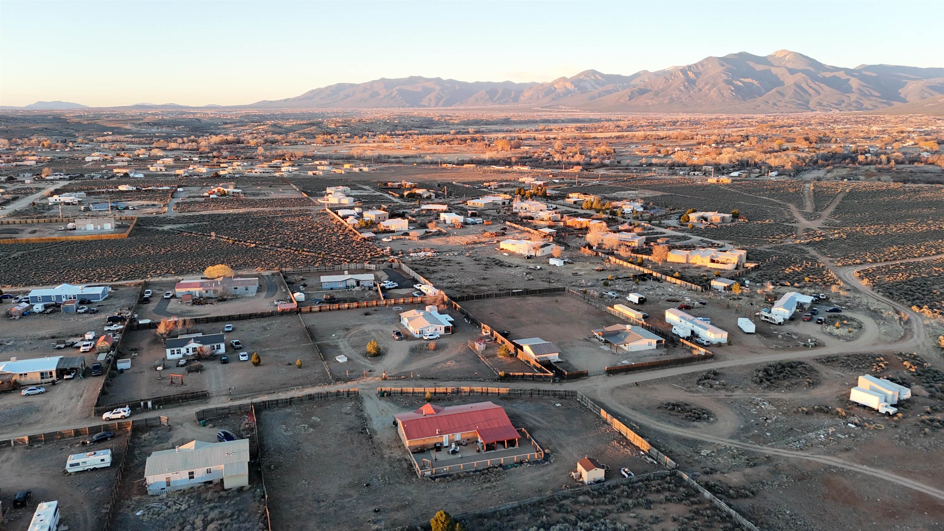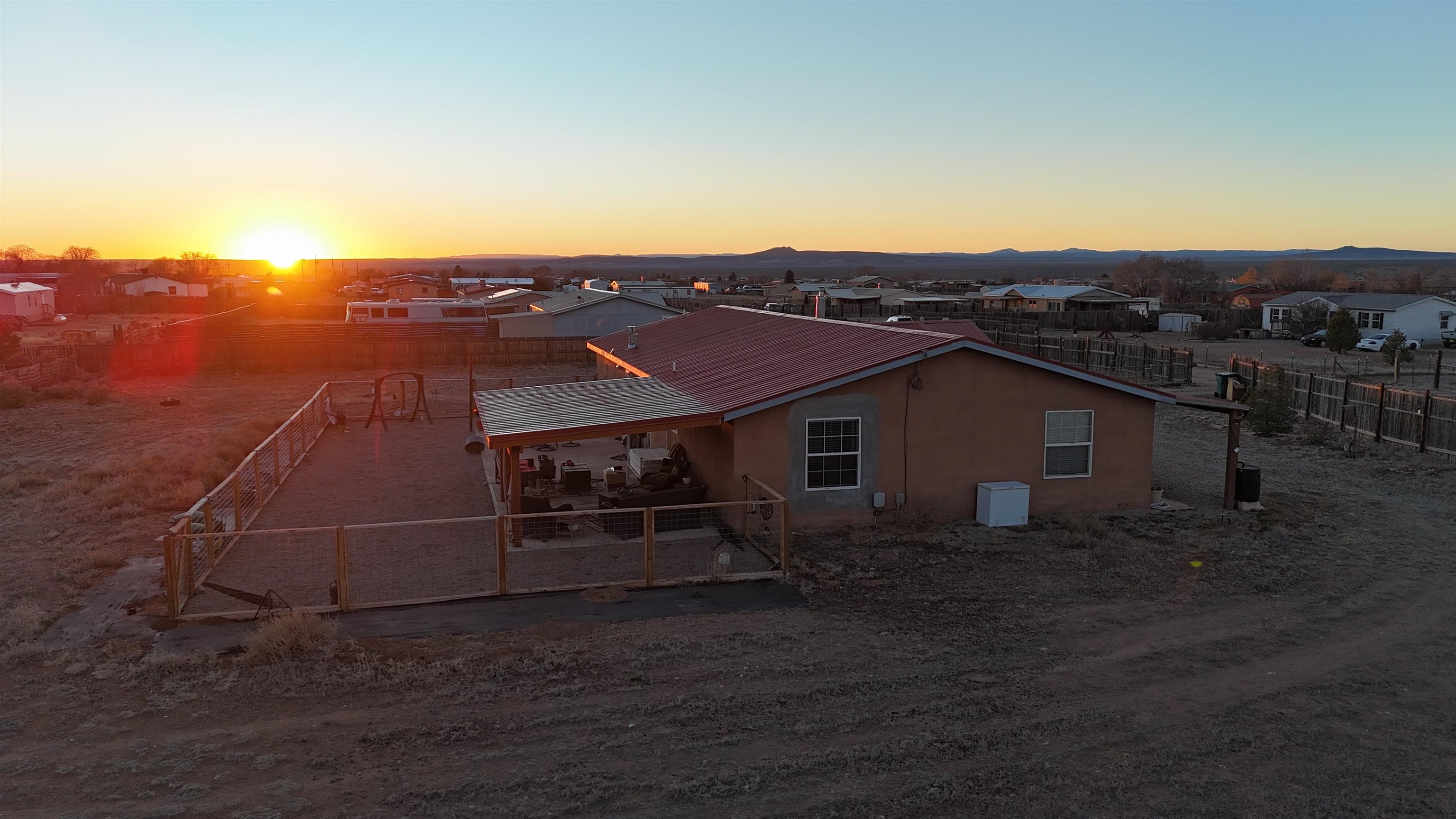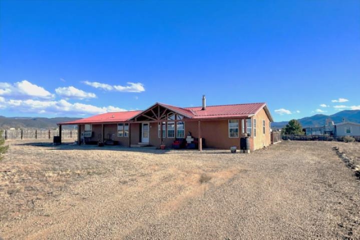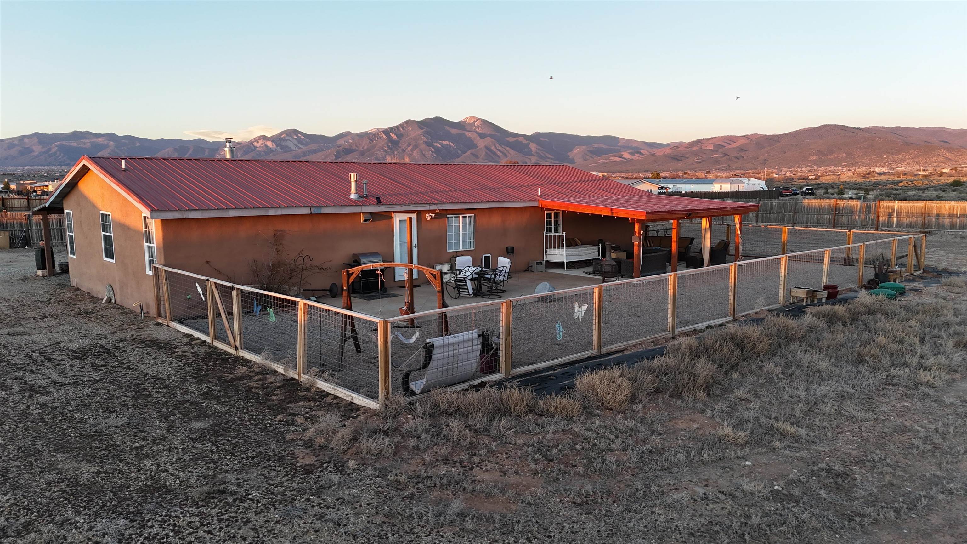 Set on 0.87 acres in beautiful Ranchos de Taos, this spacious 4-bedroom, 2-bath home offers comfort, flexibility, and inviting outdoor living, all framed by spectacular Northern New Mexico views. Inside, the flexible floor plan provides a variety of living options. The home features four true bedrooms, including one ideally suited as a home office, hobby room, or dedicated pet space, complete with a convenient doggy door providing direct access to the backyard. Updated blinds throughout much of the home create a clean, finished look, while refreshed ceiling fans in every bedroom add comfort and efficiency. Practical updates add peace of mind, including a newly upgraded well tank and a refrigerator less than a year old. When the weather turns cool, enjoy multiple heating options with an insert fireplace and pellet stove, adding warmth and ambiance to the living space. Outdoor living truly shines on this property. A full-length covered front porch offers the perfect place to relax and take in the peaceful surroundings, while the expanded rear patio provides space for entertaining or quiet evenings outdoors. The patio features partial coverage and solar perimeter lighting, creating a welcoming atmosphere for gatherings under the Northern New Mexico sky. A water catchment system has also been installed to help efficiently water plants and garden areas. The fully fenced backyard offers a secure space for pets and children, and added gravel helps minimize mud and keep things cleaner when coming and going. A 12' x 10' Tuff Shed (installed in 2022) provides durable, lockable storage for tools, outdoor equipment, and gear. With nearly an acre of land, there is plenty of room for a future carport, garage, garden, or additional outdoor projects. Offered partially furnished, this home adds convenience and value for the next owner. With practical upgrades, versatile living space, and room to grow, this property offers a wonderful opportunity to enjoy the space, views, and relaxed lifestyle of Ranchos de Taos.