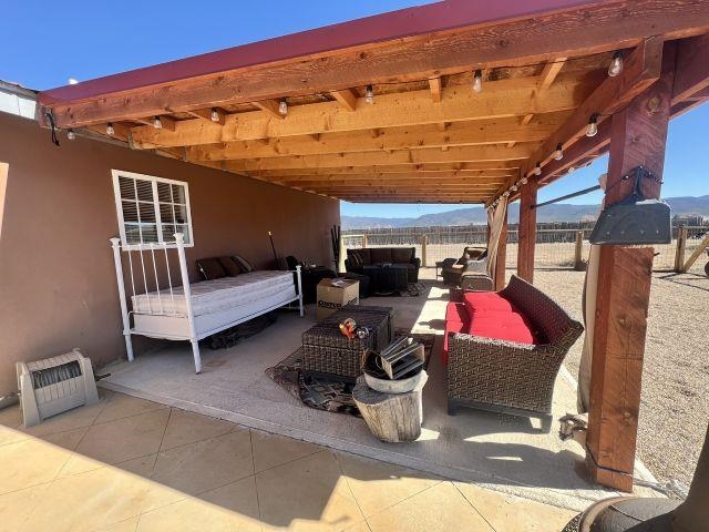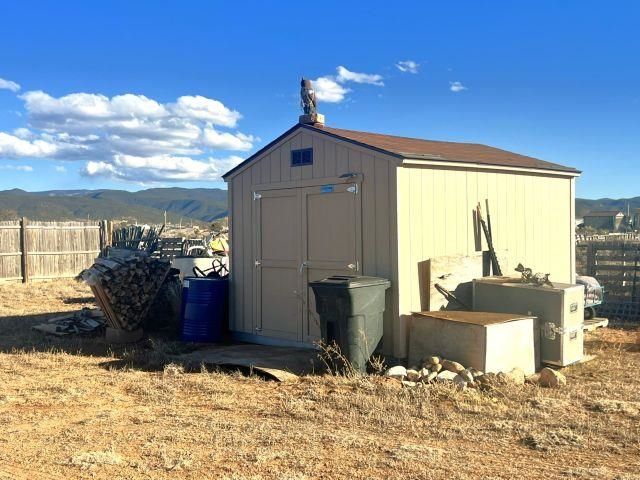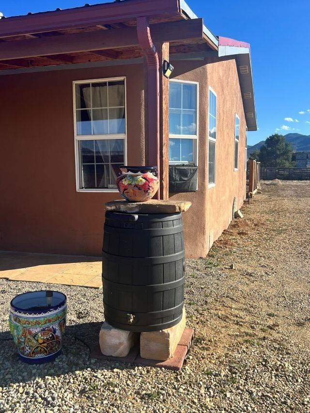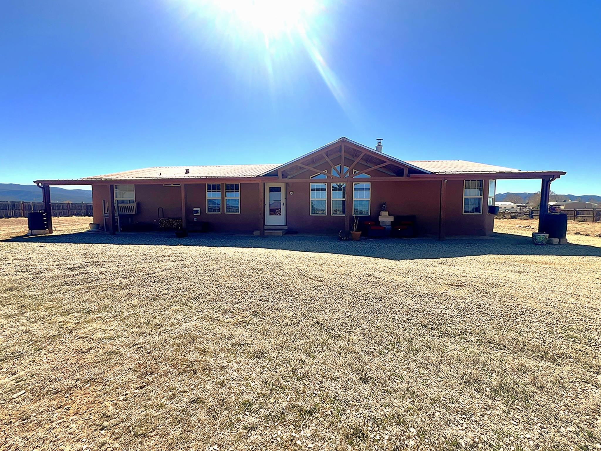 A spacious 4-bedroom, 2-bath home situated on 0.87 acres, offering comfort, functionality, and thoughtful outdoor upgrades in beautiful Ranchos de Taos. Inside, the flexible floor plan features four bedrooms, with one ideally suited as a home office, hobby room, or dedicated pet space. This versatile room includes a convenient doggy door providing direct access to the fenced backyard. The seller has also enhanced the rear yard with added gravel to help minimize mud tracking from pets — a practical and appreciated improvement. Outdoor living truly shines on this property. A full-length covered front porch offers the perfect spot to relax and take in the peaceful surroundings. A newly installed water catchment system provides an efficient way to water plants and garden areas. The back patio features partial coverage and solar perimeter lighting, creating a warm and inviting atmosphere for evening gatherings or quiet nights outdoors. The fully fenced yard offers a secure space for pets and children, along with ample room for a potential carport, garage, or expansive garden. A storage shed is included, providing additional space for tools and equipment. Inside, the home features an insert fireplace as well as a pellet stove for supplemental heating. The property is being offered partially furnished, with additional included items adding value and convenience for the next owner. With nearly an acre of land, functional upgrades, and versatile living space, this property presents a wonderful opportunity to enjoy the beauty and tranquility of Ranchos de Taos.