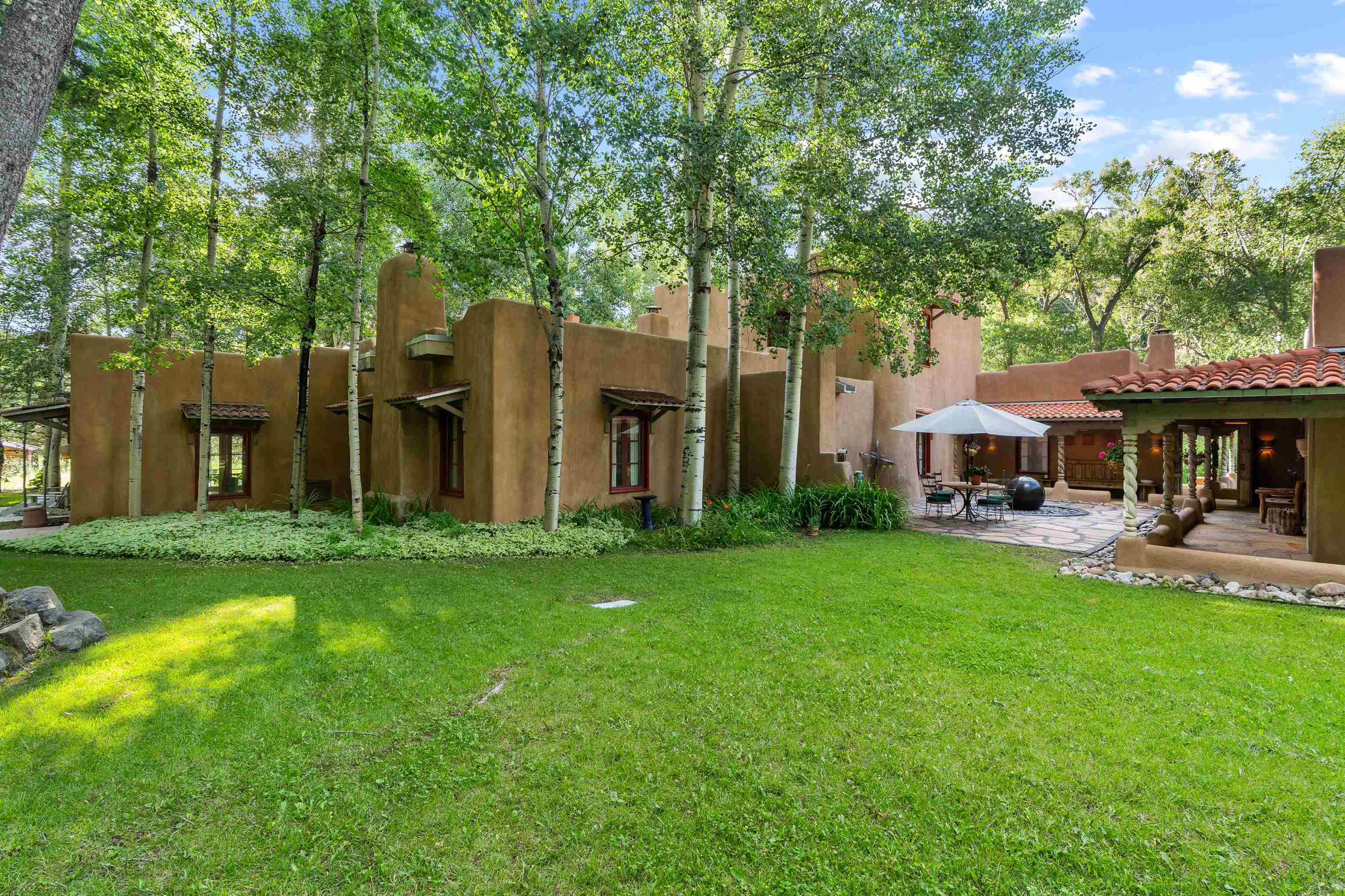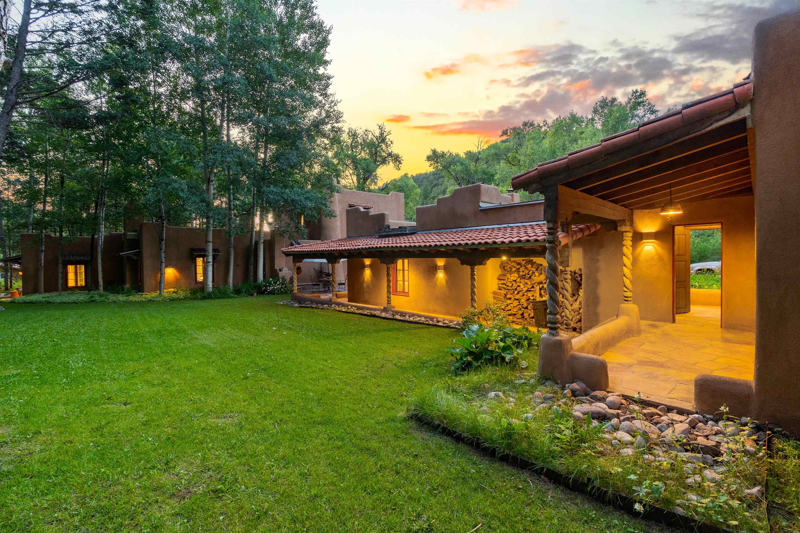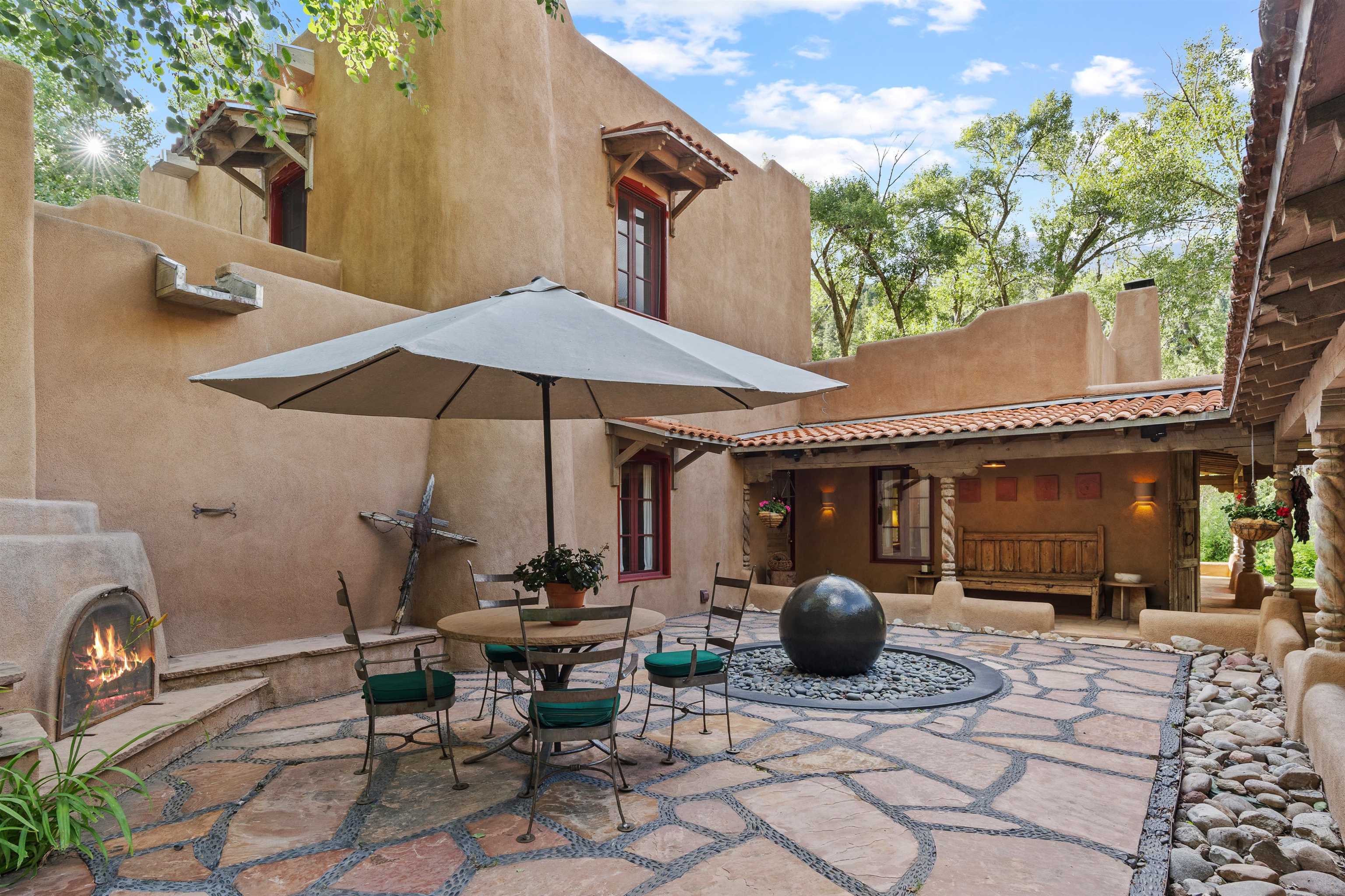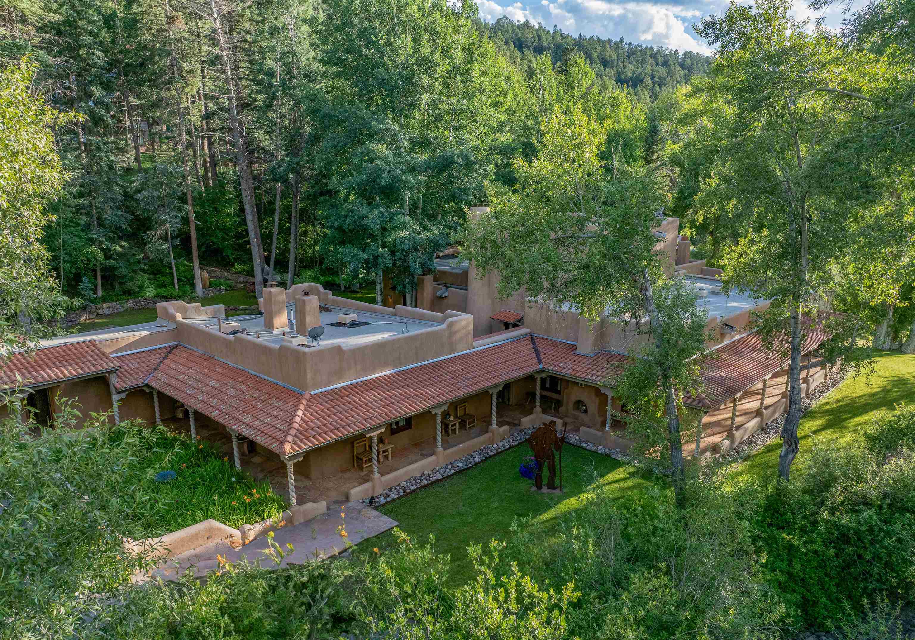 **Luxury Retreat in Taos Canyon – Just 8 Miles from Downtown & 40 Minutes from Taos Ski Valley** Experience unparalleled elegance in this stunning new luxury home nestled in a serene, park-like setting with lush green lawns and mature trees. Located only 8 miles from the historic Taos Plaza and approximately 40 minutes from Taos Ski Valley, this private sanctuary offers the perfect blend of natural beauty and sophisticated living. The main residence features a spectacular primary suite with a luxurious ensuite bathroom, three large walk-in closets, a cozy sitting area, and a dedicated office. A guestroom with its own ensuite bath and oversized walk-in closet offers comfort for visitors, complemented by a rooftop deck with breathtaking views. Showcasing craftsmanship sourced from around the world, the home’s exquisite stonework and tile work add unique character and warmth to each space. The open floorplan includes a chef-inspired kitchen, a butler’s pantry, and a spacious living area with a wood-burning fireplace — ideal for entertaining family and friends. For those seeking a tranquil retreat, the wine room with its own stone fireplace provides the perfect setting to unwind with a fine glass of wine. The property also boasts a stunning indoor heated pool with glass doors on three sides that open to patios and terraces — creating a seamless indoor-outdoor living experience. Guests will enjoy their own private guesthouse, featuring two bedrooms, each with a wood-burning fireplace, and a connecting bathroom — providing a comfortable and inviting space for visitors. This exceptional property is a rare find — a perfect retreat to relax, entertain, and enjoy breathtaking scenery. Conveniently close to Taos and just a short drive to Angel Fire, this home is truly one to see before it’s gone. Schedule your private viewing today! **Note:** Please be aware that the attached floor plan is a partial layout and does not depict all spaces within the home. It provides an overview of the main areas but may not include every room or detail. Additionally, the fireplaces featured have virtual fires, enhancing ambiance and warmth.