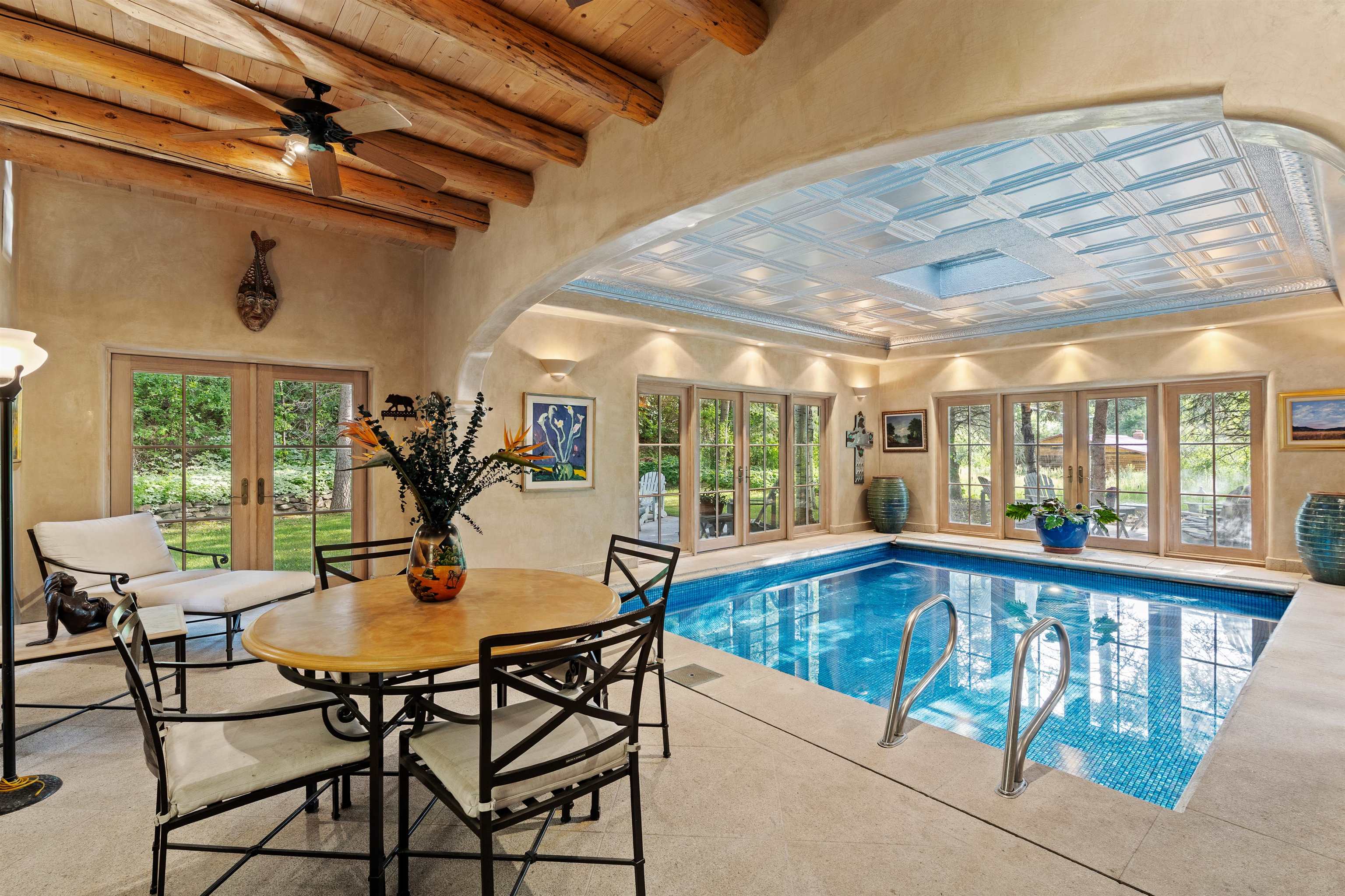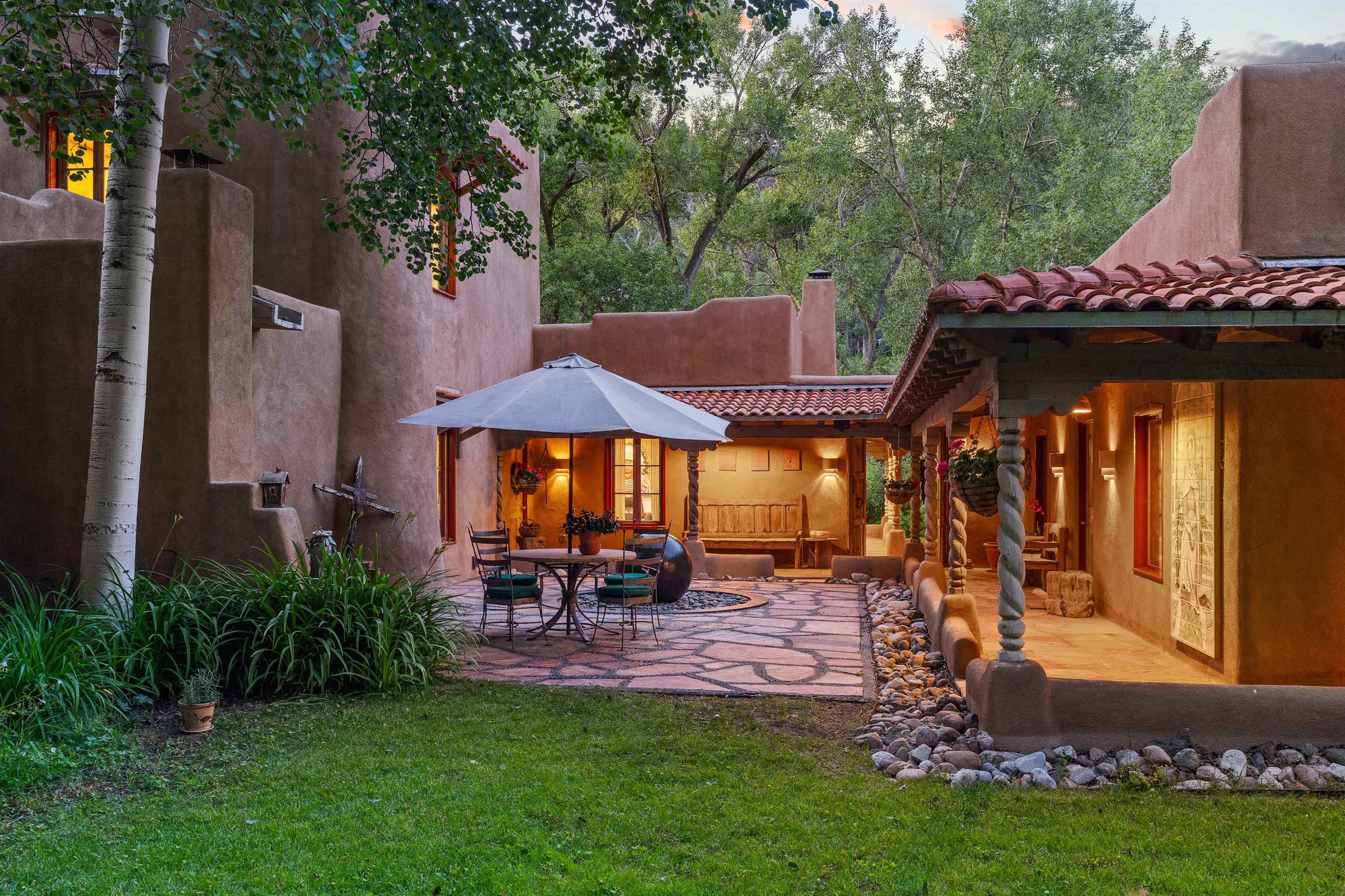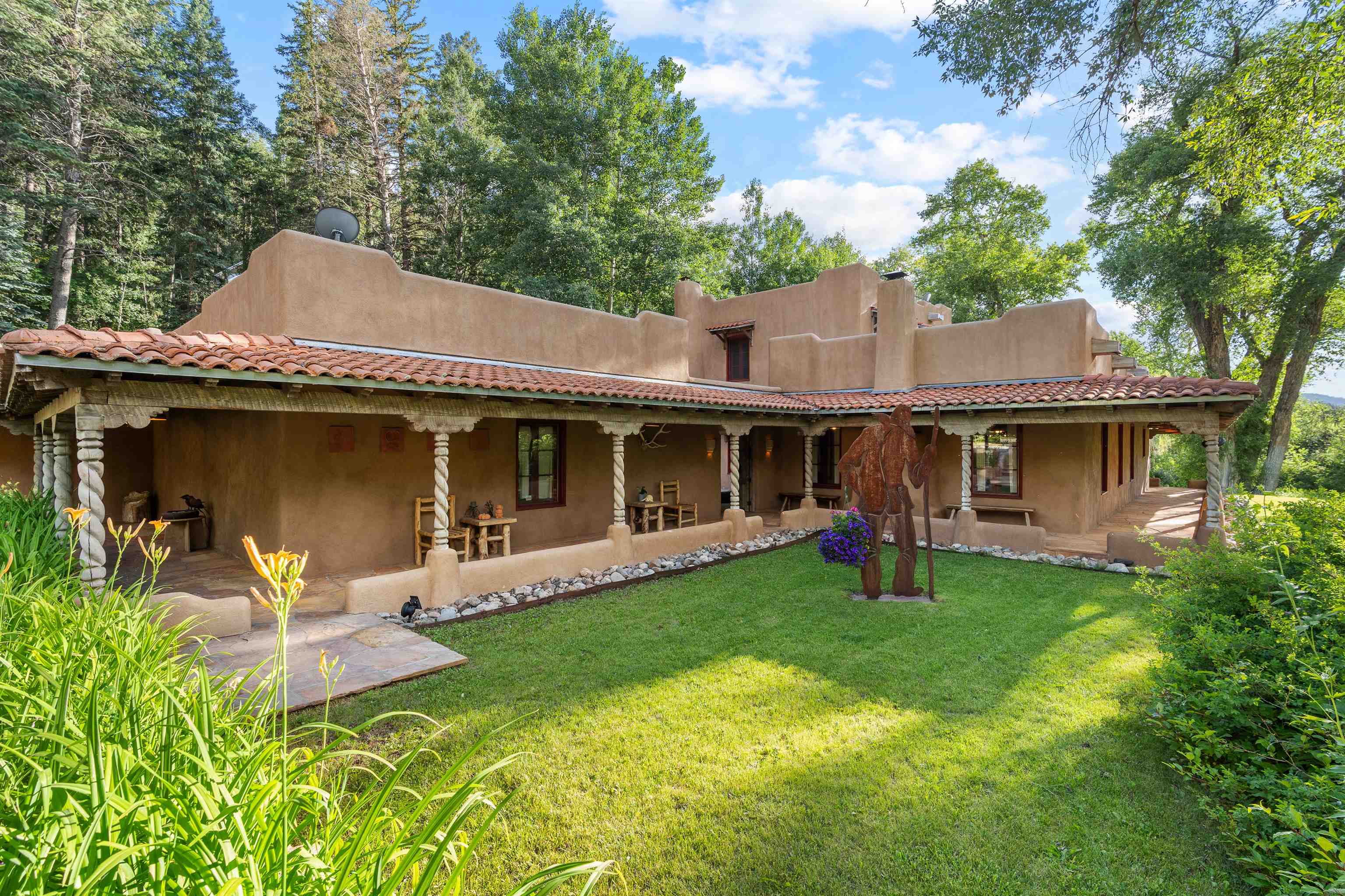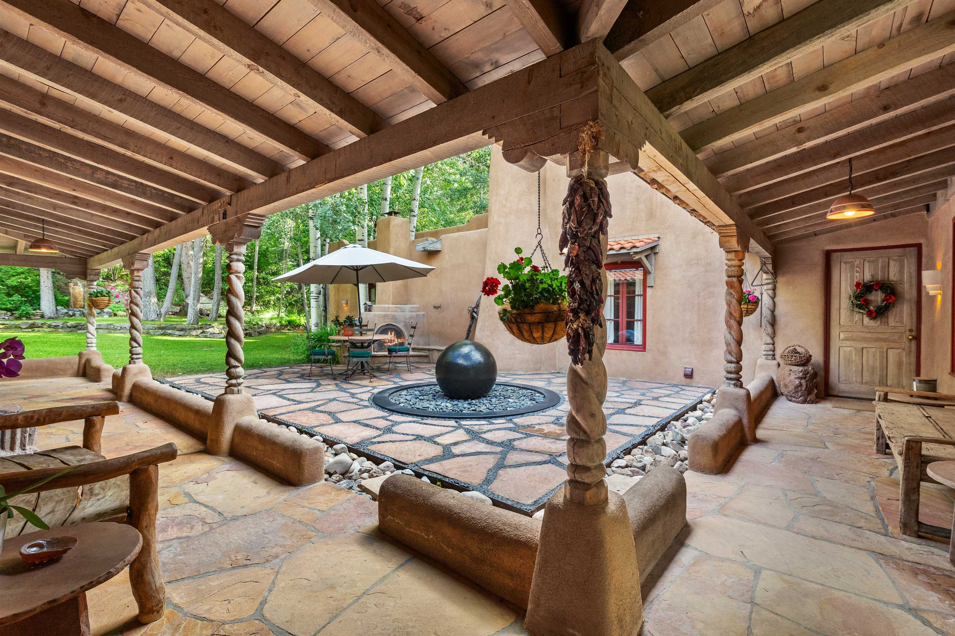 **Luxury Retreat in Taos Canyon – Just 8 Miles from Downtown & 40 Minutes from Taos Ski Valley** Experience unparalleled elegance in this stunning new luxury home nestled in a serene, park-like setting with lush green lawns and mature trees. Located only 8 miles from the historic Taos Plaza and approximately 40 minutes from Taos Ski Valley, this private sanctuary offers the perfect blend of natural beauty and sophisticated living. The main residence features a spectacular primary suite with a luxurious ensuite bathroom, three large walk-in closets, a cozy sitting area, and a dedicated office. A guestroom with its own ensuite bath and oversized walk-in closet offers comfort for visitors, complemented by a rooftop deck with breathtaking views. Showcasing craftsmanship sourced from around the world, the home’s exquisite stonework and tile work add unique character and warmth to each space. The open floorplan includes a chef-inspired kitchen, a butler’s pantry, and a spacious living area with a wood-burning fireplace — ideal for entertaining family and friends. For those seeking a tranquil retreat, the wine room with its own stone fireplace provides the perfect setting to unwind with a fine glass of wine. The property also boasts a stunning indoor heated pool with glass doors on three sides that open to patios and terraces — creating a seamless indoor-outdoor living experience. Guests will enjoy their own private guesthouse, featuring two bedrooms, each with a wood-burning fireplace, and a connecting bathroom — providing a comfortable and inviting space for visitors. This exceptional property is a rare find — a perfect retreat to relax, entertain, and enjoy breathtaking scenery. Conveniently close to Taos and just a short drive to Angel Fire, this home is truly one to see before it’s gone. Schedule your private viewing today! **Note:** Please be aware that the attached floor plan is a partial layout and does not depict all spaces within the home. It provides an overview of the main areas but may not include every room or detail. Additionally, the fireplaces featured have virtual fires, enhancing ambiance and warmth.