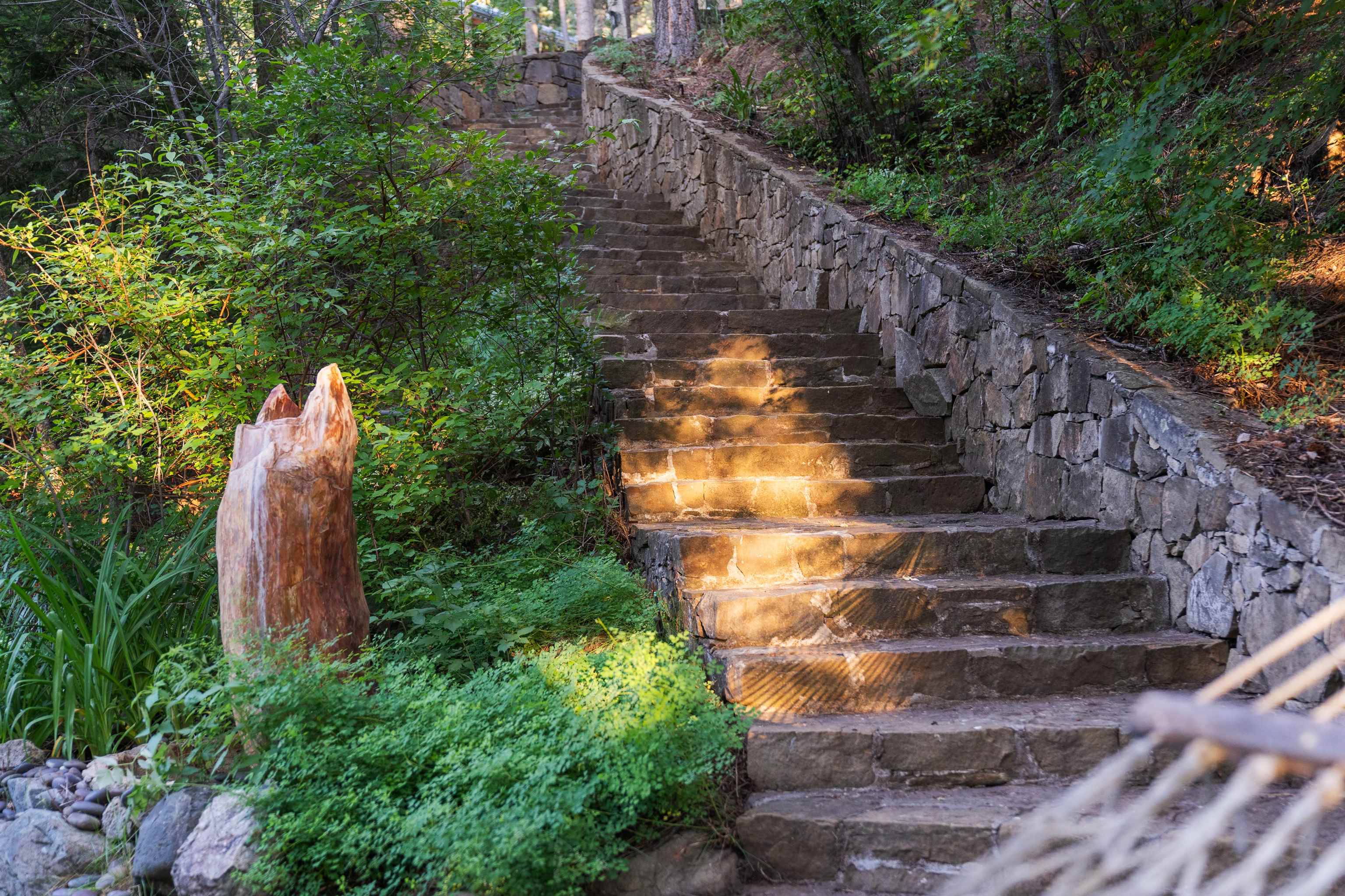 - Lot Features: Garden, Lawn, Level, Sprinkler System, Trees, Wooded
