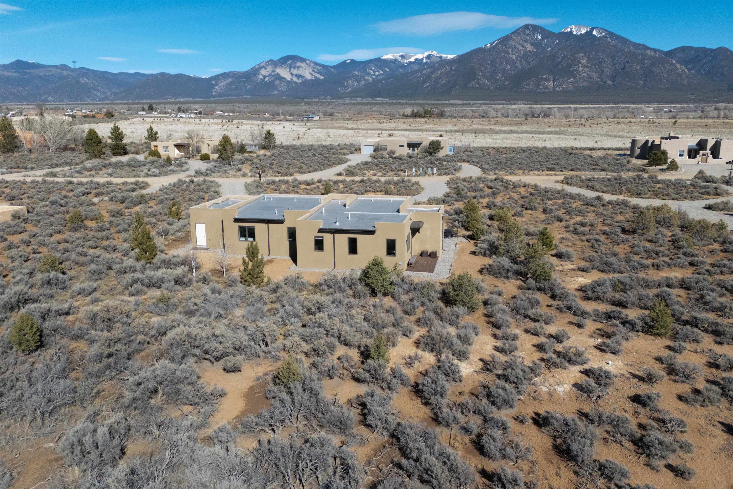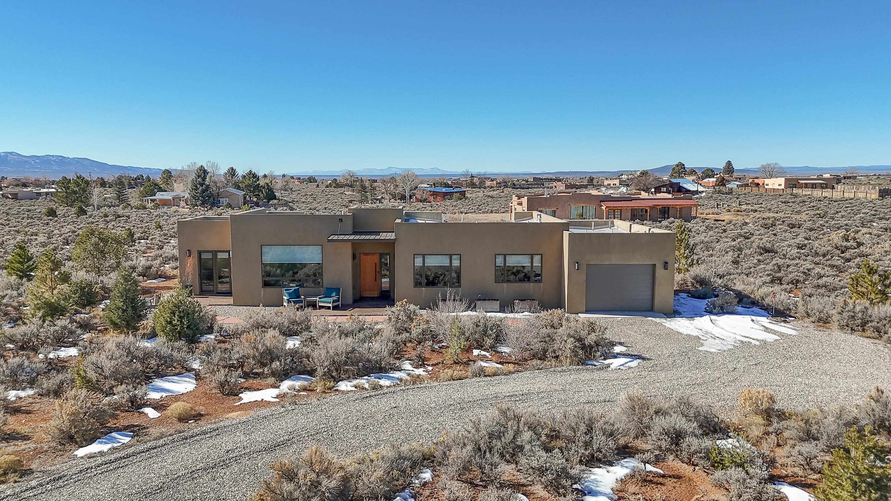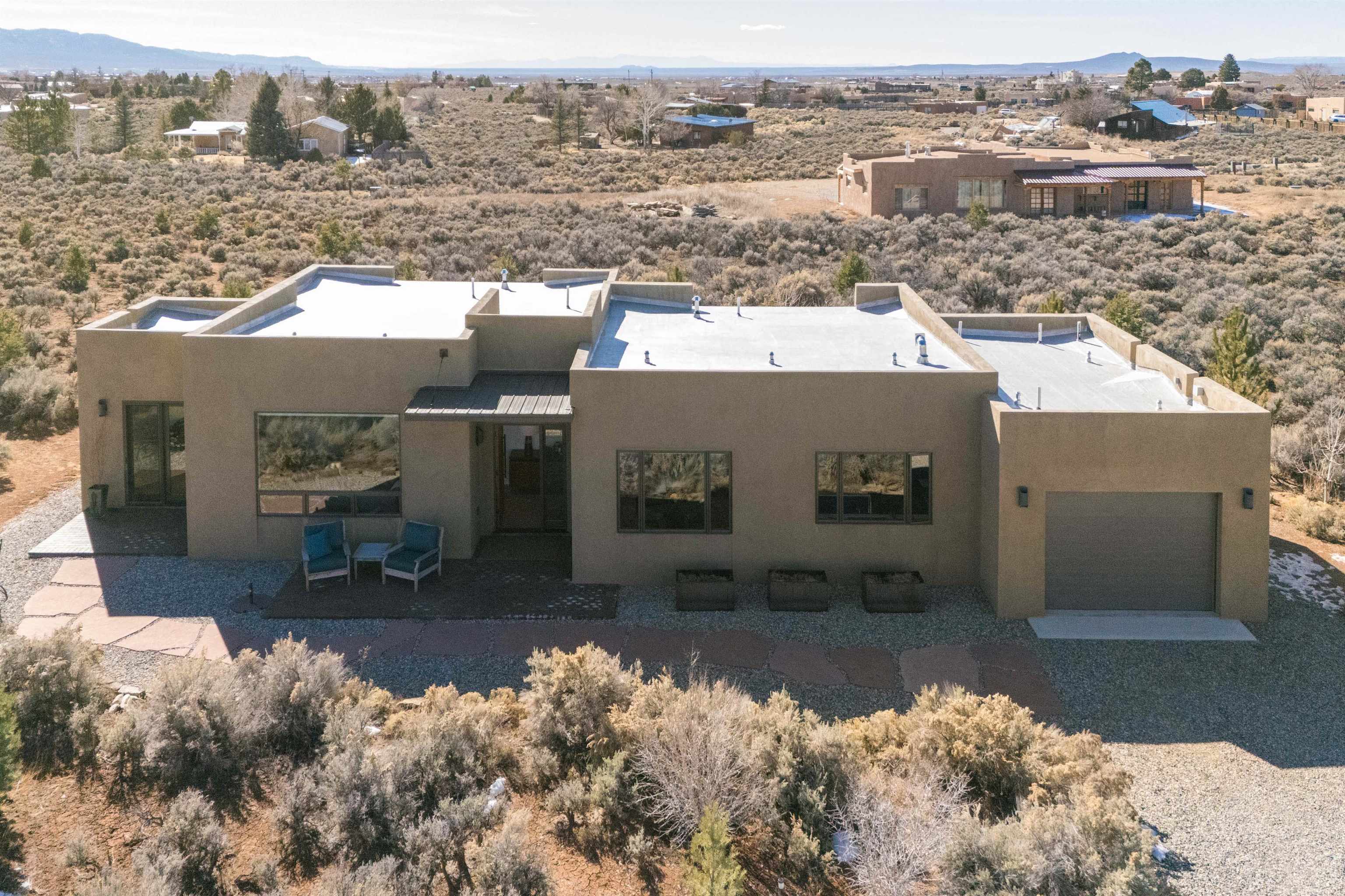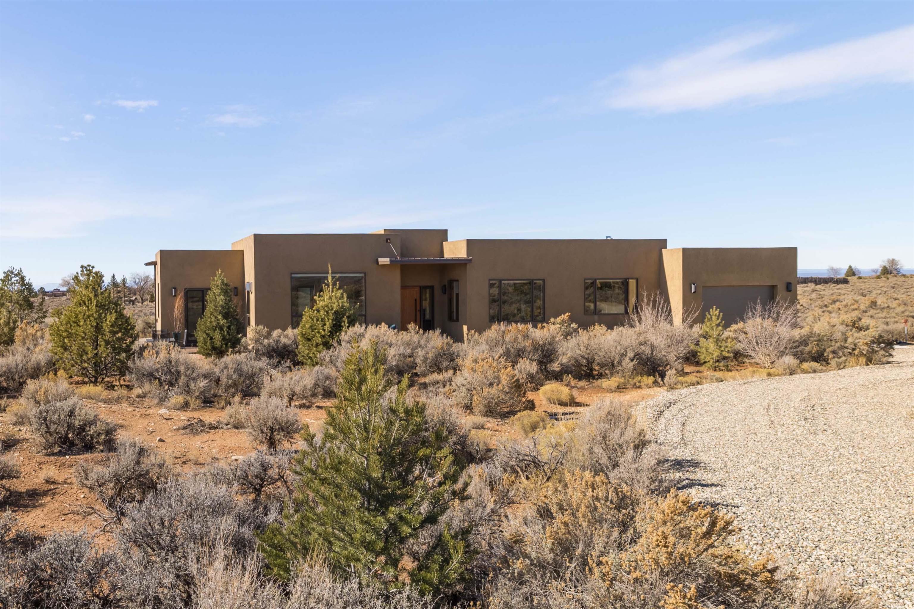 At the quiet end of a dead-end road, where the land opens into protected beauty and the sky feels endless, this contemporary Southwest residence offers a rare harmony of privacy, design, and place. Thoughtfully built just five years ago and maintained to the highest standard, the two-bedroom, two-bath home lives like new—radiant floor heat beneath your feet, a glowing gas Jotul fireplace anchoring the living space, and expansive windows framing the ever-changing drama of the Sangre de Cristo Mountains. Natural light moves effortlessly through the interiors, illuminating clean lines and warm, organic textures. The kitchen is exceptional—abundant custom storage, top-of-the-line Frigidaire Professional appliances, double wall ovens (convection), a convection microwave/oven combo, Zepher hood, 6 burner 36" Thor gas Range top, a large custom-built island and a gracious layout designed for both intimate evenings and inspired entertaining. Every detail feels intentional. Every finish, timeless. There are custom details throughout and all systems are thoughtful and efficient including: water softener, reverse osmosis drinking system, on demand hot water heater, instant hot water for taps, multi zone radiant heating, including garage, dimmable LED lighting inside and out, fiber optic high speed internet with ethernet wall outlets, adjustable Elfa closet systems, automatic drip irrigation and a hot tub hookup. The Primary bedroom is bathed in natural light and graced with a spa-like bath and large walk-in closet and a sublime view of Pedernal on the horizon through the West facing windows. The guest bedroom is currently used as a fantastic Artist studio. A flexible bonus room offers the perfect setting for a private office, studio, or creative sanctuary. The attached heated garage adds everyday ease, while the home’s position contiguous to a conservation easement ensures lasting tranquility and gorgeous walks just out the front door. Step outside to miles of walking trails through open sage , where the landscape is preserved and the silence is sacred. Ideally located off the north end of Blueberry Hill, this property is perfectly poised between the cultural heartbeat of Taos and the alpine exhilaration of Taos Ski Valley. World-class skiing, rafting, biking, and hiking are all within effortless reach—yet home remains a peaceful retreat. Offered fully furnished with beautifully curated pieces that complement the architecture and light, this is more than a home. It is a turnkey expression of modern Southwest living—romantic, refined, and ready to be lived in beautifully.