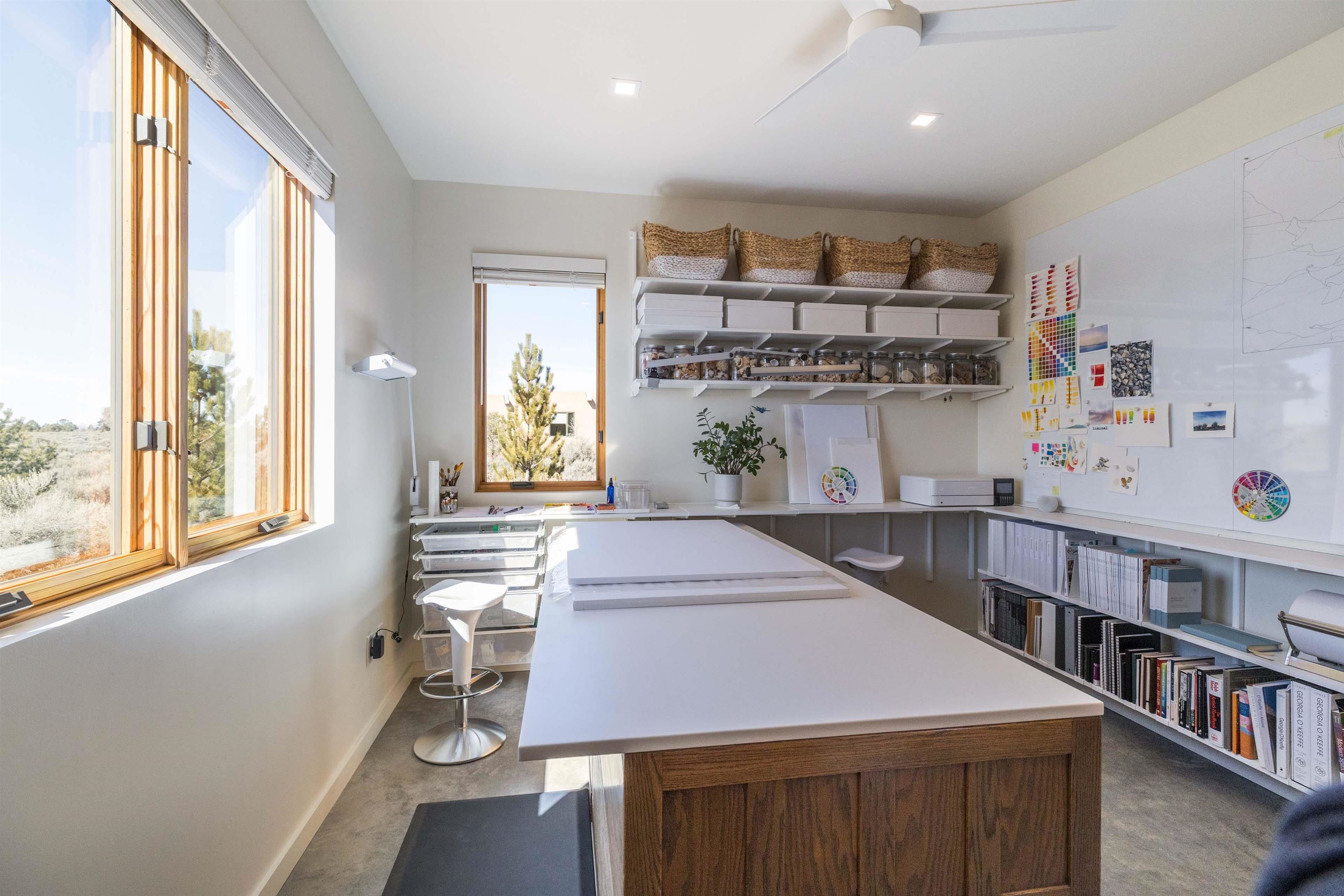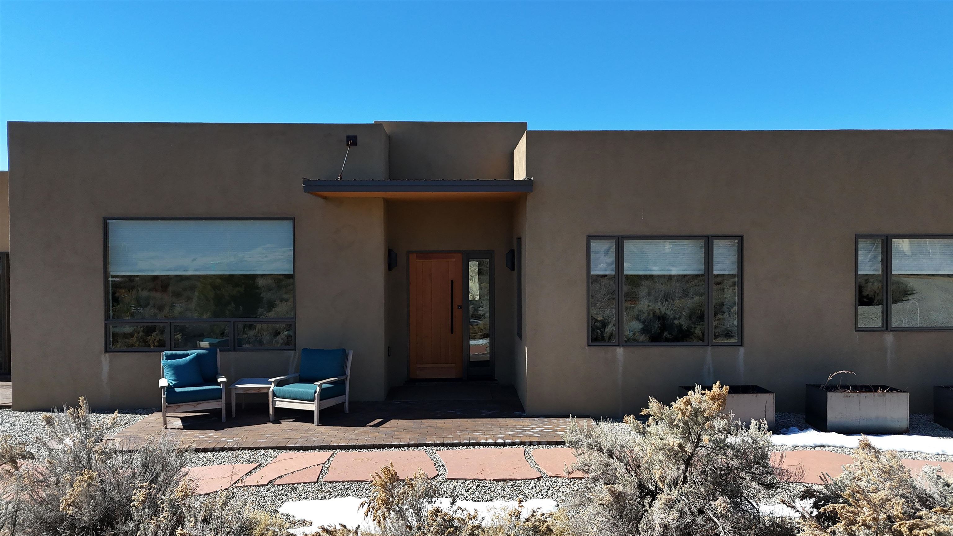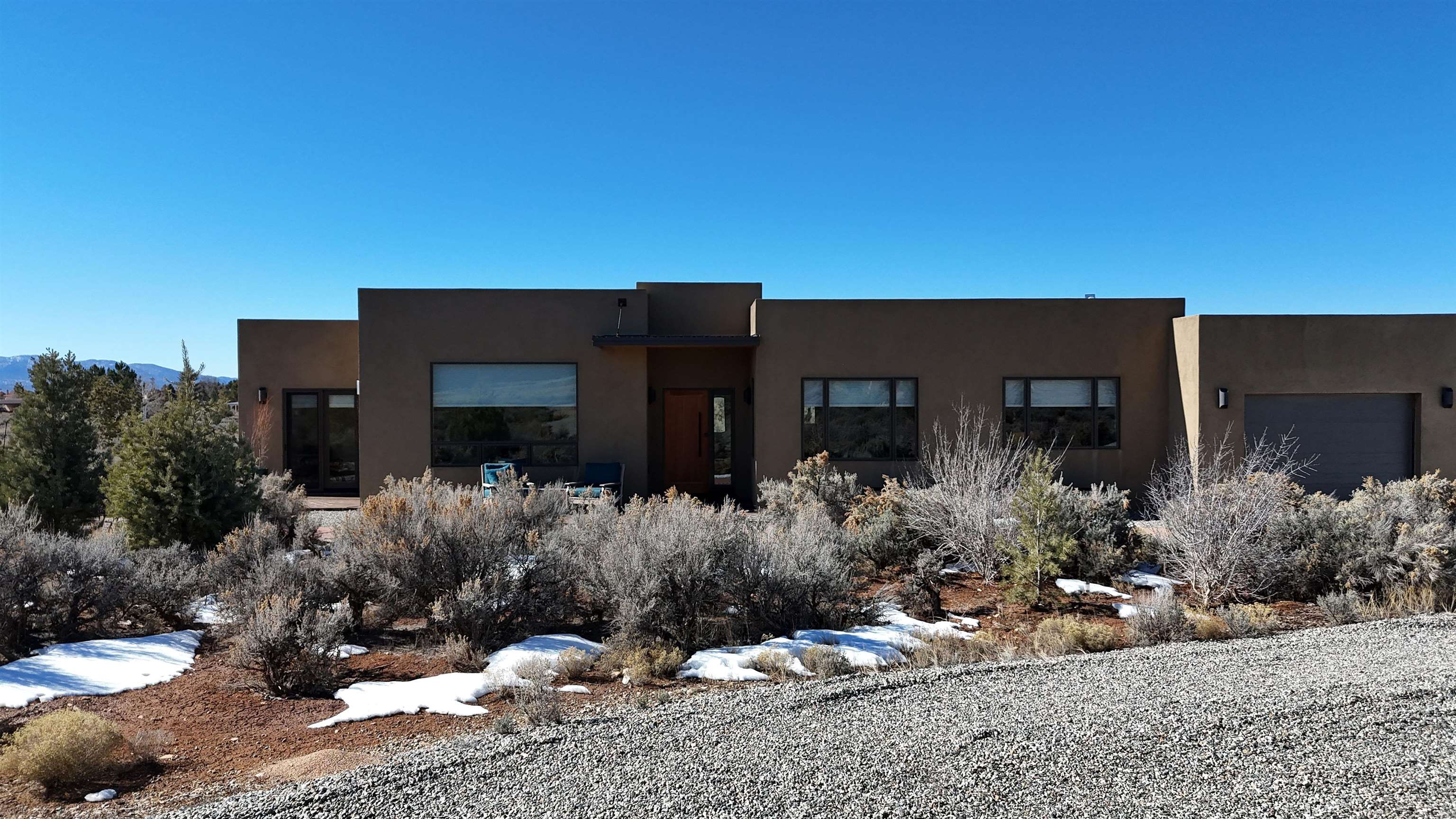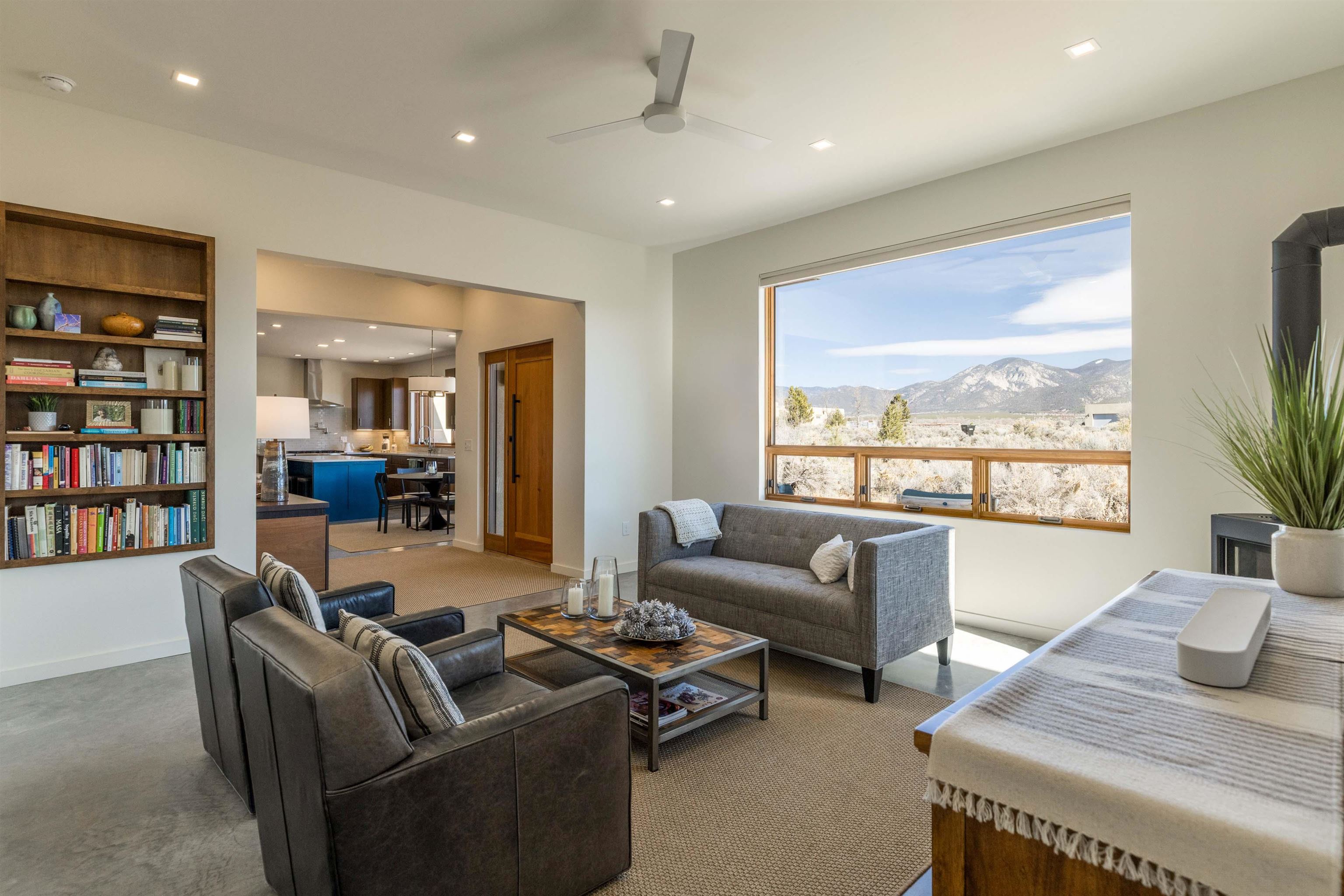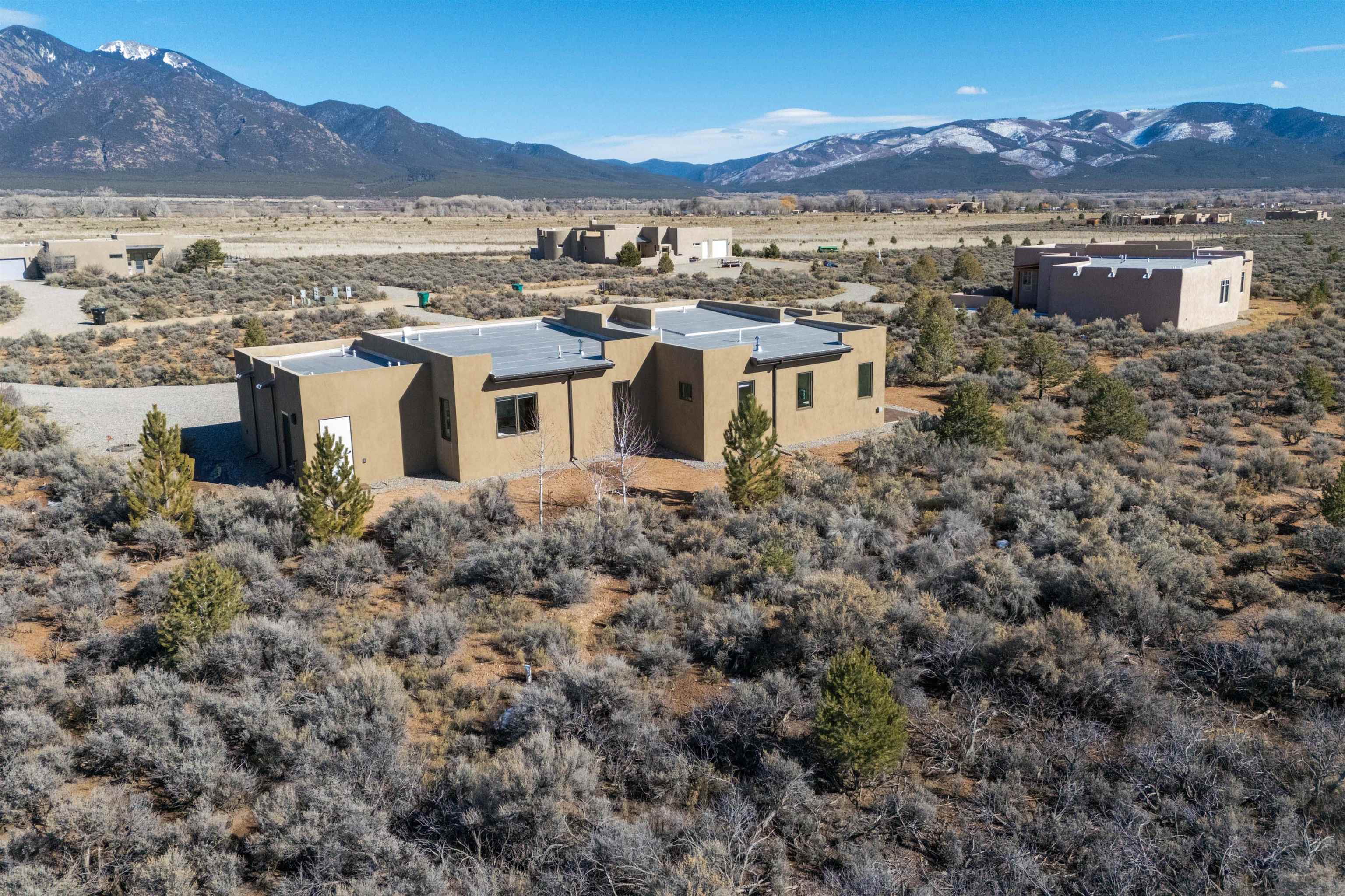 At the quiet end of a dead-end road, where the land opens into protected beauty and the sky feels endless, this contemporary Southwest residence offers a rare harmony of privacy, design, and place. Thoughtfully built just five years ago and maintained to the highest standard, the two-bedroom, two-bath home lives like new—radiant floor heat beneath your feet, a glowing gas Jotul fireplace anchoring the living space, and expansive windows framing the ever-changing drama of the Sangre de Cristo Mountains. Natural light moves effortlessly through the interiors, illuminating clean lines and warm, organic textures. The kitchen is exceptional—abundant custom storage, top-of-the-line Frigidaire Professional appliances, double wall ovens (convection), a convection microwave/oven combo, Zepher hood, 6 burner 36" Thor gas Range top, a large custom-built island and a gracious layout designed for both intimate evenings and inspired entertaining. Every detail feels intentional. Every finish, timeless. There are custom details throughout and all systems are thoughtful and efficient including: water softener, reverse osmosis drinking system, on demand hot water heater, instant hot water for taps, multi zone radiant heating, including garage, dimmable LED lighting inside and out, fiber optic high speed internet with ethernet wall outlets, adjustable Elfa closet systems, automatic drip irrigation and a hot tub hookup. The Primary bedroom is bathed in natural light and graced with a spa-like bath and large walk-in closet and a sublime view of Pedernal on the horizon through the West facing windows. The guest bedroom is currently used as a fantastic Artist studio. A flexible bonus room offers the perfect setting for a private office, studio, or creative sanctuary. The attached heated garage adds everyday ease, while the home’s position contiguous to a conservation easement ensures lasting tranquility and gorgeous walks just out the front door. Step outside to miles of walking trails through open sage , where the landscape is preserved and the silence is sacred. Ideally located off the north end of Blueberry Hill, this property is perfectly poised between the cultural heartbeat of Taos and the alpine exhilaration of Taos Ski Valley. World-class skiing, rafting, biking, and hiking are all within effortless reach—yet home remains a peaceful retreat. Offered fully furnished with beautifully curated pieces that complement the architecture and light, this is more than a home. It is a turnkey expression of modern Southwest living—romantic, refined, and ready to be lived in beautifully.