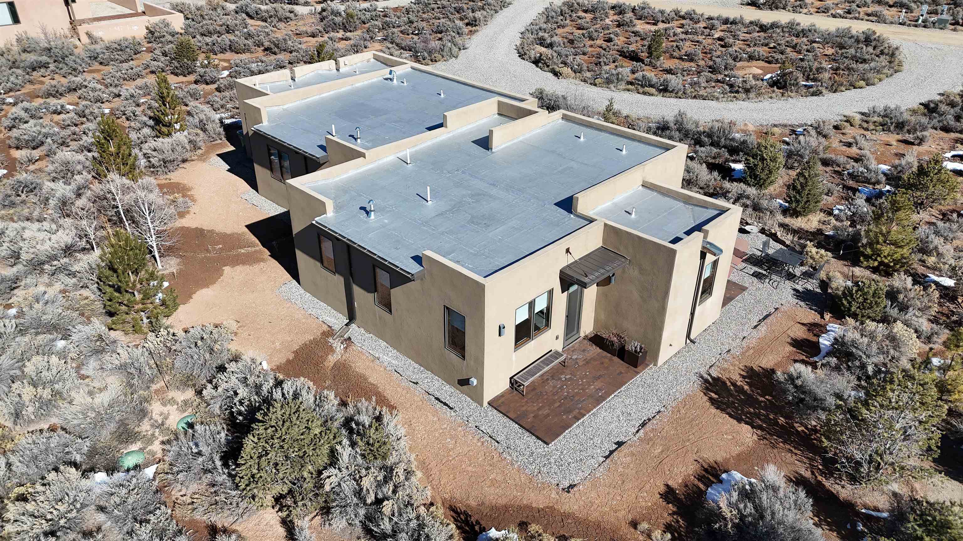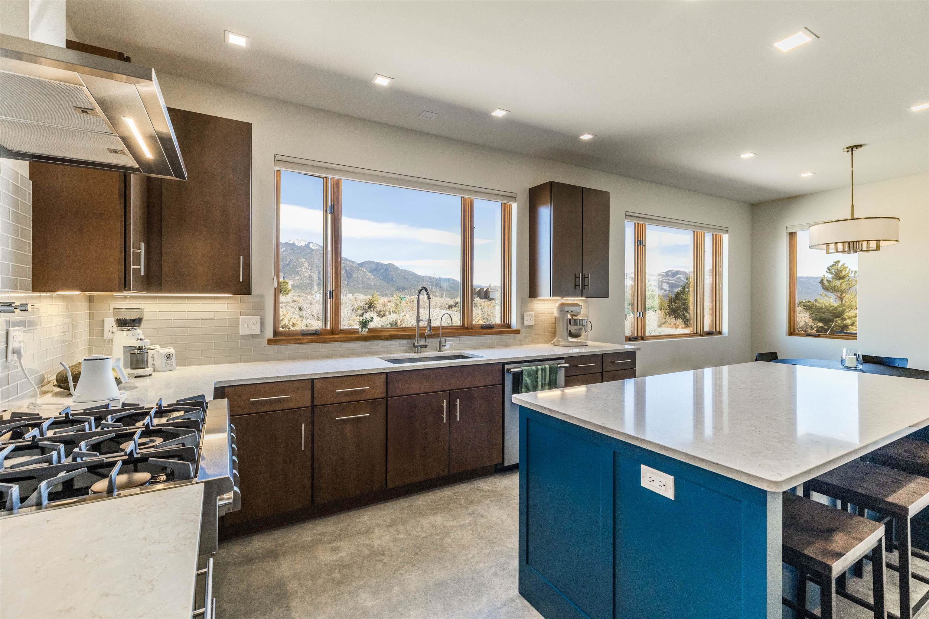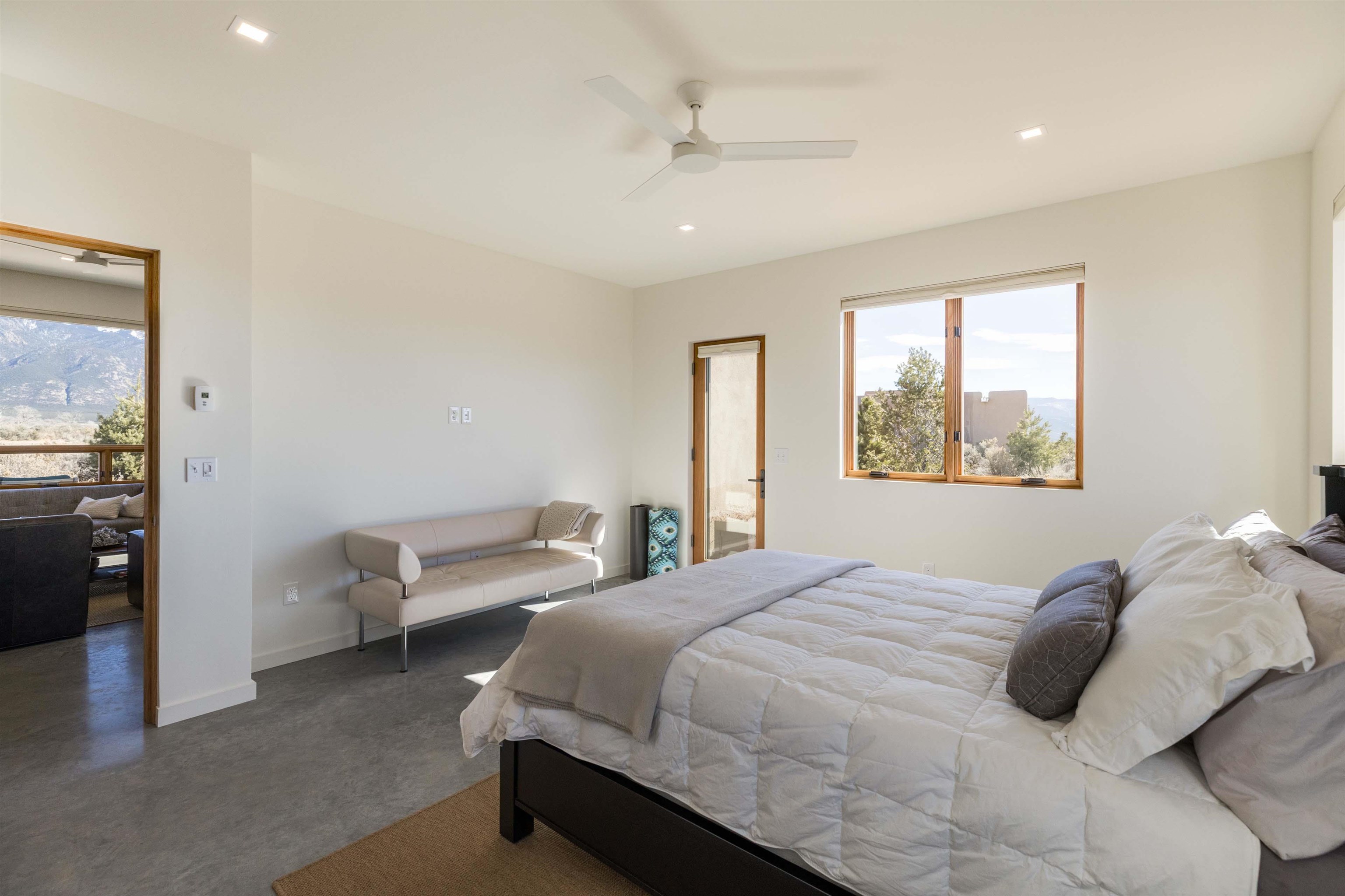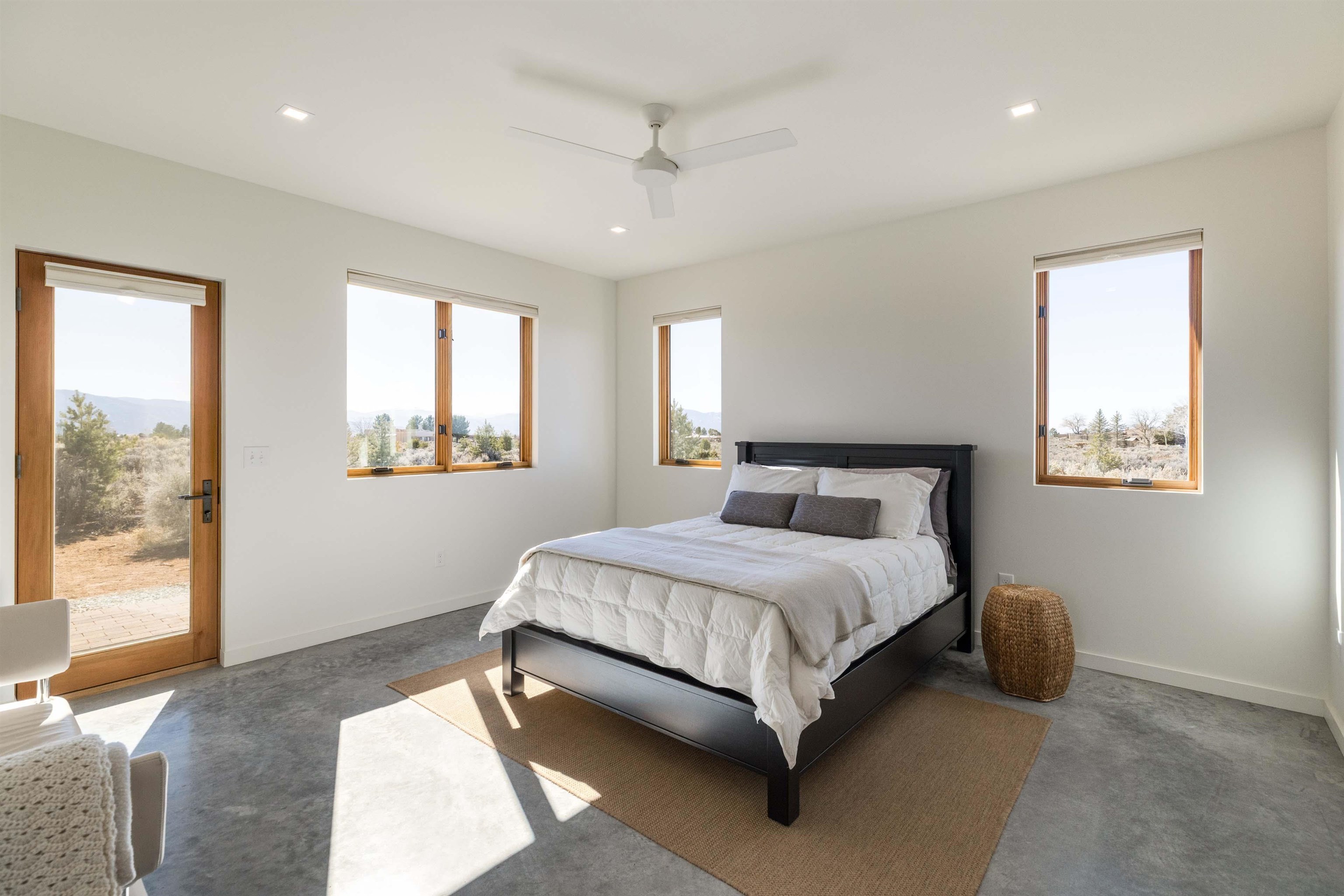 At the quiet end of a dead-end road, where the land opens into protected beauty and the sky feels endless, this contemporary Southwest residence offers a rare harmony of privacy, design, and place. Thoughtfully built just five years ago and maintained to the highest standard, the two-bedroom, two-bath home lives like new—radiant floor heat beneath your feet, a glowing gas Jotul fireplace anchoring the living space, and expansive windows framing the ever-changing drama of the Sangre de Cristo Mountains. Natural light moves effortlessly through the interiors, illuminating clean lines and warm, organic textures. The kitchen is exceptional—abundant custom storage, top-of-the-line Frigidaire Professional appliances, double wall ovens (convection), a convection microwave/oven combo, Zepher hood, 6 burner 36" Thor gas Range top, a large custom-built island and a gracious layout designed for both intimate evenings and inspired entertaining. Every detail feels intentional. Every finish, timeless. There are custom details throughout and all systems are thoughtful and efficient including: water softener, reverse osmosis drinking system, on demand hot water heater, instant hot water for taps, multi zone radiant heating, including garage, dimmable LED lighting inside and out, fiber optic high speed internet with ethernet wall outlets, adjustable Elfa closet systems, automatic drip irrigation and a hot tub hookup. The Primary bedroom is bathed in natural light and graced with a spa-like bath and large walk-in closet and a sublime view of Pedernal on the horizon through the West facing windows. The guest bedroom is currently used as a fantastic Artist studio. A flexible bonus room offers the perfect setting for a private office, studio, or creative sanctuary. The attached heated garage adds everyday ease, while the home’s position contiguous to a conservation easement ensures lasting tranquility and gorgeous walks just out the front door. Step outside to miles of walking trails through open sage , where the landscape is preserved and the silence is sacred. Ideally located off the north end of Blueberry Hill, this property is perfectly poised between the cultural heartbeat of Taos and the alpine exhilaration of Taos Ski Valley. World-class skiing, rafting, biking, and hiking are all within effortless reach—yet home remains a peaceful retreat. Offered fully furnished with beautifully curated pieces that complement the architecture and light, this is more than a home. It is a turnkey expression of modern Southwest living—romantic, refined, and ready to be lived in beautifully.