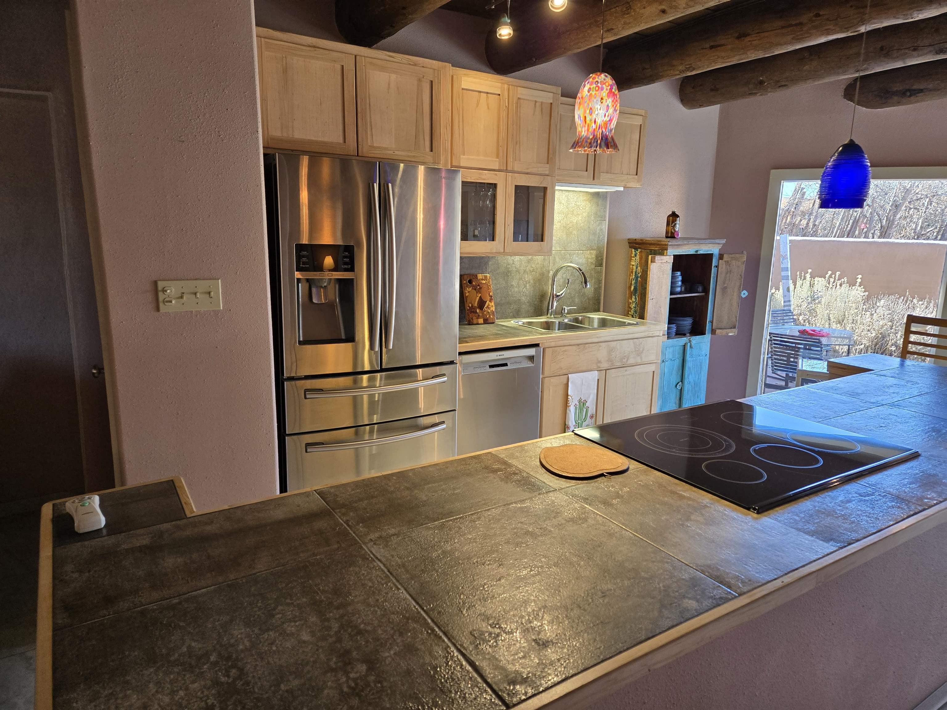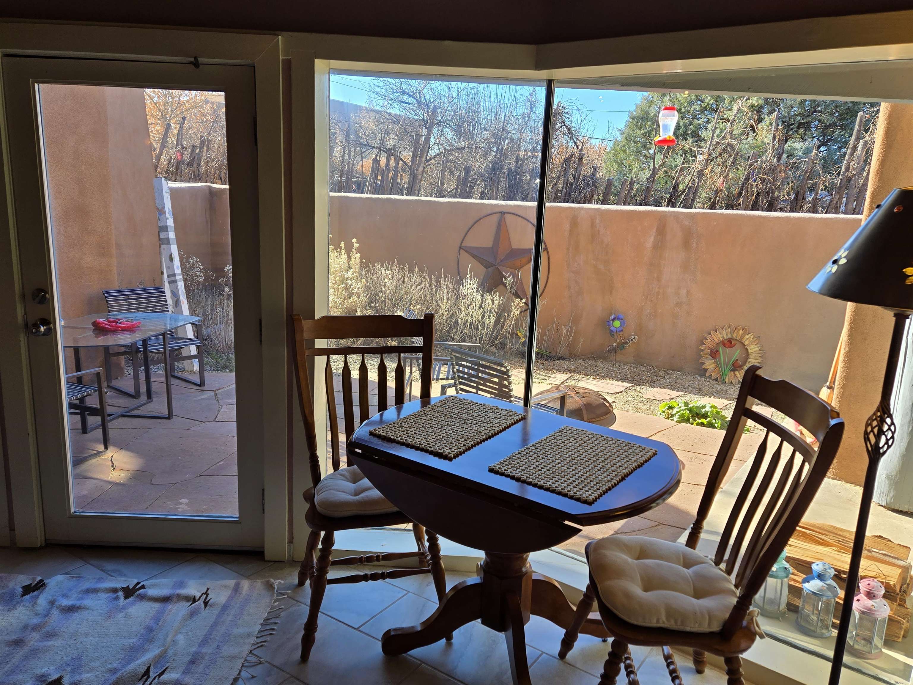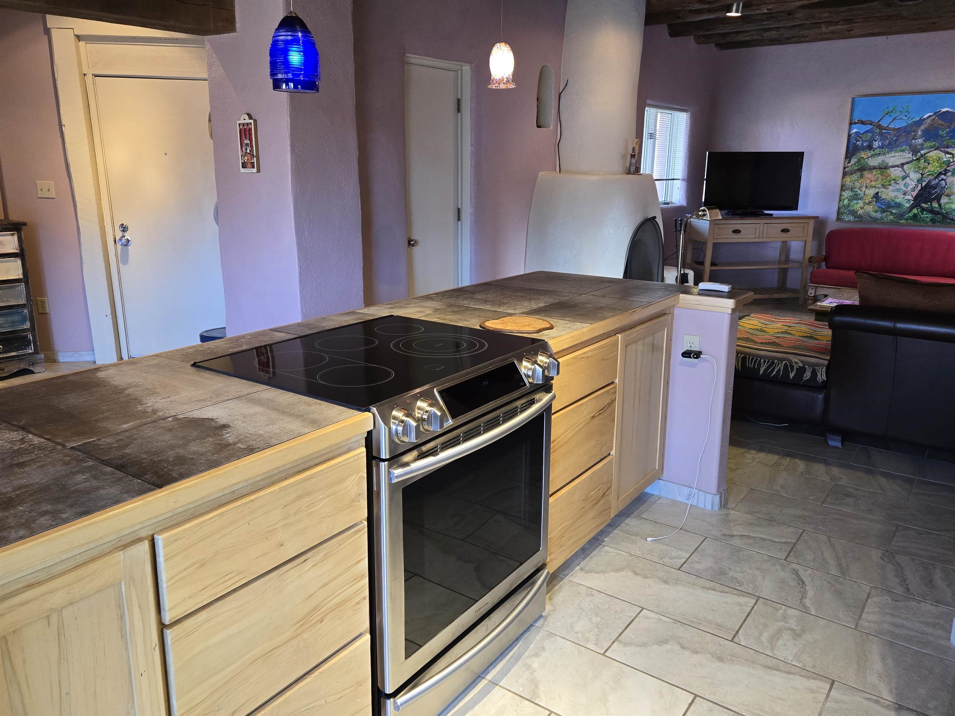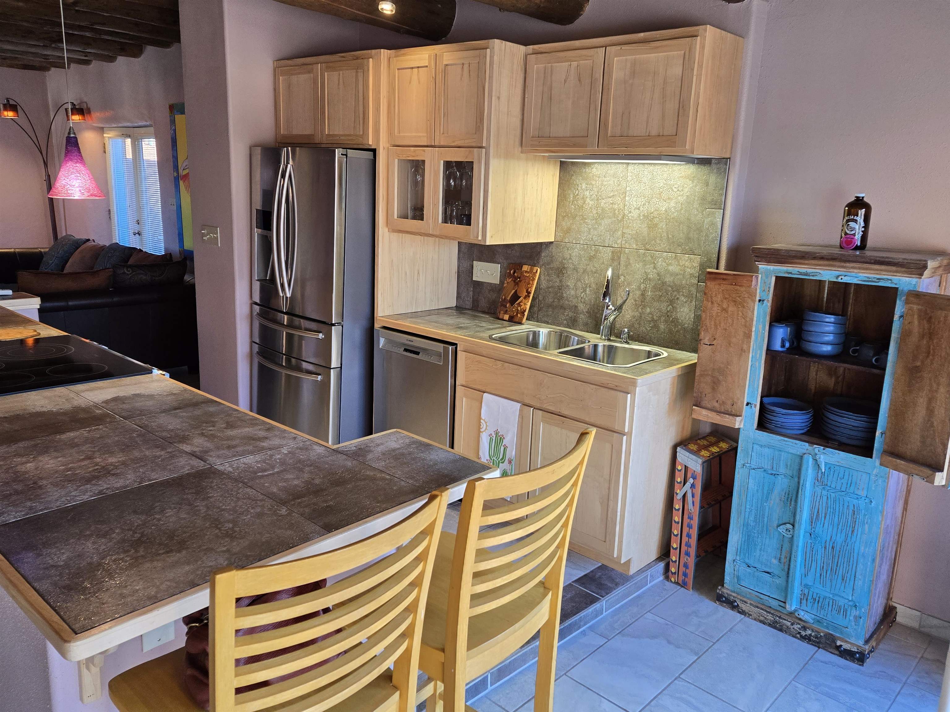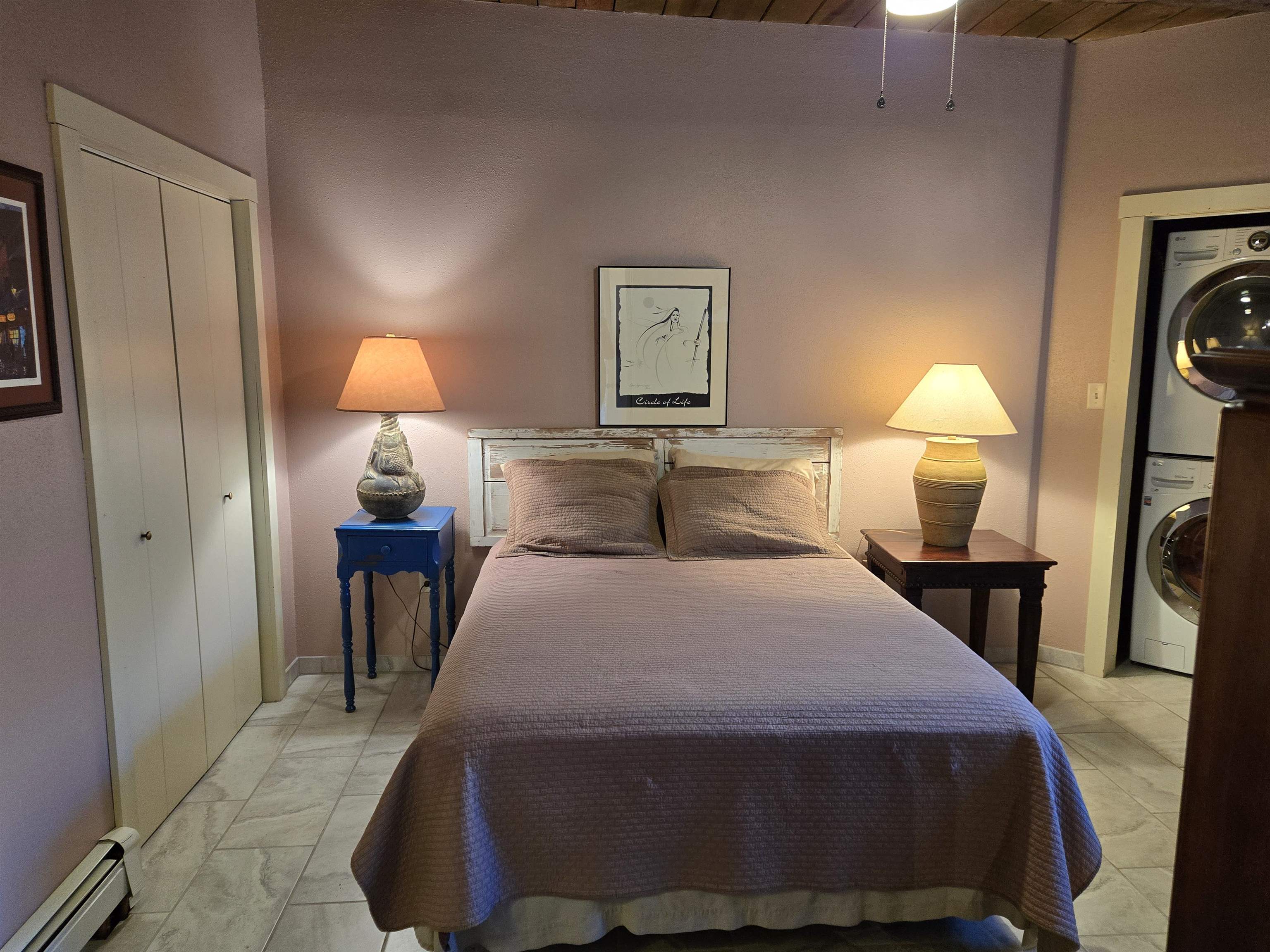 This beautifully updated 2 bedroom 2 bath condo is just a short walk to downtown Taos. It features 2 separate courtyards, a one car garage, a big kitchen island, stainless appliances and ensuite bathrooms for each of the bedrooms. There is a full sized washer and dryer in the unit. The building has 6 units. Valverde Street is located just 2 blocks west of Taos Plaza and is very convenient to shopping, restaurants, concerts and downtown events. PRIME LOCATION AND COMMUNITY FEATURES: The condominium, called Casa Grande is ideally located within the historic district of Taos, an area where short-term rentals are not permitted; however, long-term rental opportunities are available for residents. Its prime placement offers outstanding convenience and walkability as it is situated close to the plaza, Kit Carson Park, the dog park, and the library. Being on the north side of the Historic Taos Plaza, the property provides easy access to the Taos Ski Valley, making it especially appealing to those who enjoy outdoor activities. Additionally, the building borders Garcia Elementary School, ensuring a peaceful and quiet atmosphere during evenings, summers, and weekends. OPEN LIVING SPACES AND COURTYARDS: The main living area of the condominium is designed with an open-concept kitchen and living room. French doors in the living area open directly onto the east courtyard, which leads to the back condo area and serves as a shortcut to the plaza. A fireplace, crafted by renowned Taos artist Carmen Valvarde, serves as a striking centerpiece in this space. The kitchen is equipped with modern stainless steel appliances, including an electric range with an internal exhaust system. It overlooks the south courtyard, which provides passive heat in the winter to keep heating costs low and helps keep the unit cool during the summer. The south courtyard also features a flagstone patio and connects to the condo grounds, the front parking lot, and the pathway to the plaza. BEDROOMS AND BATHROOMS: Both bedrooms in the unit feature custom-designed headboards created by a local artist and have their own individual thermostats for personalized comfort. The master bedroom has a sliding door that opens directly to the courtyard and includes a private bathroom with a shower. The guest bedroom contains a full-size washer and dryer neatly tucked away in a closet, and the guest bathroom is accessible from the main living area, providing convenience for both residents and guests. The entire unit is finished with tile flooring throughout. HEATING, GARAGE AND BUILDING DETAILS: Heating for the condo is provided by water baseboards, with the boiler and hot water holding tank located in the one-car garage beneath the unit. This setup ensures that the garage remains heated during the winter months. The garage is equipped with a smart door that can be controlled via an app. While the garage does not have direct access to the living space, stairs lead from the garage to the entryway, and once inside, all living areas are situated on a single level for ease of access. The building itself consists of six units, was re-stuccoed in 2018, and had its roof and stairs replaced in 2021, with both improvements currently under warranty. Most furnishings can stay with the unit. Seller intends to retain artwork and selected pieces.