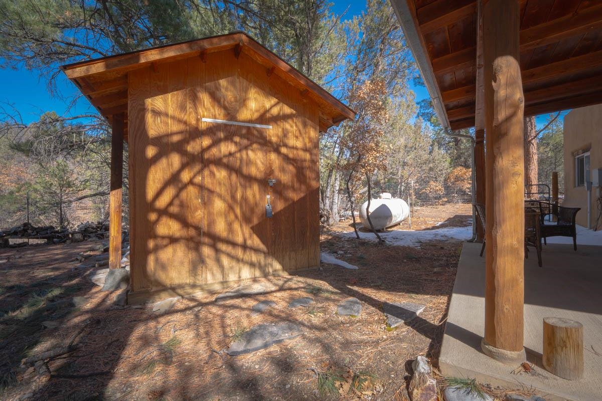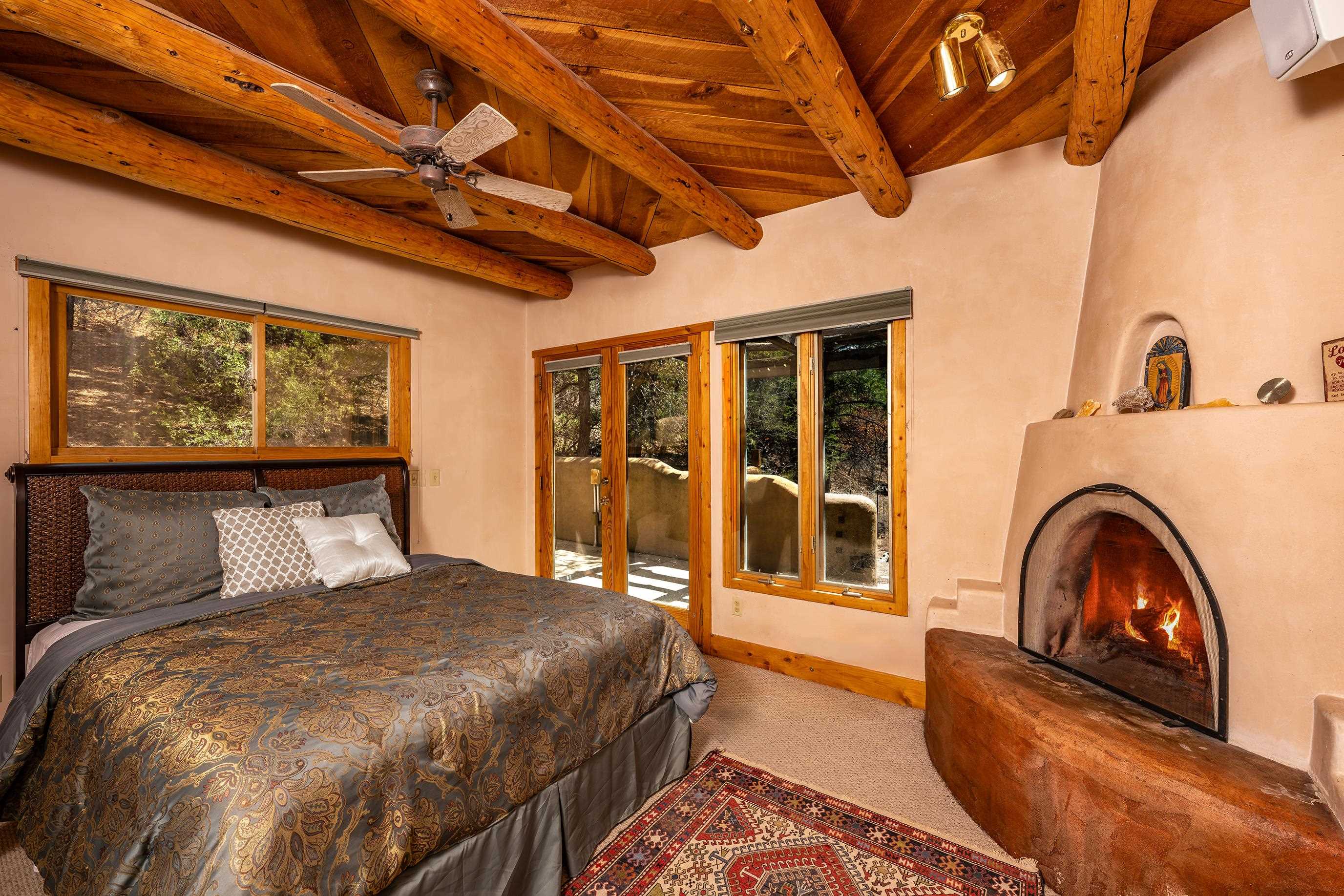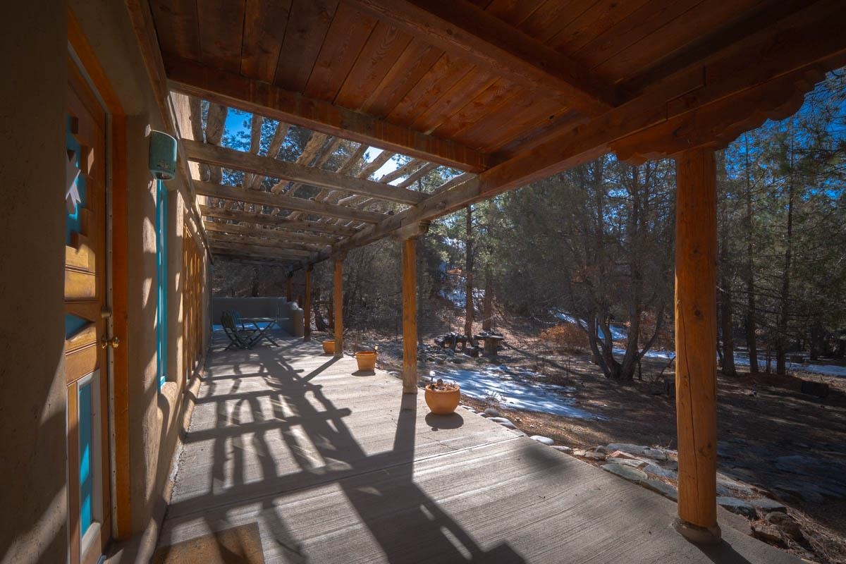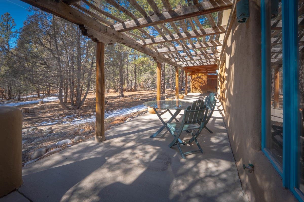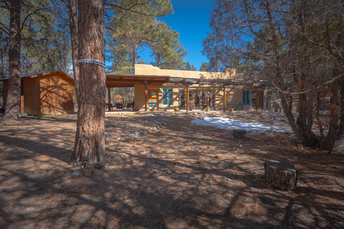 Tucked away in a whispering forest of towering Ponderosa Pines, this pueblo-style home invites you to embrace the mountain lifestyle. The home sits on 4.55 acres of land with many opportunities for growth. Sunlight reaches through the latilla portal and creates a great space to spend time outdoors. A covered portion of the portal assures you can enjoy the outdoors in any weather scenario. Inside you will find two wood burning kiva fireplaces, saltillo tile floors, vigas, rough sawn lumber ceilings, and large windows in all directions with views of the surrounding forest. This perfectly sized home has two bedrooms and two bathrooms; the primary bedroom features a large walk-in closet, and the guest bedroom is separated by the living room. Radiant floor heating keeps the home toasty during winter months; once you've experienced this type of heating, you'll never want to switch to another heating system! The location of this home is ideal. It is a short drive to the Taos Ski Valley for the best hikes in New Mexico (and skiing, biking of course!), a few minutes from Arroyo Seco, where a local grocery store and restaurants are found, and a quick drive down Hondo Seco Road to access the Rio Grande by the John Dunn Bridge. Sensible covenants (see associated documents) in the area protect your surroundings, and a road maintenance agreement is in place to maintain your access. The topography of the land allows for further structures to be built and maintains privacy, by using the contours of the land to separate the property from its neighbors. A fenced in front yard is perfect for the pups to stretch their legs or keep the deer out! The shed is great for storage; not that the house doesn't have enough closets! Come walk through this property, and you'll see why the owners held on to it as long as they have!
