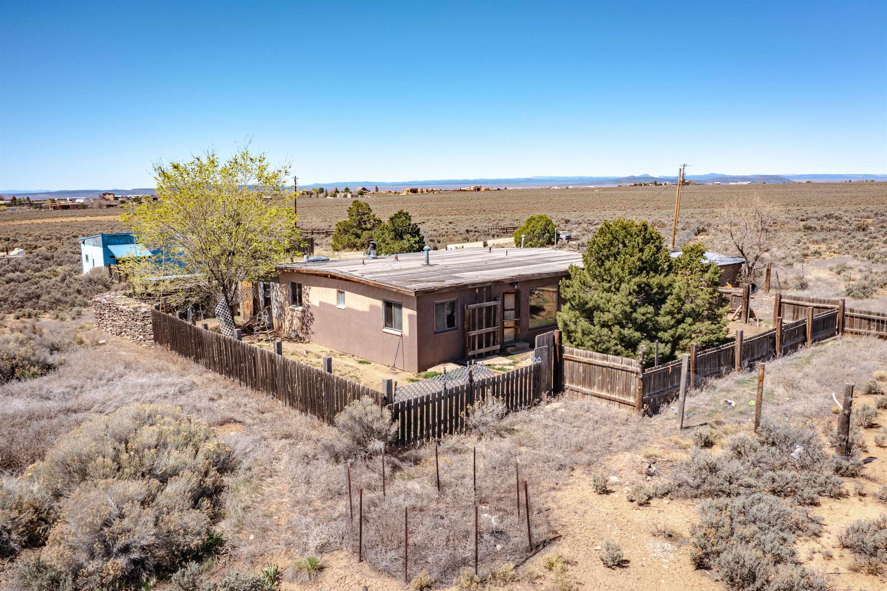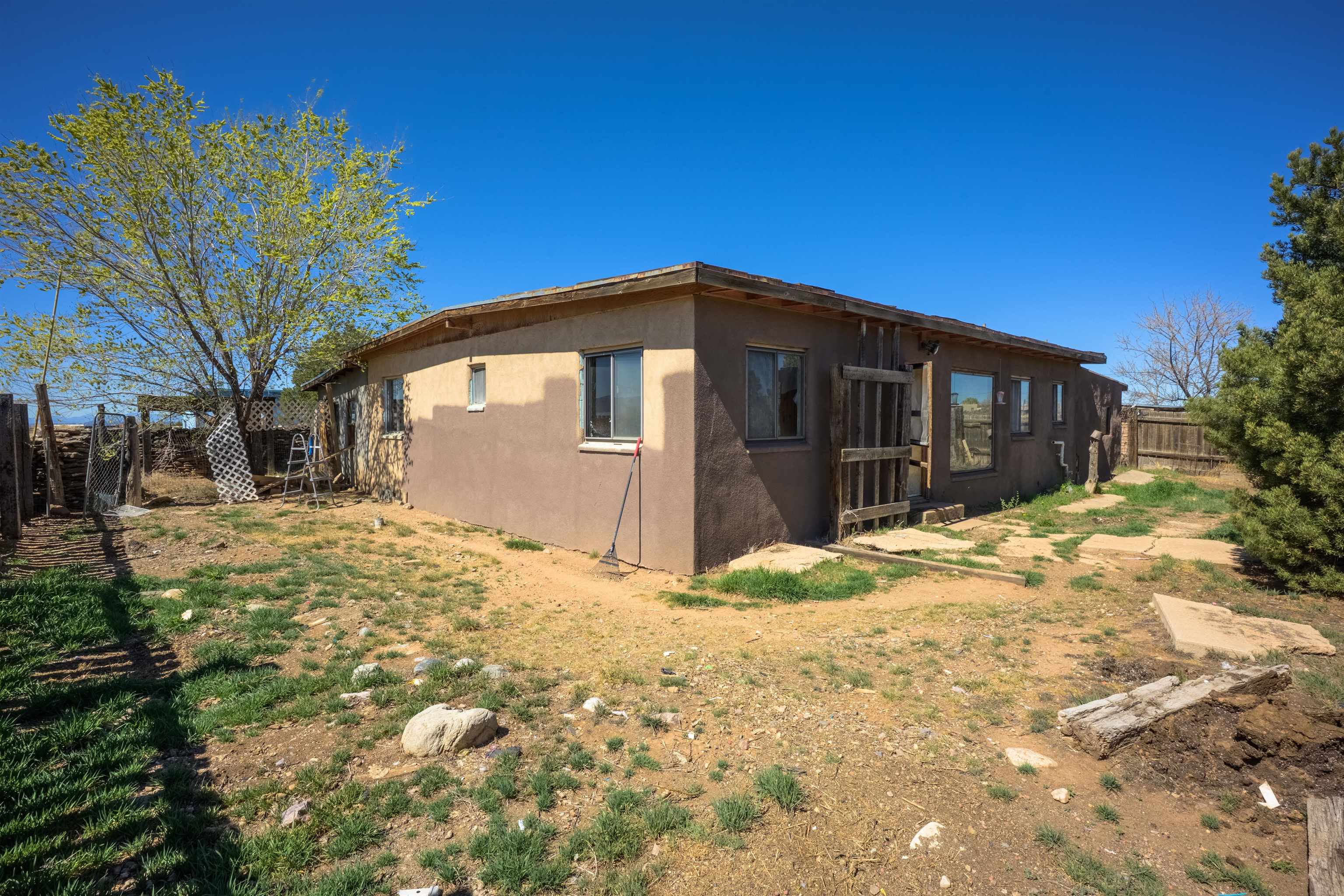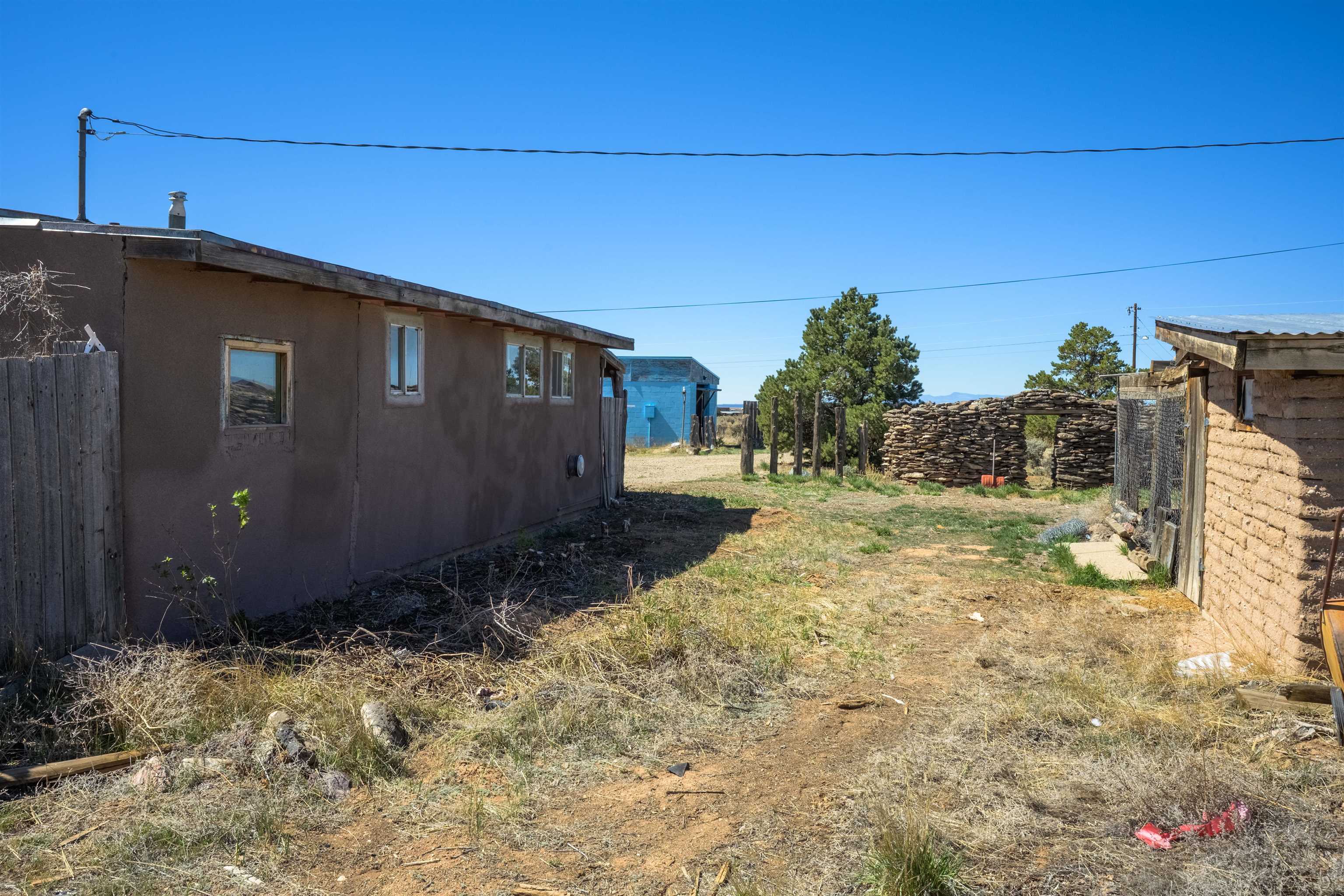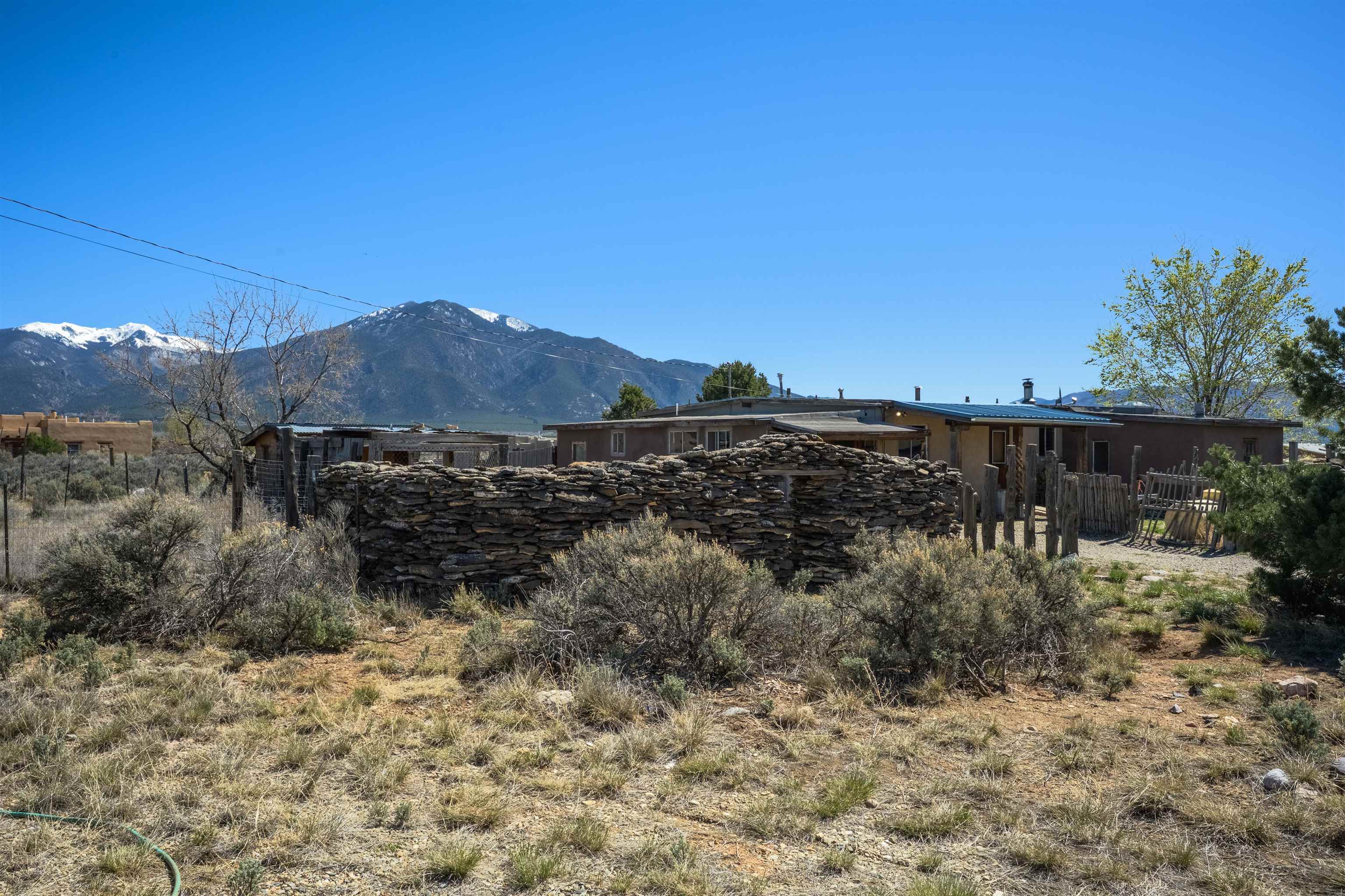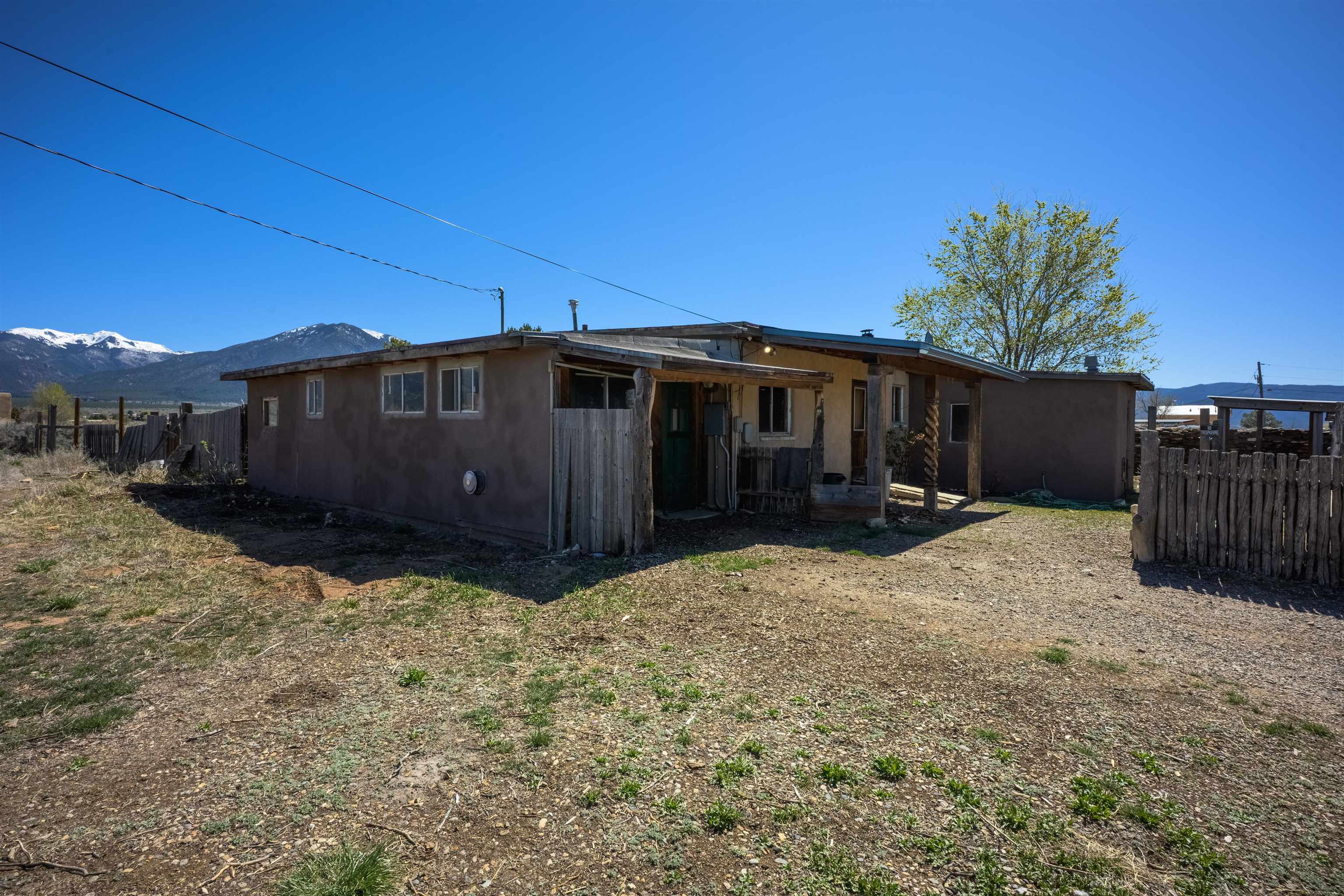 Gorgeous lot with tons of potential! Just minutes to town with panoramic mountain views, mature trees, Acequia irrigation ditch, hand built dry stack stone wall, large garage/ workshop, adobe chicken coop. The house is a true fixer upper, and is sold AS-IS. Or... bring your imagination and enthusiasm, start fresh, and build your dream home!