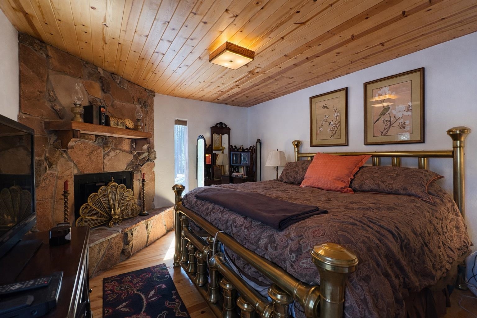 1 block from Monte Verde Lake! This adorable cabin is conveniently located, has 2 fireplaces, stone flooring, tongue & groove celings and great outdoor space! When you first walk in you are greeted by a great mud room area that leads into an open room where you'll find the kitchen, dining room and living room. The large stone fireplace is the highlight of this space! When you step outside onto the patio is a great covered porch and a sunny BBQ area. Further into the house, you follow the stone floor into a master bedroom with another stone fireplace! The property is a part of the Angel Fire Resort Membership, where you can enjoy a PGA golf course, down hill mountain biking park, ski resort, hiking trails, fishing and so much more!