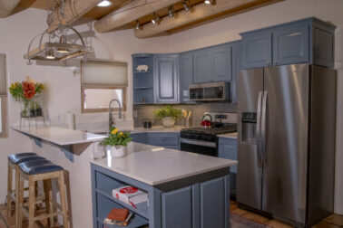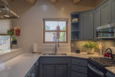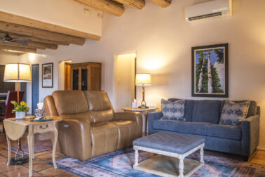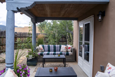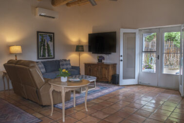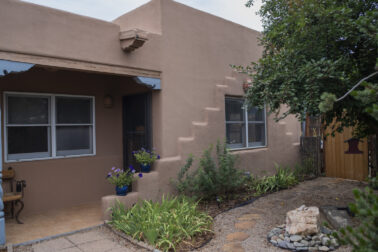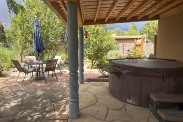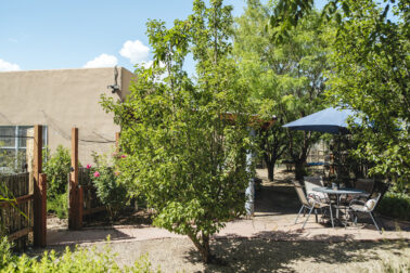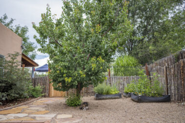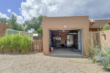 YOUR PICTURE PERFECT TAOS DREAM HOME delivers ultimate comfort with air conditioning and an unbeatable location steps from everything. Discover the enchanting world of Taos with this gorgeous, move-in ready 3-bedroom, 2-bath Pueblo-style home. Fully fenced with a one-car attached garage, this 1462 sq ft residence welcomes you through a beautifully manicured outdoor courtyard with a fountain, immediately setting a serene tone. The well-thought-out open floor plan creates a spacious and inviting atmosphere, perfect for both daily living and entertaining. The kitchen, truly the heart of the house, boasts new upscale appliances, ample counter space for cooking, countertop for casual dining and plenty of storage. The spacious dining/living room extends seamlessly outdoors to a lovely patio—ideal for morning coffee or evening relaxation or entertaining. A large primary bedroom with an attached bathroom opens directly to a hot tub and a stunning landscaped back patio. Two additional bedrooms offer versatile spaces for guests or a dedicated studio. Enjoy the warmth and beauty of tile floors throughout, complemented by a charming Southwestern fireplace, tongue & groove and Viga ceilings that add character and charm. Comfort is paramount with radiant floor heat keeping you warm on chilly evenings, and efficient mini-splits providing year-round climate control. The attached garage has custom shelving and lots of storage. Additionally there is an adorable green shed perfect for additional storage or whatever your needs are. This home comes with the convenience of town water, sewer, and natural gas. Beyond the flagstone patio, you'll find a meticulously landscaped and treed backyard with a chicken coop and plenty of space for outdoor dining. There are prolific pear trees, a magical quartz fountain and many outside areas to lounge, lunch or meditate. Live in a community where local treasures are just steps away, and the vibrant culture of Taos, including fabulous cafes, new and vibrant restaurants, and the lively Taos Plaza, is at your footsteps.