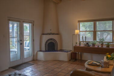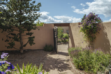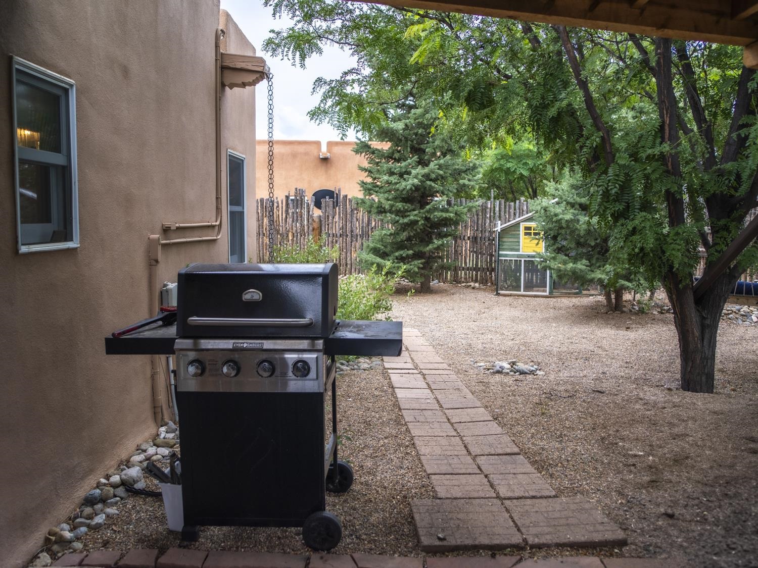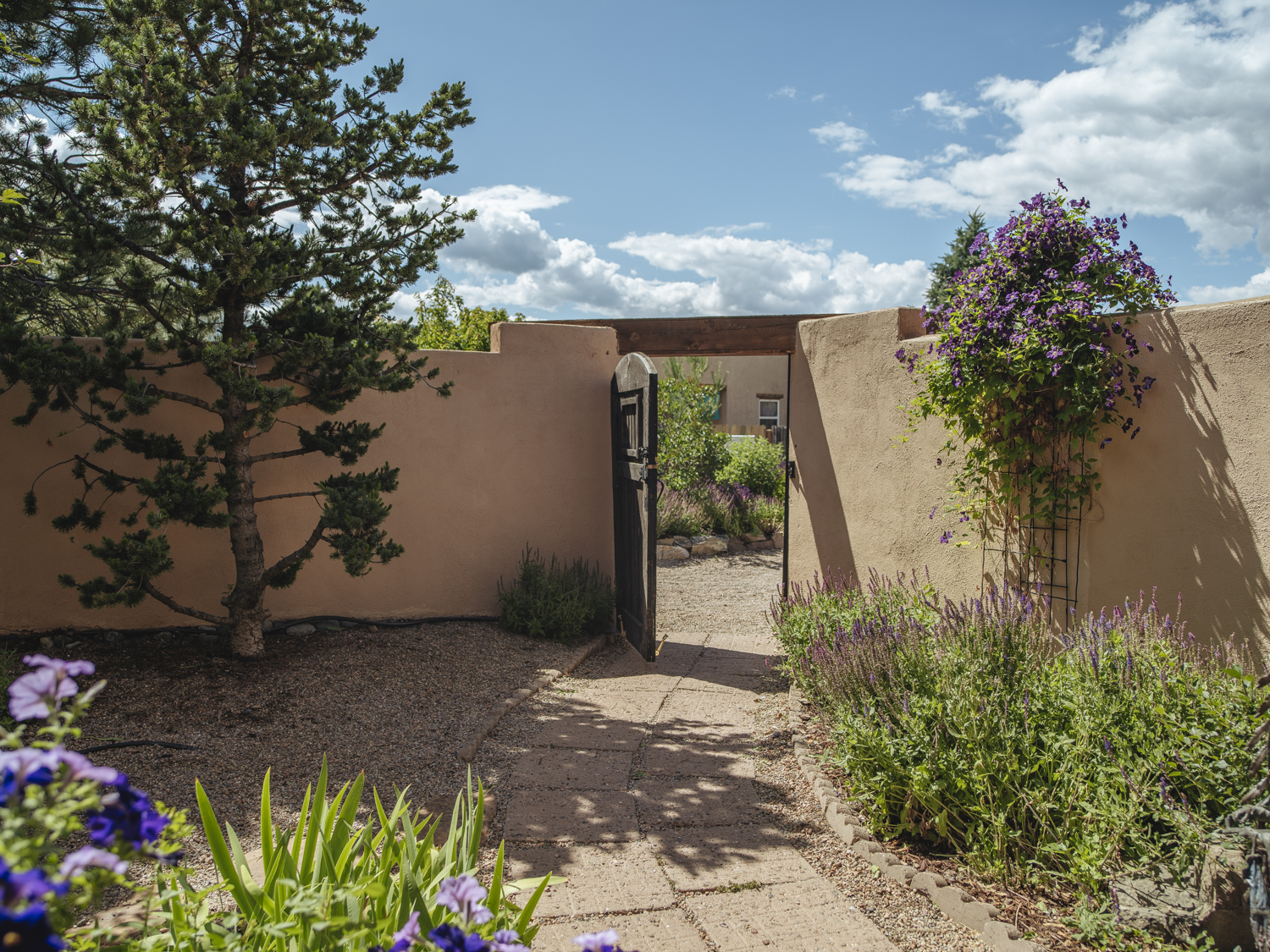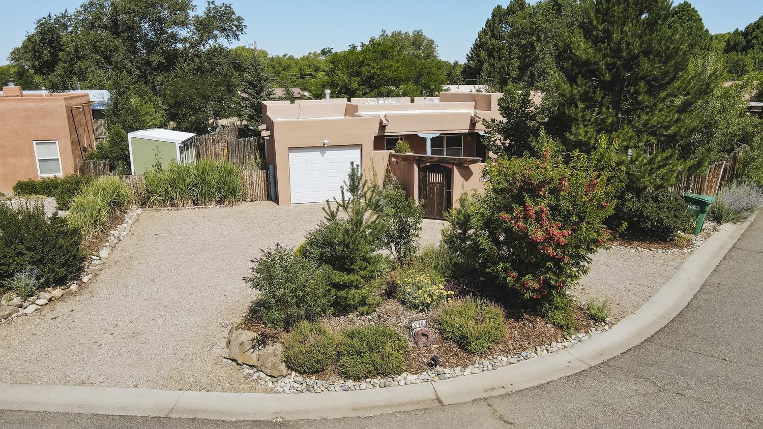 YOUR PICTURE PERFECT TAOS DREAM HOME delivers ultimate comfort with air conditioning and an unbeatable location steps from everything. Discover the enchanting world of Taos with this gorgeous, move-in ready 3-bedroom, 2-bath Pueblo-style home. Fully fenced with a one-car attached garage, this 1462 sq ft residence welcomes you through a beautifully manicured outdoor courtyard with a fountain, immediately setting a serene tone. The well-thought-out open floor plan creates a spacious and inviting atmosphere, perfect for both daily living and entertaining. The kitchen, truly the heart of the house, boasts new upscale appliances, ample counter space for cooking, countertop for casual dining and plenty of storage. The spacious dining/living room extends seamlessly outdoors to a lovely patio—ideal for morning coffee or evening relaxation or entertaining. A large primary bedroom with an attached bathroom opens directly to a hot tub and a stunning landscaped back patio. Two additional bedrooms offer versatile spaces for guests or a dedicated studio. Enjoy the warmth and beauty of tile floors throughout, complemented by a charming Southwestern fireplace, tongue & groove and Viga ceilings that add character and charm. Comfort is paramount with radiant floor heat keeping you warm on chilly evenings, and efficient mini-splits providing year-round climate control. The attached garage has custom shelving and lots of storage. Additionally there is an adorable green shed perfect for additional storage or whatever your needs are. This home comes with the convenience of town water, sewer, and natural gas. Beyond the flagstone patio, you'll find a meticulously landscaped and treed backyard with a chicken coop and plenty of space for outdoor dining. There are prolific pear trees, a magical quartz fountain and many outside areas to lounge, lunch or meditate. Live in a community where local treasures are just steps away, and the vibrant culture of Taos, including fabulous cafes, new and vibrant restaurants, and the lively Taos Plaza, is at your footsteps.