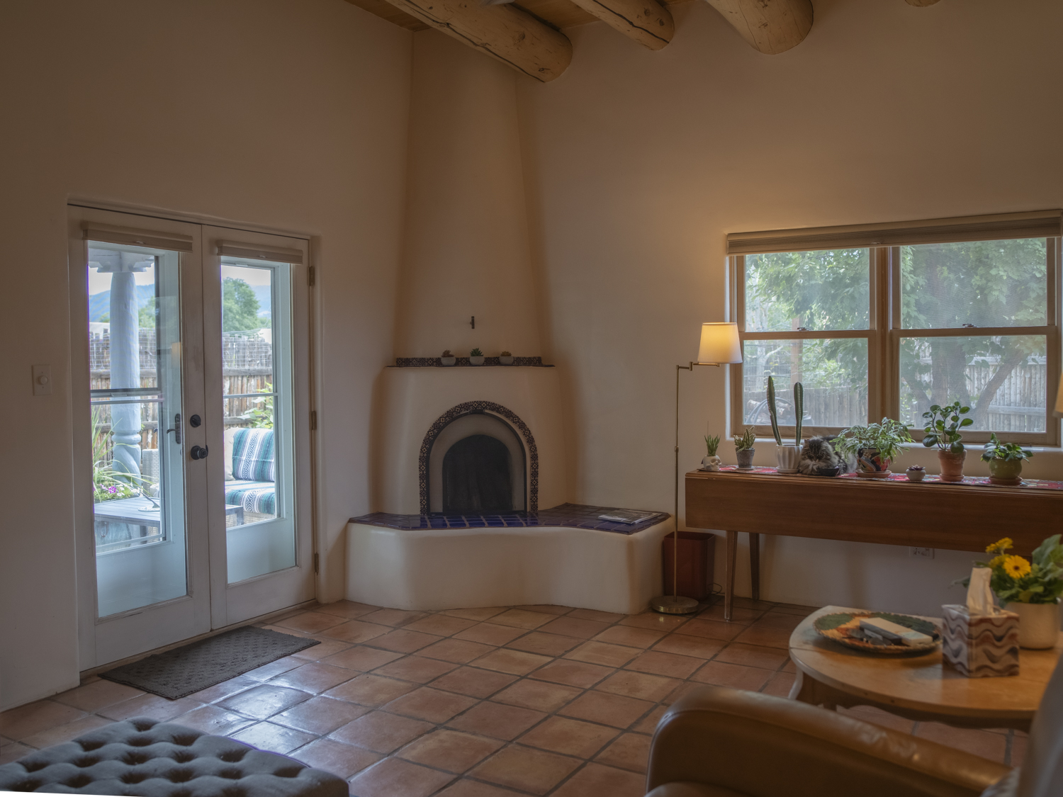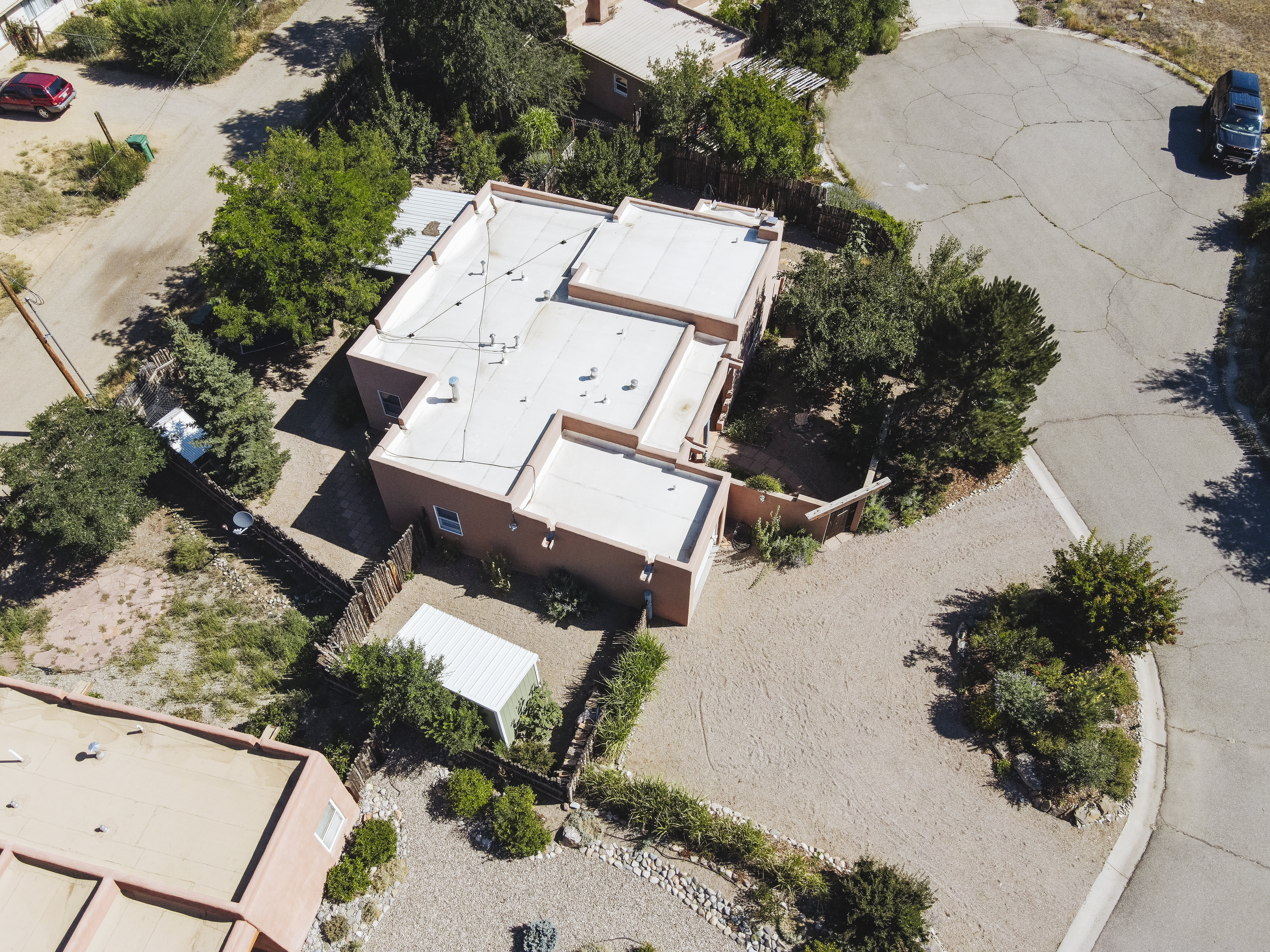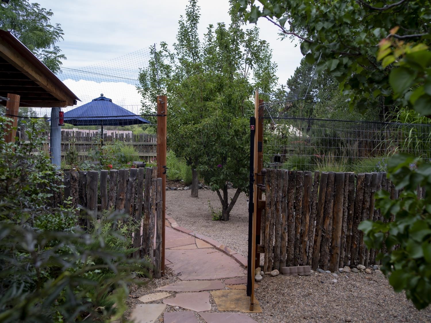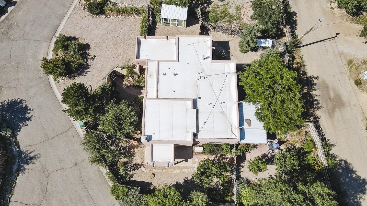 YOUR PICTURE PERFECT TAOS DREAM HOME delivers ultimate comfort with air conditioning and an unbeatable location steps from everything. Discover the enchanting world of Taos with this gorgeous, move-in ready 3-bedroom, 2-bath Pueblo-style home. Fully fenced with a one-car attached garage, this 1462 sq ft residence welcomes you through a beautifully manicured outdoor courtyard with a fountain, immediately setting a serene tone. The well-thought-out open floor plan creates a spacious and inviting atmosphere, perfect for both daily living and entertaining. The kitchen, truly the heart of the house, boasts new upscale appliances, ample counter space for cooking, countertop for casual dining and plenty of storage. The spacious dining/living room extends seamlessly outdoors to a lovely patio—ideal for morning coffee or evening relaxation or entertaining. A large primary bedroom with an attached bathroom opens directly to a hot tub and a stunning landscaped back patio. Two additional bedrooms offer versatile spaces for guests or a dedicated studio. Enjoy the warmth and beauty of tile floors throughout, complemented by a charming Southwestern fireplace, tongue & groove and Viga ceilings that add character and charm. Comfort is paramount with radiant floor heat keeping you warm on chilly evenings, and efficient mini-splits providing year-round climate control. The attached garage has custom shelving and lots of storage. Additionally there is an adorable green shed perfect for additional storage or whatever your needs are. This home comes with the convenience of town water, sewer, and natural gas. Beyond the flagstone patio, you'll find a meticulously landscaped and treed backyard with a chicken coop and plenty of space for outdoor dining. There are prolific pear trees, a magical quartz fountain and many outside areas to lounge, lunch or meditate. Live in a community where local treasures are just steps away, and the vibrant culture of Taos, including fabulous cafes, new and vibrant restaurants, and the lively Taos Plaza, is at your footsteps.