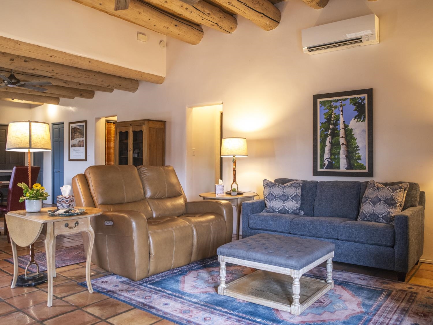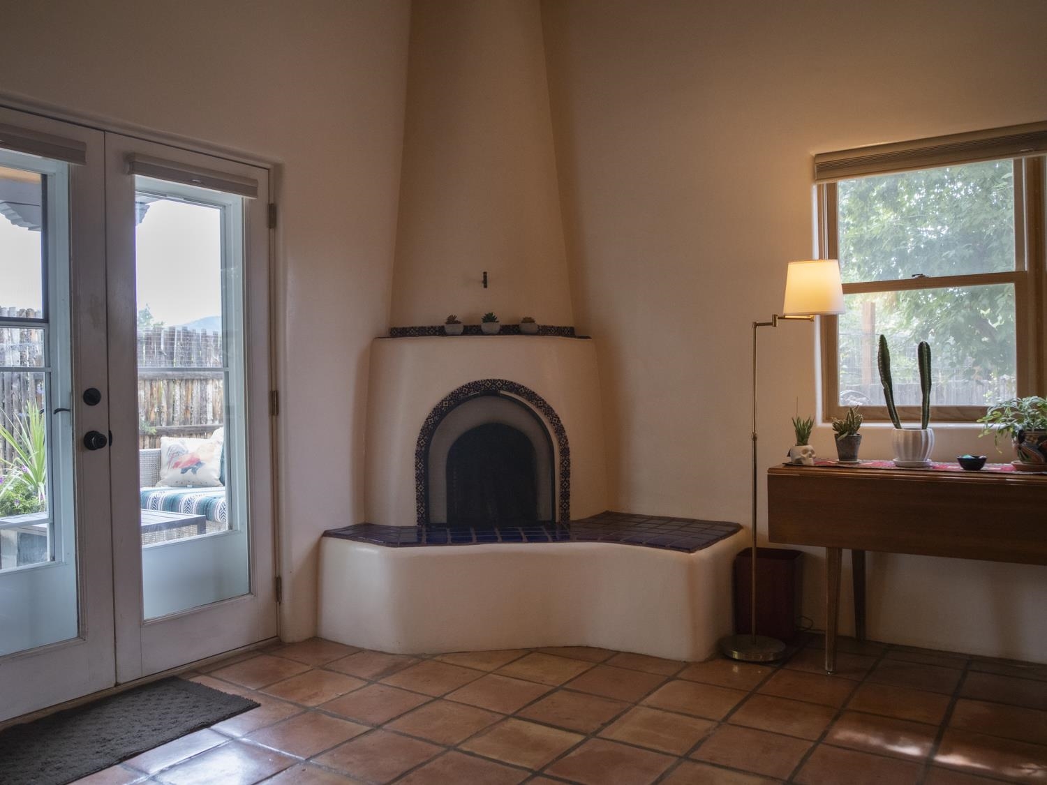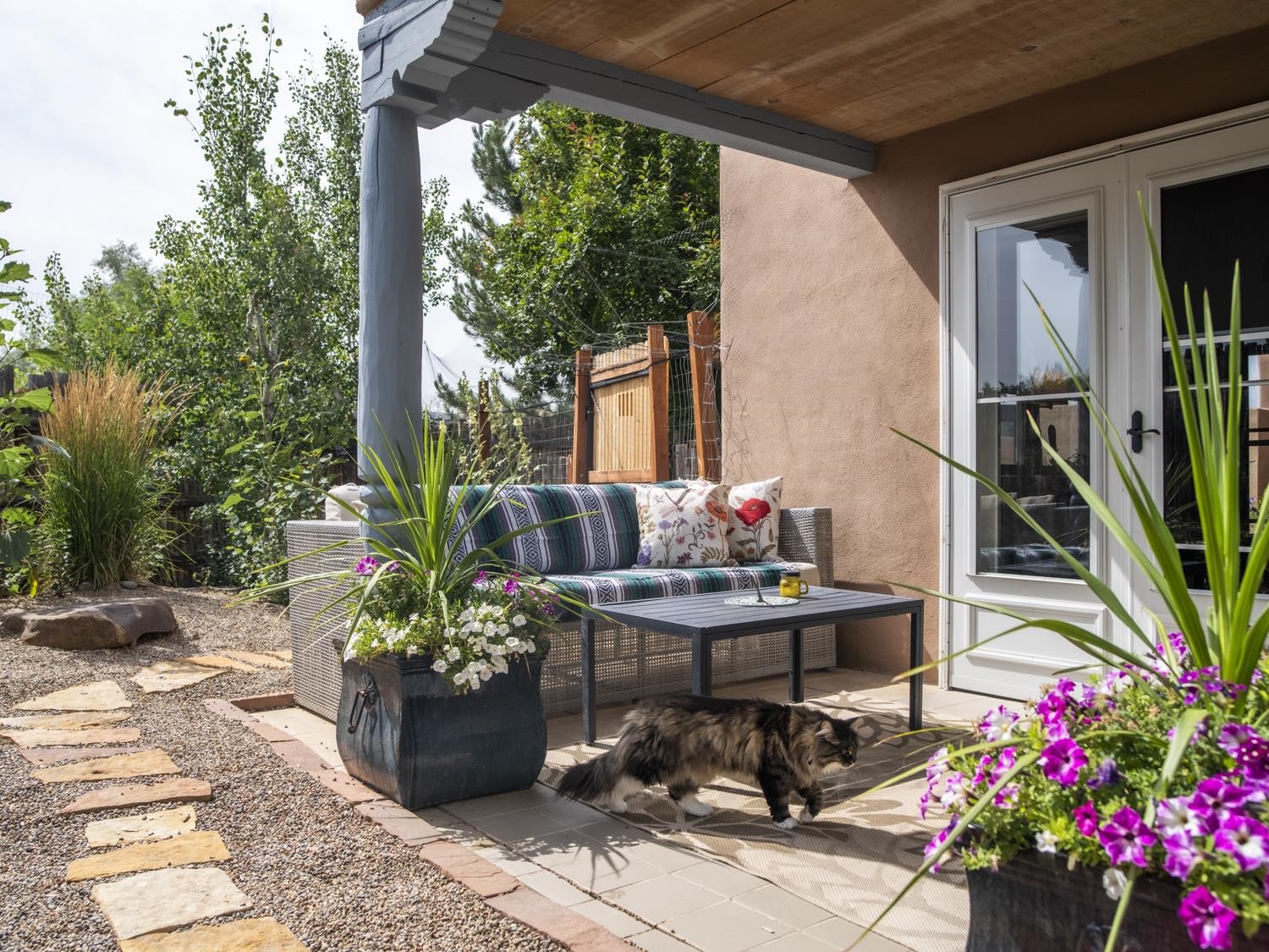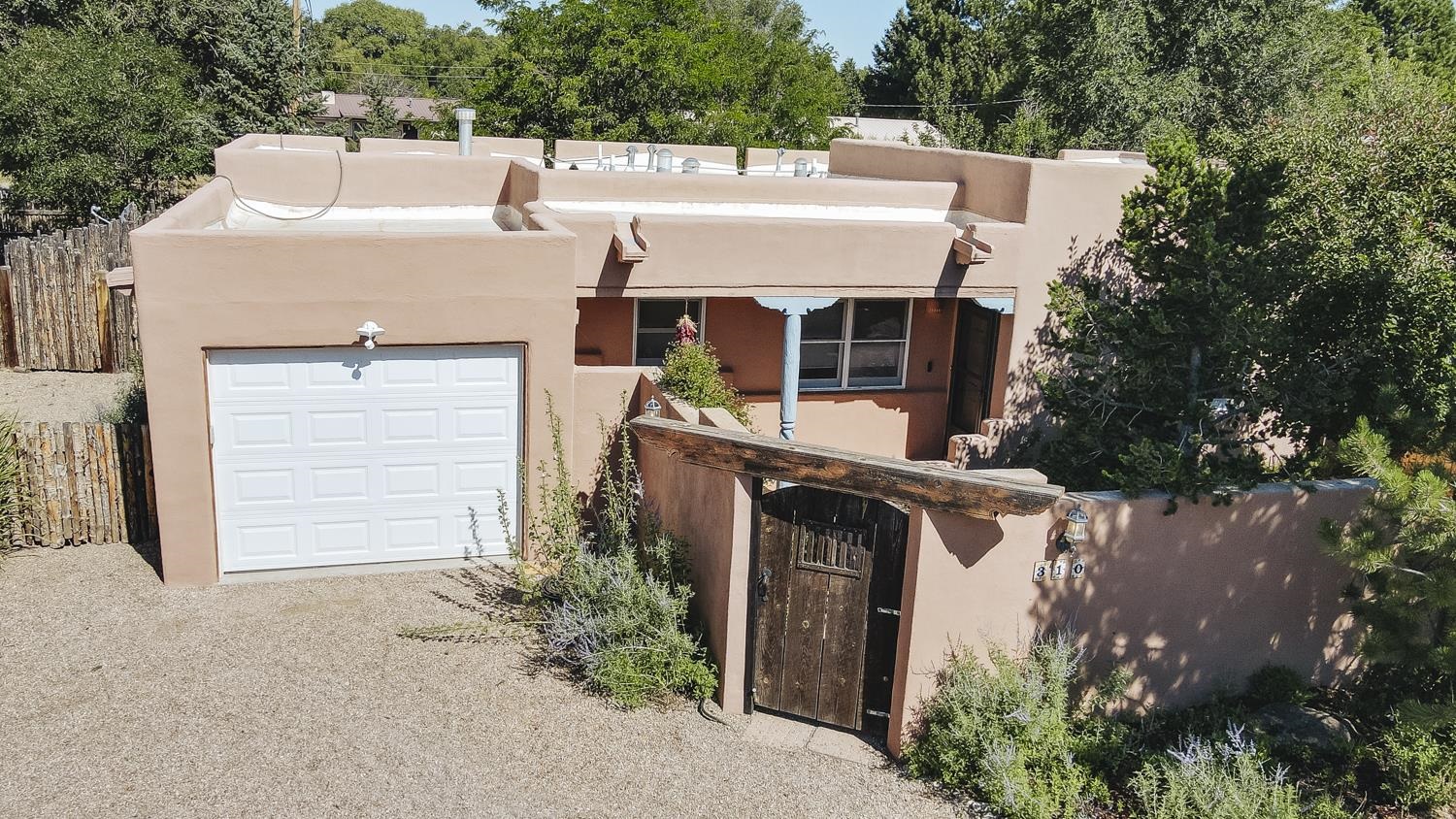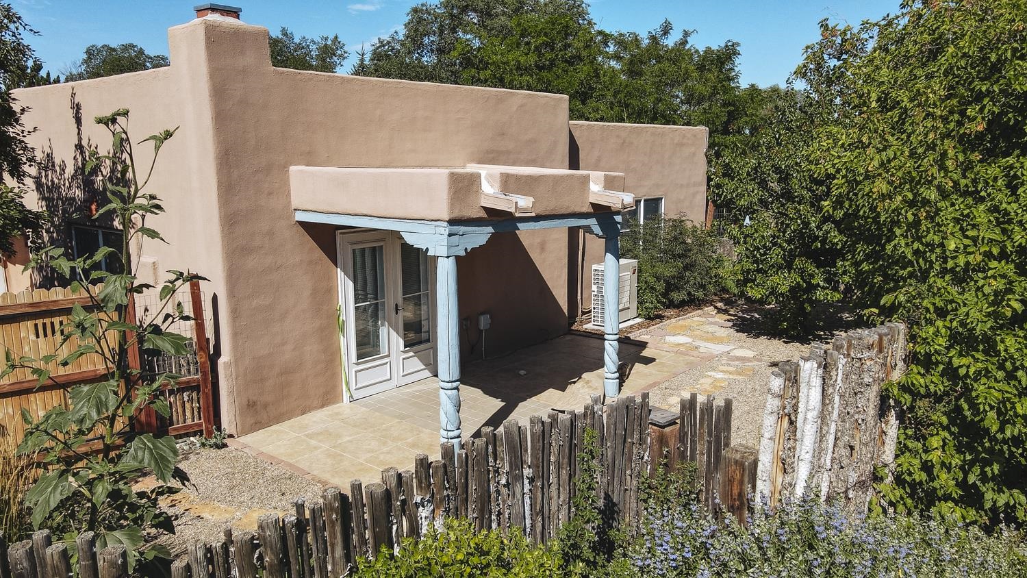 YOUR PICTURE-PERFECT TAOS DREAM HOME delivers the ultimate combination of village walkability and private sanctuary living. Perfectly positioned just steps from the historic Taos Plaza, galleries, vibrant restaurants, and the beautifully renovated Fred Baca Park this move-in-ready 3-bedroom, 2-bathroom Pueblo-style residence offers an unbeatable location without sacrificing serenity. The experience begins at the front gate, where a fully fenced perimeter leads to a beautifully manicured entry courtyard. The gentle sound of a trickling fountain sets a tranquil tone before you even step through the front door. Inside, the 1,462-square-foot open floor plan is a masterclass in Southwestern craftsmanship, featuring authentic viga and tongue-and-groove ceilings, tiled floors throughout, and a charming traditional fireplace that serves as the heart of the living space. The chef’s kitchen has been thoughtfully reimagined with new upscale appliances, ample counter space for preparation, a casual dining breakfast bar, and plentiful storage. Designed for effortless year-round comfort, the residence features the constant warmth of radiant floor heat and the modern efficiency of mini-split air conditioning—a rare luxury for in-town living. The expansive primary suite serves as a true retreat, offering an attached bath and direct access to a stunning landscaped patio where a secluded hot tub awaits under the stars. Two additional bedrooms provide versatile space for a creative studio, home office, or guest quarters. The outdoor living spaces are a hidden oasis of sustainability and peace. Beyond the flagstone patio, the meticulously landscaped backyard reveals a lush environment with prolific pear trees, a "magical" quartz fountain, and numerous vignettes designed for lounging, dining, or meditation. Additional features include an attached one-car garage with custom shelving and an "adorable green shed" for extra storage. Connected to town water, sewer, and natural gas, this home provides the ultimate in convenience. Live in a community where local treasures are at your doorstep, all while enjoying the quiet, turn-key seclusion of this meticulously maintained Taos jewel.