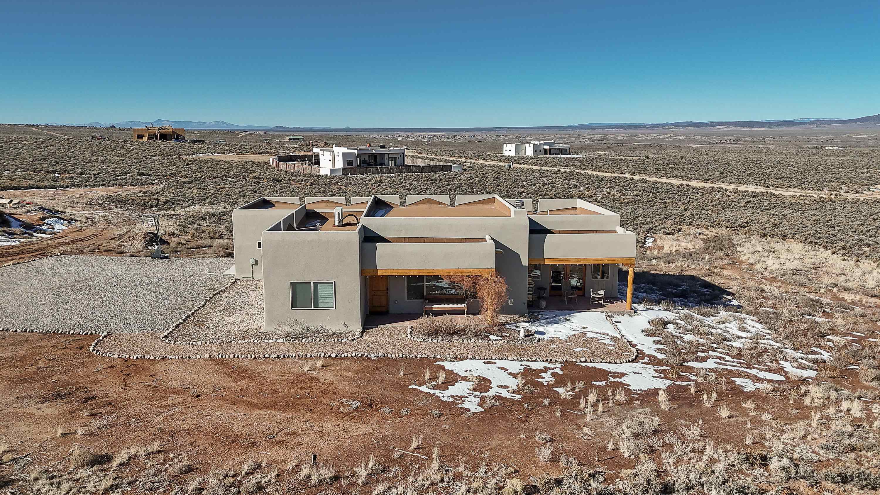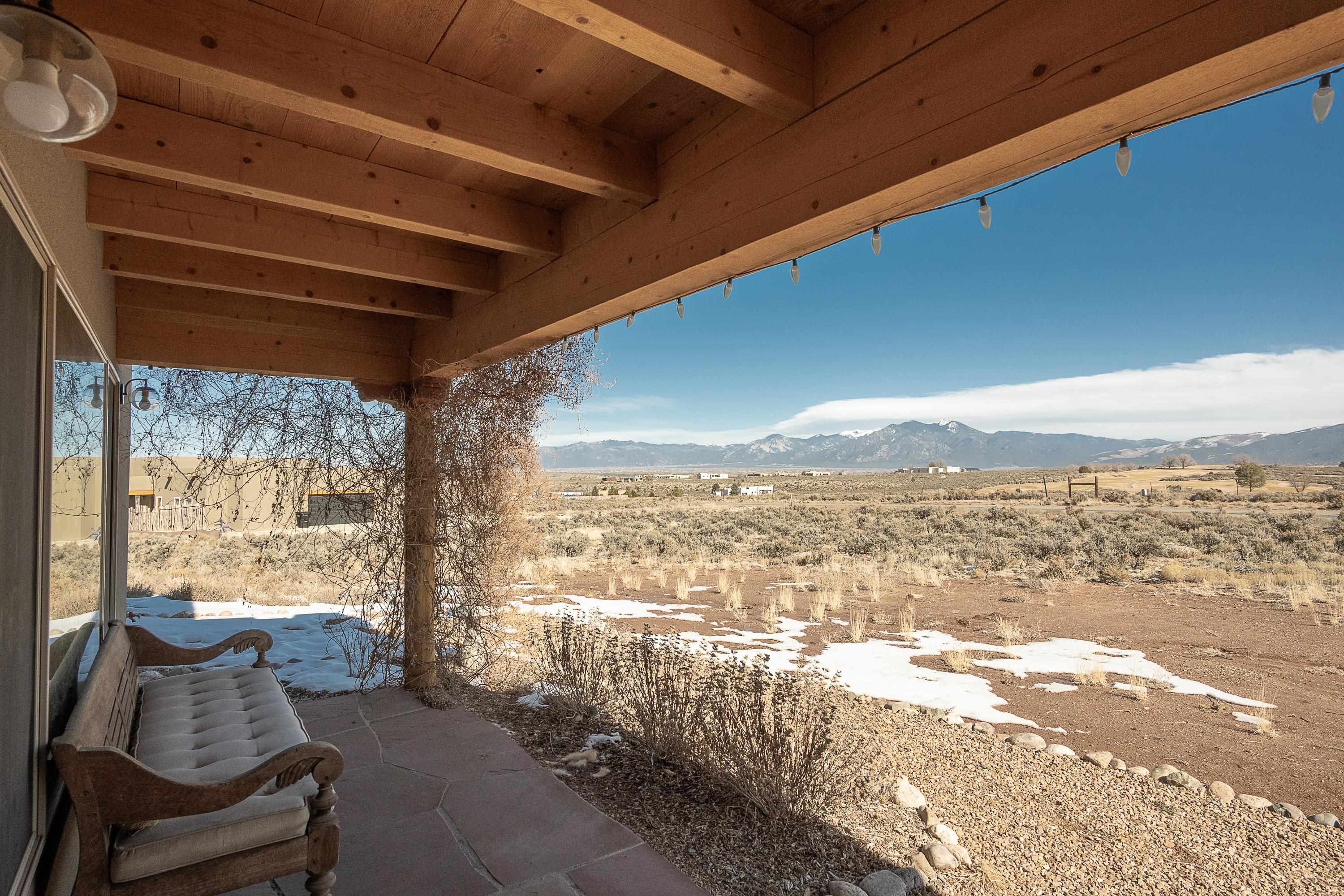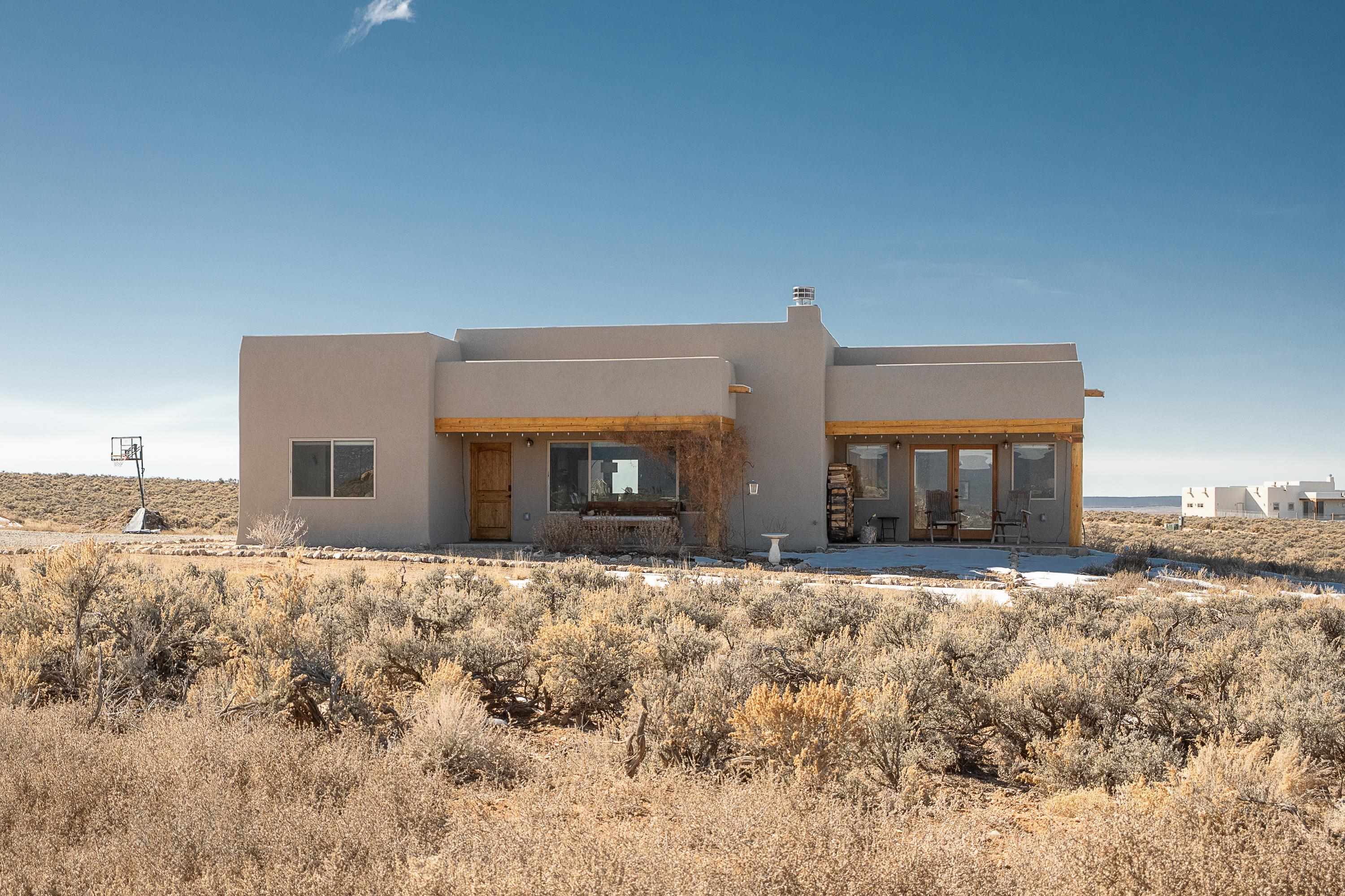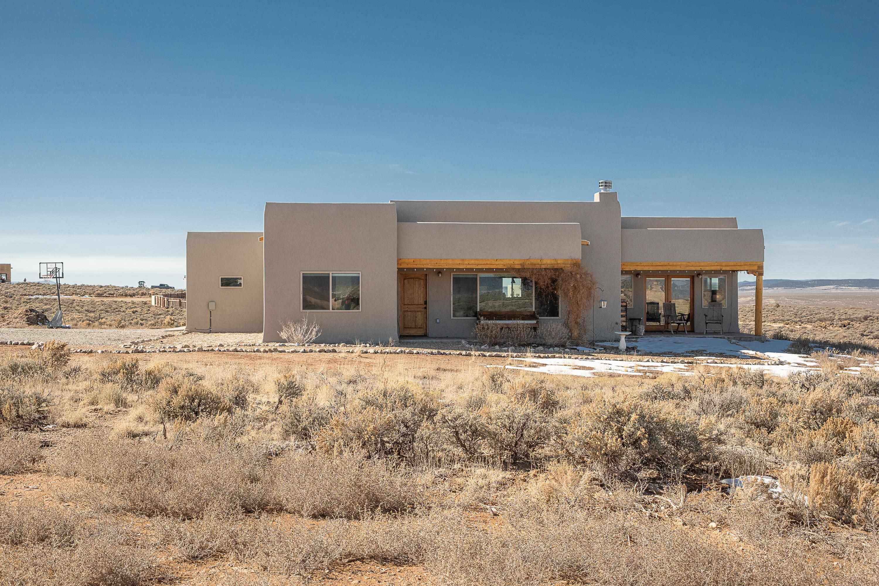 Nearly New Desert Modern | Taos Country Club Area | Completed just two years ago, this 3-bedroom, 2-bath contemporary Southwestern residence offers the rare combination of modern construction, timeless design, and iconic Sangre de Cristo views. Located near the fairways of the Taos Country Club, the home showcases clean architectural lines and a refined, high-desert aesthetic — thoughtfully designed for both comfort and elevated entertaining. A gracious split floorplan provides privacy for the primary suite, creating a serene retreat separate from guest bedrooms or workspace. The expansive great room serves as the home’s architectural centerpiece, where living, dining, and kitchen flow seamlessly with a cozy Southwest style fireplace tucked into the corner. Large vigas and a high ceiling add to the elevated feel of the principal living space. The kitchen is anchored by beautiful wood cabinetry and a substantial peninsula/bar— equally suited for intimate dinners, boozy brunches or larger gatherings. Additional highlights include: Attached heated two-car garage, mini-split to keep you cool in the summers, Paved road access for effortless year-round living, Modern systems and construction completed just two years ago, Clean, contemporary Southwestern design, Expansive views of the mountains, mesa and nearby golf course, close to hiking, biking, rafting and the town of Taos. The interior of the home is cozy and move-in ready, while the exterior awaits your creative vision. Make your outdoor space truly your own. (Some images have been virtually staged with landscaping and walled-courtyards) This stunning home feels current, intentional, and move-in ready — offering the peace of mind of newer construction paired with the beauty of one of Taos’ most desirable settings.