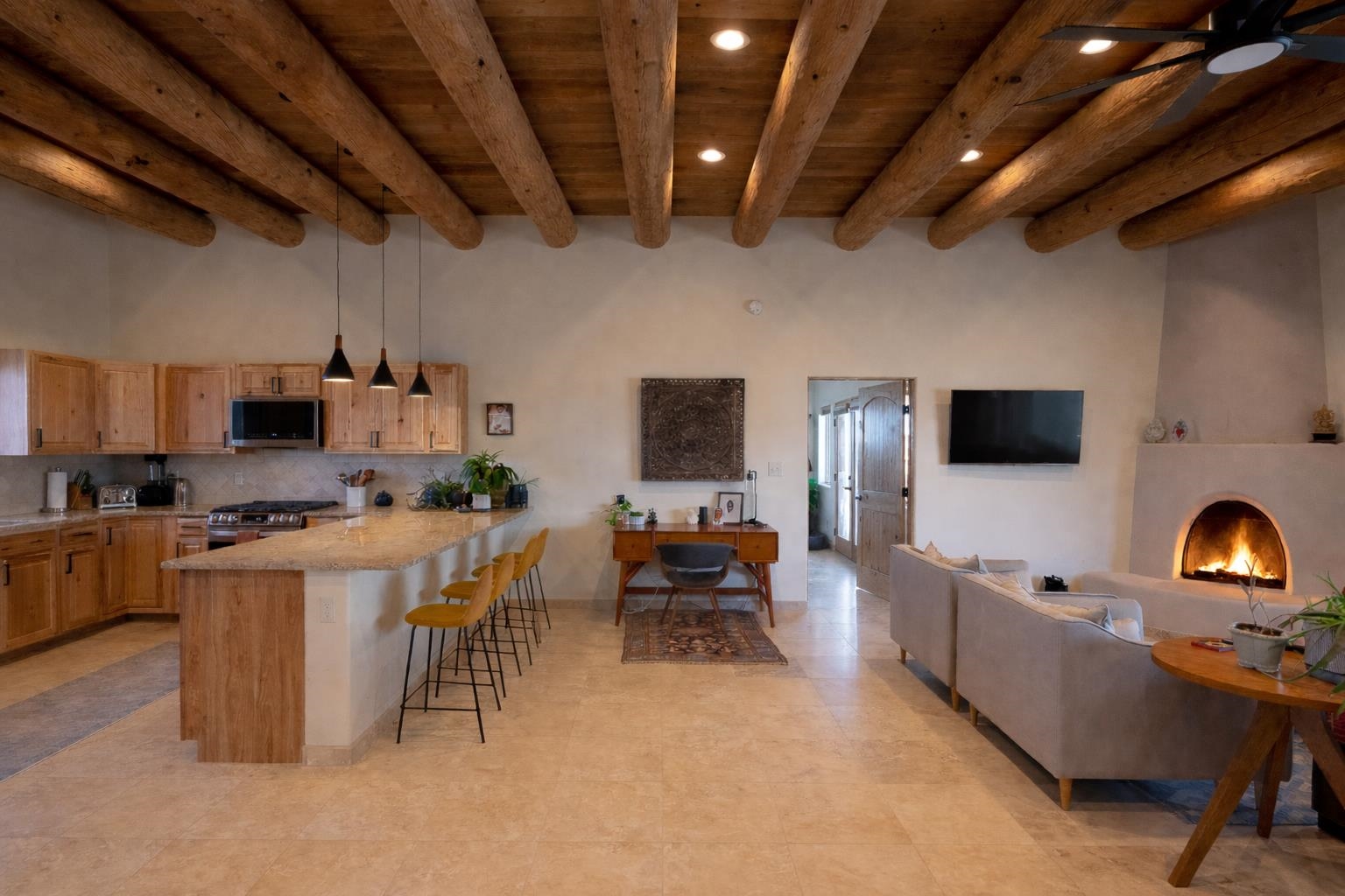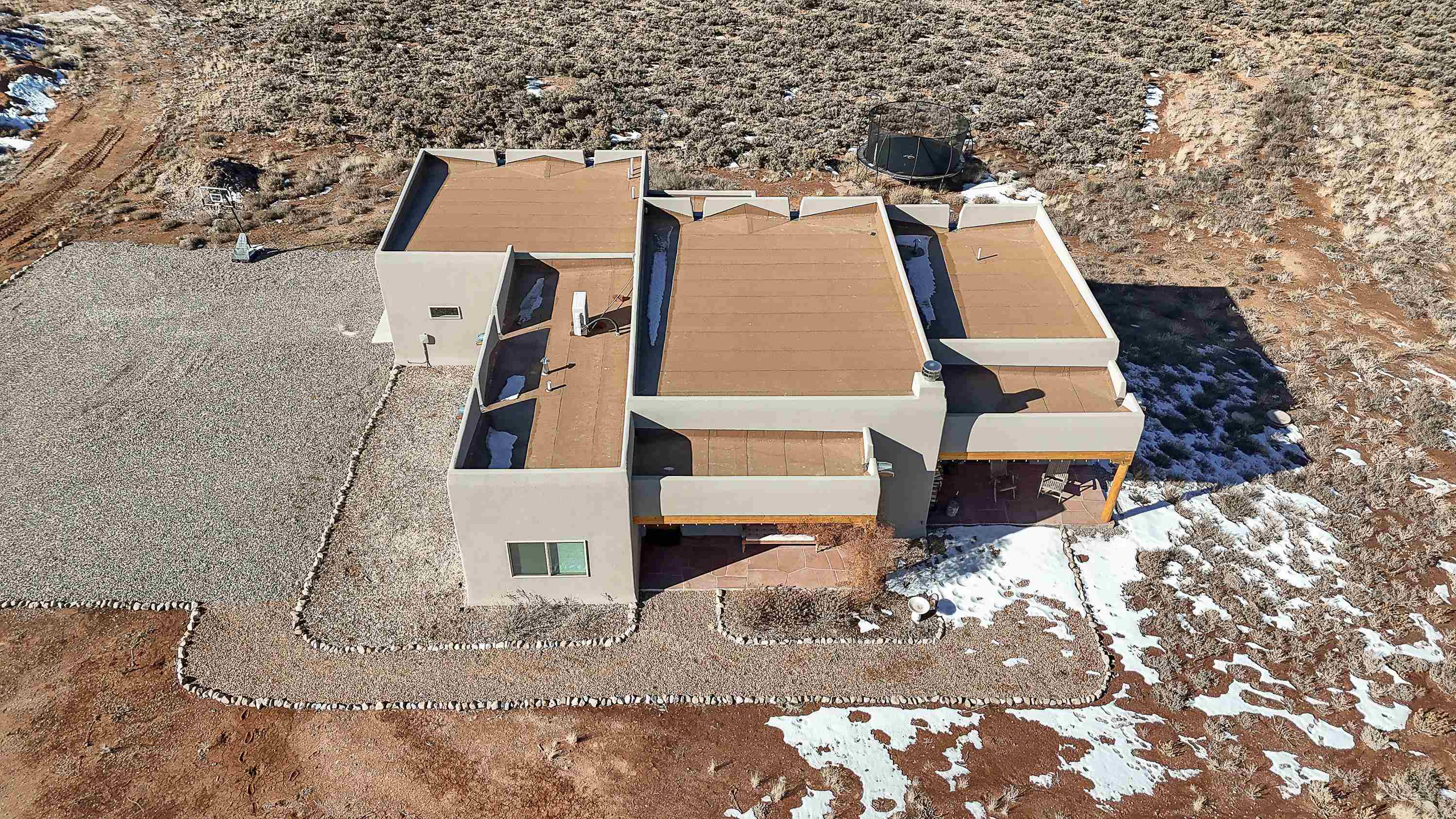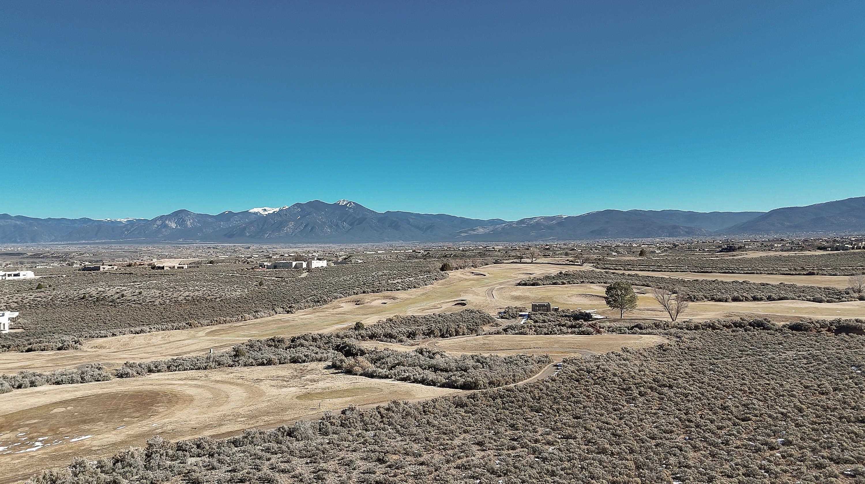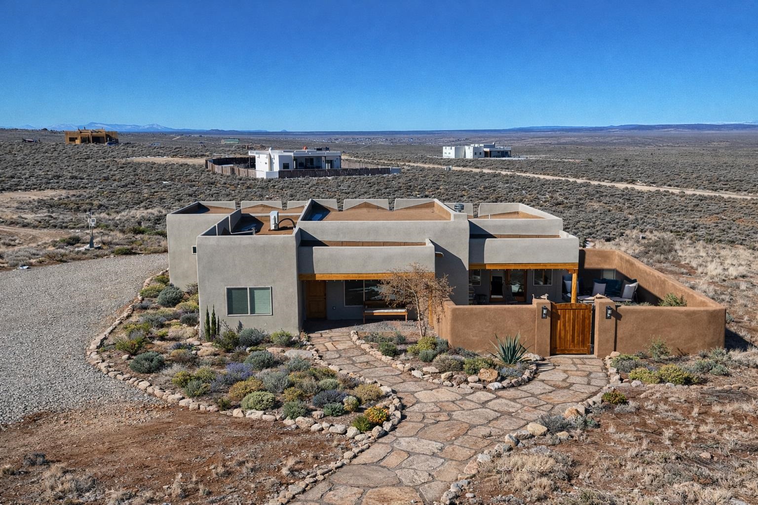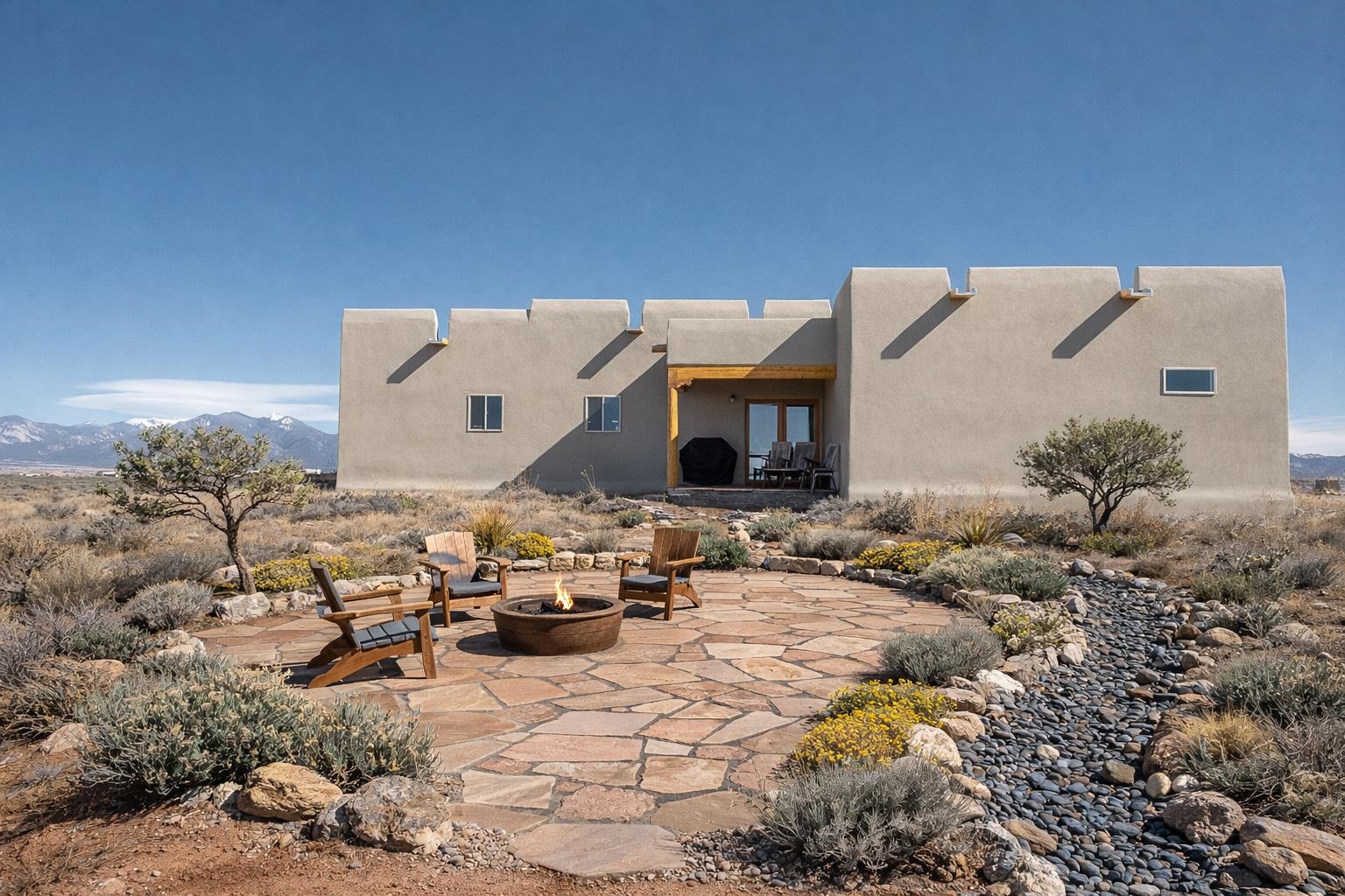 Nearly New Desert Modern | Taos Country Club Area | Completed just two years ago, this 3-bedroom, 2-bath contemporary Southwestern residence offers the rare combination of modern construction, timeless design, and iconic Sangre de Cristo views. Located near the fairways of the Taos Country Club, the home showcases clean architectural lines and a refined, high-desert aesthetic — thoughtfully designed for both comfort and elevated entertaining. A gracious split floorplan provides privacy for the primary suite, creating a serene retreat separate from guest bedrooms or workspace. The expansive great room serves as the home’s architectural centerpiece, where living, dining, and kitchen flow seamlessly with a cozy Southwest style fireplace tucked into the corner. Large vigas and a high ceiling add to the elevated feel of the principal living space. The kitchen is anchored by beautiful wood cabinetry and a substantial peninsula/bar— equally suited for intimate dinners, boozy brunches or larger gatherings. Additional highlights include: Attached heated two-car garage, mini-split to keep you cool in the summers, Paved road access for effortless year-round living, Modern systems and construction completed just two years ago, Clean, contemporary Southwestern design, Expansive views of the mountains, mesa and nearby golf course, close to hiking, biking, rafting and the town of Taos. The interior of the home is cozy and move-in ready, while the exterior awaits your creative vision. Make your outdoor space truly your own. (Some images have been virtually staged with landscaping and walled-courtyards) This stunning home feels current, intentional, and move-in ready — offering the peace of mind of newer construction paired with the beauty of one of Taos’ most desirable settings.