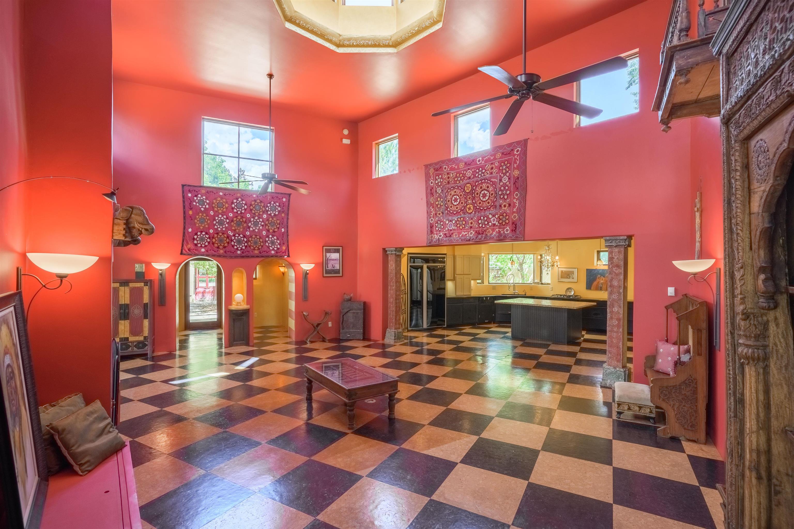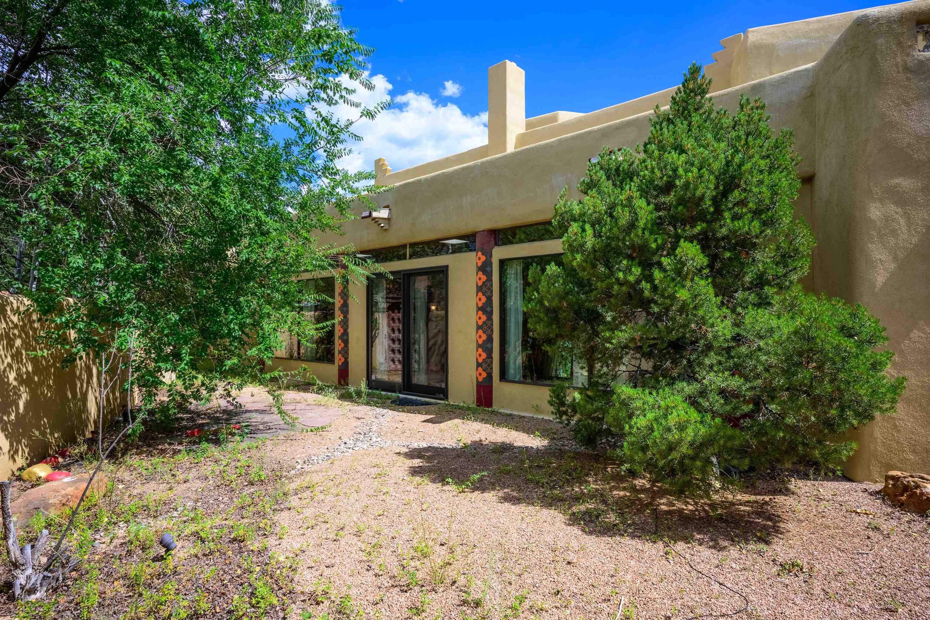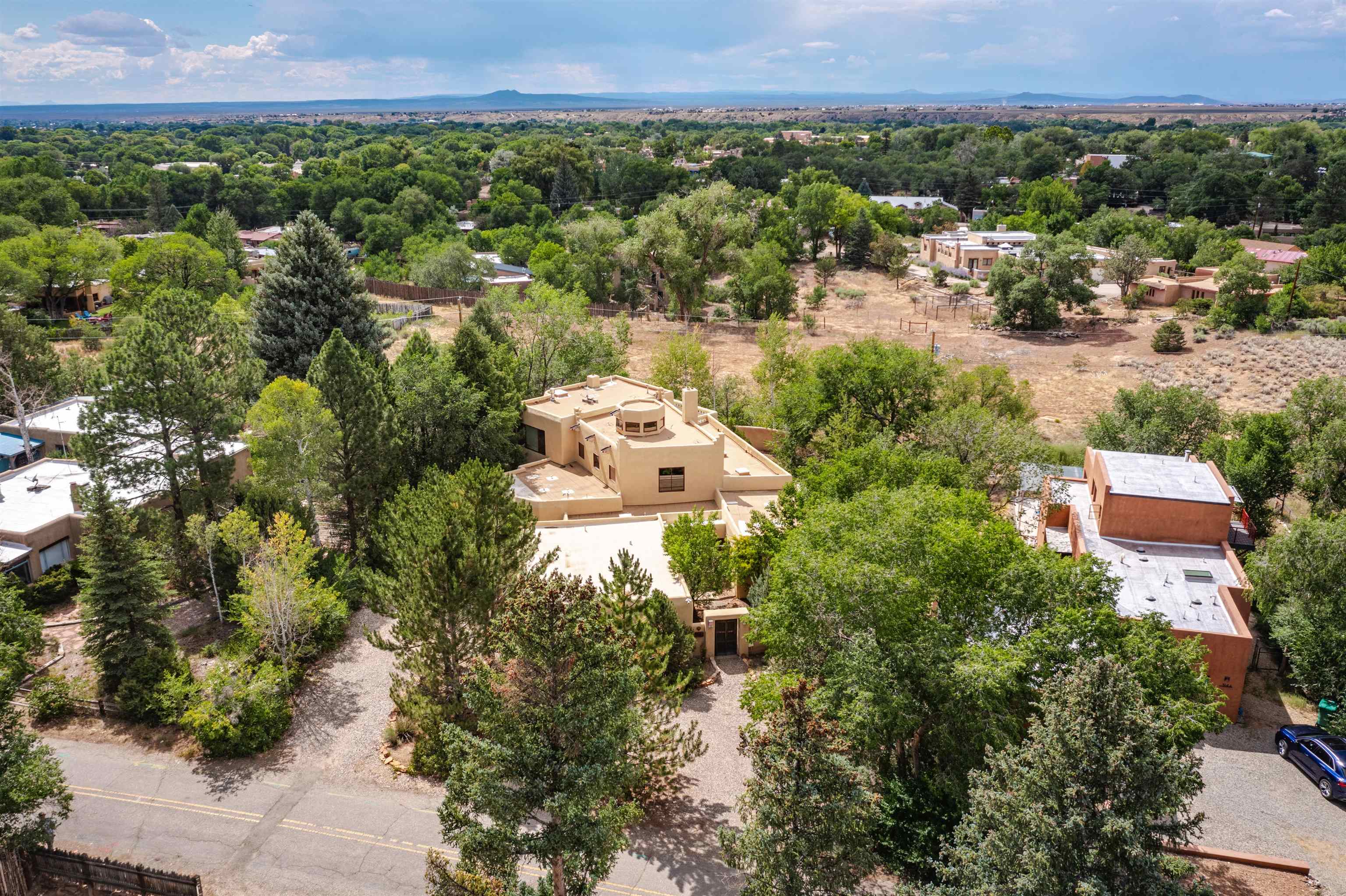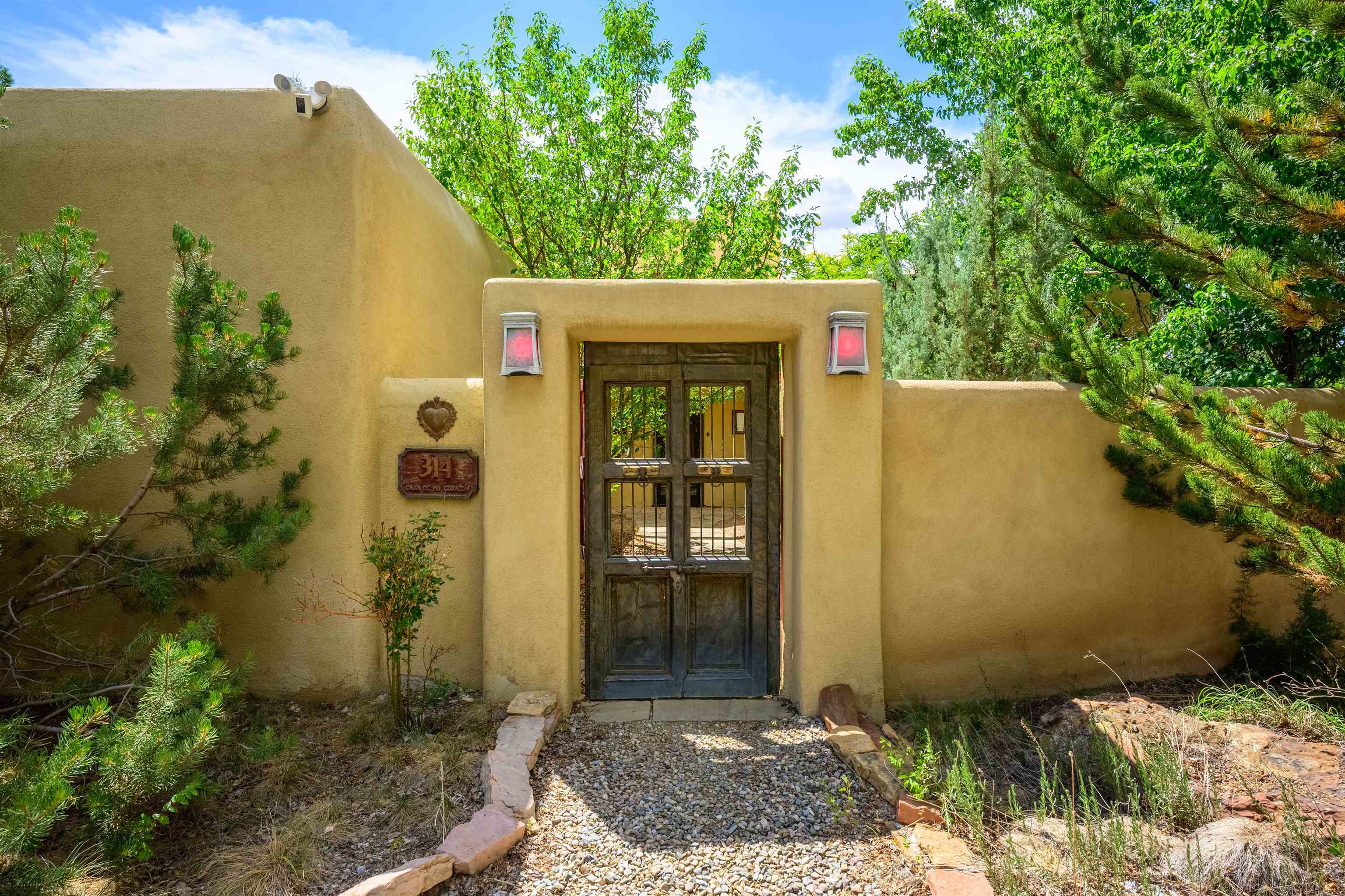WONDERFUL IN-TOWN HOME! This 3-bedroom/3.5 bath home offers something different. Creative architecture, unusual design details, Moroccan style, bold colors and many thoughtful touches make this 3,343-square foot home special. Architect designed and custom built in 2007 by Cadillac Builders (John Havener). True adobe in the Pueblo style, with three bedrooms and three full baths downstairs, an upstairs suite, and an enclosed portal. Well-appointed kitchen with two sinks, Thermidor oven, warming drawer, two dishwashers, an extra large refrigerator plus a second frig, Jenn-Air down-draft cooktop, trash compactor. A large island makes a nice place to gather and/or eat. There is a walk-through pantry between the garage and the kitchen, with ample shelving. The kitchen opens to a stunning great room, with 18-foot high ceilings, a cupola with windows, beautiful patterned cork flooring, and a fireplace. This is a great space for entertaining. Connected to the great room is an enclosed portal, with large windows facing the back courtyard, and a fireplace. The primary bedroom features a fireplace, deluxe bathroom, large walk-in closet and luxurious wool carpeting. The second bedroom has a bathroom en suite, walk-in closet and wool carpeting. The third bedroom downstairs also has an en suite bath; it was used as a music studio, and could be an office. There is an elevator that connects this bedroom to the upstairs suite. The upstairs can also be accessed by an exterior flight of stairs, and would be ideal space for a home-based business, or a study, a den, exercise room or personal retreat. It includes a half-bath, small kitchenette, built-in desk with shelves, two built-in day beds, a small balcony open to the great room below, and a roof deck. The outside spaces are enclosed in high walls for privacy. Several gorgeous antique gates connect the different courtyards. An oversized garage has multiple storage closets, a work space and a sink. This fine home is located on a 0.35-acre lot with lots of trees on Spruce Lane, one of the prettiest streets in Taos, just a short walk to Taos Plaza, the Historic District, shopping, restaurants, galleries and Kit Carson Park. The home is on Town water and sewer; there is also a shared well which can be used for irrigating gardens and trees.