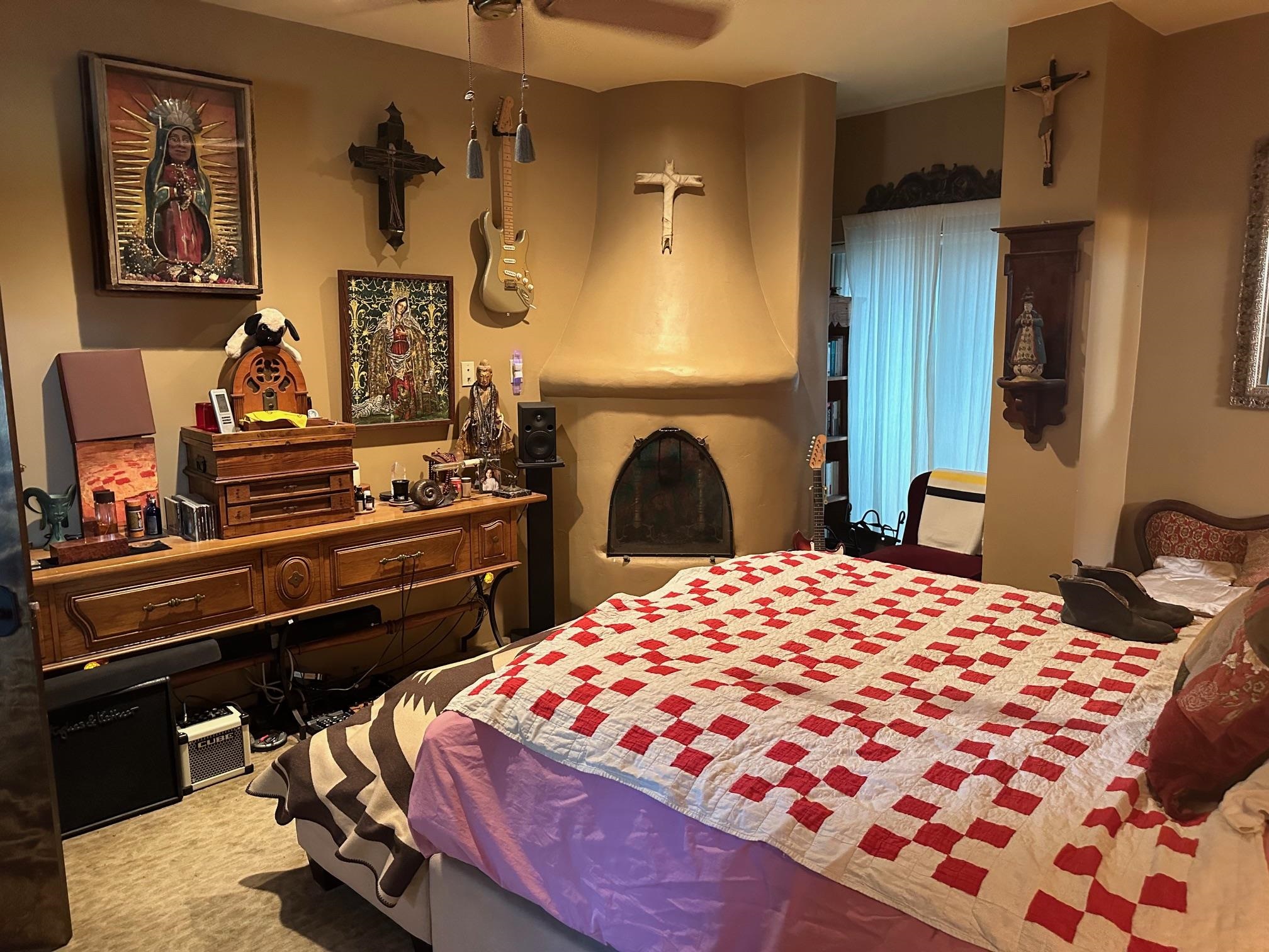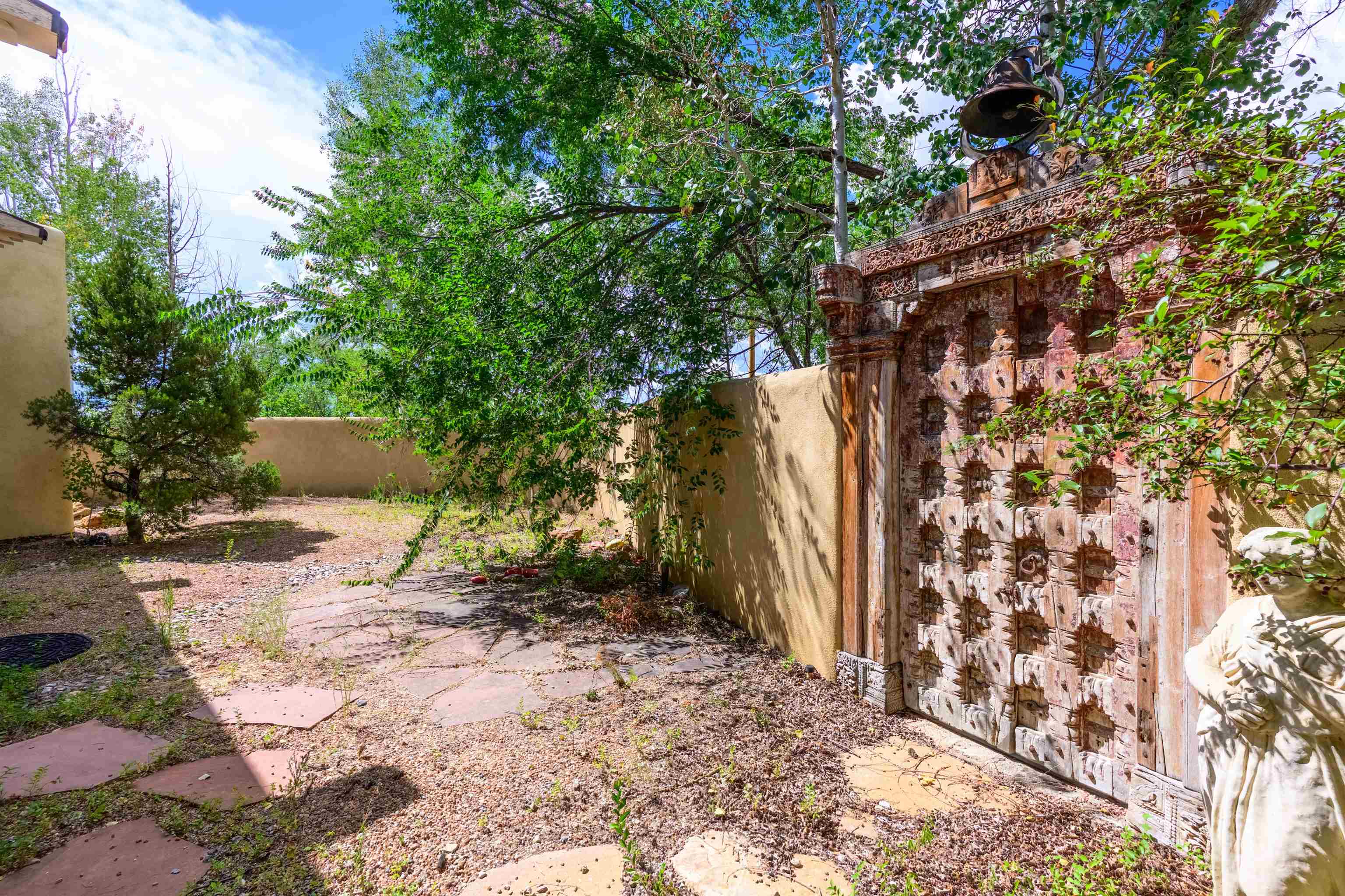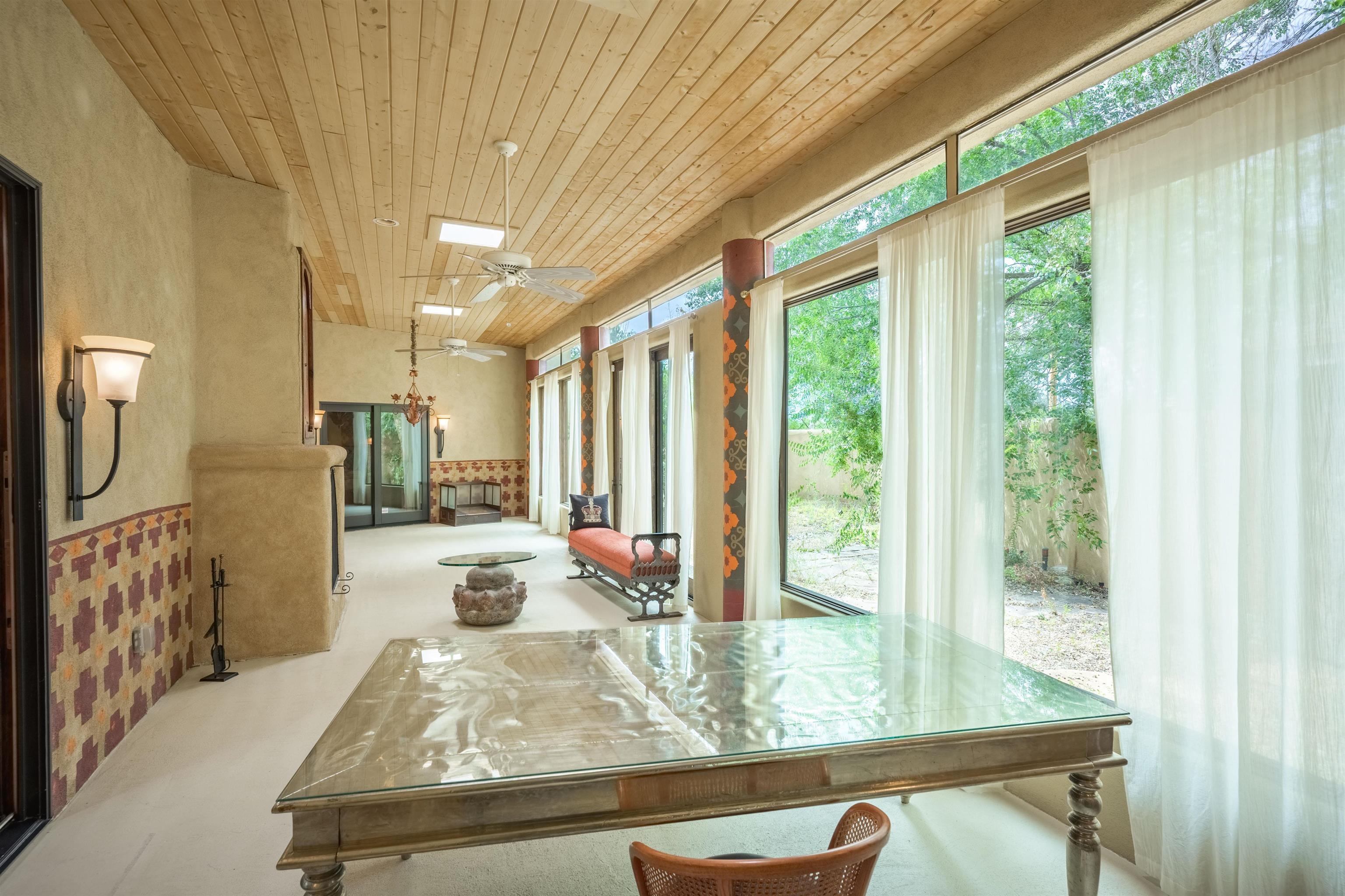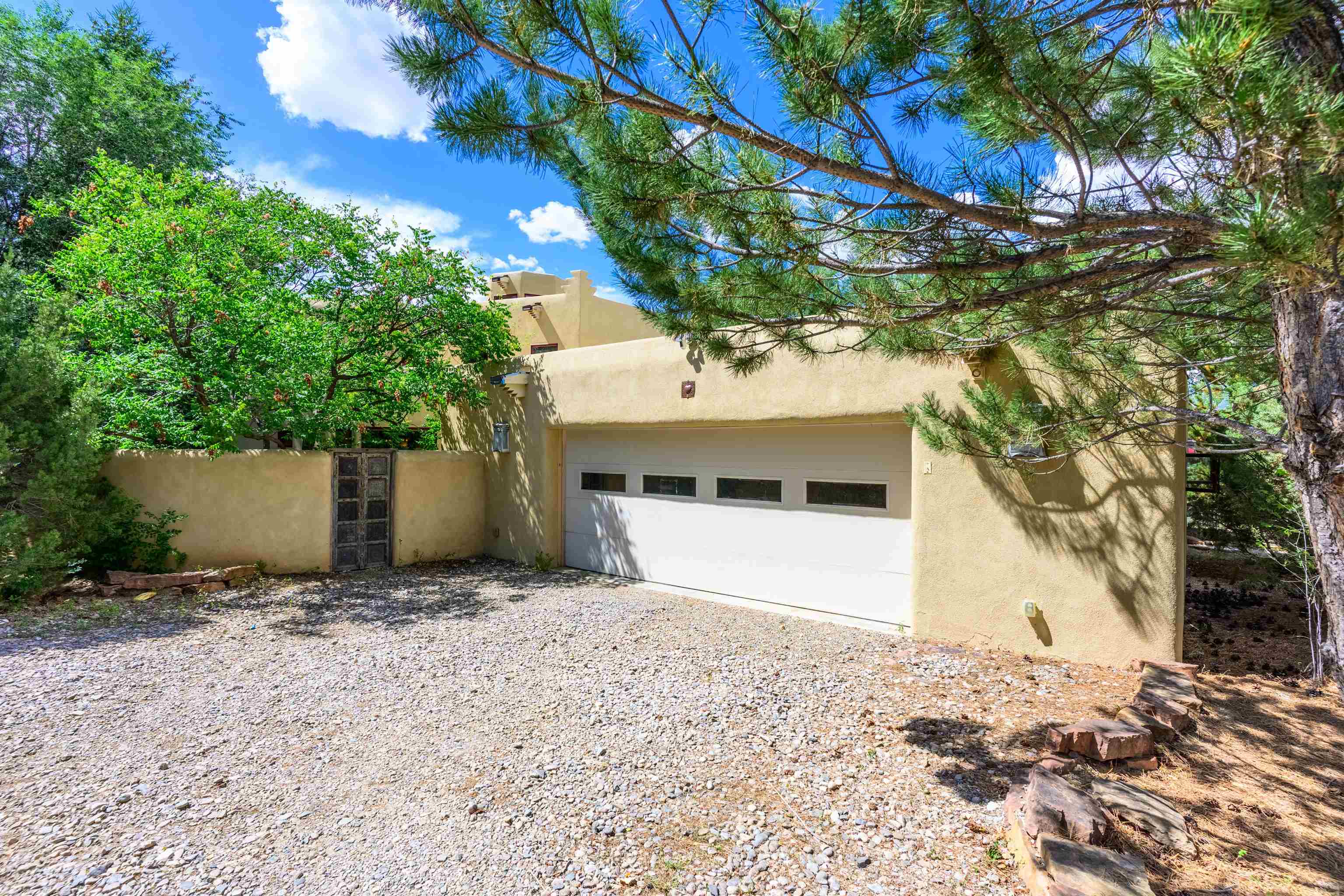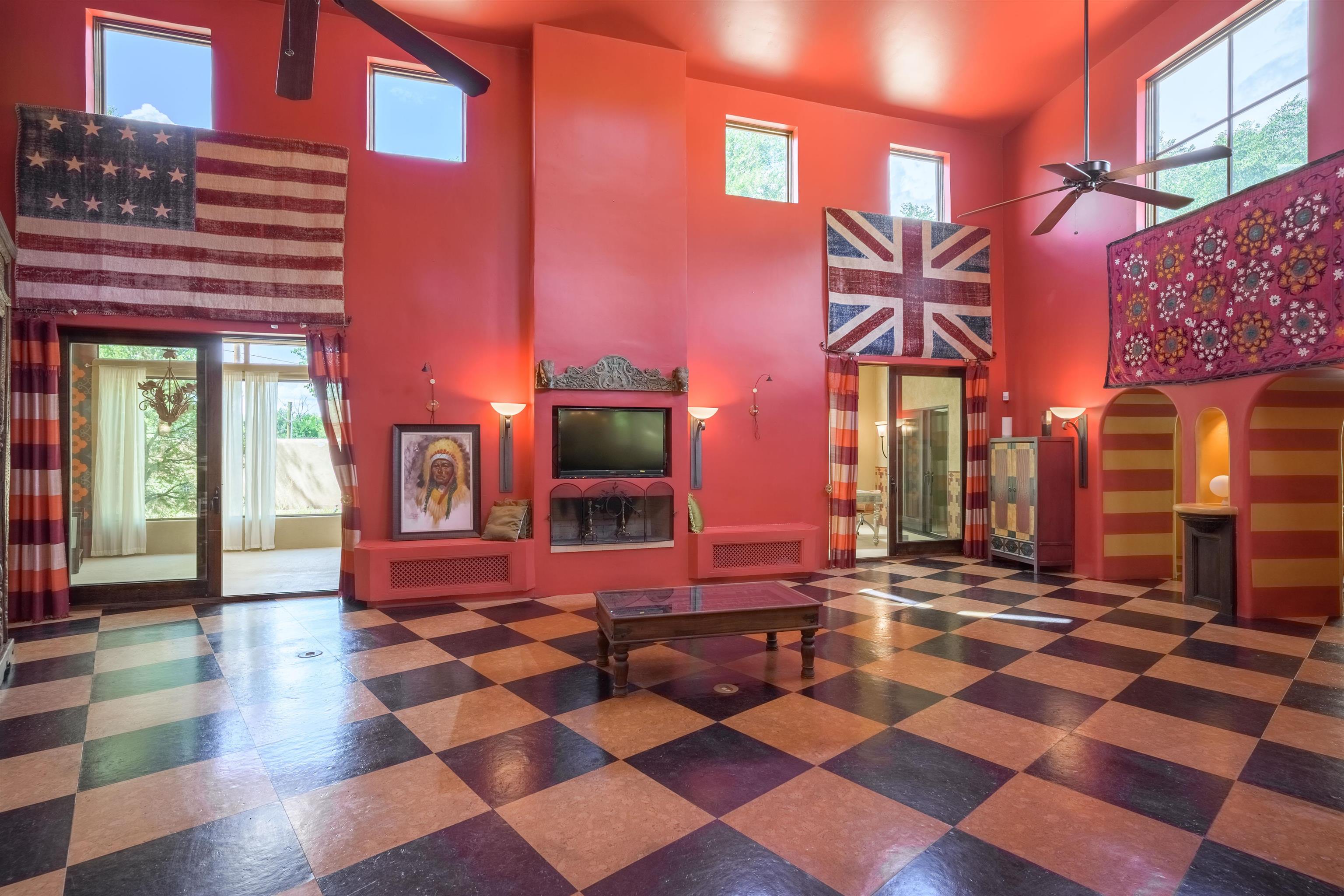 WONDERFUL IN-TOWN HOME! This 3-bedroom/3.5 bath home offers something different. Creative architecture, unusual design details, Moroccan style, bold colors and many thoughtful touches make this 3,343-square foot home special. Architect designed and custom built in 2007 by Cadillac Builders (John Havener). True adobe in the Pueblo style, with three bedrooms and three full baths downstairs, an upstairs suite, and an enclosed portal. Well-appointed kitchen with two sinks, Thermidor oven, warming drawer, two dishwashers, an extra large refrigerator plus a second frig, Jenn-Air down-draft cooktop, trash compactor. A large island makes a nice place to gather and/or eat. There is a walk-through pantry between the garage and the kitchen, with ample shelving. The kitchen opens to a stunning great room, with 18-foot high ceilings, a cupola with windows, beautiful patterned cork flooring, and a fireplace. This is a great space for entertaining. Connected to the great room is an enclosed portal, with large windows facing the back courtyard, and a fireplace. The primary bedroom features a fireplace, deluxe bathroom, large walk-in closet and luxurious wool carpeting. The second bedroom has a bathroom en suite, walk-in closet and wool carpeting. The third bedroom downstairs also has an en suite bath; it was used as a music studio, and could be an office. There is an elevator that connects this bedroom to the upstairs suite. The upstairs can also be accessed by an exterior flight of stairs, and would be ideal space for a home-based business, or a study, a den, exercise room or personal retreat. It includes a half-bath, small kitchenette, built-in desk with shelves, two built-in day beds, a small balcony open to the great room below, and a roof deck. The outside spaces are enclosed in high walls for privacy. Several gorgeous antique gates connect the different courtyards. An oversized garage has multiple storage closets, a work space and a sink. This fine home is located on a 0.35-acre lot with lots of trees on Spruce Lane, one of the prettiest streets in Taos, just a short walk to Taos Plaza, the Historic District, shopping, restaurants, galleries and Kit Carson Park. The home is on Town water and sewer; there is also a shared well which can be used for irrigating gardens and trees.