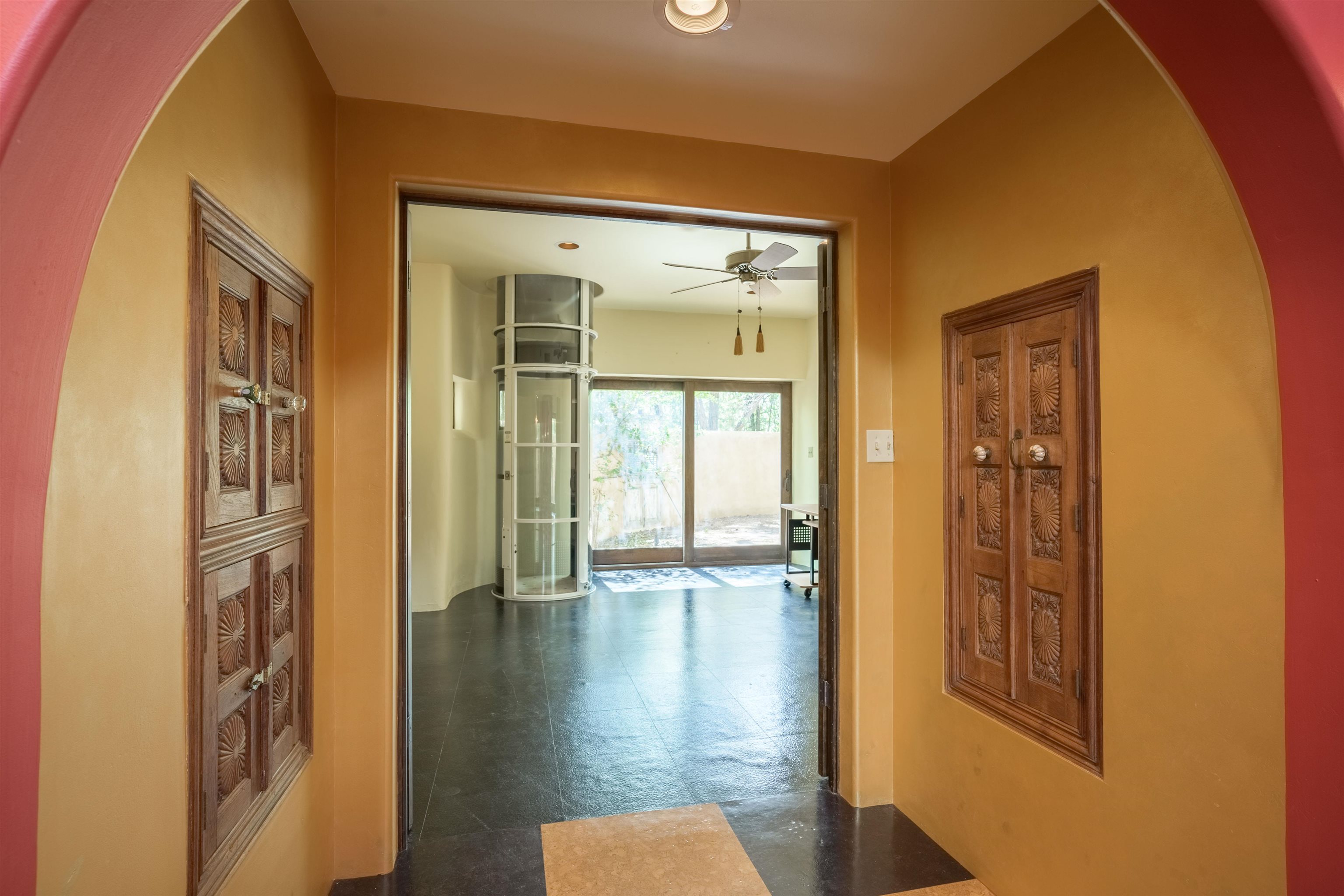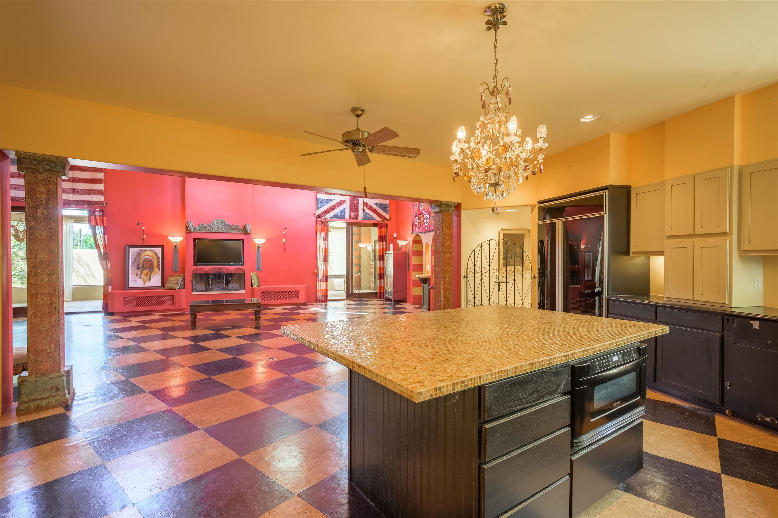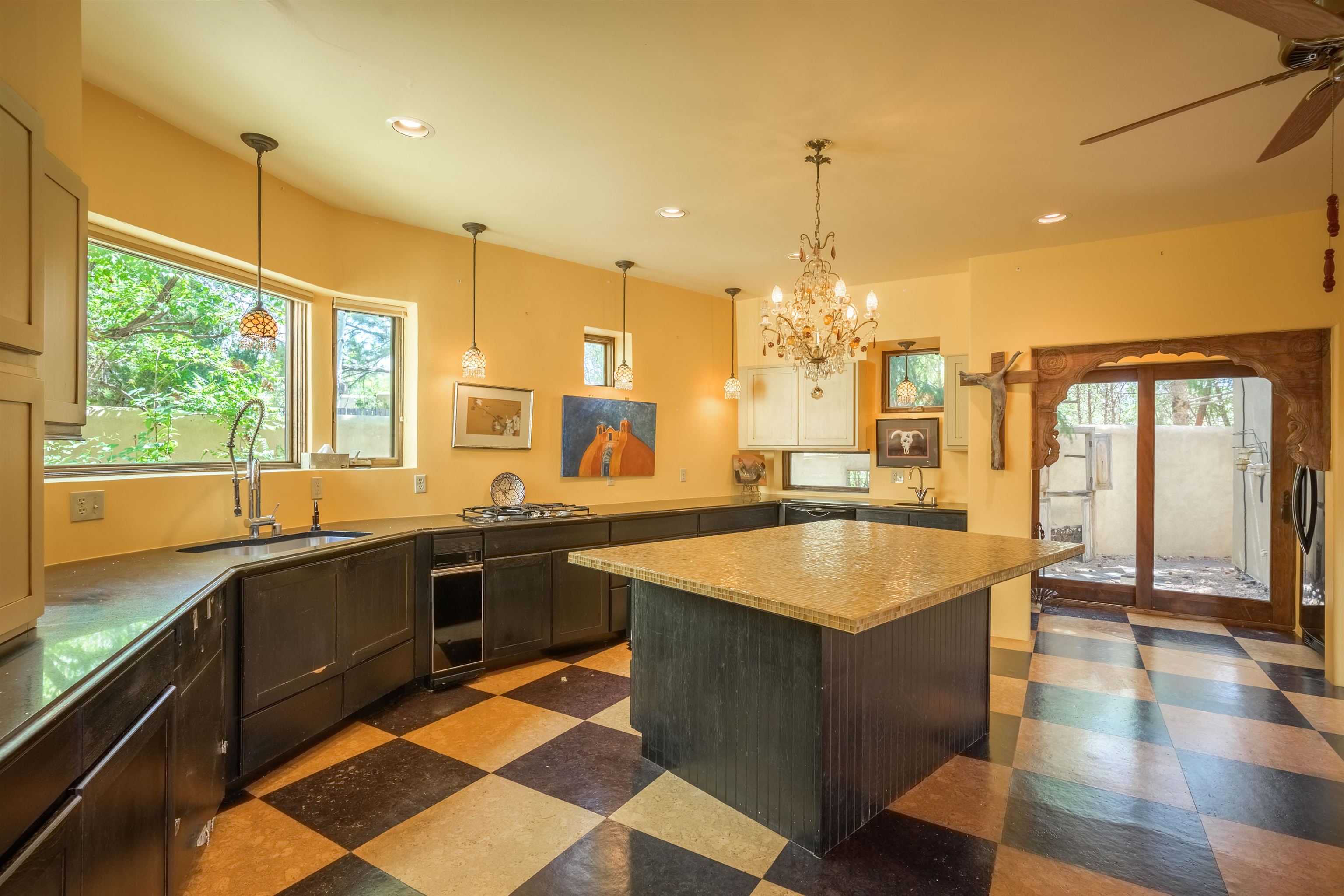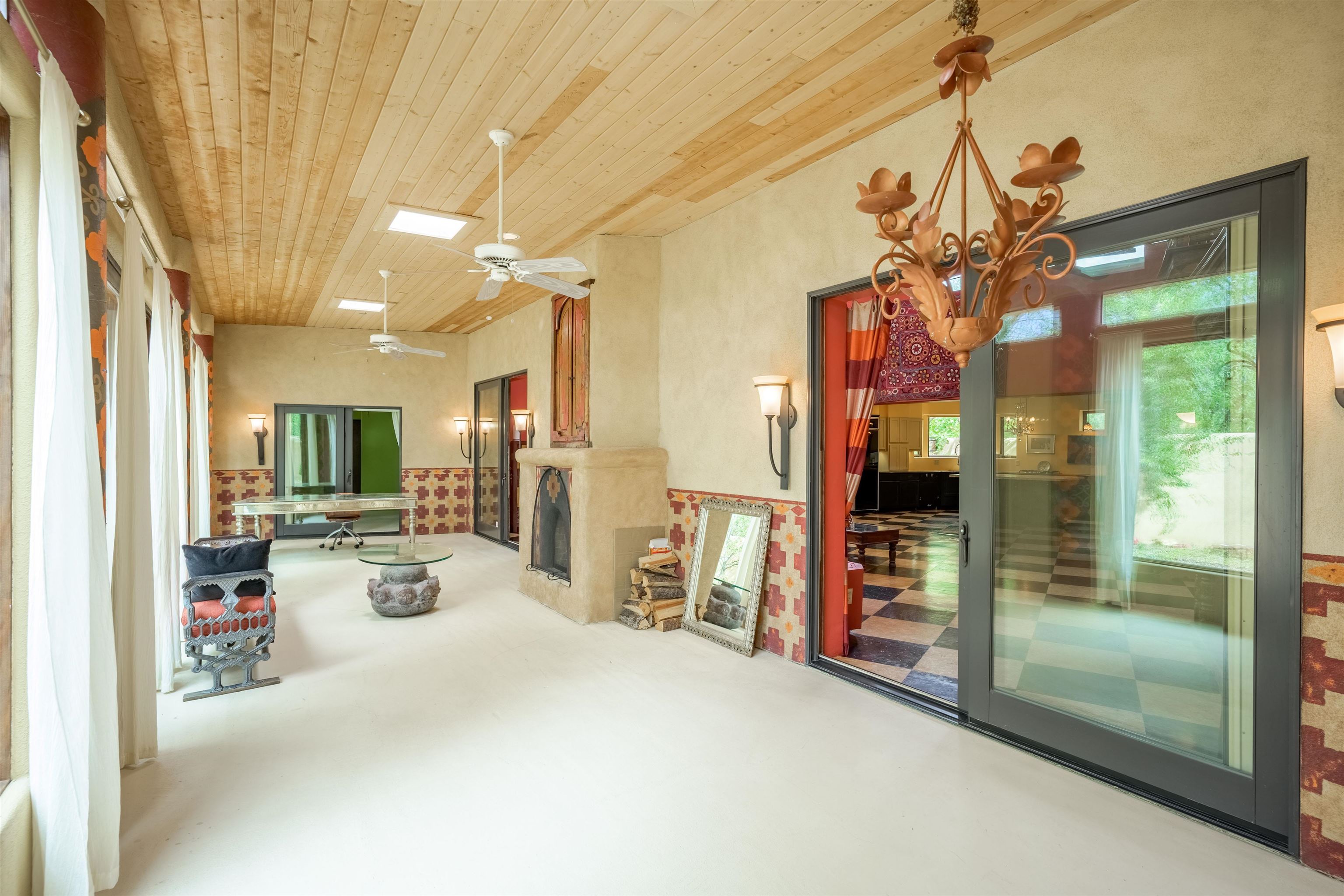 WONDERFUL IN-TOWN HOME! This 3-bedroom/3.5 bath home offers something different. Creative architecture, unusual design details, Moroccan style, bold colors and many thoughtful touches make this 3,343-square foot home special. Architect designed and custom built in 2007 by Cadillac Builders (John Havener). True adobe in the Pueblo style, with three bedrooms and three full baths downstairs, an upstairs suite, and an enclosed portal. Well-appointed kitchen with two sinks, Thermidor oven, warming drawer, two dishwashers, an extra large refrigerator plus a second frig, Jenn-Air down-draft cooktop, trash compactor. A large island makes a nice place to gather and/or eat. There is a walk-through pantry between the garage and the kitchen, with ample shelving. The kitchen opens to a stunning great room, with 18-foot high ceilings, a cupola with windows, beautiful patterned cork flooring, and a fireplace. This is a great space for entertaining. Connected to the great room is an enclosed portal, with large windows facing the back courtyard, and a fireplace. The primary bedroom features a fireplace, deluxe bathroom, large walk-in closet and luxurious wool carpeting. The second bedroom has a bathroom en suite, walk-in closet and wool carpeting. The third bedroom downstairs also has an en suite bath; it was used as a music studio, and could be an office. There is an elevator that connects this bedroom to the upstairs suite. The upstairs can also be accessed by an exterior flight of stairs, and would be ideal space for a home-based business, or a study, a den, exercise room or personal retreat. It includes a half-bath, small kitchenette, built-in desk with shelves, two built-in day beds, a small balcony open to the great room below, and a roof deck. The outside spaces are enclosed in high walls for privacy. Several gorgeous antique gates connect the different courtyards. An oversized garage has multiple storage closets, a work space and a sink. This fine home is located on a 0.35-acre lot with lots of trees on Spruce Lane, one of the prettiest streets in Taos, just a short walk to Taos Plaza, the Historic District, shopping, restaurants, galleries and Kit Carson Park. The home is on Town water and sewer; there is also a shared well which can be used for irrigating gardens and trees.