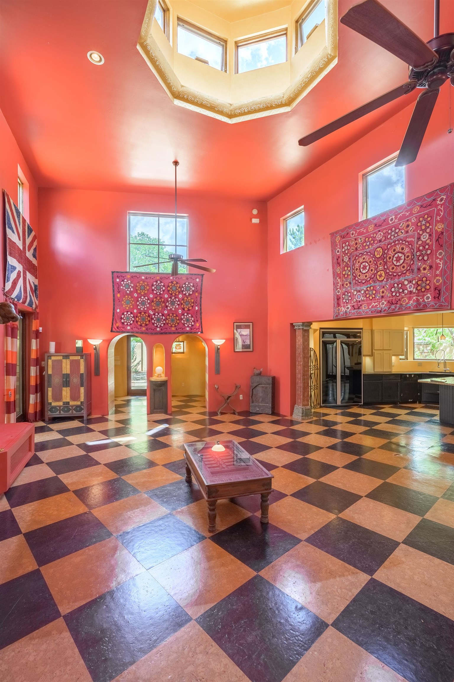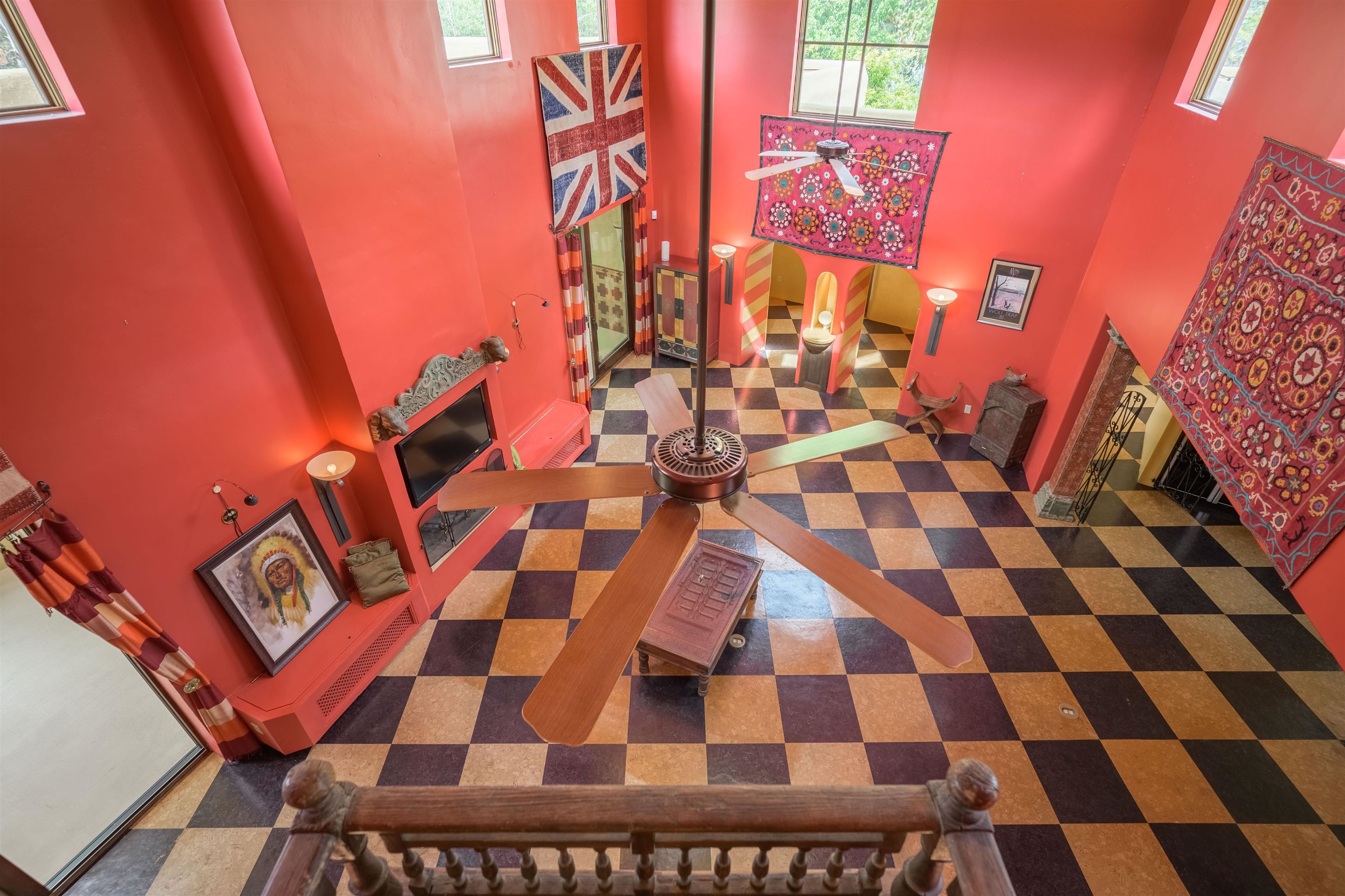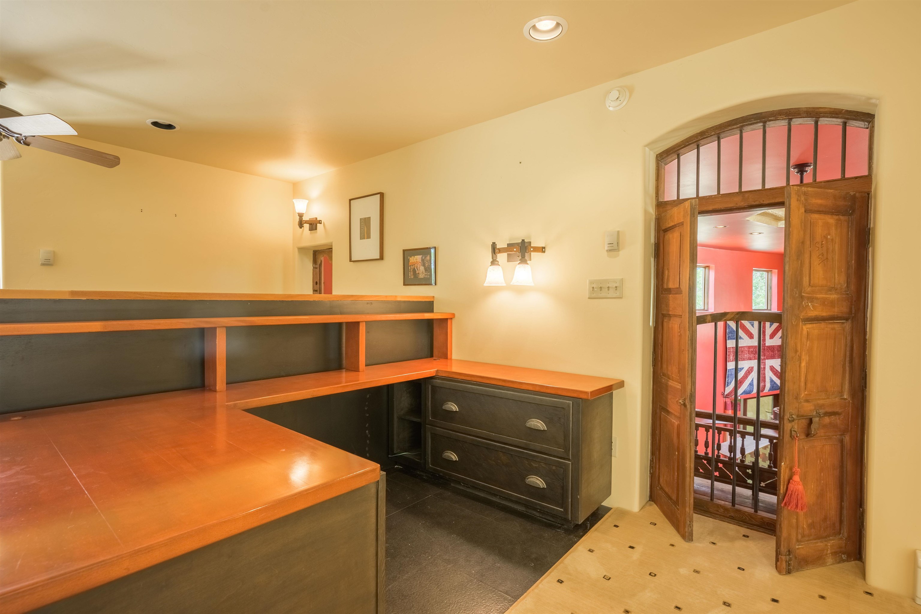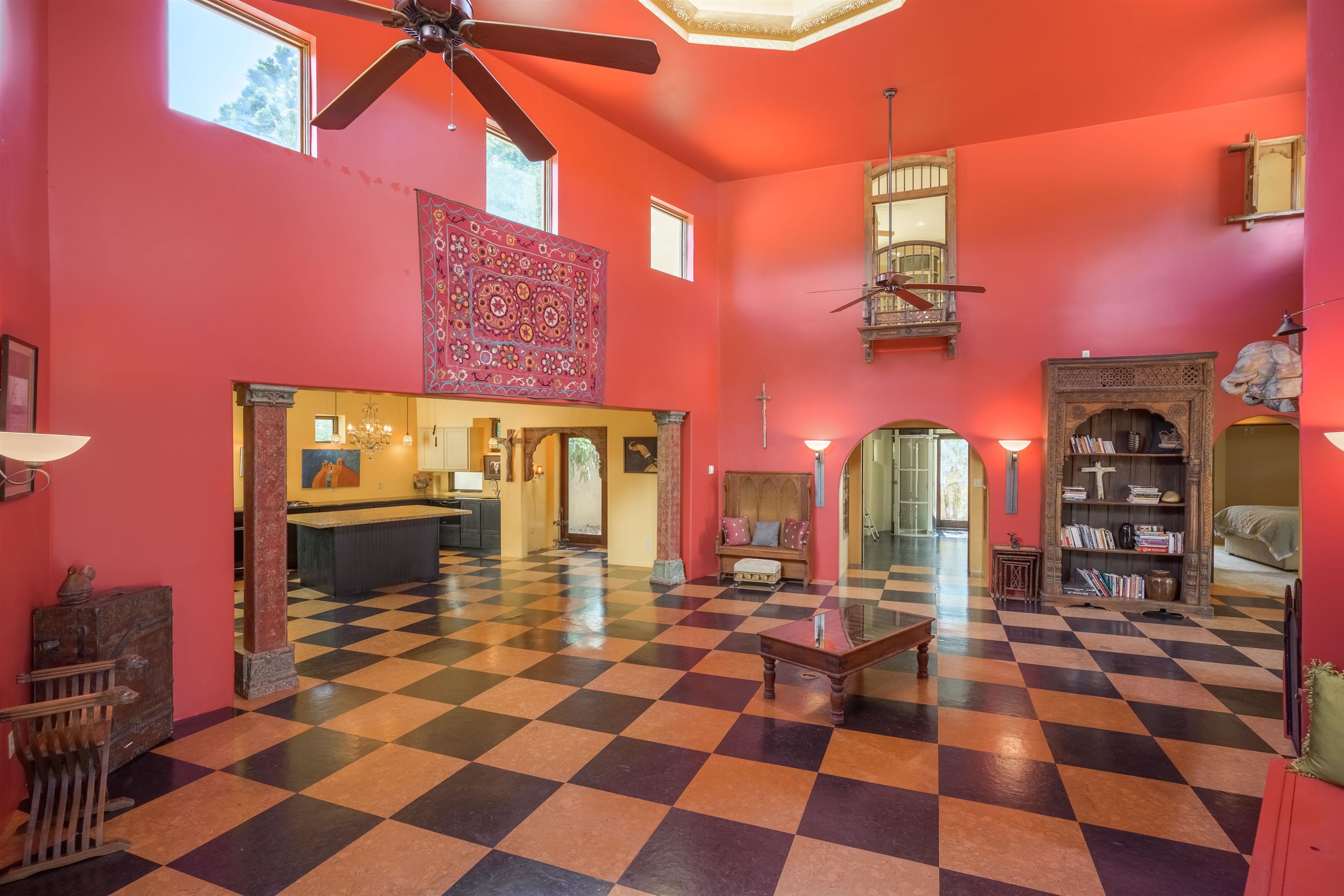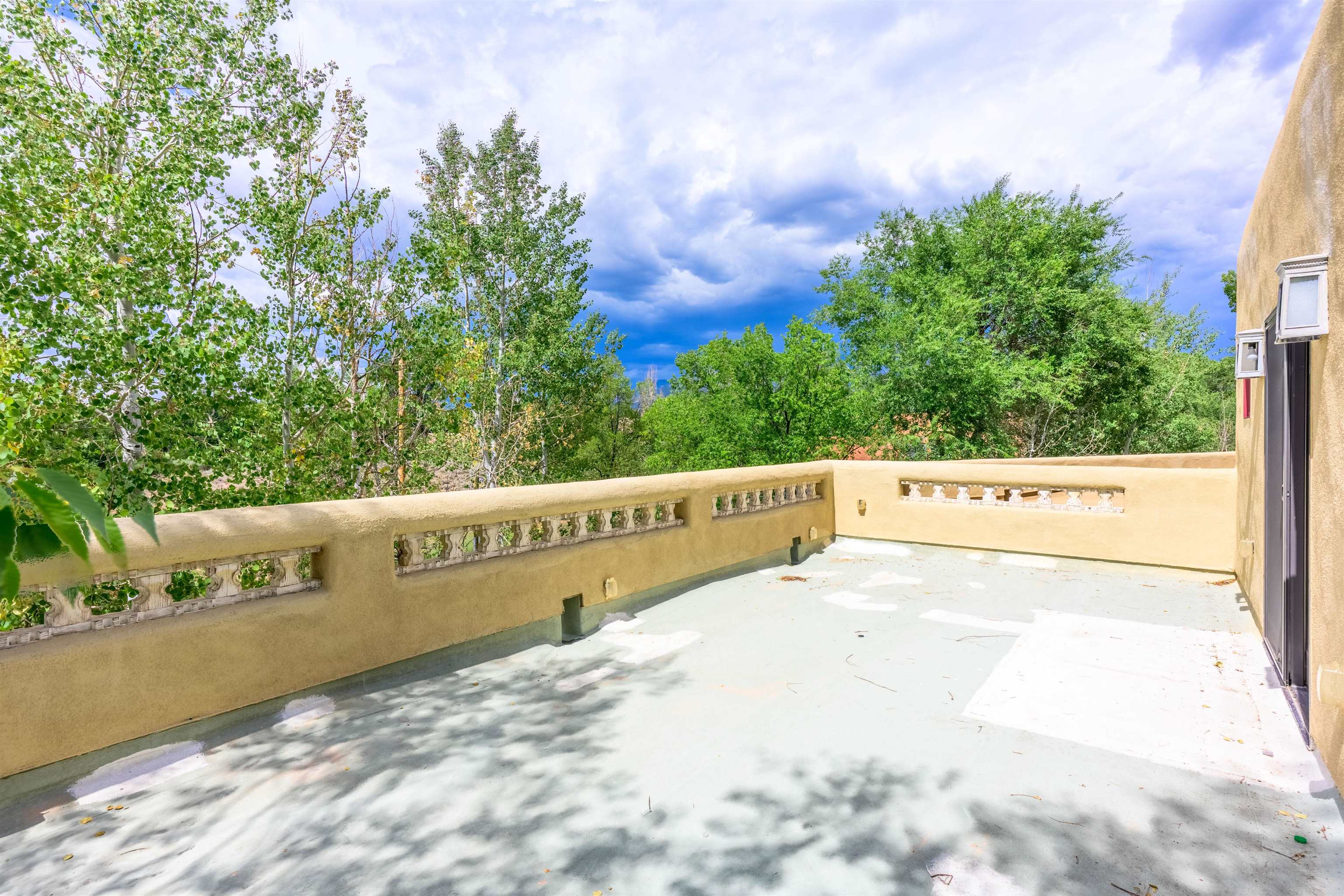 WONDERFUL IN-TOWN HOME! This 3-bedroom/3.5 bath home offers something different. Creative architecture, unusual design details, Moroccan style, bold colors and many thoughtful touches make this 3,343-square foot home special. Architect designed and custom built in 2007 by Cadillac Builders (John Havener). True adobe in the Pueblo style, with three bedrooms and three full baths downstairs, an upstairs suite, and an enclosed portal. Well-appointed kitchen with two sinks, Thermidor oven, warming drawer, two dishwashers, an extra large refrigerator plus a second frig, Jenn-Air down-draft cooktop, trash compactor. A large island makes a nice place to gather and/or eat. There is a walk-through pantry between the garage and the kitchen, with ample shelving. The kitchen opens to a stunning great room, with 18-foot high ceilings, a cupola with windows, beautiful patterned cork flooring, and a fireplace. This is a great space for entertaining. Connected to the great room is an enclosed portal, with large windows facing the back courtyard, and a fireplace. The primary bedroom features a fireplace, deluxe bathroom, large walk-in closet and luxurious wool carpeting. The second bedroom has a bathroom en suite, walk-in closet and wool carpeting. The third bedroom downstairs also has an en suite bath; it was used as a music studio, and could be an office. There is an elevator that connects this bedroom to the upstairs suite. The upstairs can also be accessed by an exterior flight of stairs, and would be ideal space for a home-based business, or a study, a den, exercise room or personal retreat. It includes a half-bath, small kitchenette, built-in desk with shelves, two built-in day beds, a small balcony open to the great room below, and a roof deck. The outside spaces are enclosed in high walls for privacy. Several gorgeous antique gates connect the different courtyards. An oversized garage has multiple storage closets, a work space and a sink. This fine home is located on a 0.35-acre lot with lots of trees on Spruce Lane, one of the prettiest streets in Taos, just a short walk to Taos Plaza, the Historic District, shopping, restaurants, galleries and Kit Carson Park. The home is on Town water and sewer; there is also a shared well which can be used for irrigating gardens and trees.