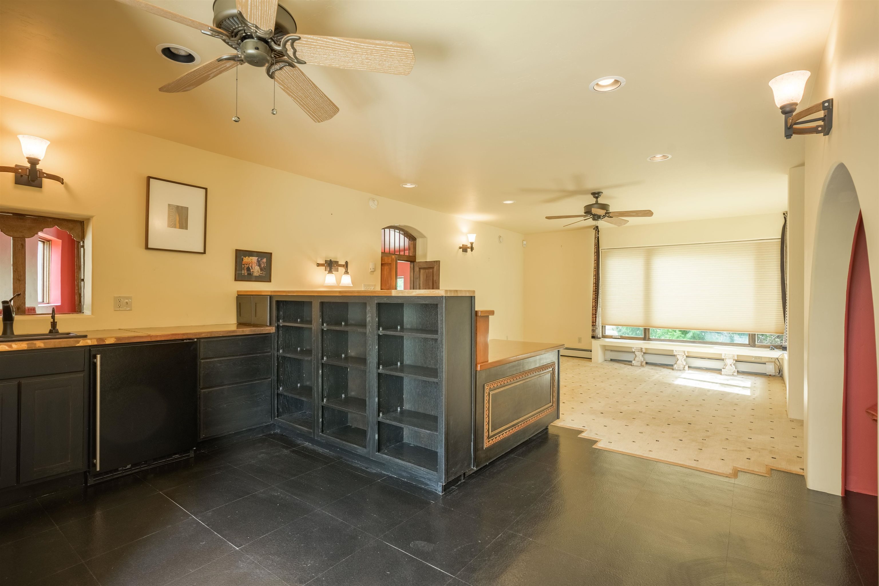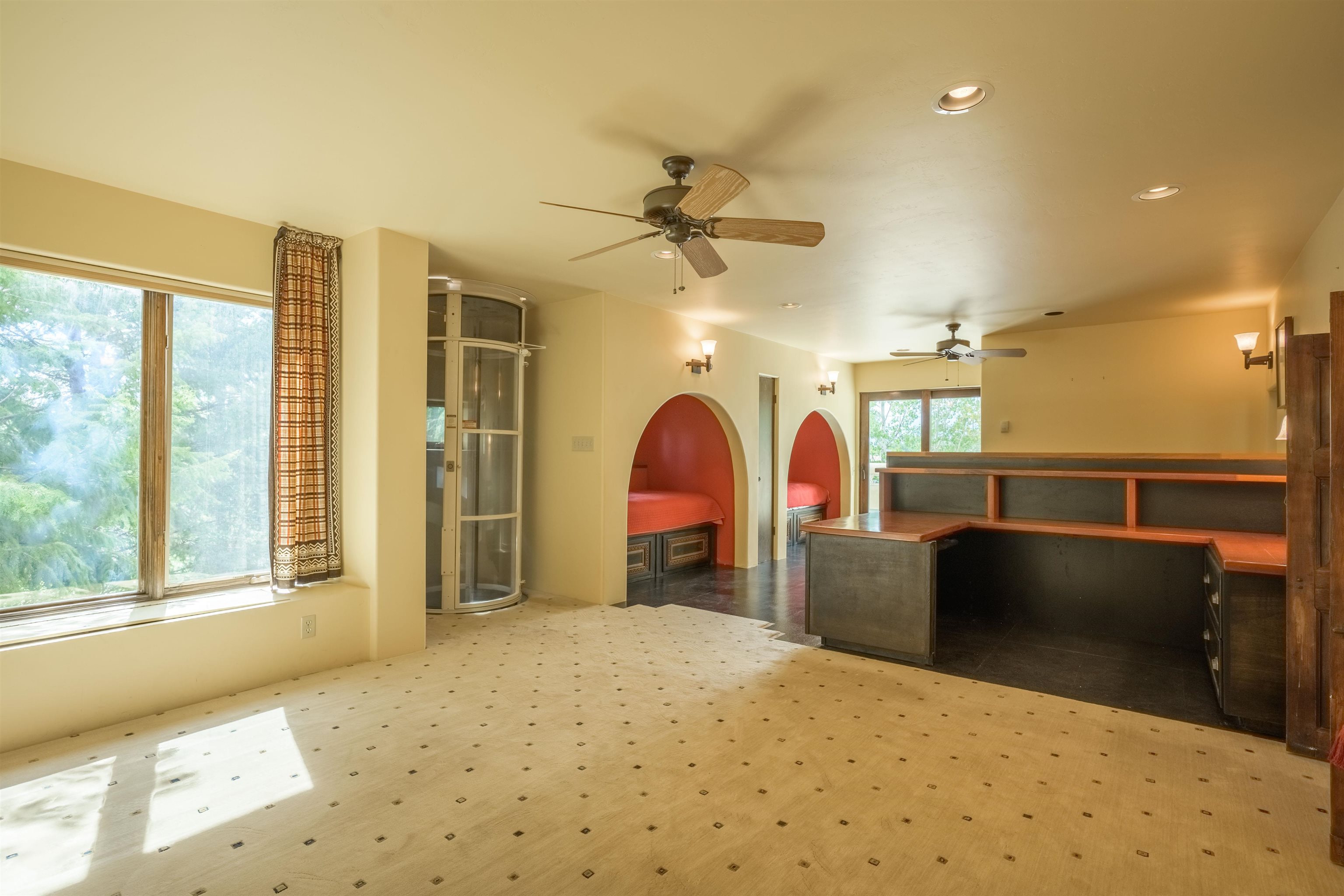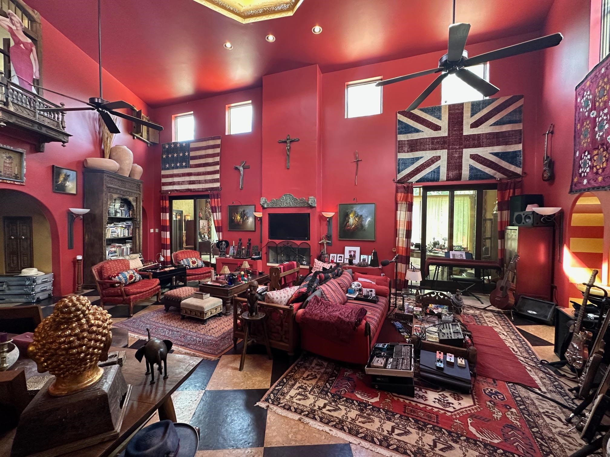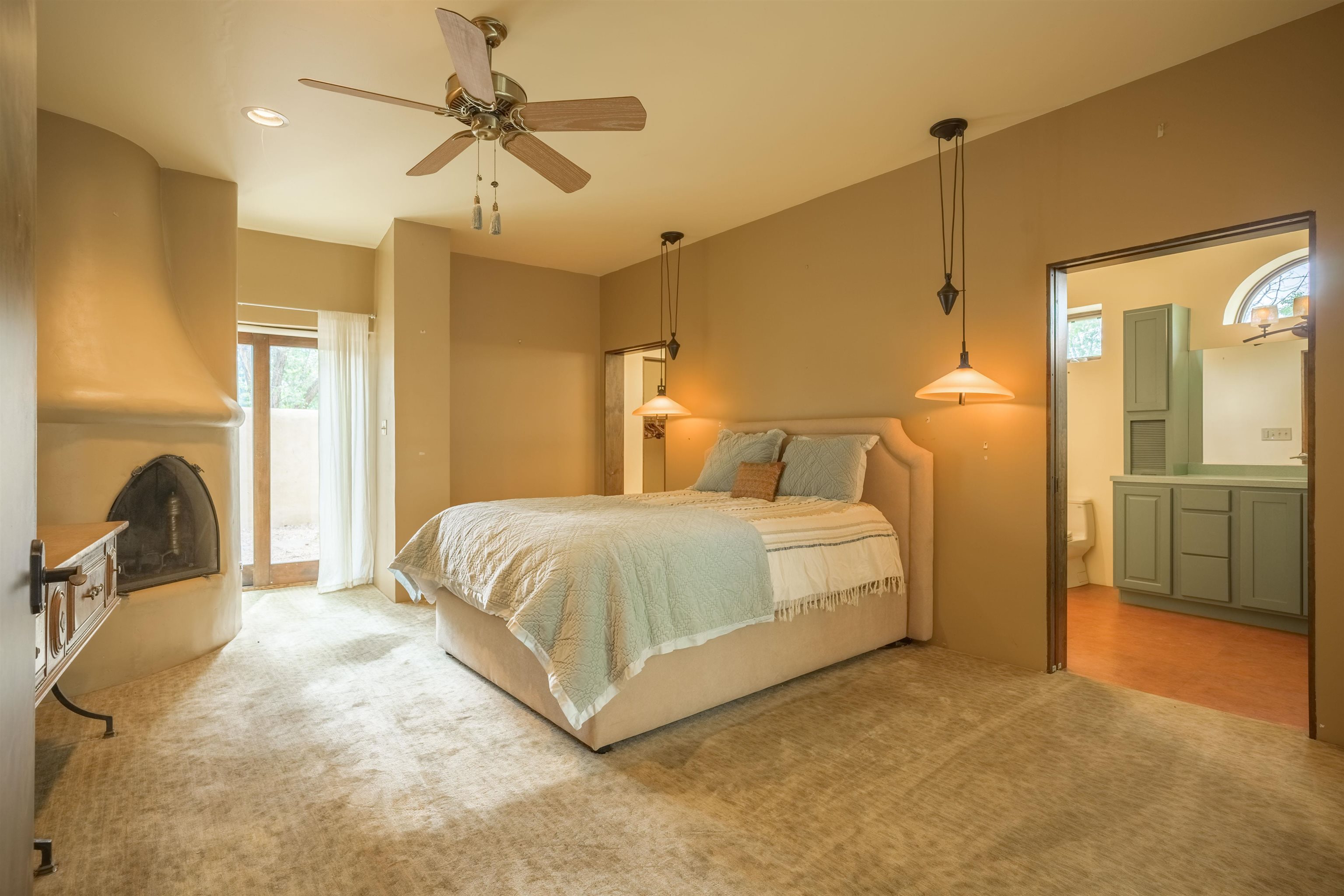 WONDERFUL IN-TOWN HOME! This 3-bedroom/3.5 bath home offers something different. Creative architecture, unusual design details, Moroccan style, bold colors and many thoughtful touches make this 3,343-square foot home special. Architect designed and custom built in 2007 by Cadillac Builders (John Havener). True adobe in the Pueblo style, with three bedrooms and three full baths downstairs, an upstairs suite, and an enclosed portal. Well-appointed kitchen with two sinks, Thermidor oven, warming drawer, two dishwashers, an extra large refrigerator plus a second frig, Jenn-Air down-draft cooktop, trash compactor. A large island makes a nice place to gather and/or eat. There is a walk-through pantry between the garage and the kitchen, with ample shelving. The kitchen opens to a stunning great room, with 18-foot high ceilings, a cupola with windows, beautiful patterned cork flooring, and a fireplace. This is a great space for entertaining. Connected to the great room is an enclosed portal, with large windows facing the back courtyard, and a fireplace. The primary bedroom features a fireplace, deluxe bathroom, large walk-in closet and luxurious wool carpeting. The second bedroom has a bathroom en suite, walk-in closet and wool carpeting. The third bedroom downstairs also has an en suite bath; it was used as a music studio, and could be an office. There is an elevator that connects this bedroom to the upstairs suite. The upstairs can also be accessed by an exterior flight of stairs, and would be ideal space for a home-based business, or a study, a den, exercise room or personal retreat. It includes a half-bath, small kitchenette, built-in desk with shelves, two built-in day beds, a small balcony open to the great room below, and a roof deck. The outside spaces are enclosed in high walls for privacy. Several gorgeous antique gates connect the different courtyards. An oversized garage has multiple storage closets, a work space and a sink. This fine home is located on a 0.35-acre lot with lots of trees on Spruce Lane, one of the prettiest streets in Taos, just a short walk to Taos Plaza, the Historic District, shopping, restaurants, galleries and Kit Carson Park. The home is on Town water and sewer; there is also a shared well which can be used for irrigating gardens and trees.