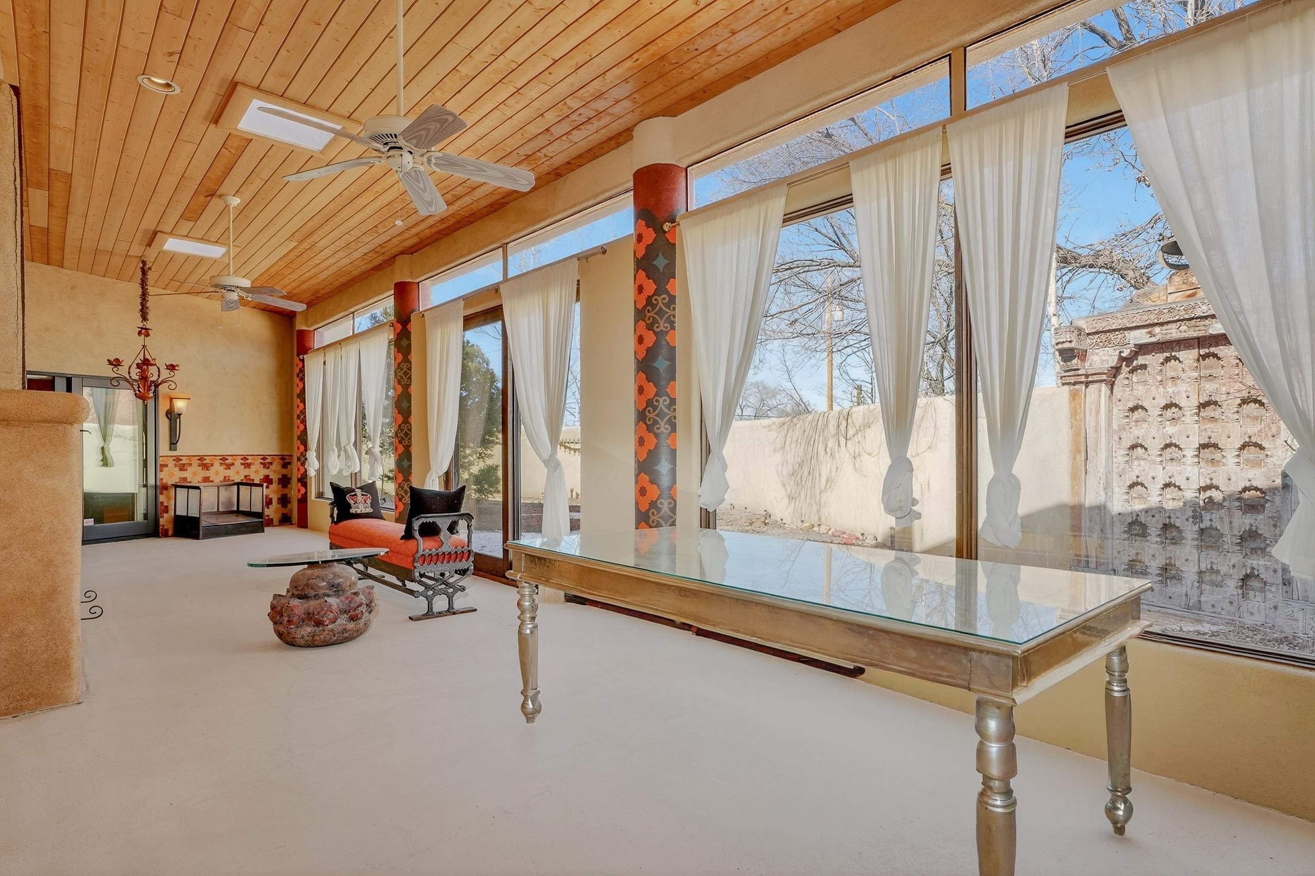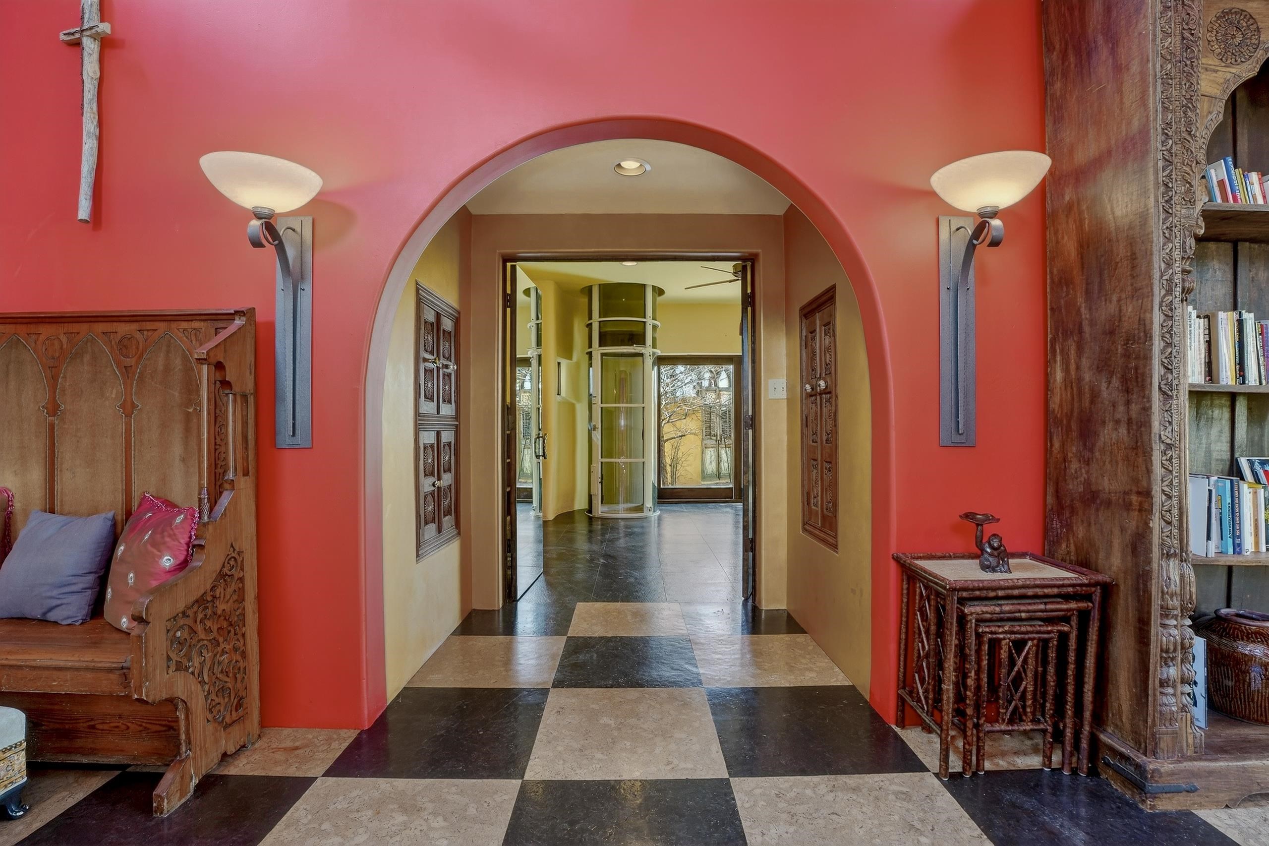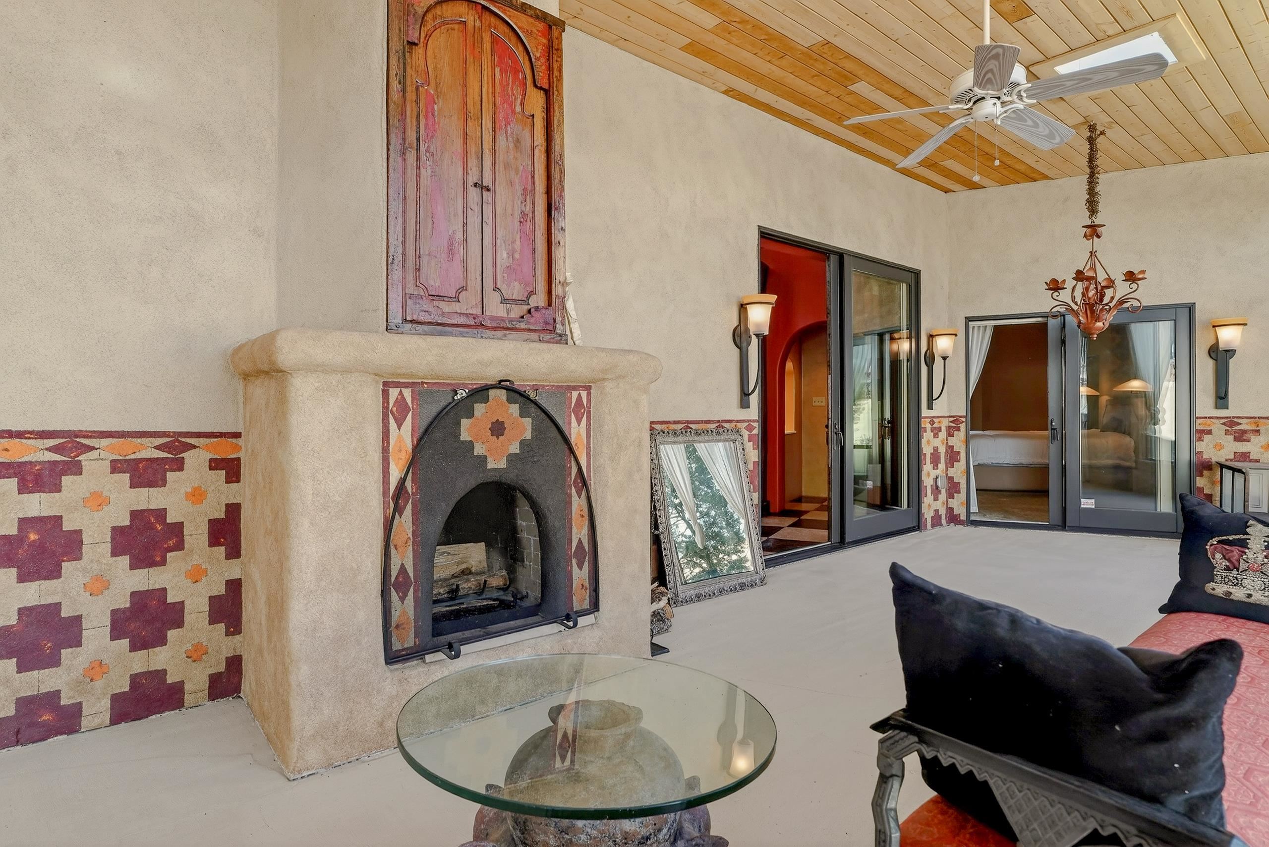 Artful. Inviting. Unexpected. This 3 bedroom, 3.5 bath ensuite residence offers rare privacy in an ideal in-town setting with breathtaking Taos Mountain views. Designed for gathering, the home features a gourmet kitchen, expansive entertaining spaces, and a dramatic enclosed bonus room with fireplace ideal for dining or serene retreat. Whimsical color palettes celebrate the home’s creative spirit, while available architectural plans demonstrate an easy transition to a more traditional floorplan if desired. Moorish-inspired details add texture and warmth throughout. A private single-person elevator connects levels — a distinctive and practical amenity rarely found in Taos homes. Quiet location. Mountain views. Endless potential.