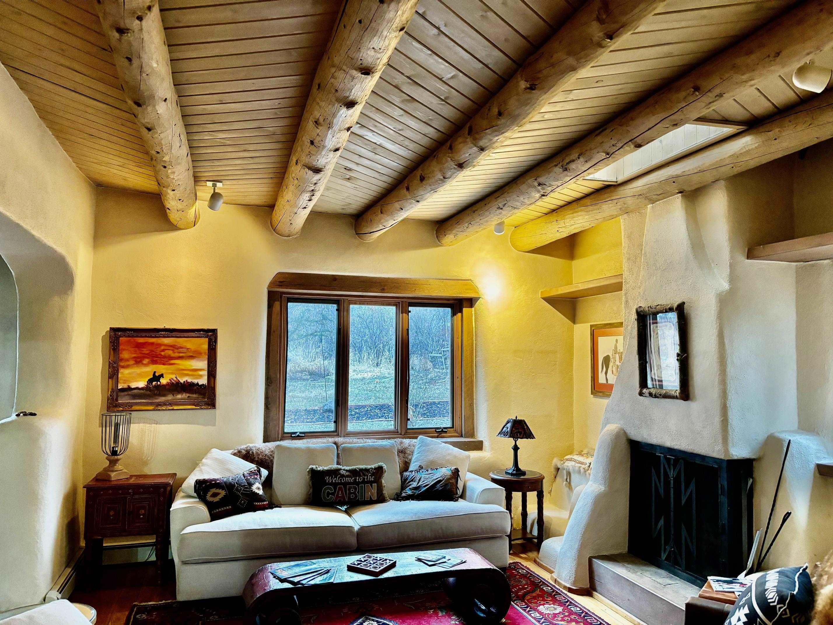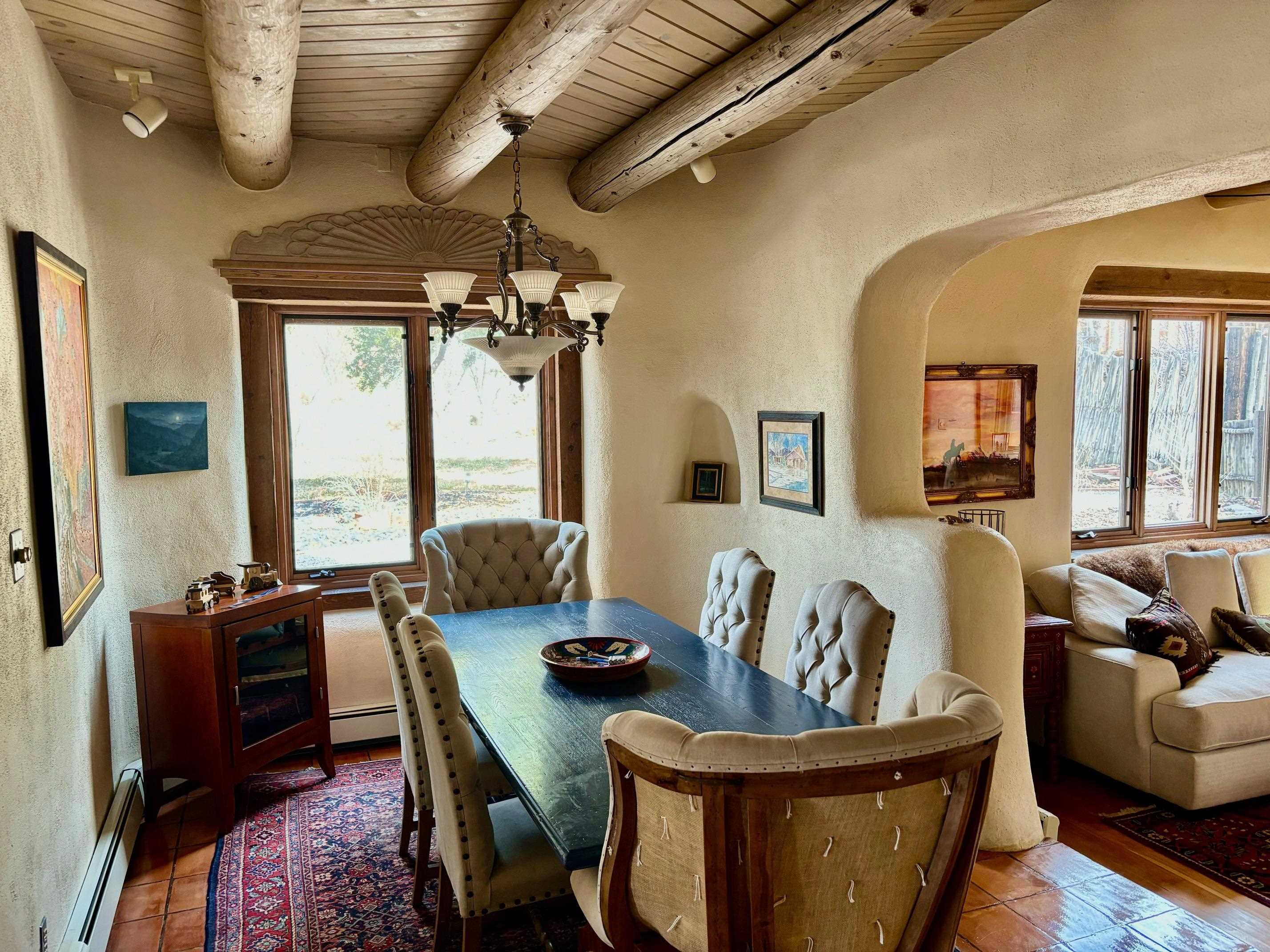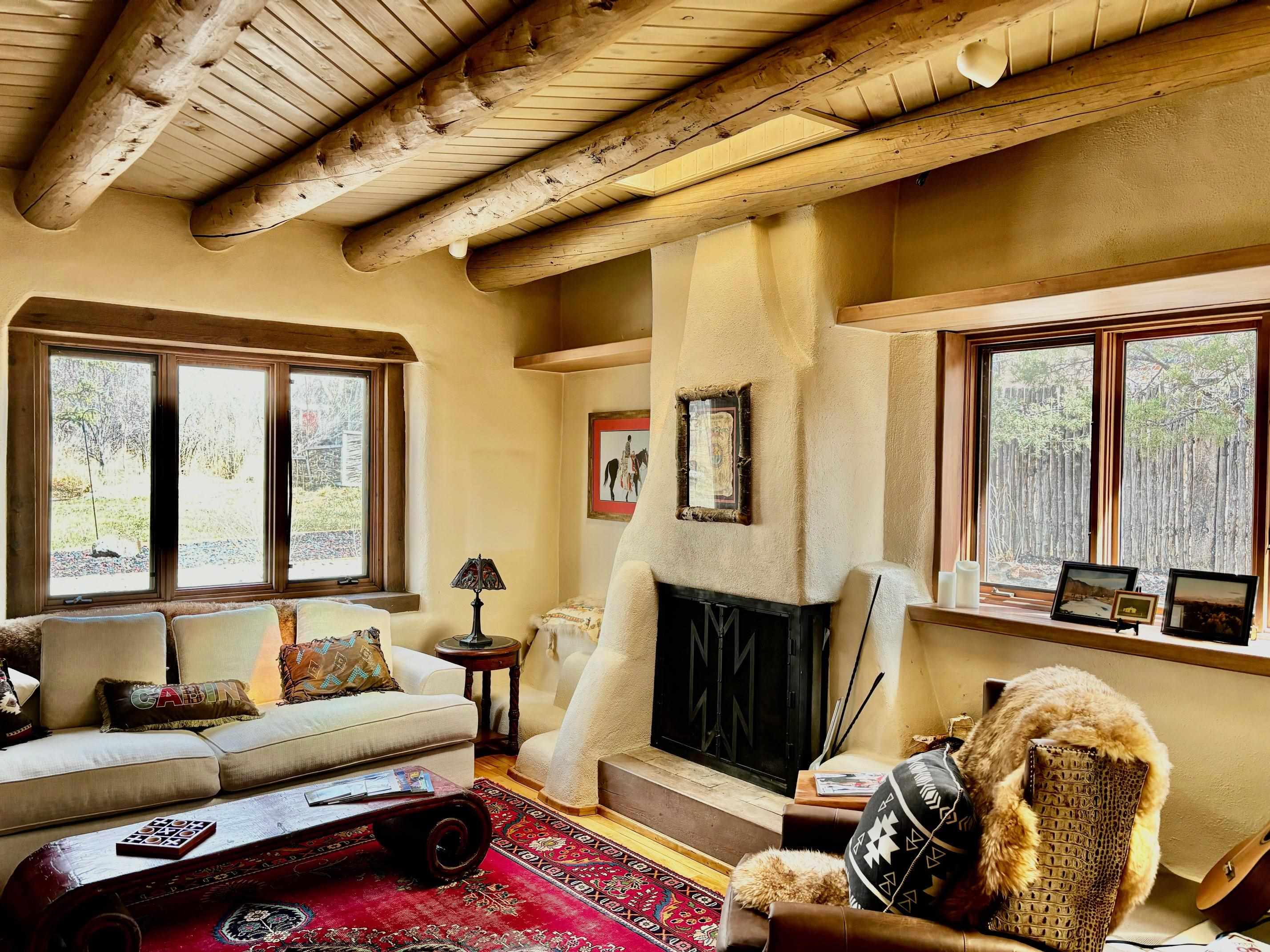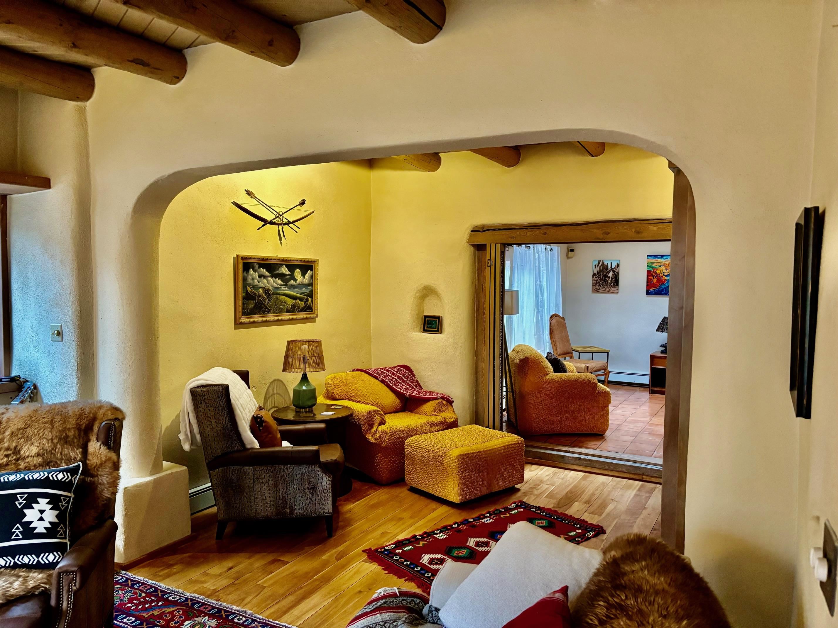 Authentic adobe house located near the historic Taos Plaza and Monte Sagrado. Located at the back end of Spruce Lane, a very quiet and secluded area. The adobe walls are thick. Features three bedrooms and two bathrooms. Two-story house. Features vigas throughout the house with tongue and grove wood. Floors feature wood and tile downstairs and carpet upstairs. The kitchen is large and features stainless steel appliances, built-in wine rack and white cabinets. The house has a formal dining room, and living room. One bedroom is downstairs and two bedrooms are upstairs. Washer and dryer are included. The house also features three fireplaces located in the living room, downstairs bedroom, and primary bedroom upstairs. The primary bedroom is cozy and double doors lead to a gorgeous sun room; plenty of windows and natural light. This room can be used in many different ways. The primary bedroom has a mini-split system for instant heating and air conditioning. The house has several multiple, large skylights. All this house is spread out over 2,188 square feet. The outside has superb landscaping including many trees, grass, flagstone patios and of course a free standing hot tub. This house is indeed a rare find. Come and see it. The square footage is not guaranteed by the seller or the broker so if this is of importance to the buyer then the buyer shall have the house measured by an expert.