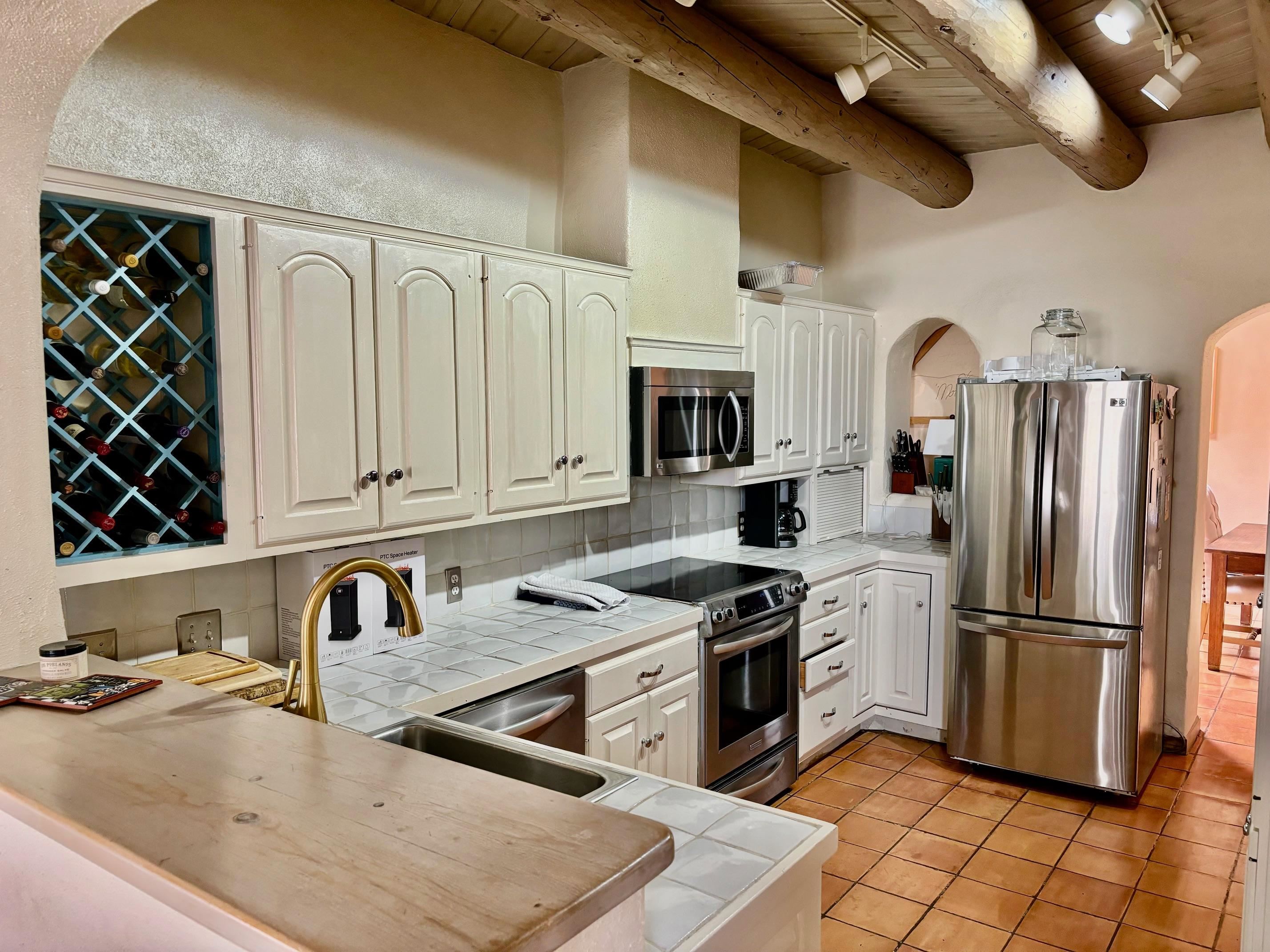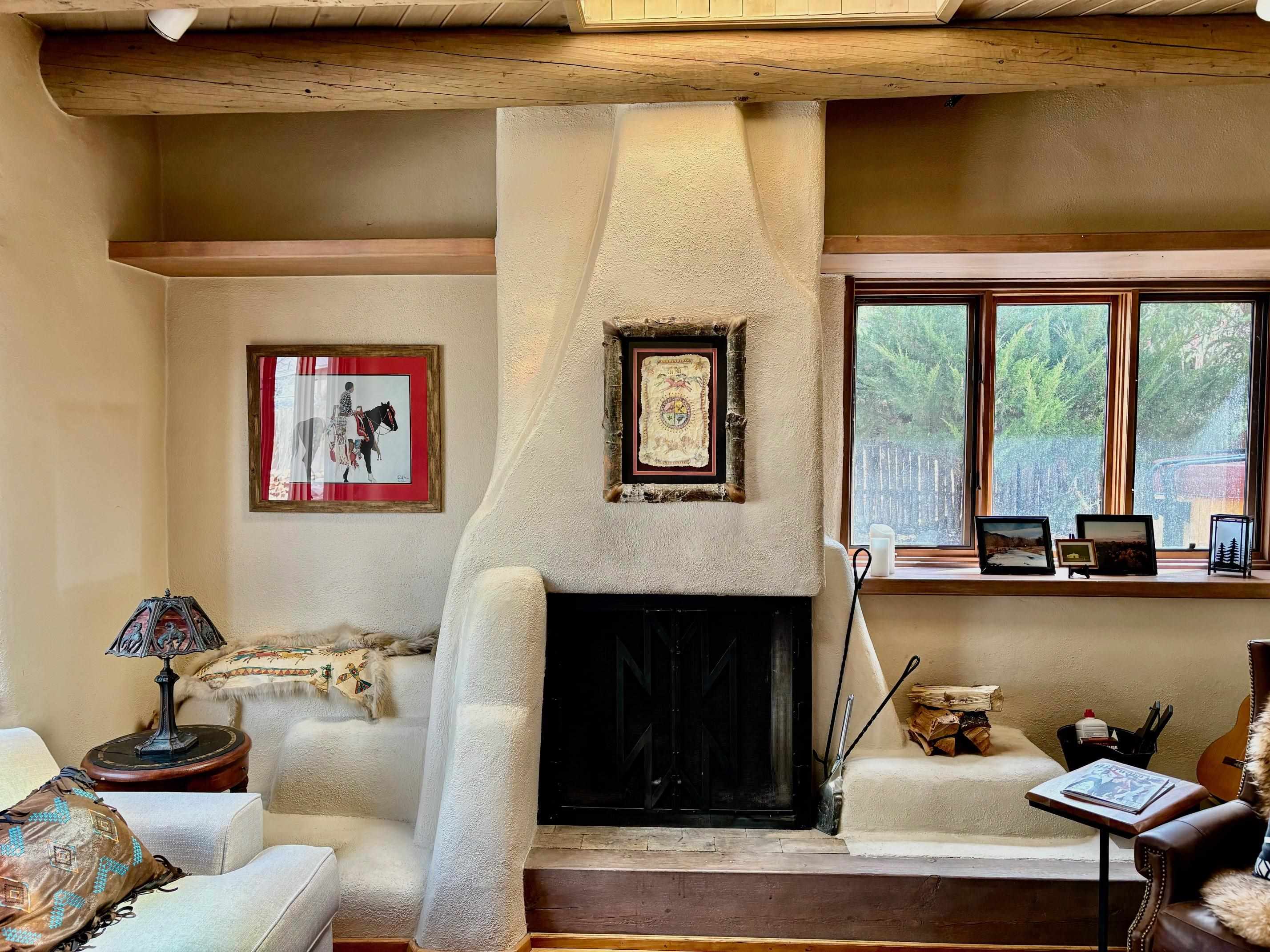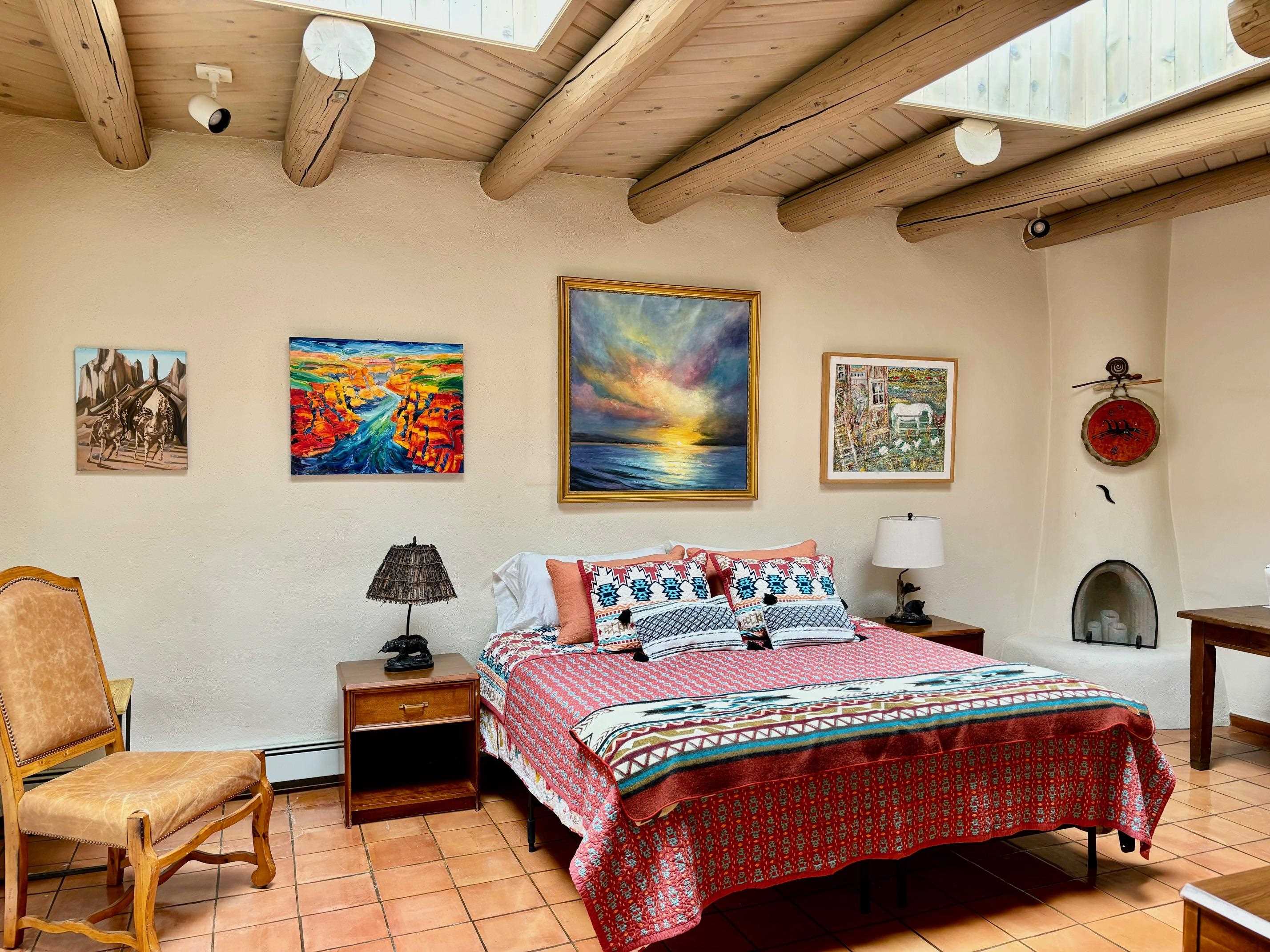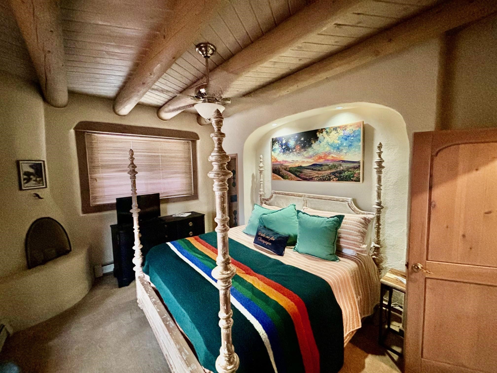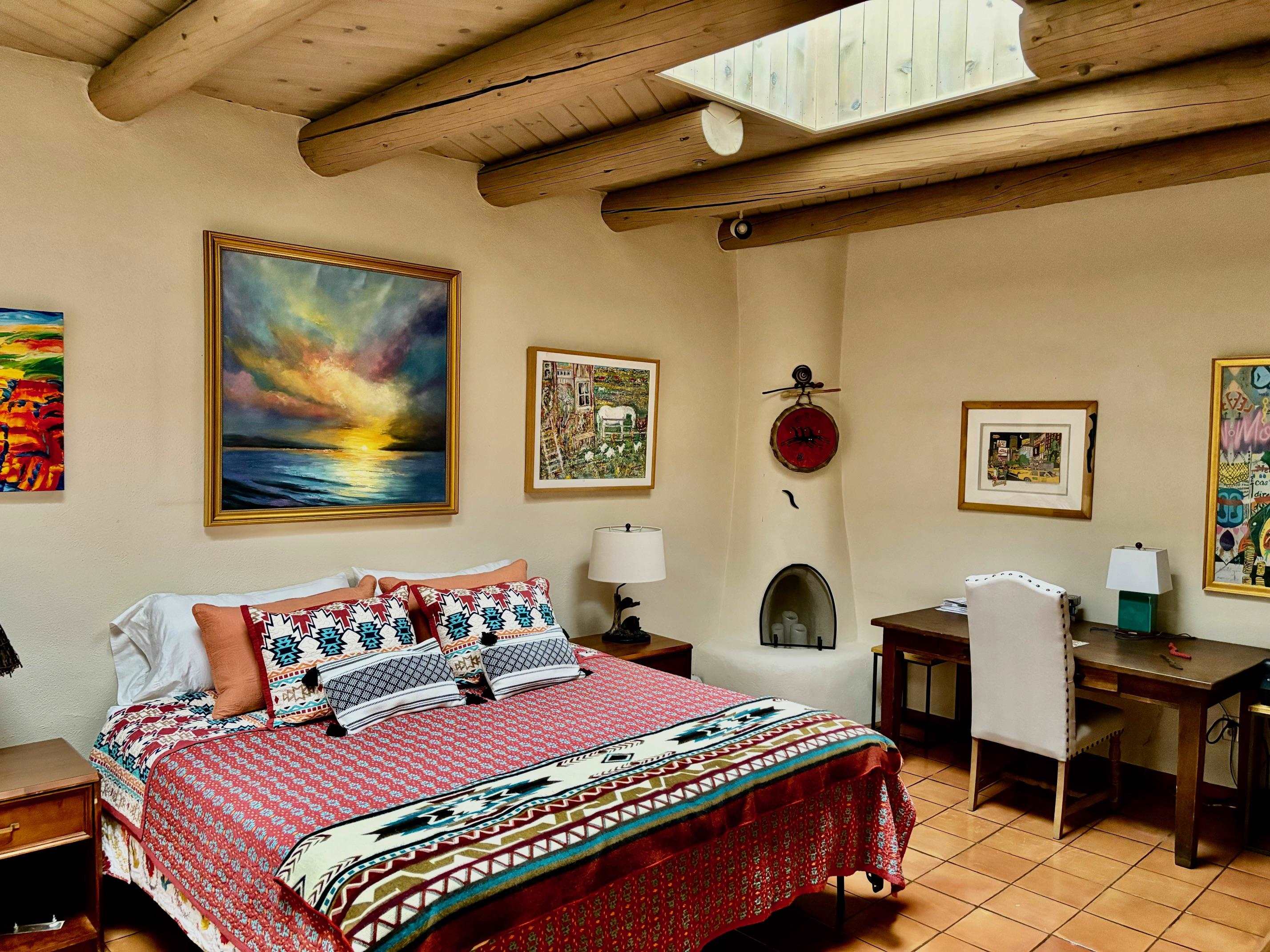 Authentic adobe house located near the historic Taos Plaza and Monte Sagrado. Located at the back end of Spruce Lane, a very quiet and secluded area. The adobe walls are thick. Features three bedrooms and two bathrooms. Two-story house. Features vigas throughout the house with tongue and grove wood. Floors feature wood and tile downstairs and carpet upstairs. The kitchen is large and features stainless steel appliances, built-in wine rack and white cabinets. The house has a formal dining room, and living room. One bedroom is downstairs and two bedrooms are upstairs. Washer and dryer are included. The house also features three fireplaces located in the living room, downstairs bedroom, and primary bedroom upstairs. The primary bedroom is cozy and double doors lead to a gorgeous sun room; plenty of windows and natural light. This room can be used in many different ways. The primary bedroom has a mini-split system for instant heating and air conditioning. The house has several multiple, large skylights. All this house is spread out over 2,188 square feet. The outside has superb landscaping including many trees, grass, flagstone patios and of course a free standing hot tub. This house is indeed a rare find. Come and see it. The square footage is not guaranteed by the seller or the broker so if this is of importance to the buyer then the buyer shall have the house measured by an expert.