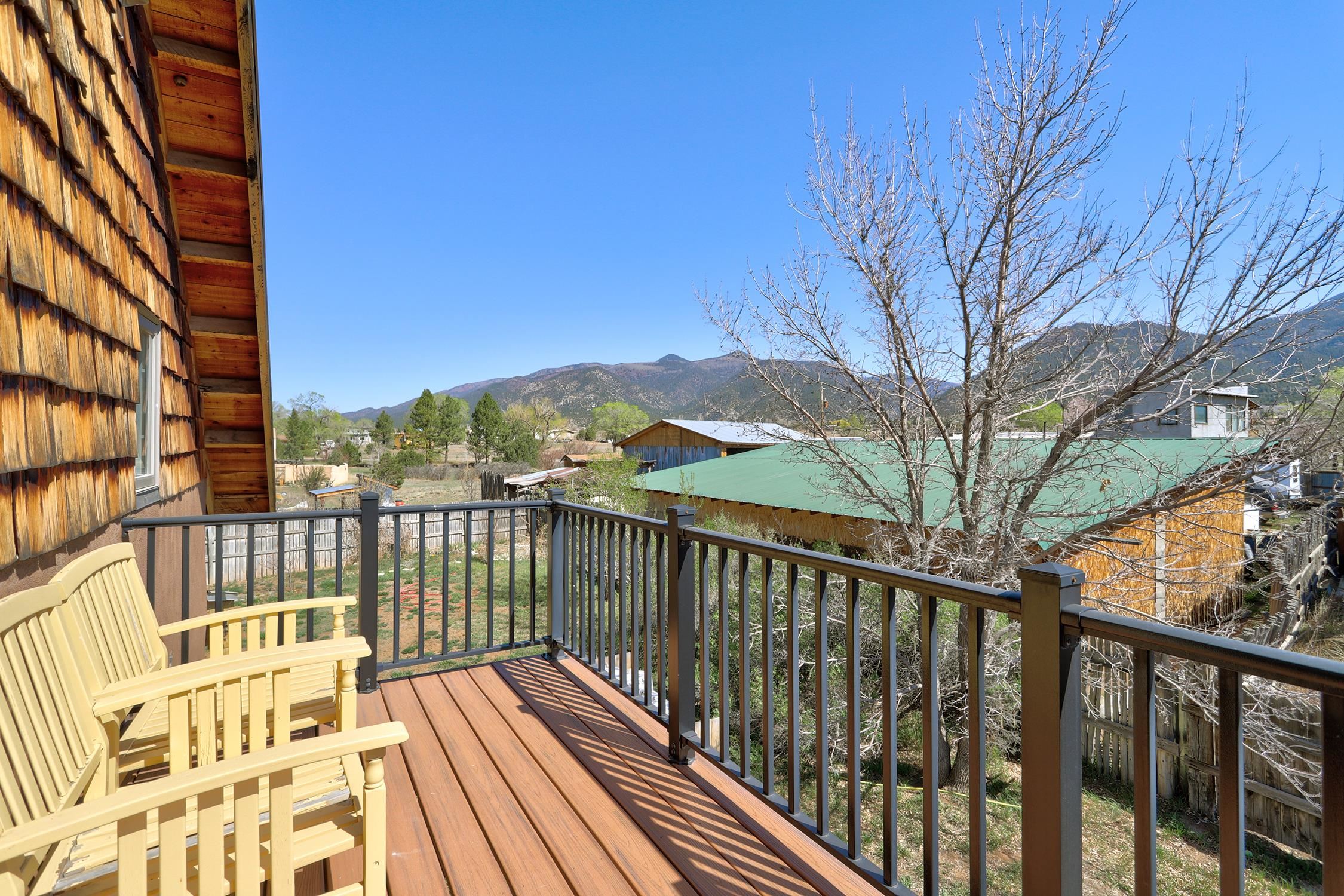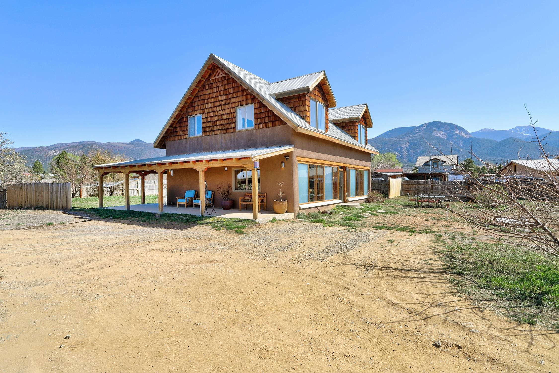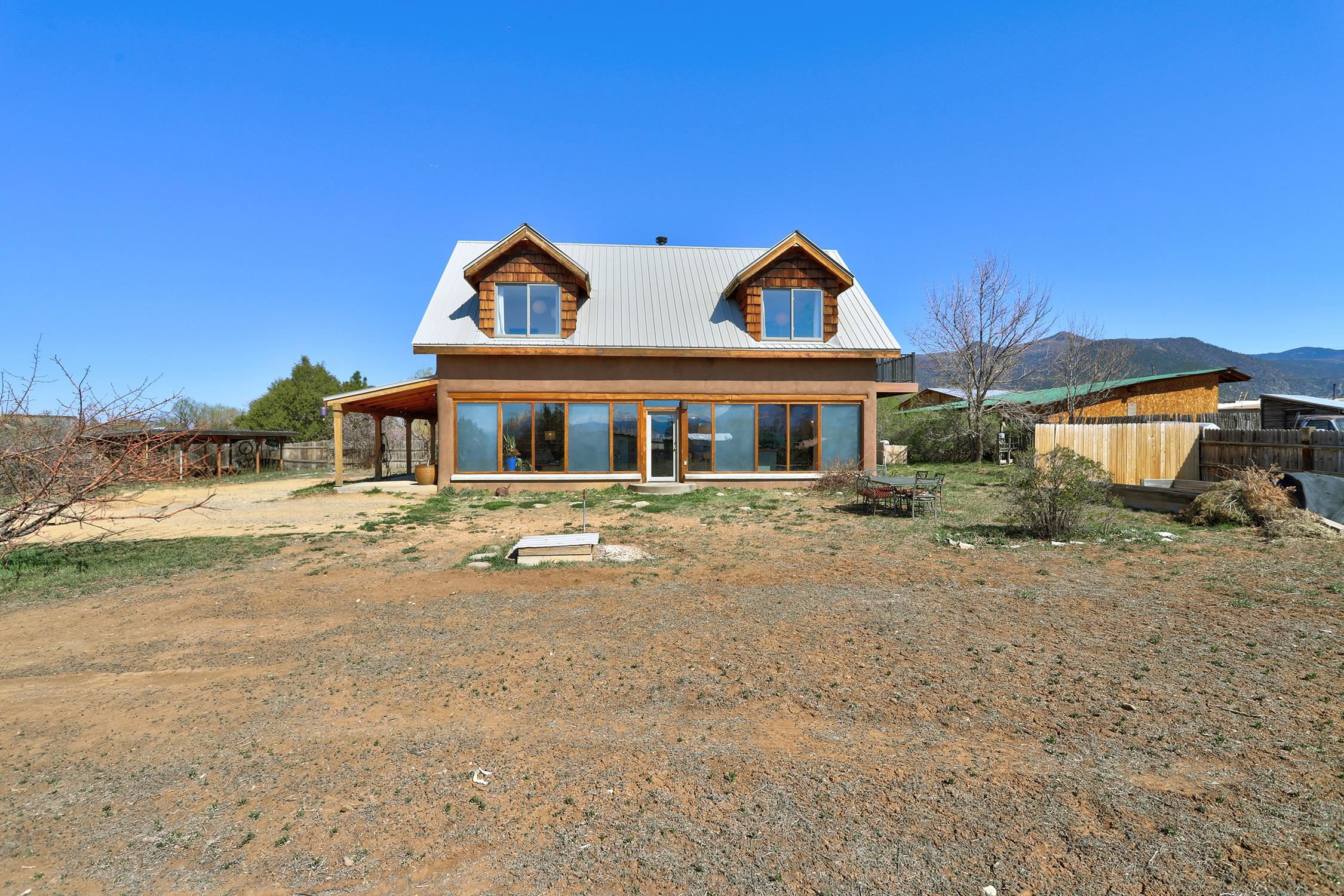 At the end of a quiet, dead-end road near one of Taos County's most beloved villages, this 3BD/2BA 2,400-square-foot home earns its setting. Large windows pull the mountain views inside, flooding open living spaces with light and sky. Constructed of pumice-crete and frame, the passive solar design ensures year-round comfort. Trombe walls store the day's heat and release it through the night in winter. The wood stove provides additional warmth when needed. The result is a house that works with the New Mexico climate and is grounded in the regional building tradition. Stained concrete, wood, and tile floors flow underfoot alongside organic wool carpeting in the private spaces. Granite countertops anchor the kitchen and baths. Walk-in showers, mica-studded adobe walls, and wood columns give the spaces a quiet sense of craft. A bonus room on the ground floor has its own entrance, perfect for a studio or office. Step outside to a deep wraparound covered portal that makes outdoor living a dream, or take in the longer view from the primary suite balcony. Originally intended as a biodynamic farm, this three-quarter-acre parcel boasts established fruit trees and surface water rights. EV charging is available on-site. Arroyo Seco's acclaimed restaurants and shops are minutes away, without having to get in the car. Located just 20 minutes from world-class Taos Ski Valley, and 15 minutes from the historic Taos Plaza. This is the home you've been waiting for.