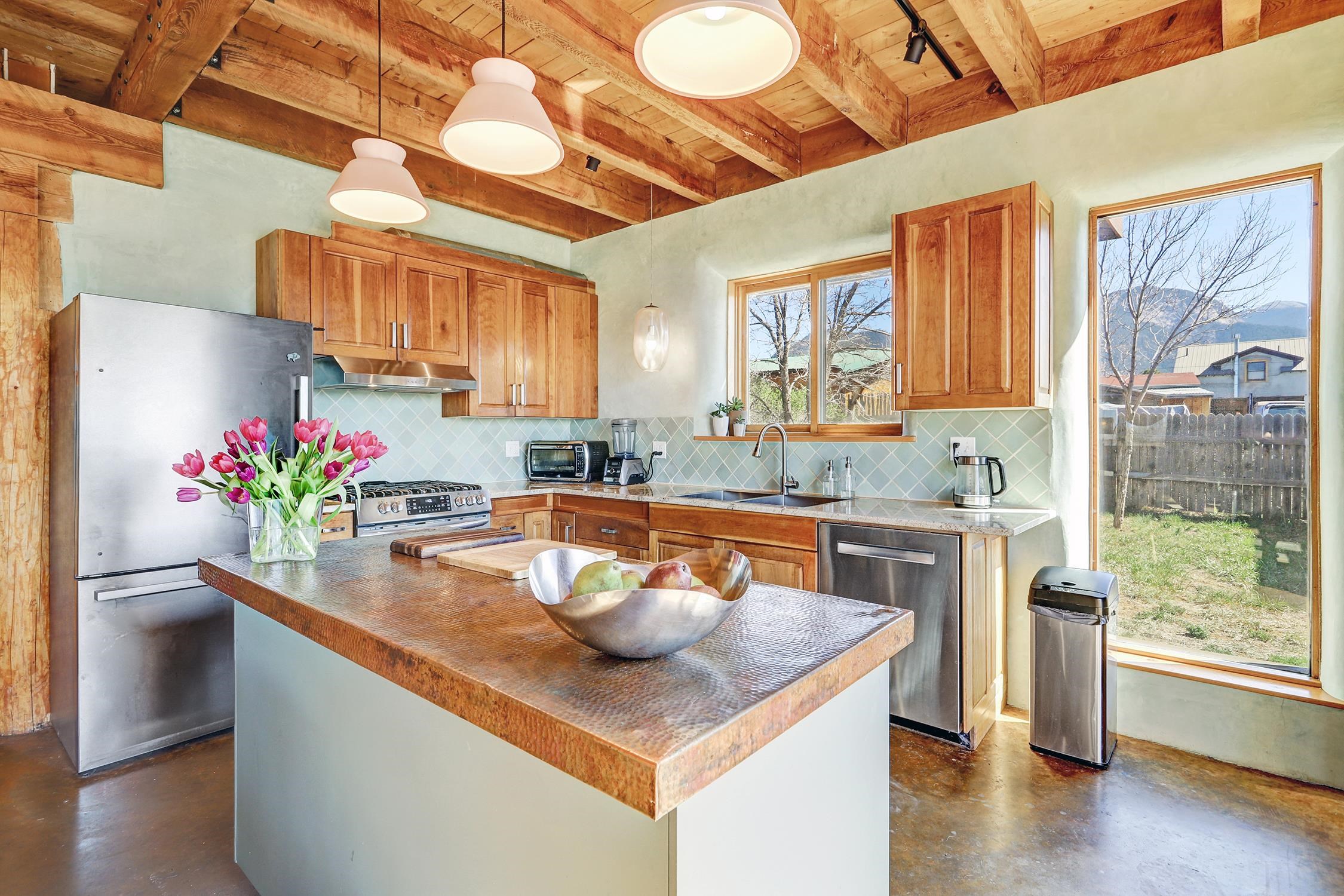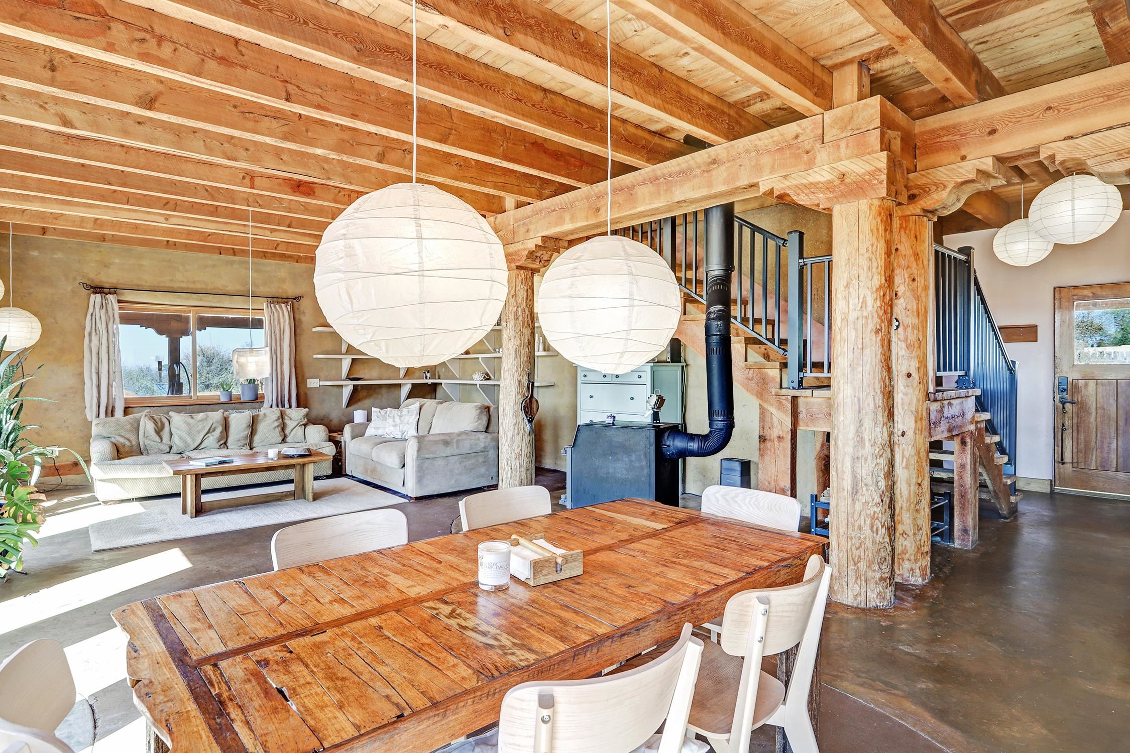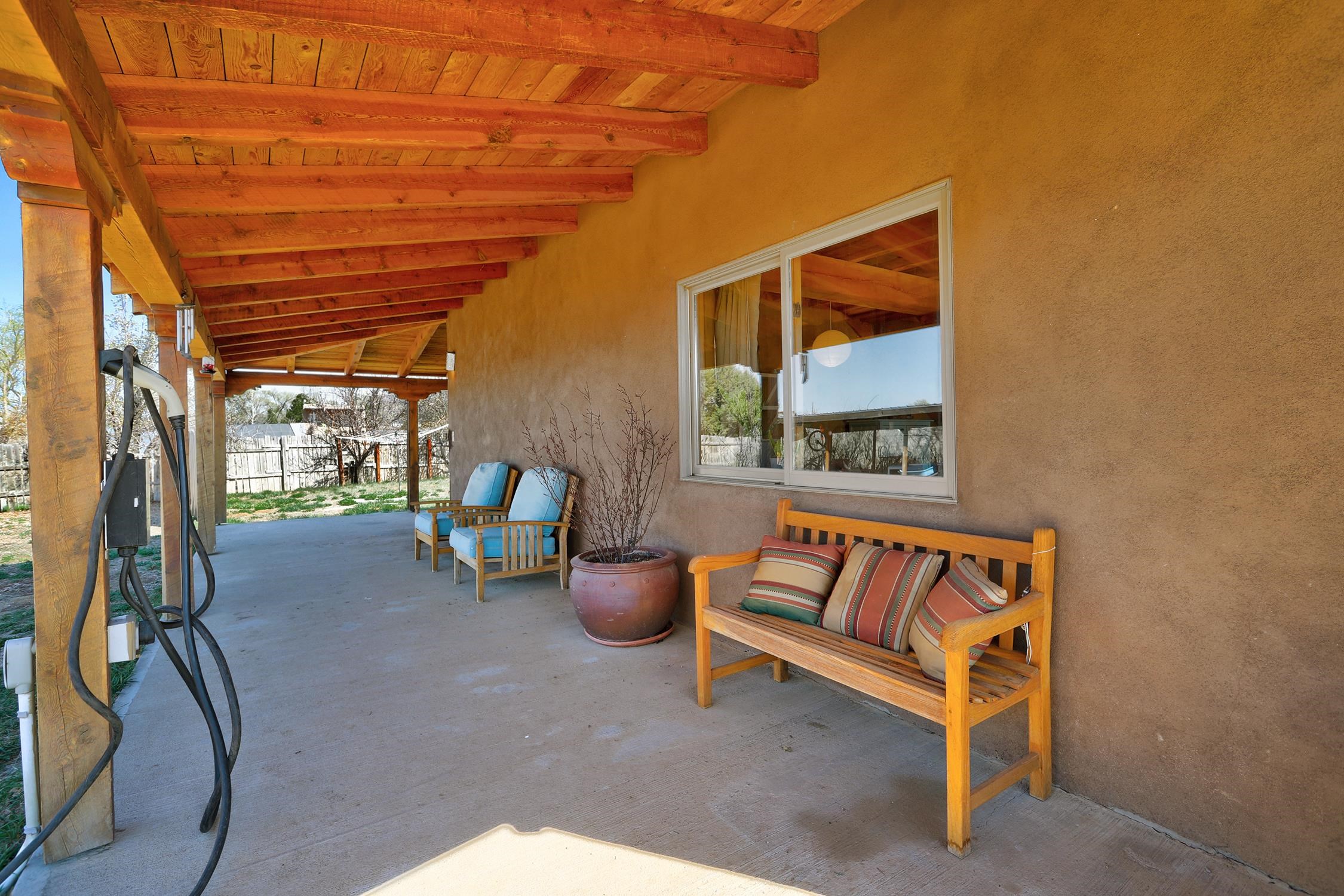 At the end of a quiet, dead-end road near one of Taos County's most beloved villages, this 3BD/2BA 2,400-square-foot home earns its setting. Large windows pull the mountain views inside, flooding open living spaces with light and sky. Constructed of pumice-crete and frame, the passive solar design ensures year-round comfort. Trombe walls store the day's heat and release it through the night in winter. The wood stove provides additional warmth when needed. The result is a house that works with the New Mexico climate and is grounded in the regional building tradition. Stained concrete, wood, and tile floors flow underfoot alongside organic wool carpeting in the private spaces. Granite countertops anchor the kitchen and baths. Walk-in showers, mica-studded adobe walls, and wood columns give the spaces a quiet sense of craft. A bonus room on the ground floor has its own entrance, perfect for a studio or office. Step outside to a deep wraparound covered portal that makes outdoor living a dream, or take in the longer view from the primary suite balcony. Originally intended as a biodynamic farm, this three-quarter-acre parcel boasts established fruit trees and surface water rights. EV charging is available on-site. Arroyo Seco's acclaimed restaurants and shops are minutes away, without having to get in the car. Located just 20 minutes from world-class Taos Ski Valley, and 15 minutes from the historic Taos Plaza. This is the home you've been waiting for.