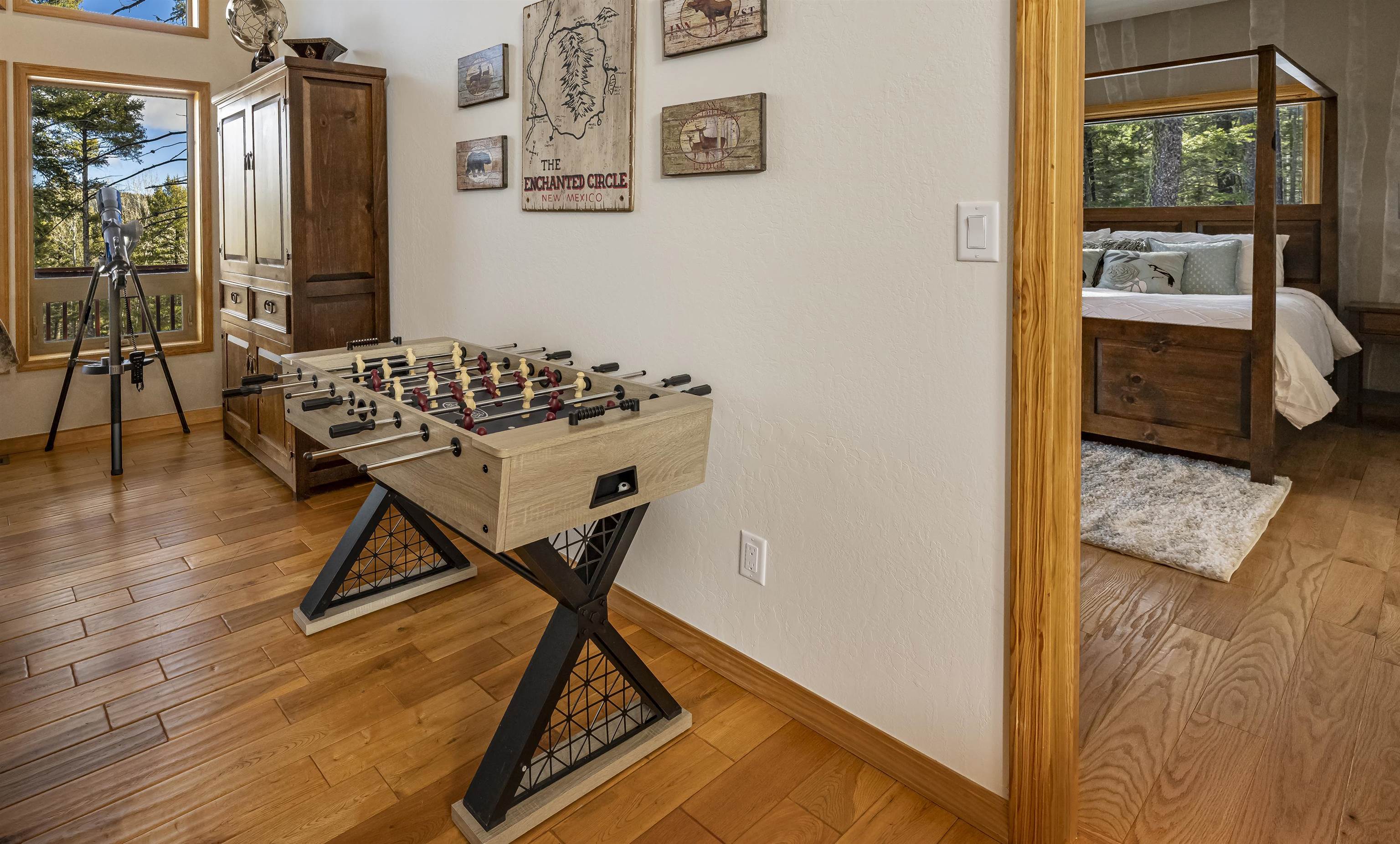 You'll love the updated rustic design of this 3-bedroom, 2-bathroom home. The open kitchen, dining, and living areas create the perfect spot to cook, gather, and relax. The primary suite, tucked away on one side of the home for privacy, offers a soaking tub, separate shower, and substantial walk-in closet. On the North side, two comfortable bedrooms share a full bathroom with a tiled tub and forest views. Step outside to the hot tub or take in the fresh mountain air on the large deck. Just four miles from the base of the mountain and minutes to hiking, biking, fishing, golfing, and all the amenities Angel Fire has to offer!
