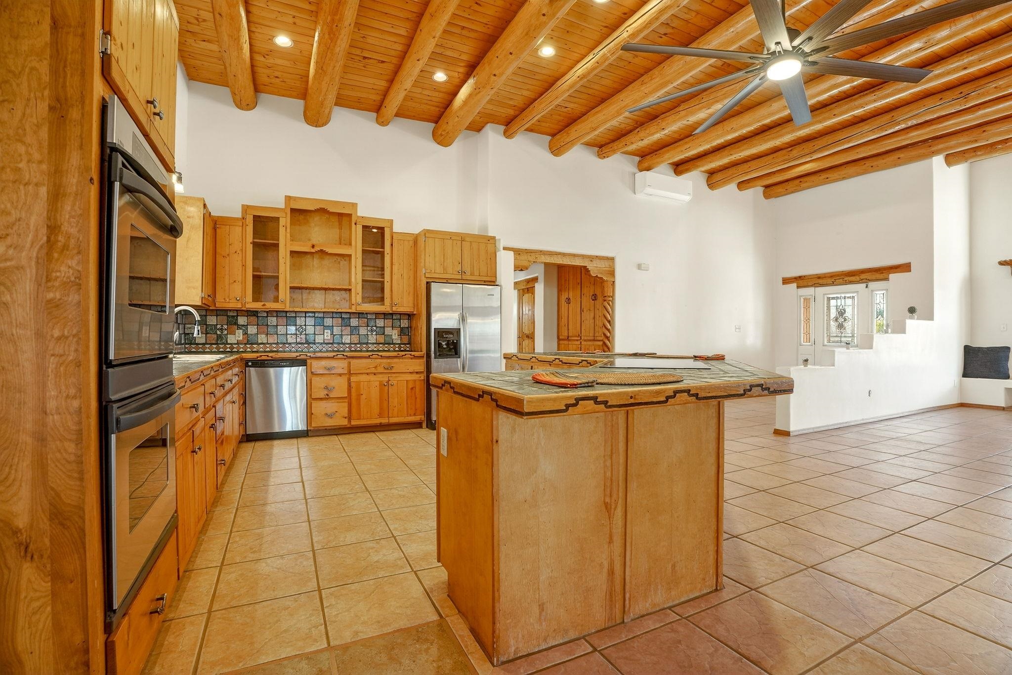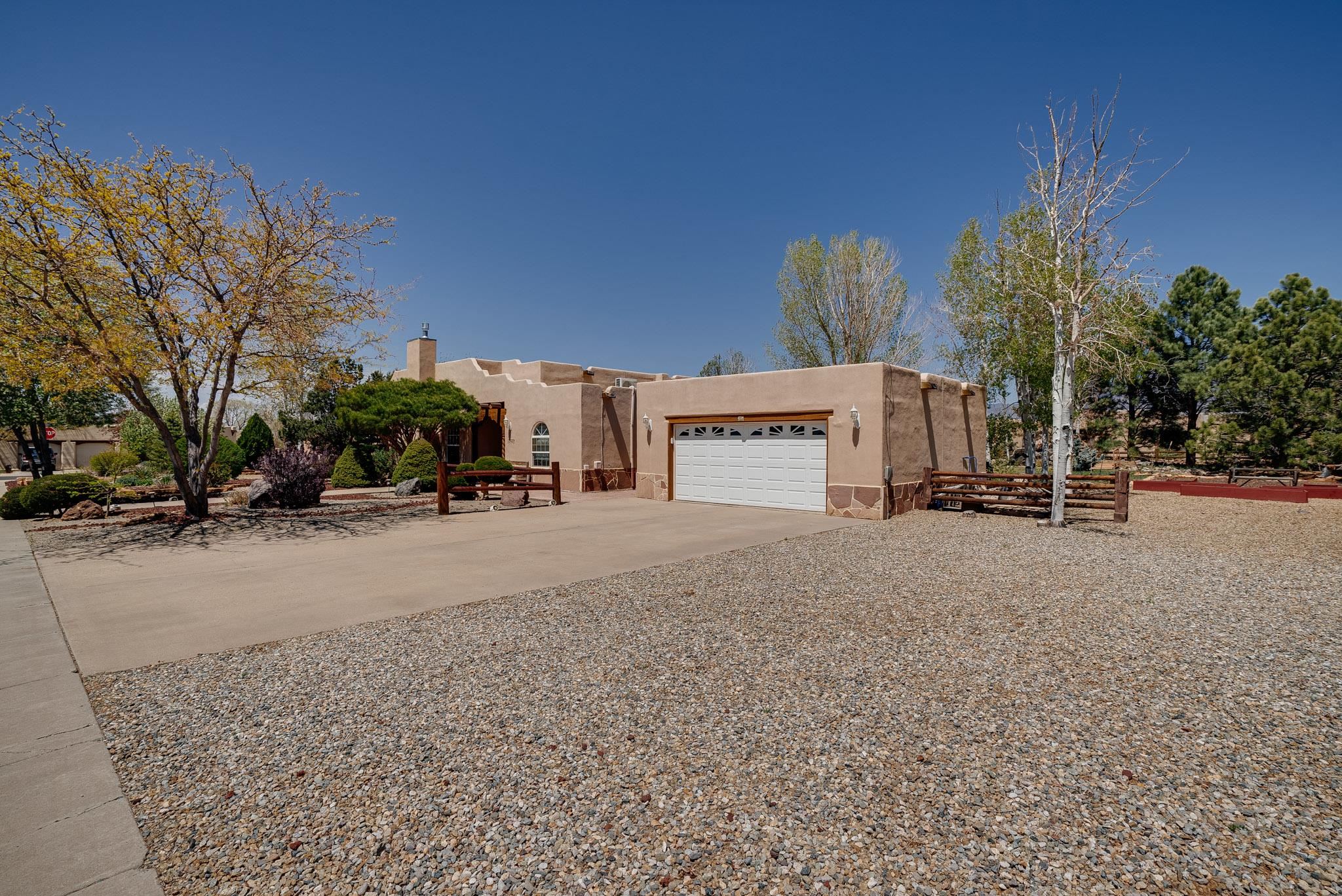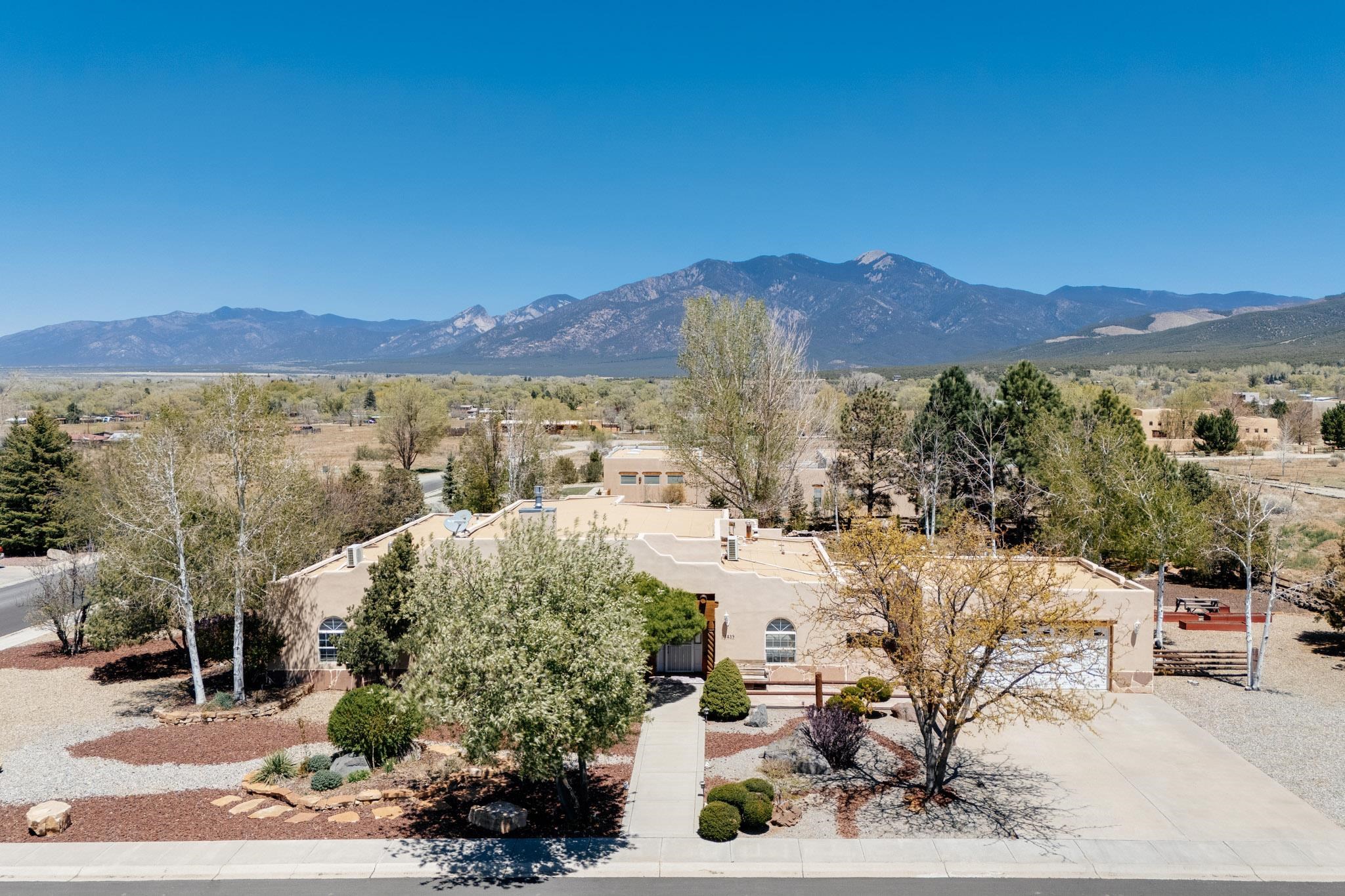 Welcome to this spacious 4-bedroom, 3-bathroom home offering approximately 3,400 square feet of comfort, character, and Southwestern charm in the Vegas De Taos subdivision. Set on a peaceful .68-acre lot, this in-town property combines convenience with a sense of privacy, complete with paved roads, sidewalks, and a welcoming community atmosphere. The beautifully curated grounds feature multiple water features, lush lawn areas, raised garden beds, and a diverse collection of mature trees, including conifers, deciduous varieties, and fruit trees. Enjoy mountain views, big open skies, and a thoughtful blend of low-maintenance xeriscaping in the front with a vibrant backyard retreat. Rock walls and wood fencing create a variety of inviting outdoor spaces, perfect for relaxing or entertaining. Inside, the grand great room impresses with 14-foot vaulted ceilings, custom woodwork, and radiant floor heating, complemented by efficient split units for year-round comfort. French doors off the dining area open to a generous covered veranda, ideal for indoor-outdoor living. The kitchen is designed for both function and gathering, featuring stainless steel appliances, a double oven, a smooth-surface cooktop on the island, a 3-basin sink, and a large island with seating for up to eight. A formal dining room offers additional space for hosting. The west wing includes two guest bedrooms, a spacious full bathroom, and a private primary suite with hickory Pergo flooring, a sitting area or office nook, a whirlpool tub, a separate shower, and an oversized walk-in closet. The east wing offers an additional bedroom, a guest bath, a large pantry, hall storage, and a laundry room with access to the covered breezeway and detached two-car garage. Located just minutes from downtown Taos, the hospital, and local amenities, this property offers a rare combination of space, comfort, and a true in-town homestead feel.