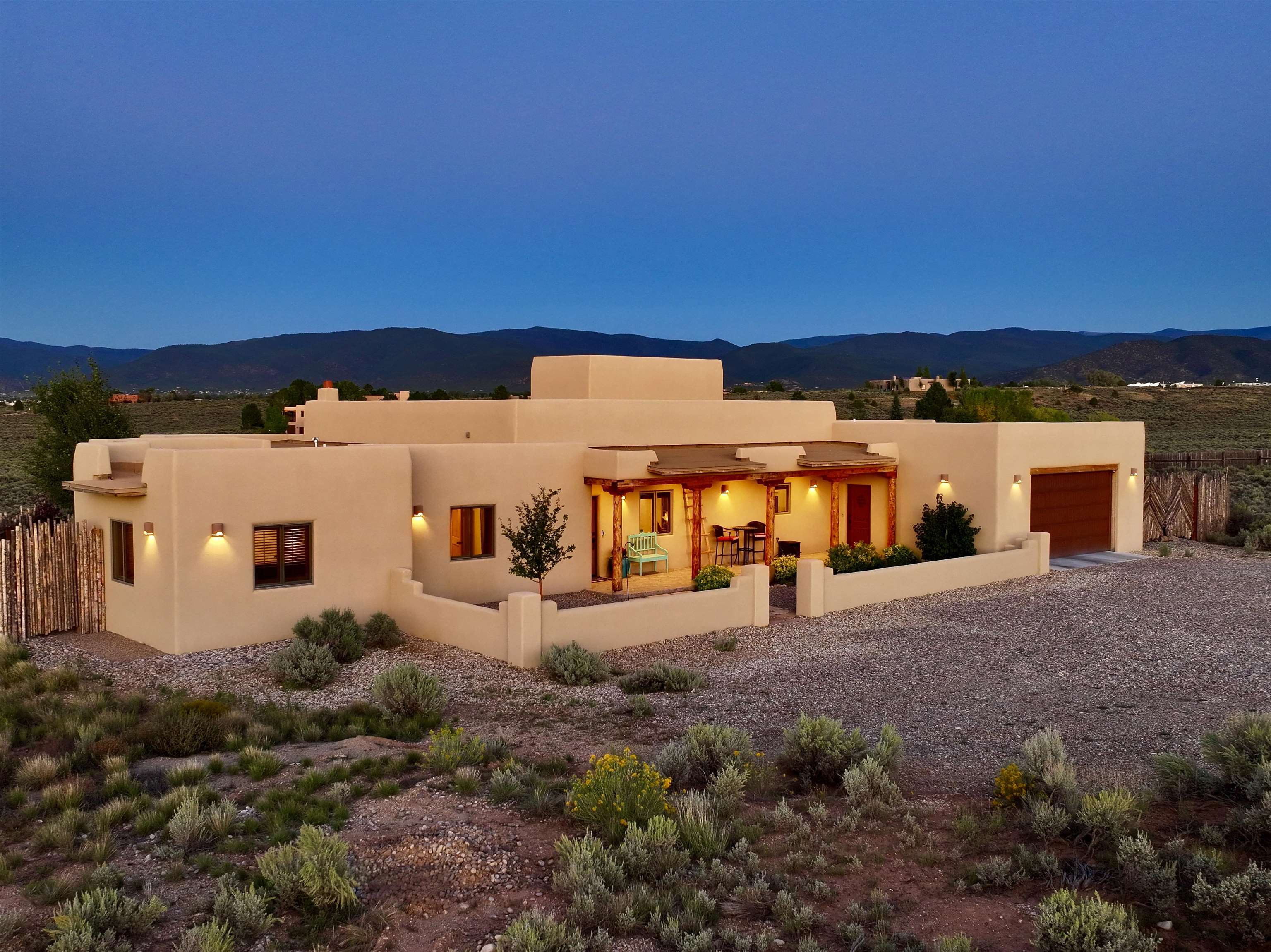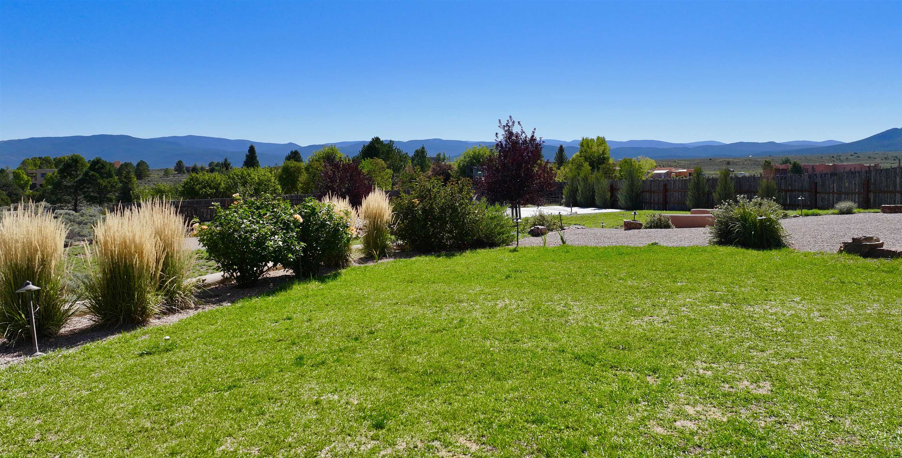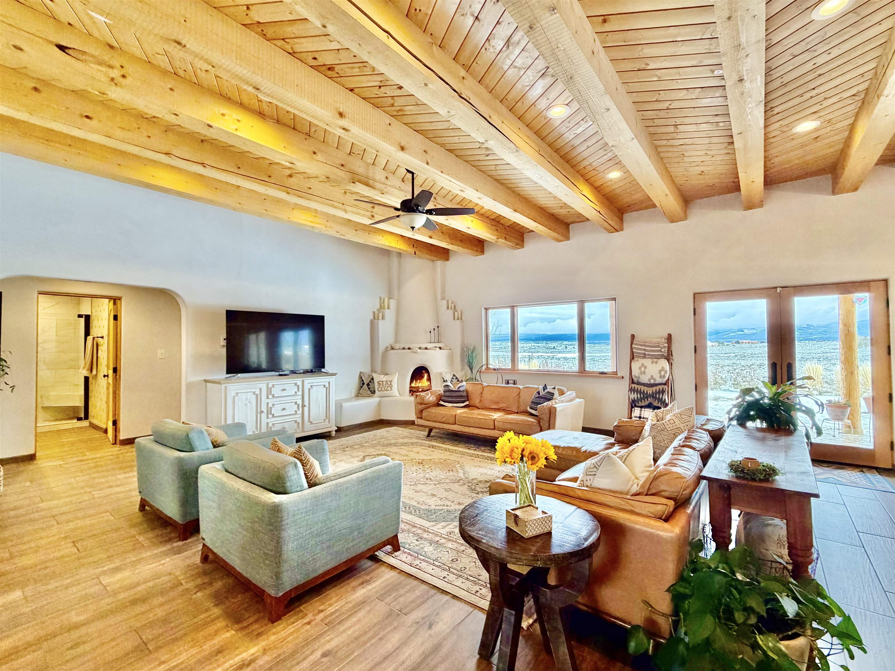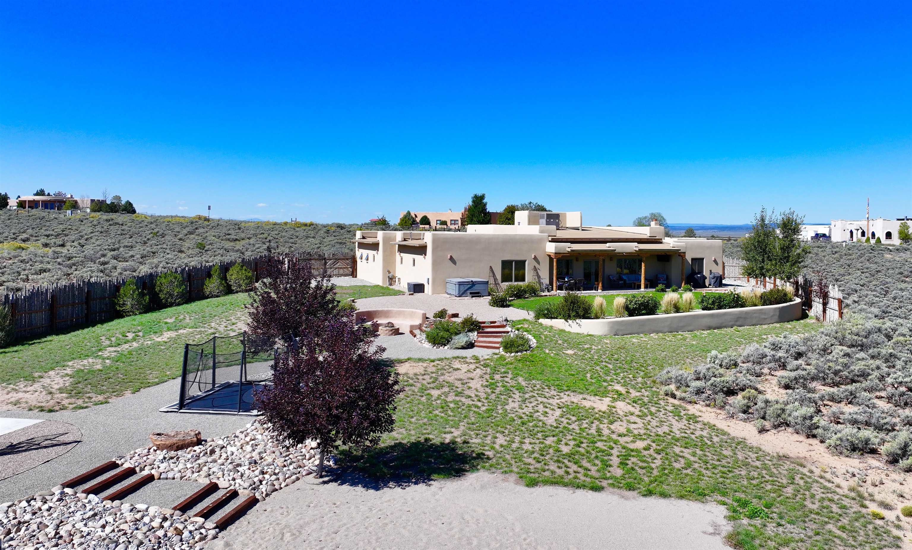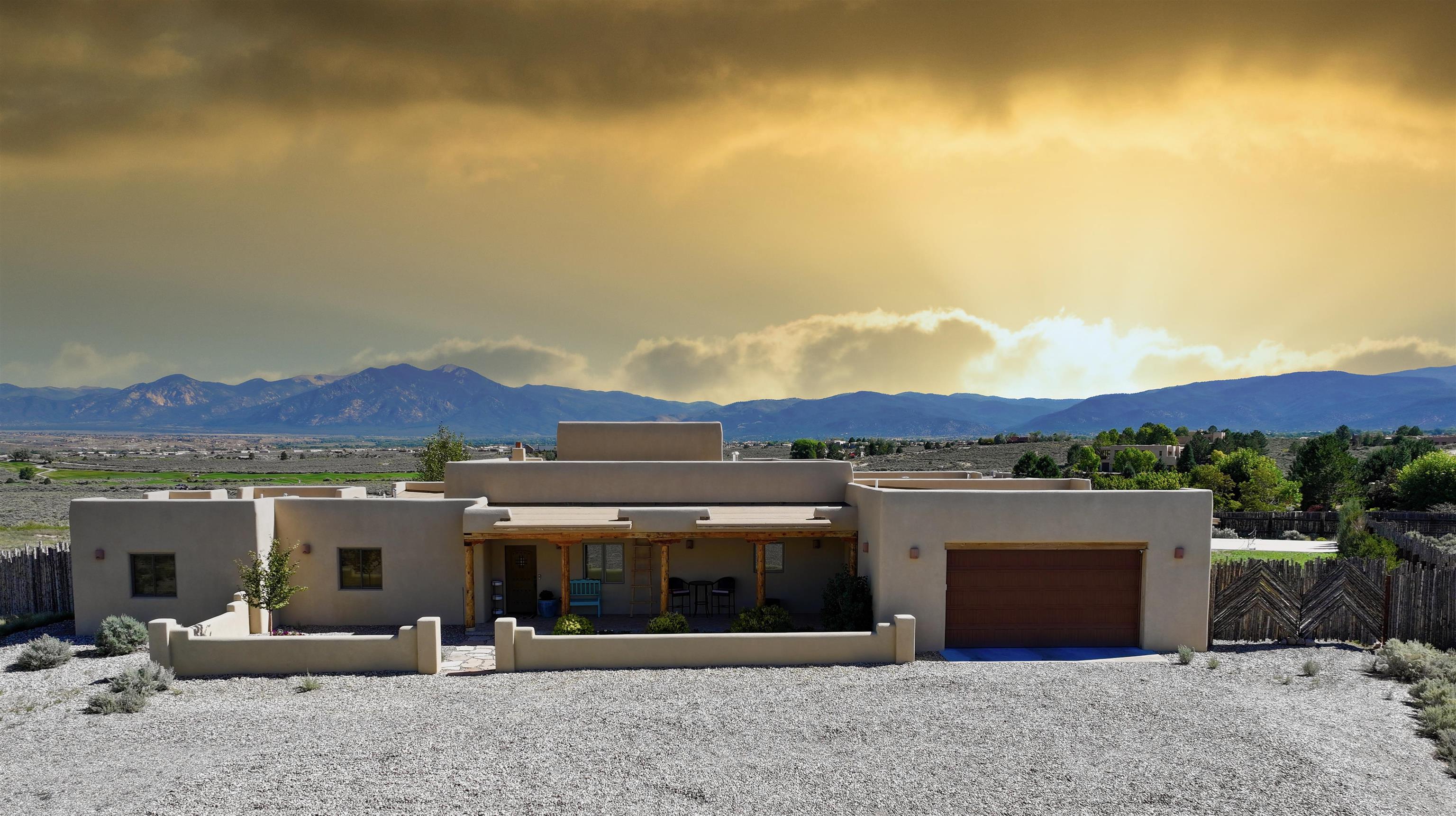 A Resilient and Enchanting Residence in an Optimal Location: Nestled in the heart of Northern New Mexico, this exquisite property offers unparalleled access to renowned amenities such as the esteemed Taos Country Club, the awe-inspiring Rio Grande del Norte National Monument, and the renowned Slide Trail-Upper Trailhead, all conveniently situated near the picturesque Rio Pueblo Gorge. The property’s centerpiece is a meticulously crafted, Pueblo-style residence that spans an impressive 2,993 square feet. It is complemented by an exceptional landscaping design that exudes tranquility and beauty. The distinctive floor plan includes four large bedrooms, three full baths, and is characterized by elegant tile flooring, quartz countertops, stunning elevated viga ceilings, and generously open living spaces. When you aren’t opening the windows to take advantage of the cool northern New Mexico summer nights, this property is equipped with central heat and air conditioning. The primary heat source though, comes from the highly efficient Navien combi-boiler that provides tankless hot water as well as radiant floor heating to the entire home. The radiant floor heating includes a zone for the oversized two-car garage, meaning you will never have to defrost your windshield or climb into a freezing car again! A whole house water softener system enhances the water provided by the property’s private well. The exterior is adorned with a captivating array of miniature rose bushes, iris, and dwarf cherry bushes, and potentilla, providing a pop of color all year long. Professionally designed by Taos Landscaping, the yard features aspen, choke cherry, and pinon trees throughout, all on drip irrigation. The backyard includes a smokeless Breeo fire pit, an outdoor seating area, and a recreational basketball/sport court. All of which is tastefully lit with energy efficient, programmable landscape lighting. The expansive east-facing back patio provides the perfect spot to witness the breathtaking Northern New Mexico sunrise, Taos Country Club’s 14th and 15th fairways, and breathtaking panoramic views of Taos Mountain. Alternatively, the west side of the home provides a serene backdrop for breathtaking sunsets, with the patio and portal serving as inviting vantage points.