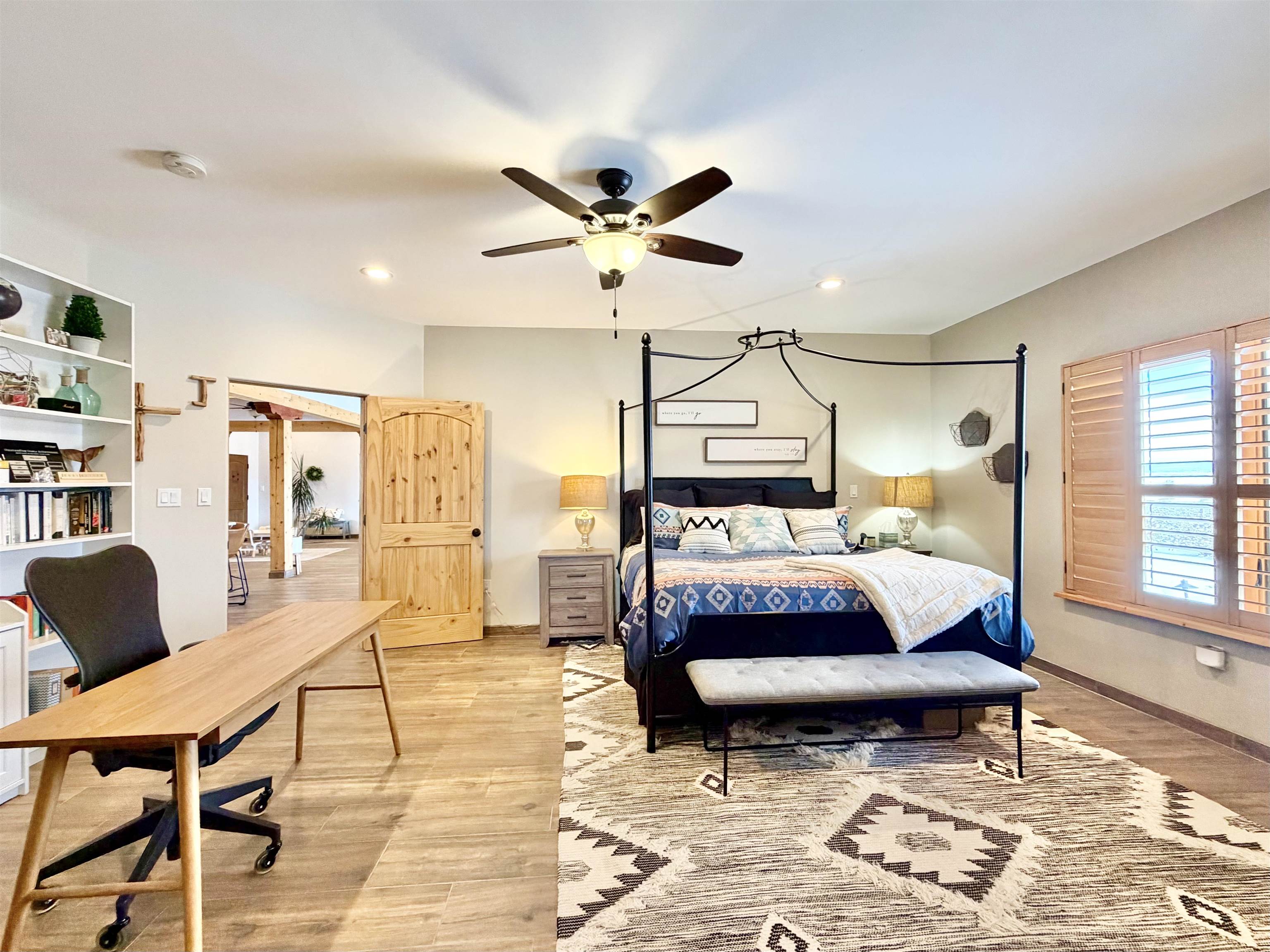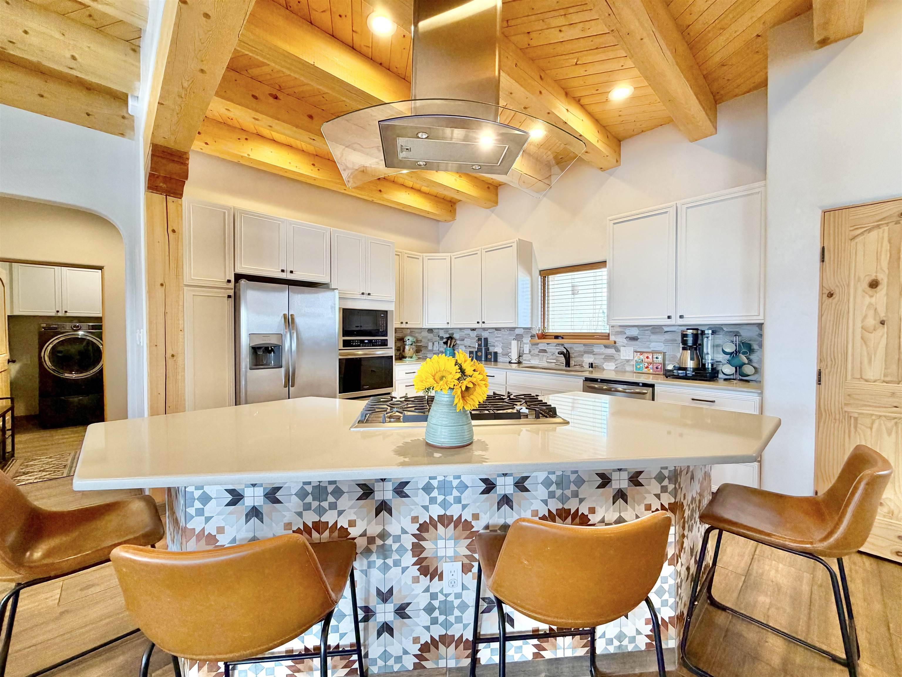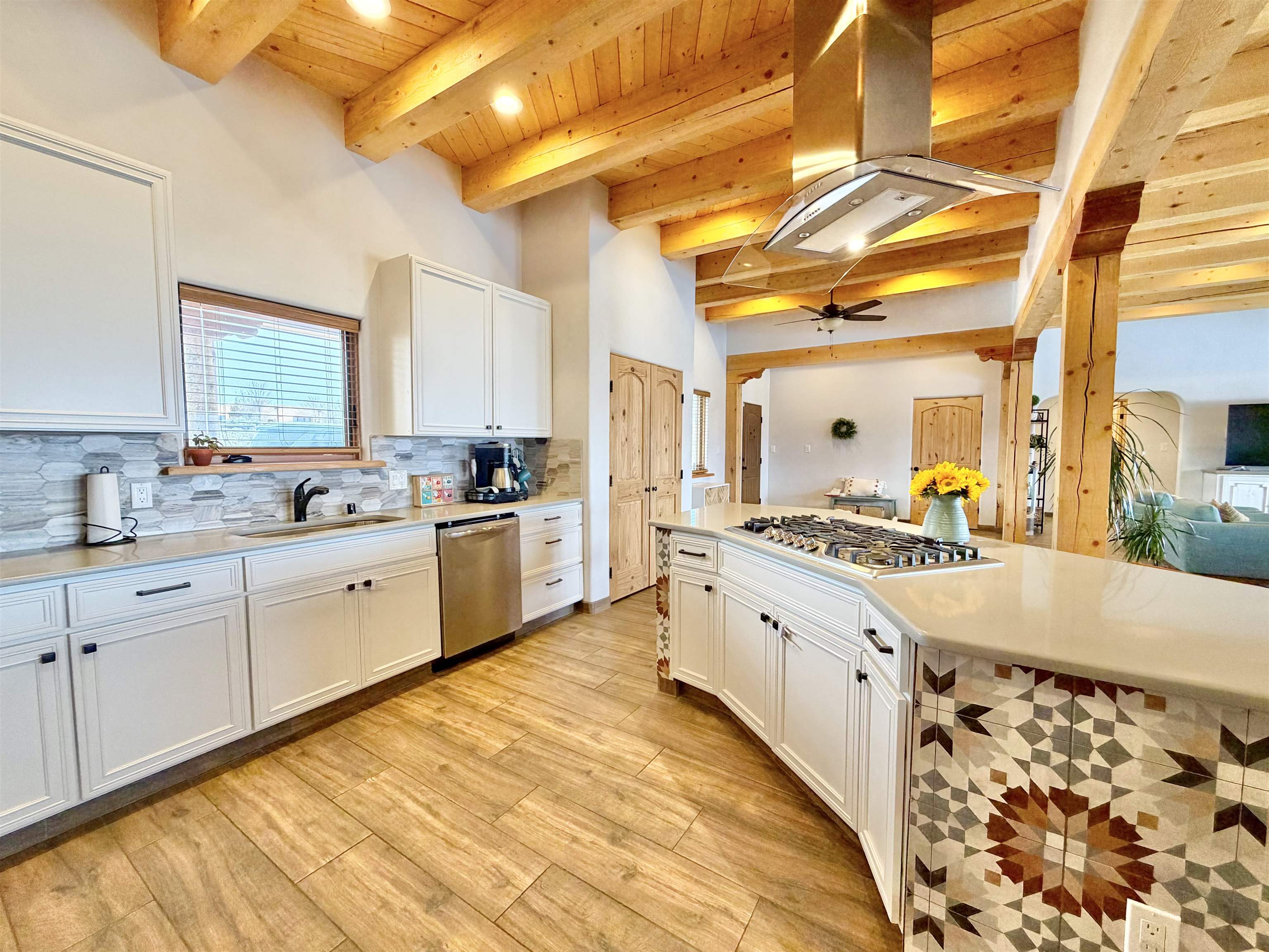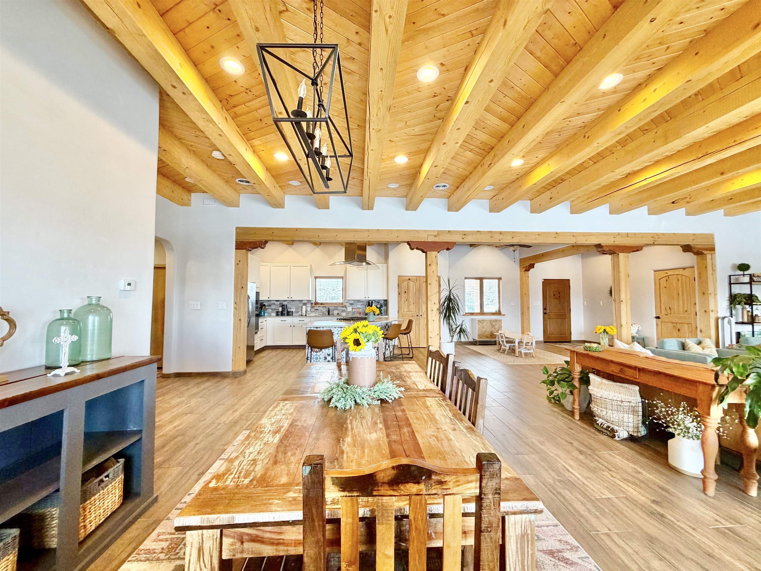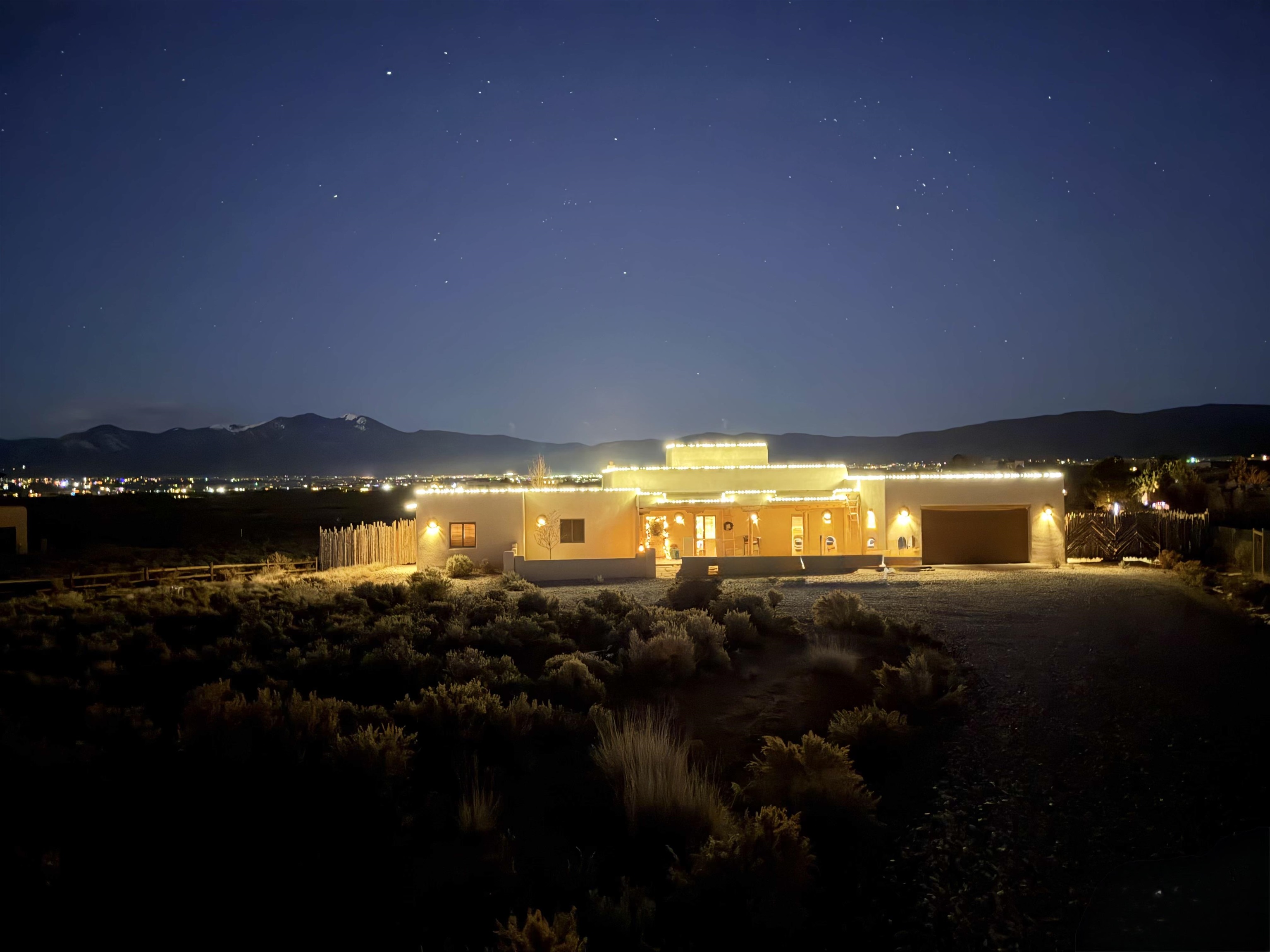 A Resilient and Enchanting Residence in an Optimal Location: Nestled in the heart of Northern New Mexico, this exquisite property offers unparalleled access to renowned amenities such as the esteemed Taos Country Club, the awe-inspiring Rio Grande del Norte National Monument, and the renowned Slide Trail-Upper Trailhead, all conveniently situated near the picturesque Rio Pueblo Gorge. The property’s centerpiece is a meticulously crafted, Pueblo-style residence that spans an impressive 2,993 square feet. It is complemented by an exceptional landscaping design that exudes tranquility and beauty. The distinctive floor plan includes four large bedrooms, three full baths, and is characterized by elegant tile flooring, quartz countertops, stunning elevated viga ceilings, and generously open living spaces. When you aren’t opening the windows to take advantage of the cool northern New Mexico summer nights, this property is equipped with central heat and air conditioning. The primary heat source though, comes from the highly efficient Navien combi-boiler that provides tankless hot water as well as radiant floor heating to the entire home. The radiant floor heating includes a zone for the oversized two-car garage, meaning you will never have to defrost your windshield or climb into a freezing car again! A whole house water softener system enhances the water provided by the property’s private well. The exterior is adorned with a captivating array of miniature rose bushes, iris, and dwarf cherry bushes, and potentilla, providing a pop of color all year long. Professionally designed by Taos Landscaping, the yard features aspen, choke cherry, and pinon trees throughout, all on drip irrigation. The backyard includes a smokeless Breeo fire pit, an outdoor seating area, and a recreational basketball/sport court. All of which is tastefully lit with energy efficient, programmable landscape lighting. The expansive east-facing back patio provides the perfect spot to witness the breathtaking Northern New Mexico sunrise, Taos Country Club’s 14th and 15th fairways, and breathtaking panoramic views of Taos Mountain. Alternatively, the west side of the home provides a serene backdrop for breathtaking sunsets, with the patio and portal serving as inviting vantage points.