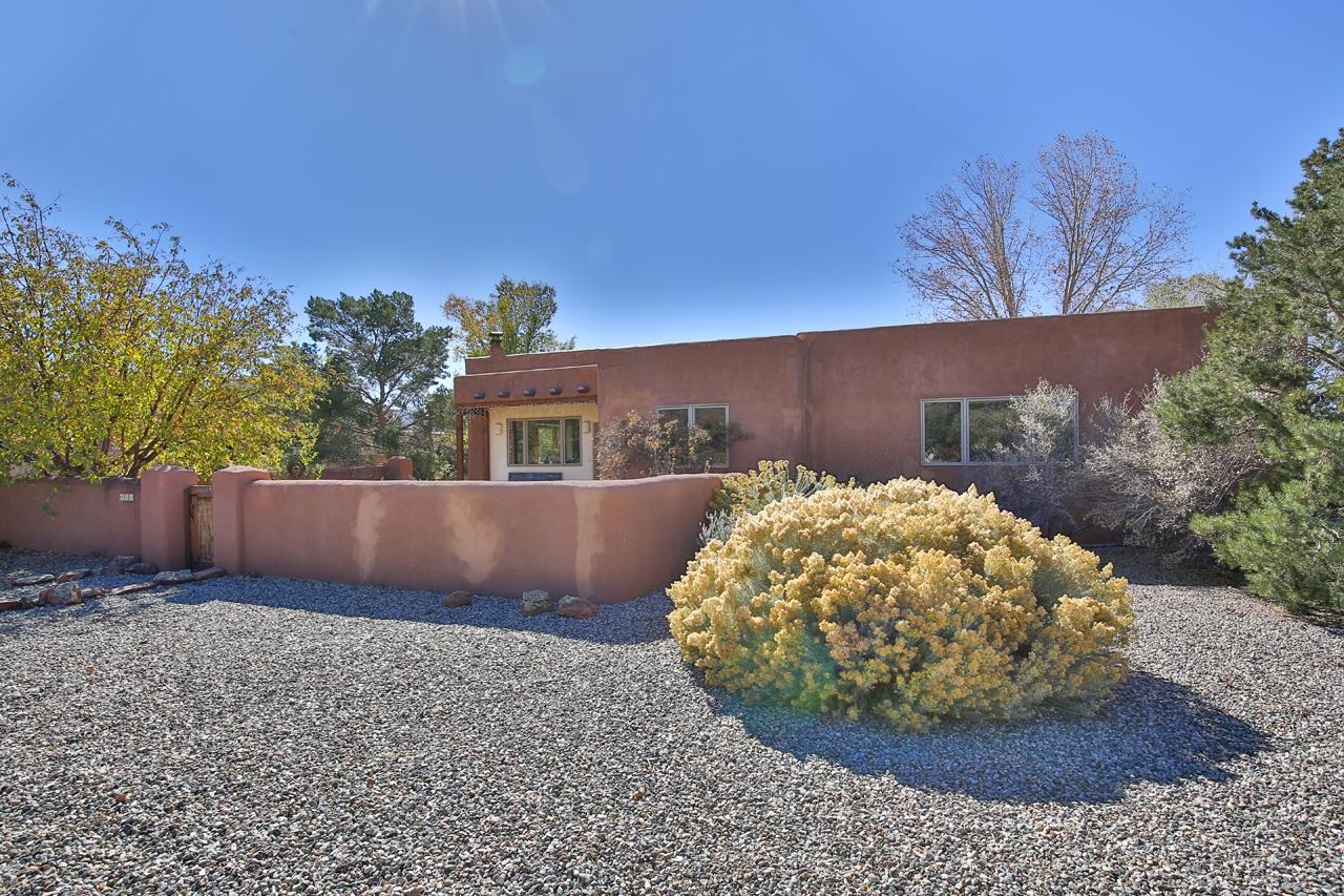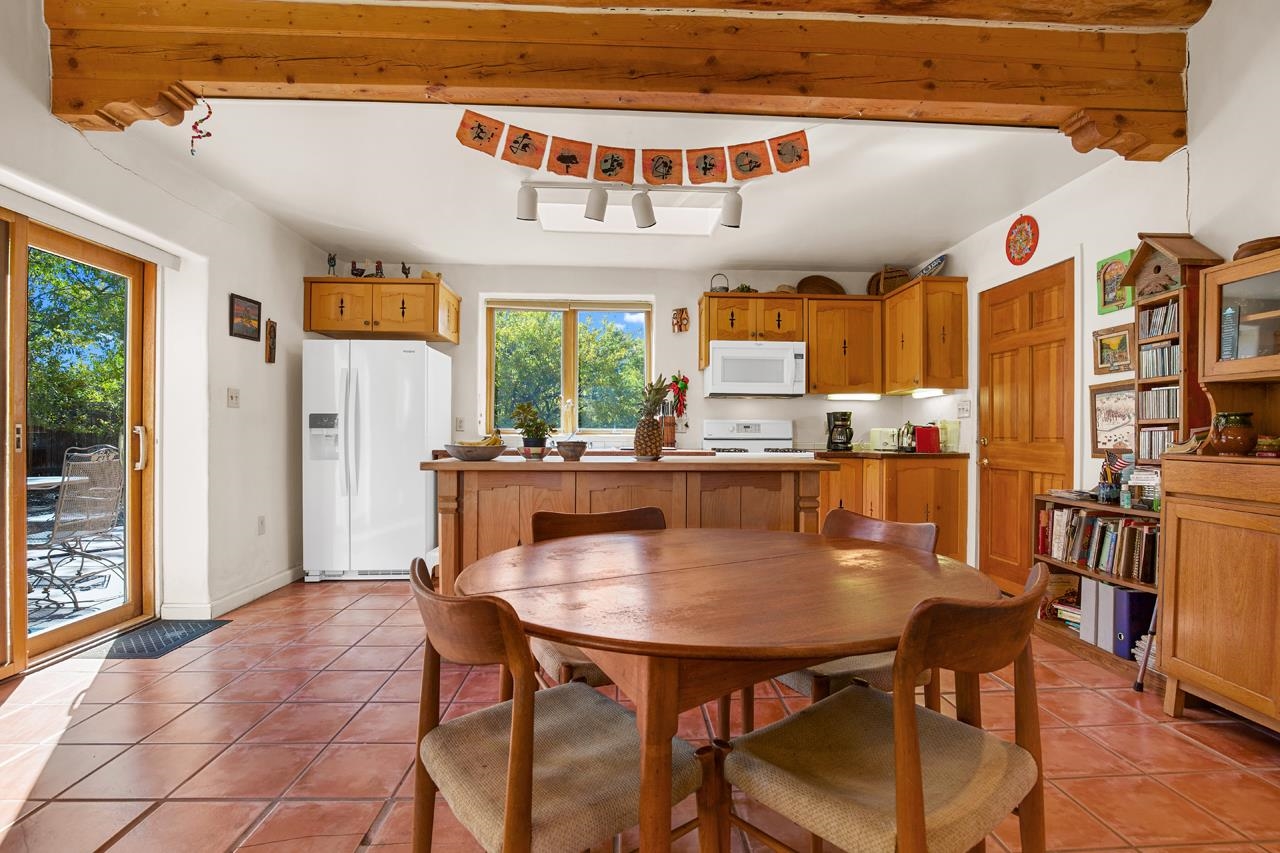 Bright Outlook - Located in the desirable residential area of Vegas de Taos Subdivision, this timeless Southwestern-style home blends classic charm with modern comfort all just minutes from town, restaurants, services, and Taos events. 1,479 sq.ft 2 bedrooms, 2 full baths, plus a bonus room off the living area, this home offers flexible space ideal for an office, studio, or den. Bonus room has a closet and could easily be a 3rd bedroom. The open-concept living area features high ceilings, pumice-crete construction, viga ceilings, nichos, and a kiva fireplace, creating a warm and inviting atmosphere. In-floor radiant heating throughout ensures year-round comfort. The light-filled kitchen boasts wooden cabinets with custom carving, skylight, a large functional island, and a separate dining area, perfect for entertaining or everyday living. The primary suite includes a large closet and a spacious bath with double sinks, bathtub, and a separate shower. The good-sized second bedroom is conveniently located near the second full bath. A laundry area in the hallway and abundant storage throughout add convenience and functionality. Tile and carpet floors, skylights, and expansive windows fill the home with natural light and showcase mountain and foothill views. A sliding glass door opens to a patio and naturally landscaped 0.37-acre yard, while a large gravel driveway provides ample parking. The attached 1-car garage offers parking, storage, or conversion to a studio or hobby space. The front courtyard features xeriscape landscaping, perennials, and a covered entry portal with stunning Taos Mountain views, completing this inviting and well-located home.