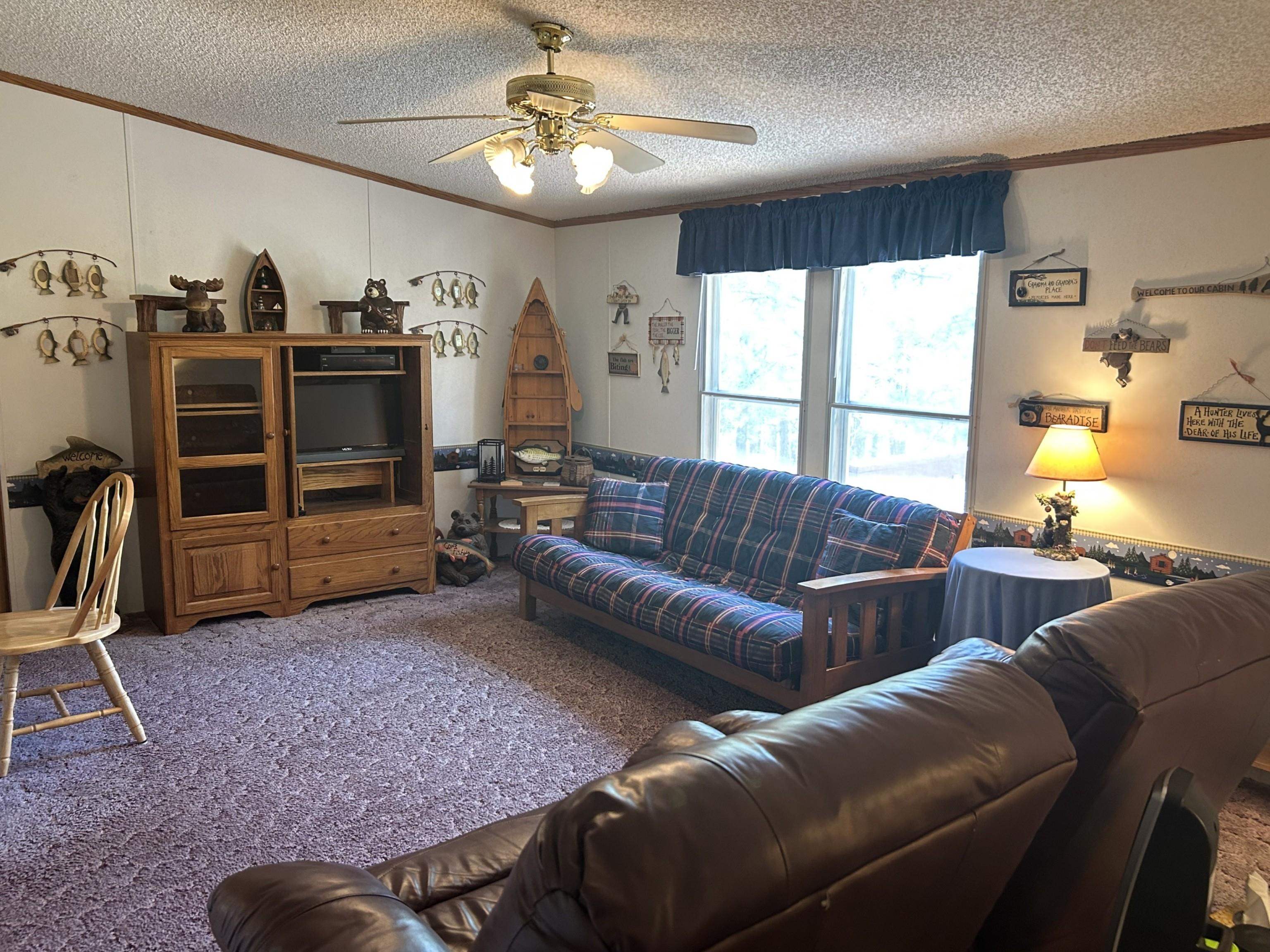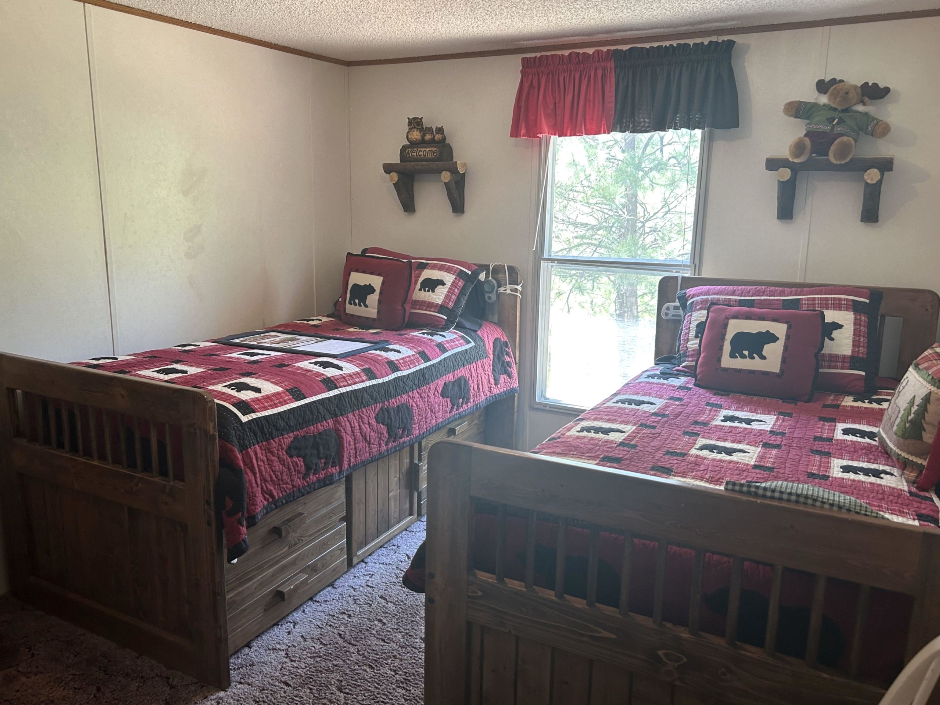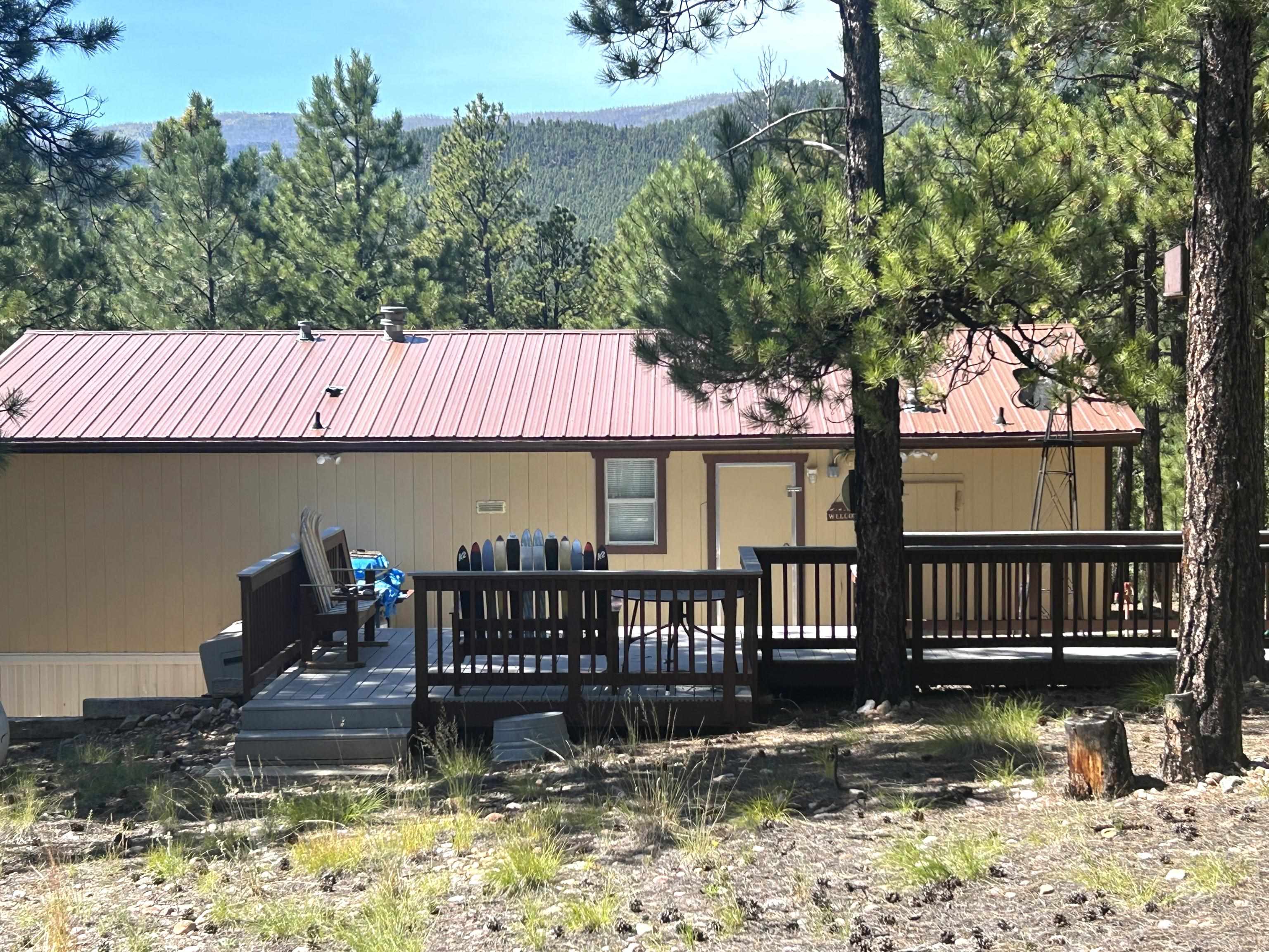 Nestled among Ponderosa pines and scrub oak, this sunny parcel is very gently sloped with views to the west. Situated on the backside of a loop, the forested grounds make the outdoors accessible and peaceful. The mountain cabin furnishings will remain with few exceptions, providing a homey stay. The detached one-car garage has approx. 90 s.f. of work space or parking for OHVs.