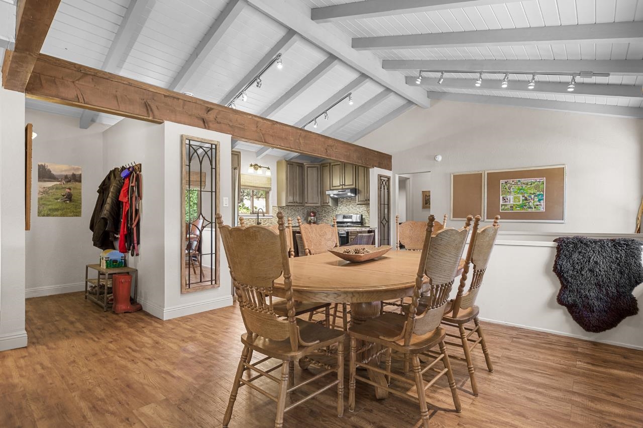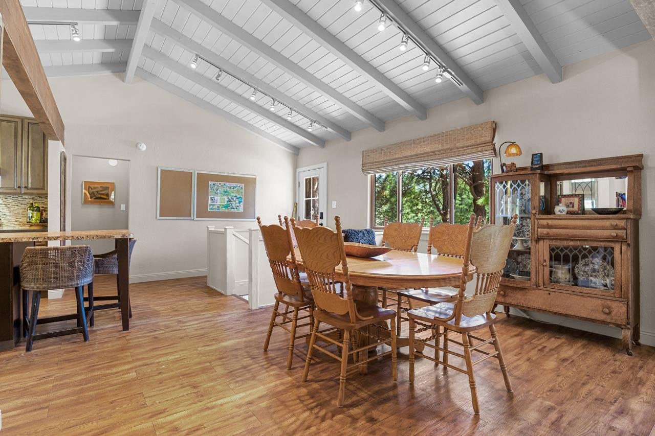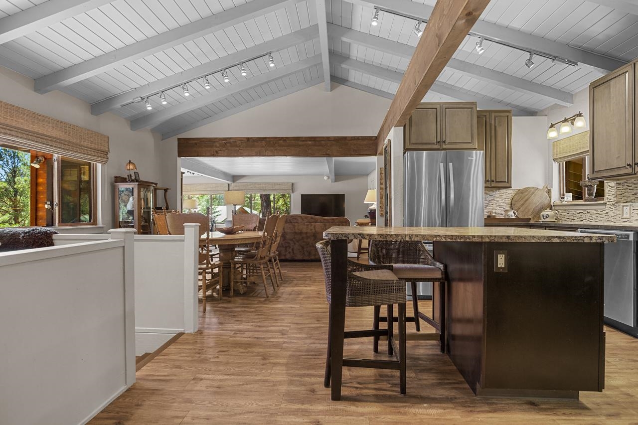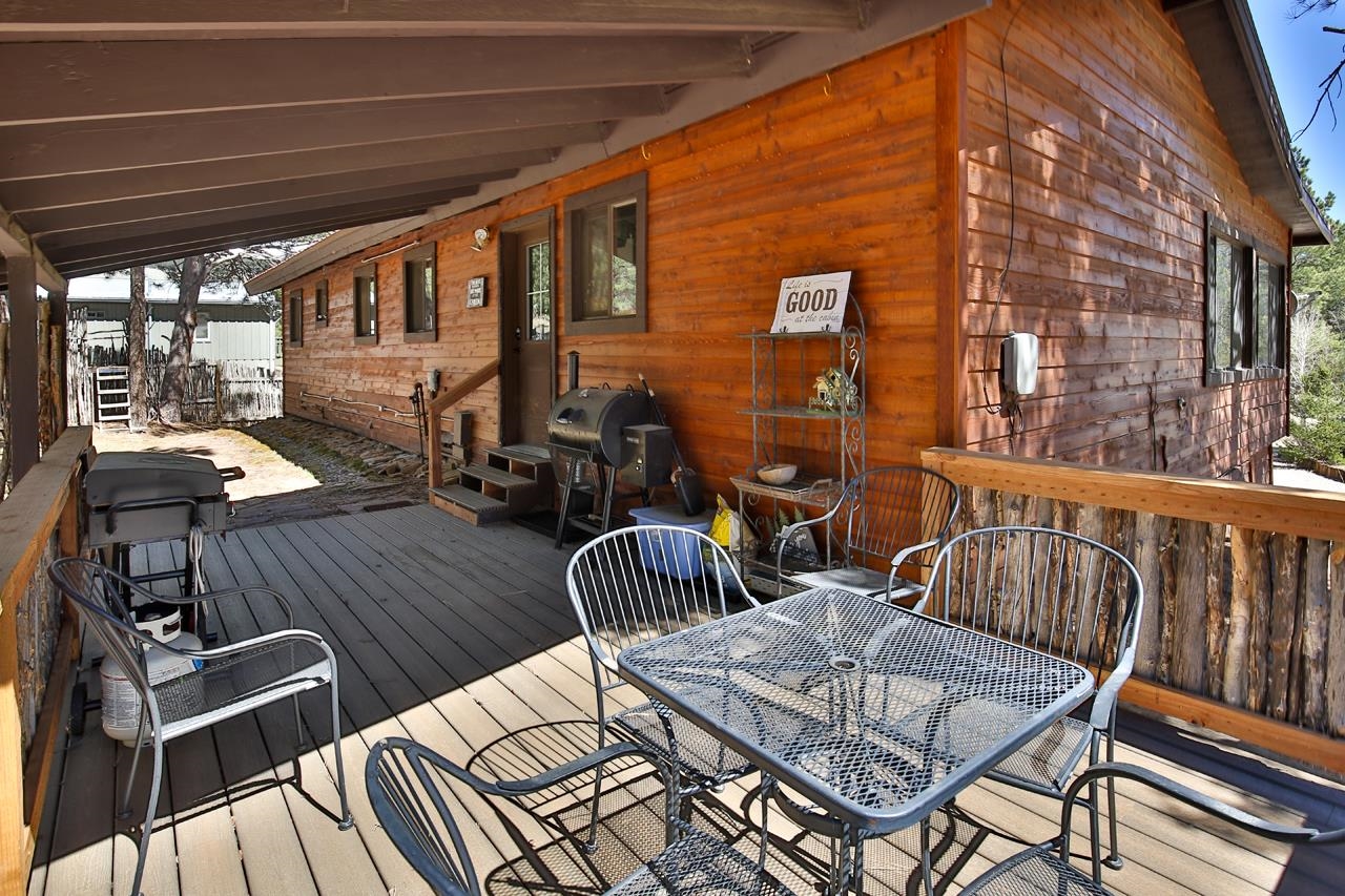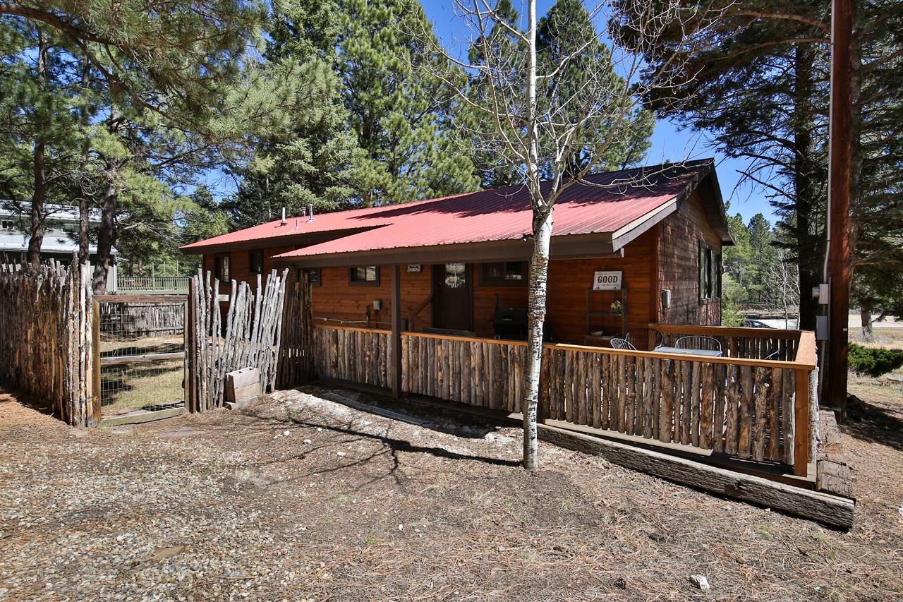 Mountain living meets modern comfort in this beautifully remodeled El Valle Escondido retreat set among towering pines. Nestled among mature trees, this 1,950 sq. ft. home offers the perfect blend of comfort, style, and year-round recreation. Featuring 2 bedrooms, 2 bathrooms, and a spacious bonus living area, the home is thoughtfully designed with the main living spaces upstairs to capture abundant natural light and scenic views overlooking the valley and clubhouse. Vaulted tongue-and-groove ceilings with exposed beams, expansive windows, and an open-concept layout create a bright and inviting atmosphere. The updated kitchen features quality cabinetry, stainless appliances, a large center island, and pantry ideal for entertaining and everyday living. A 2015 remodel brought updated kitchens, baths, flooring, and finishes throughout, while the exterior was enhanced with rich stained cedar siding for a true alpine feel. Multiple living areas including a generous lower-level bonus space provide flexibility for guests, recreation, or work-from-home use. Enjoy outdoor living on two trex decks expand living areas to offer privacy and a peaceful mountain setting. The rare double lot (0.56 acres) adds additional space and usability. Fully fenced latilla area perfect for pets. The attached 1-car double-deep garage offers ample room for storage, a vehicle, and/or workshop. The homeowners association provides community water, trash service, road maintenance, and access to outstanding amenities including a clubhouse, 9-hole golf course, stocked fishing ponds, and a seasonal swimming pool. Conveniently located between Taos and Angel Fire, this turnkey property is an ideal full-time residence or mountain getaway.