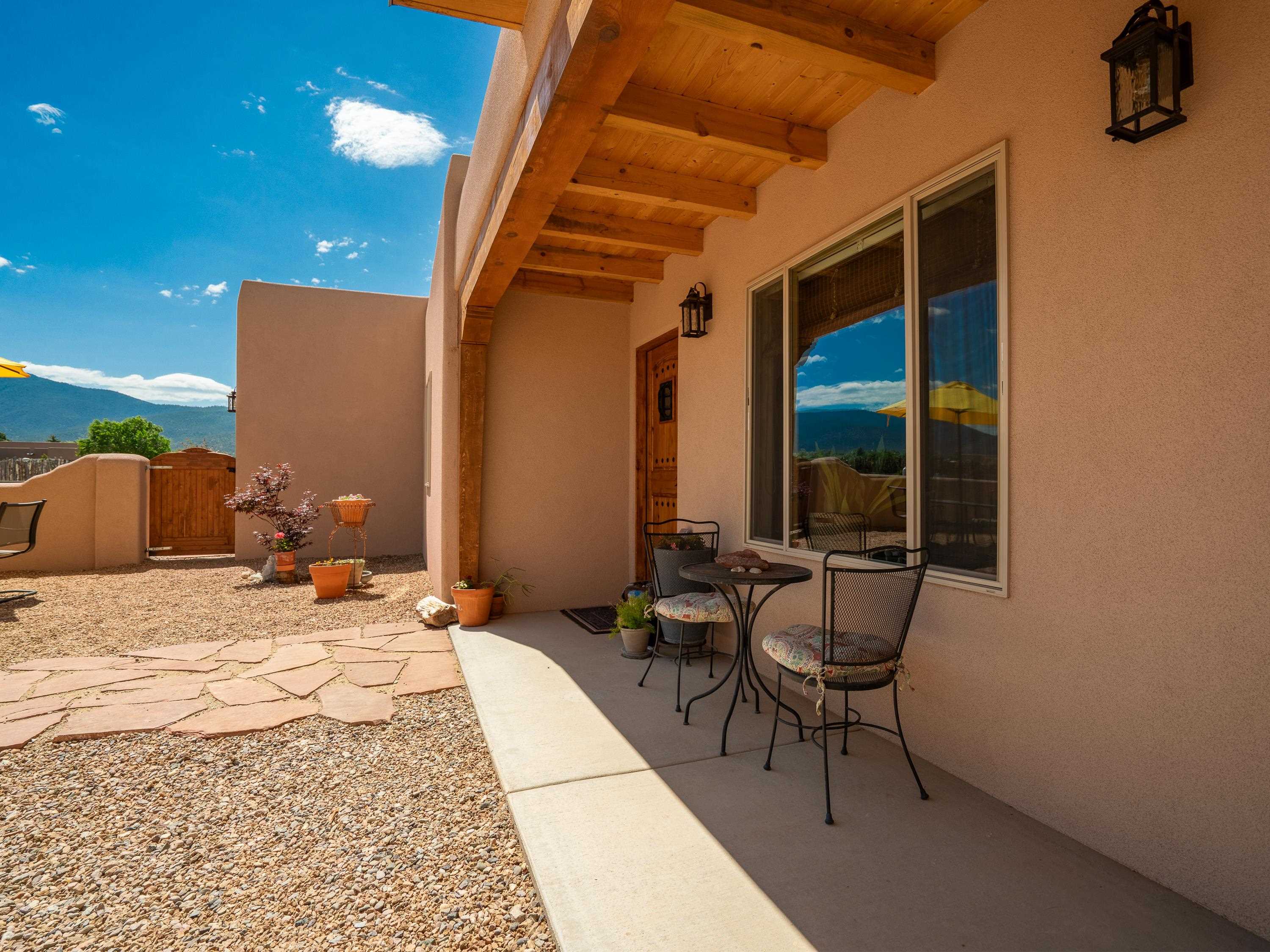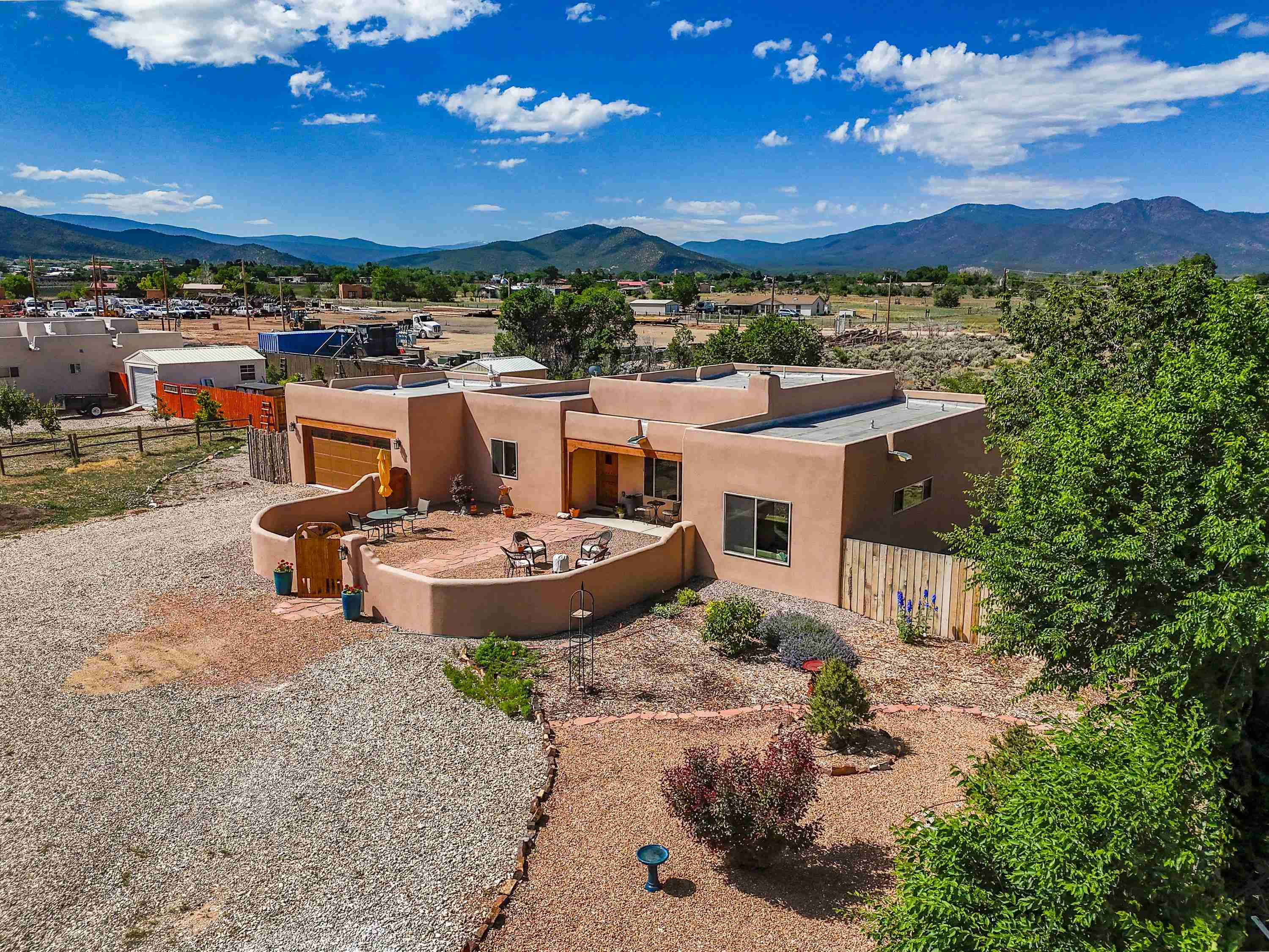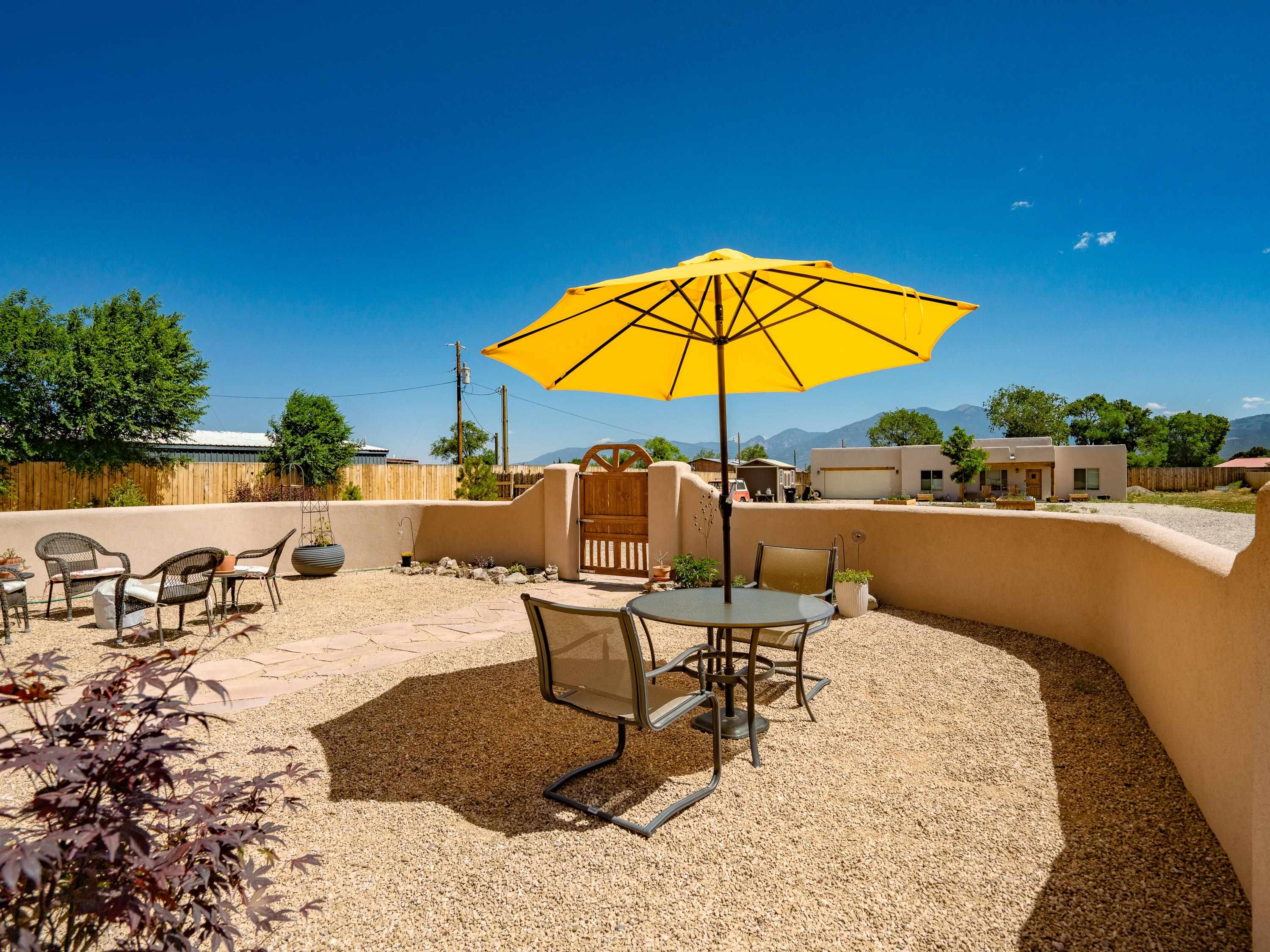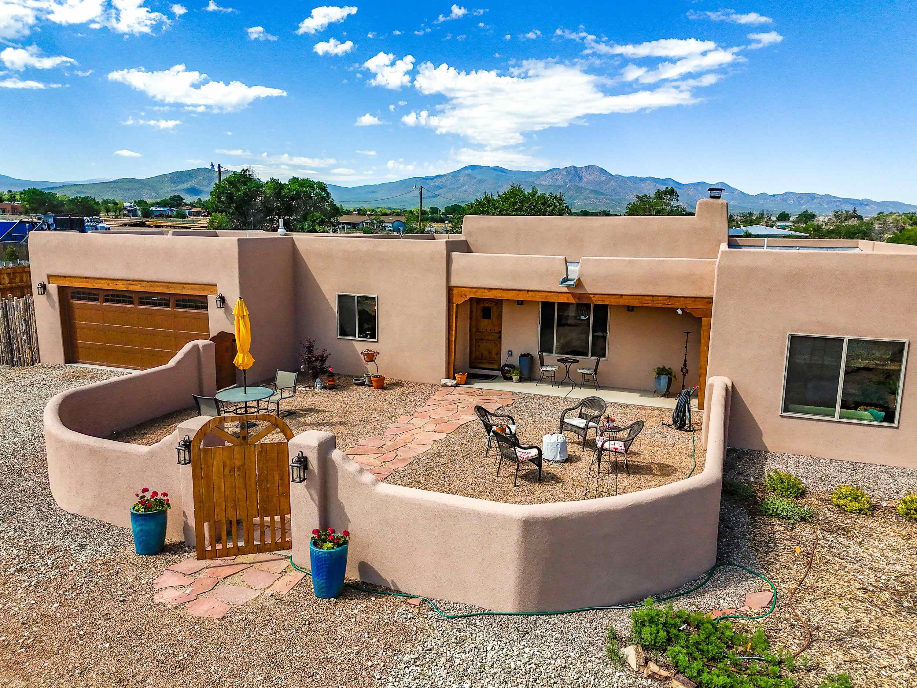 If privacy, comfort, and low maintenance are on your wish list, this is your spot. At the very end of a dead-end road, this home gives you that “away from it all” feeling—without actually being far from anything. No neighbors driving by. Just a well thought out property; start to finish! Inside, the kitchen is ready for serious cooking. We’re talking oversized knotty alder cabinets, granite countertops, a huge breakfast bar, and a large walk-in-style pantry. The living room brings the Taos feel with a real wood-burning kiva fireplace finished with smooth plaster in a contrasting color, and a big window that frames the landscaped courtyard with the mountains behind it. Saltillo tile runs throughout the home; a must have here in Taos. Designed with smart separation in mind, the primary suite is on one side of the home while the two guest bedrooms (or bedroom + office) are on the other. The primary suite is BIG. Room for your king-size bed, dressers, and then some. The en-suite bathroom includes a walk-in shower with frameless glass, double sinks on a granite counter, custom alder cabinets, and even a built-in linen closet. The walk-in closet has room for your stuff AND your significant other. One of the two guest bedrooms is currently used as a home office with high-speed internet and the guest bathroom has all the beautiful finishes the primary has, including a frameless glass door. The whole house (yes, including the garage) is heated with radiant in-floor heat powered by an on-demand natural gas boiler. That same system also handles your hot water. If you ever felt like you needed more living space, the heated garage is an excellent outlet for your creativity. Extras? You’ve got them: natural gas hookup, shared well, water softener, radon mitigation system, and town sewer—so no septic headaches. Outside, you’ll find a circular driveway, xeriscaping, trees, and privacy fencing in all the right places. The front courtyard is wrapped in a beautiful adobe wall with a nice wooden gate to let you out and keep your pets in! Tucked away in the back corner of the property you’ll find a new Tough Shed for all the stuff you don’t want to stuff into your garage. Built in 2022, the house is in great condition and is ready for you to move in, relax, and enjoy the reasons you are moving to Taos for!